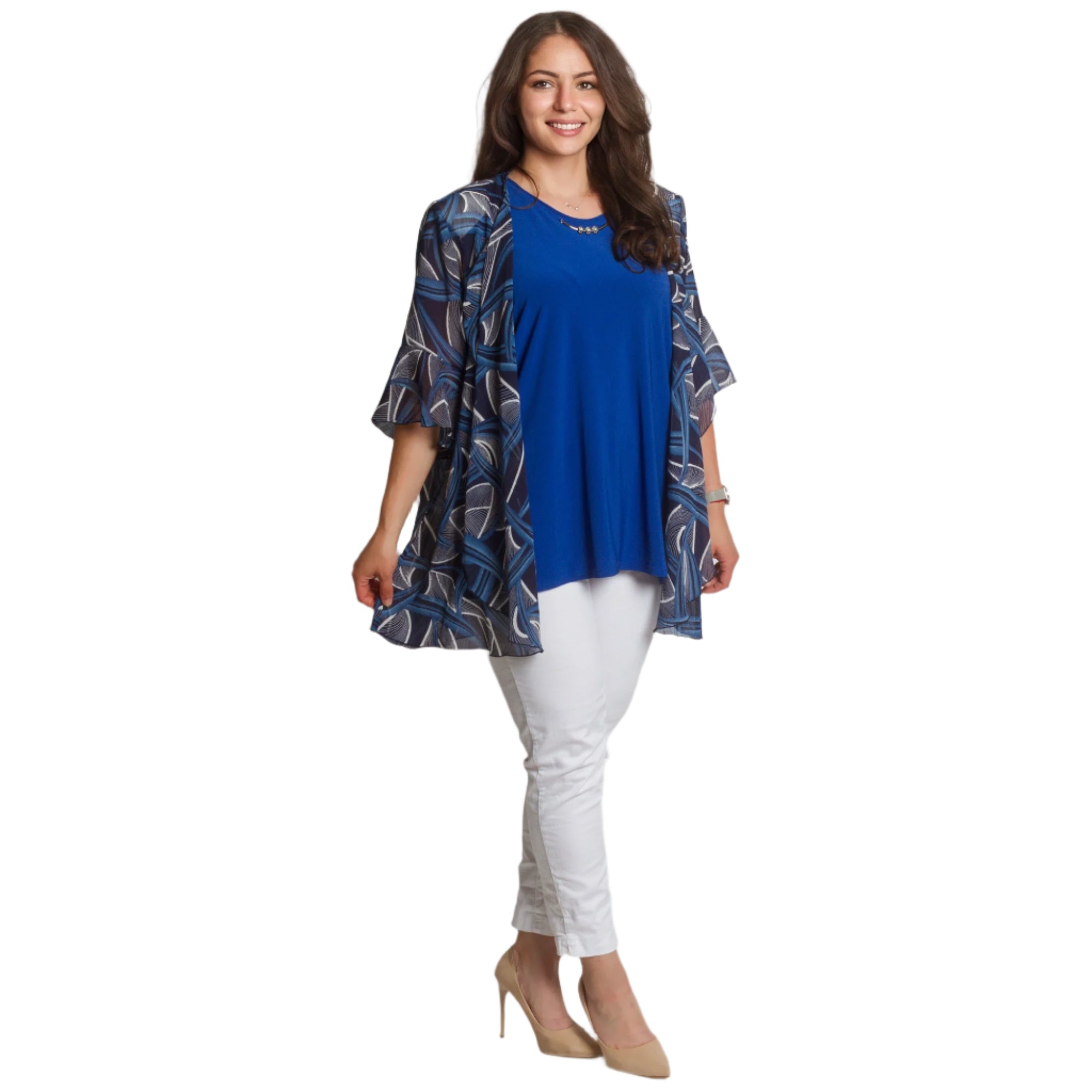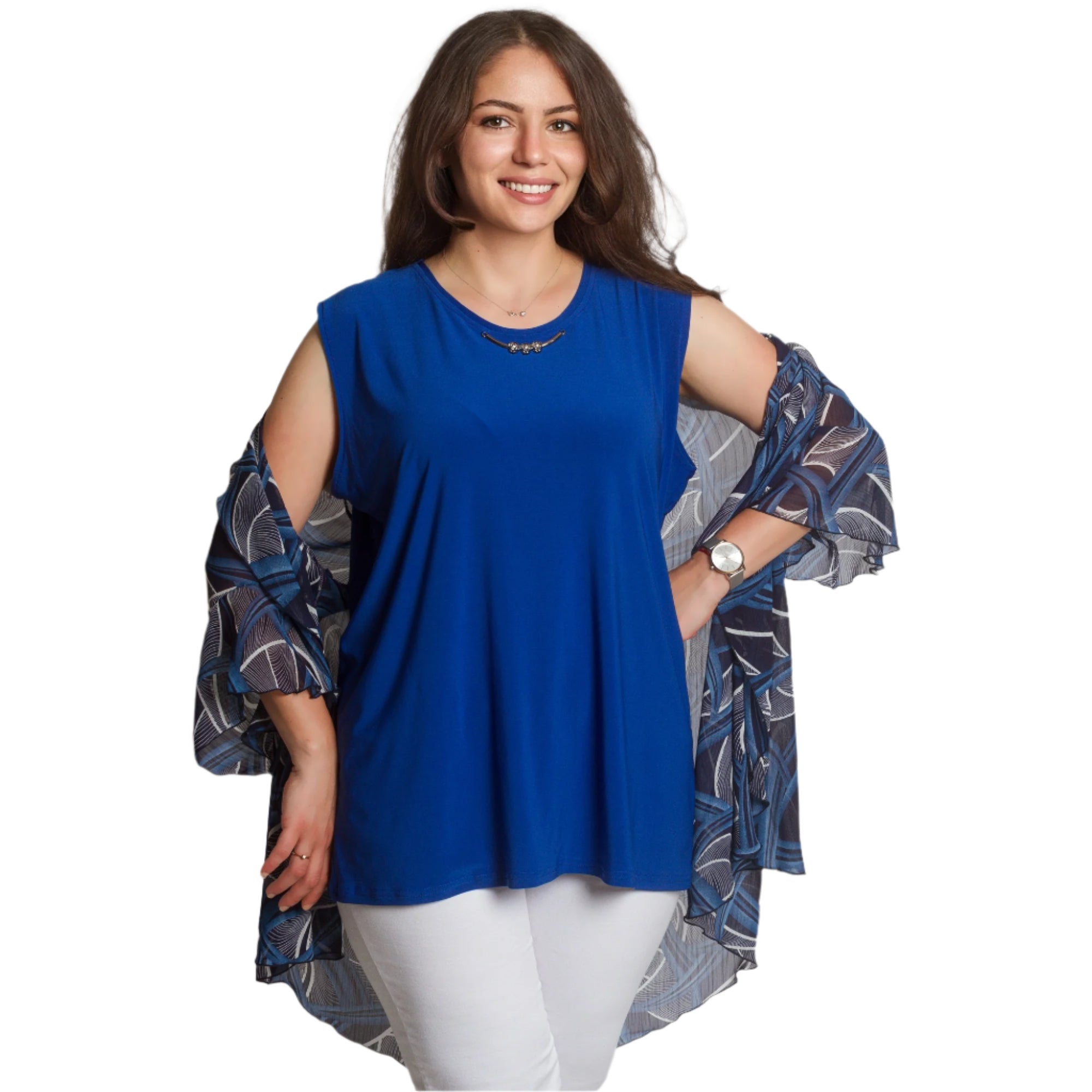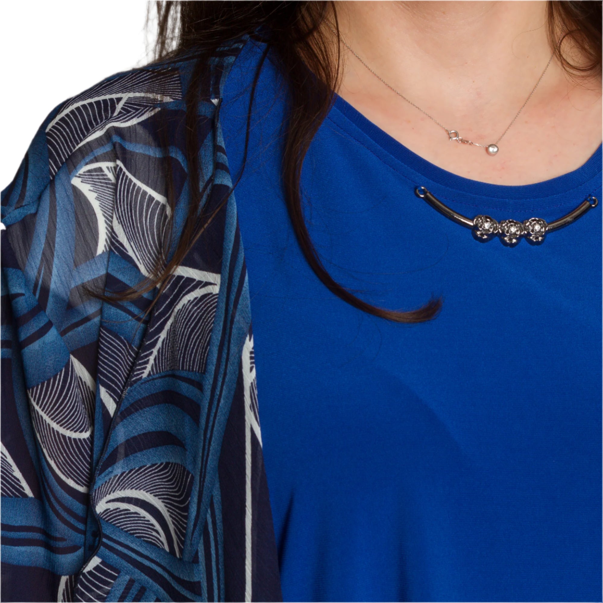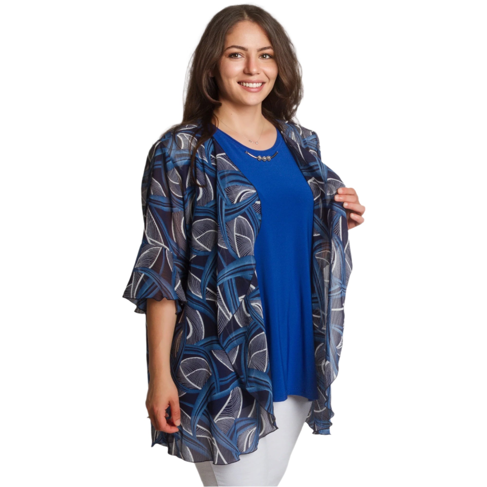 Бъдете стилна и уверена с този елегантен комплект, състоящ се от потник в наситено син цвят и ефирно шифонено наметало с абстрактен десен. Потникът е с кръгло деколте и права, еластична кройка, осигуряваща комфорт и свобода на движение. Лекият шифонен слой пада свободно и прикрива нежно раменете и ръцете, като създава усещане за лекота и изящество. Перфектен избор за официални поводи, тържества и празнични вечери.