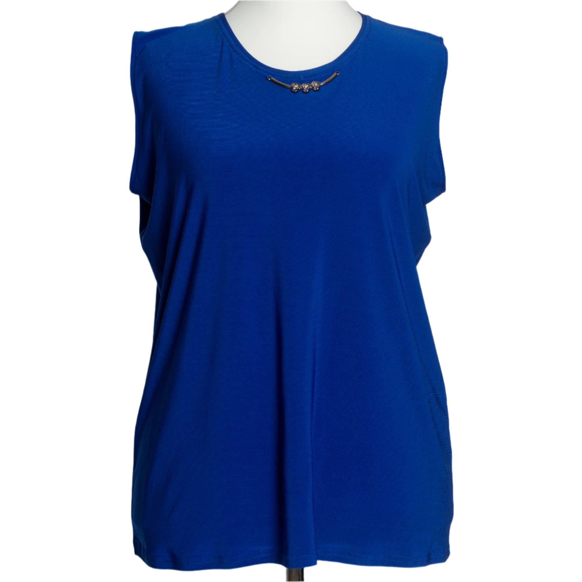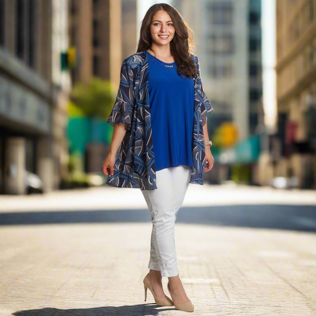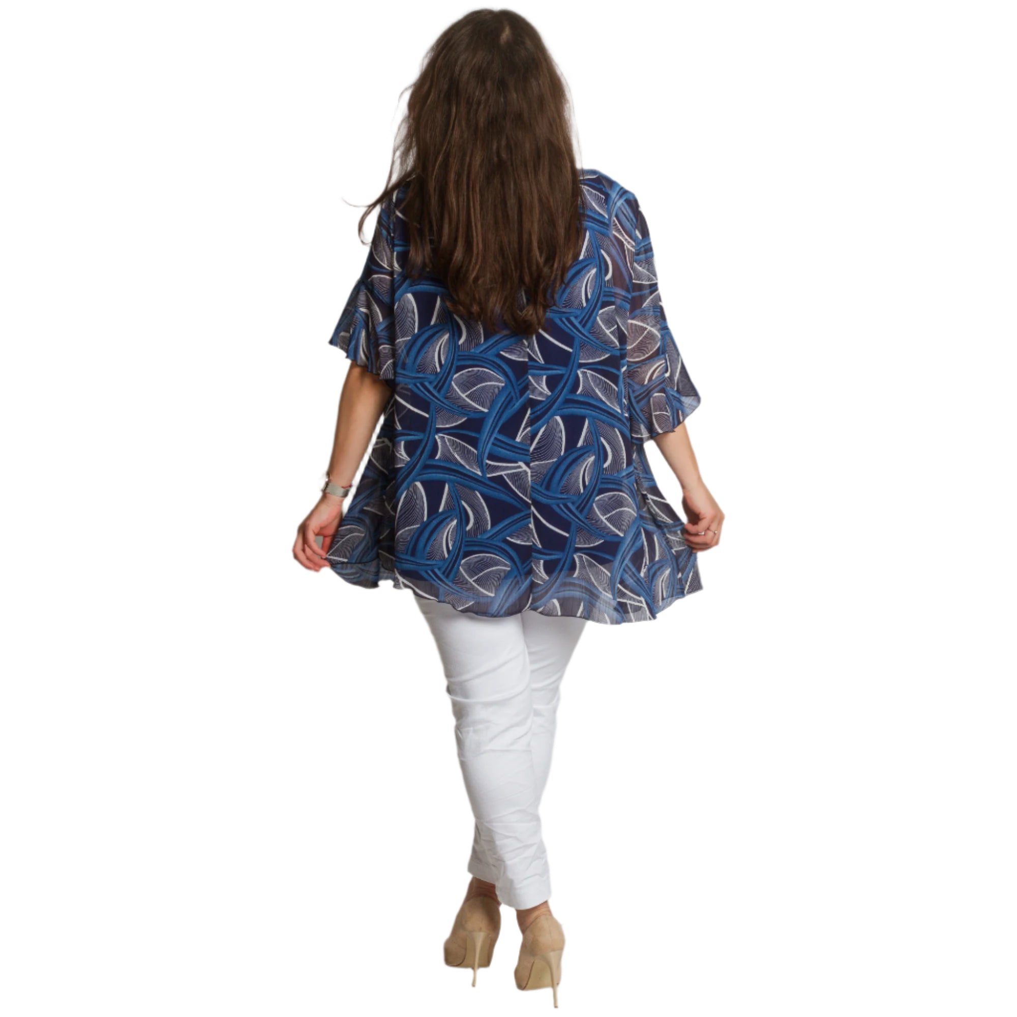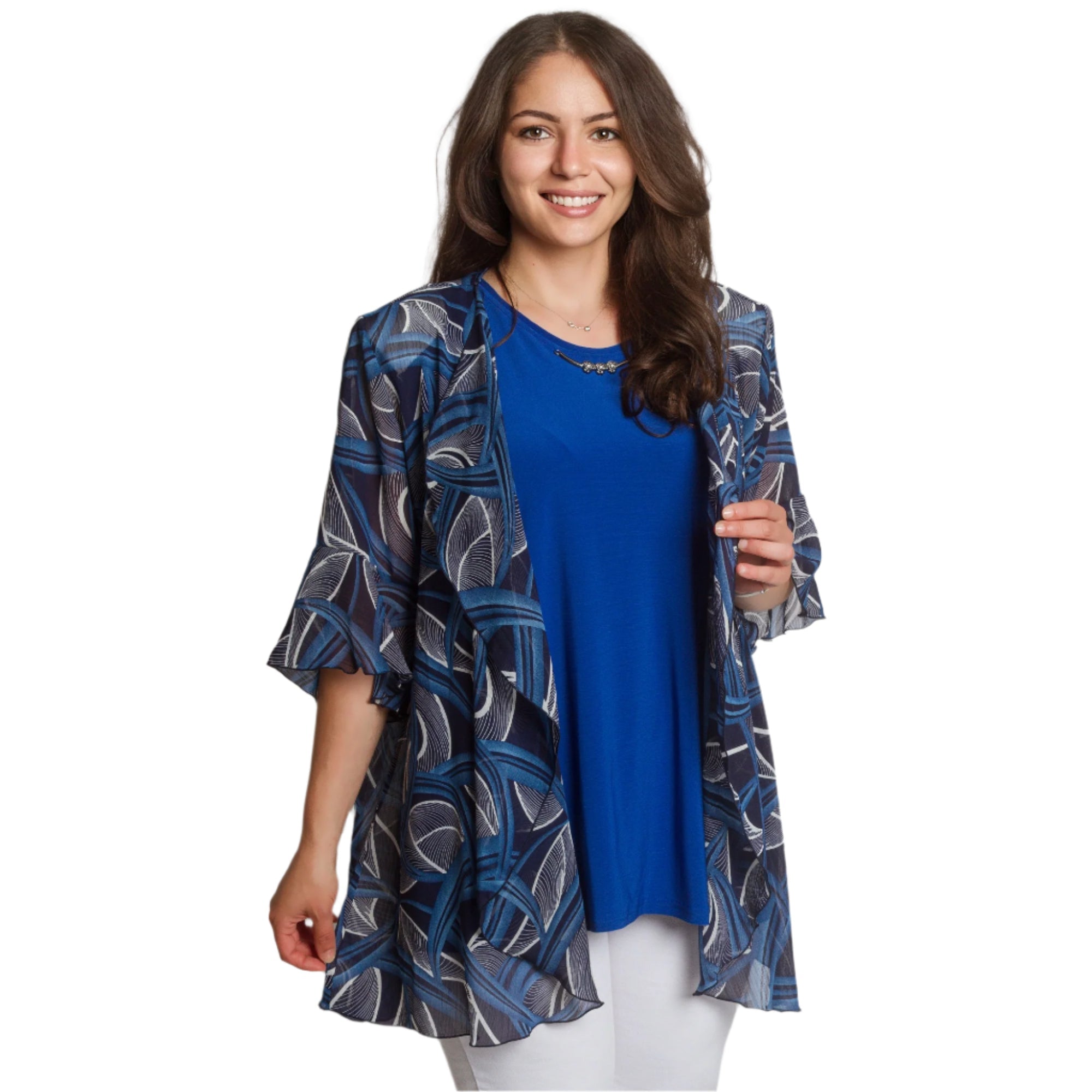 Бъдете стилна и уверена с този елегантен комплект, състоящ се от потник в наситено син цвят и ефирно шифонено наметало с абстрактен десен. Потникът е с кръгло деколте и права, еластична кройка, осигуряваща комфорт и свобода на движение. Лекият шифонен слой пада свободно и прикрива нежно раменете и ръцете, като създава усещане за лекота и изящество. Перфектен избор за официални поводи, тържества и празнични вечери.