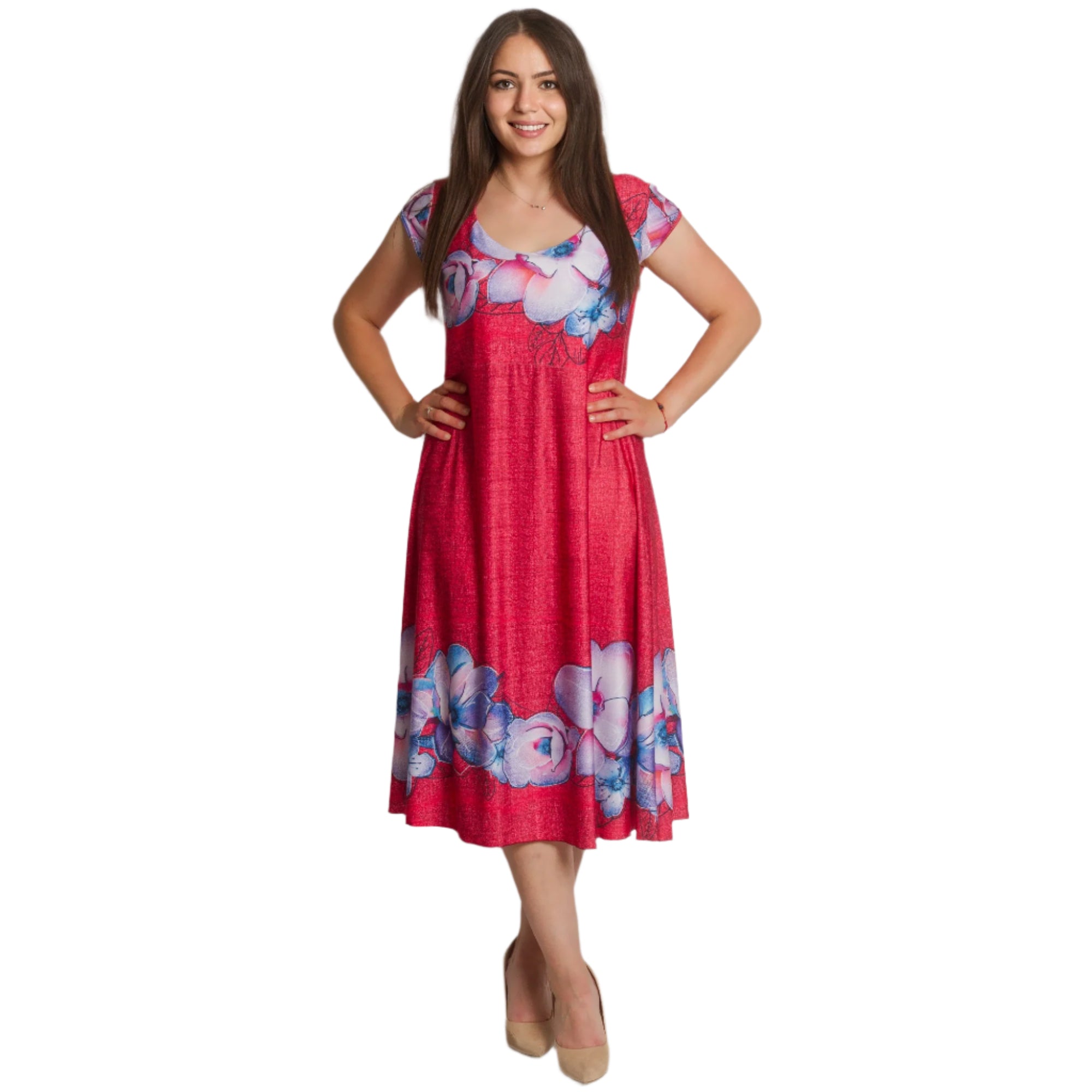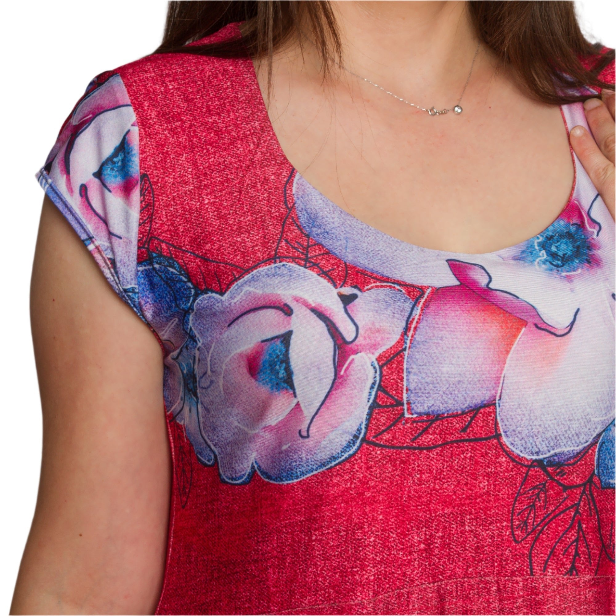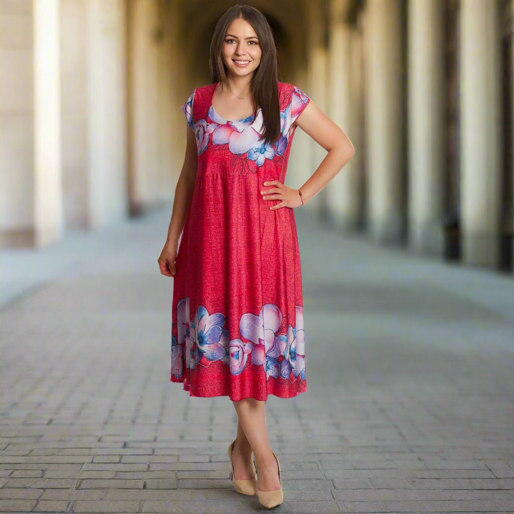 Бъдете неотразима с тази разкроена рокля в червен цвят и артистичен цветен принт. Моделът е изработен от мек памучен плат с еластан, който осигурява комфорт и свобода на движение. Дълбокото обло деколте и късите ръкави подчертават женствеността, а свободната кройка пада елегантно под коляното, идеална за официални събития през топлите дни.