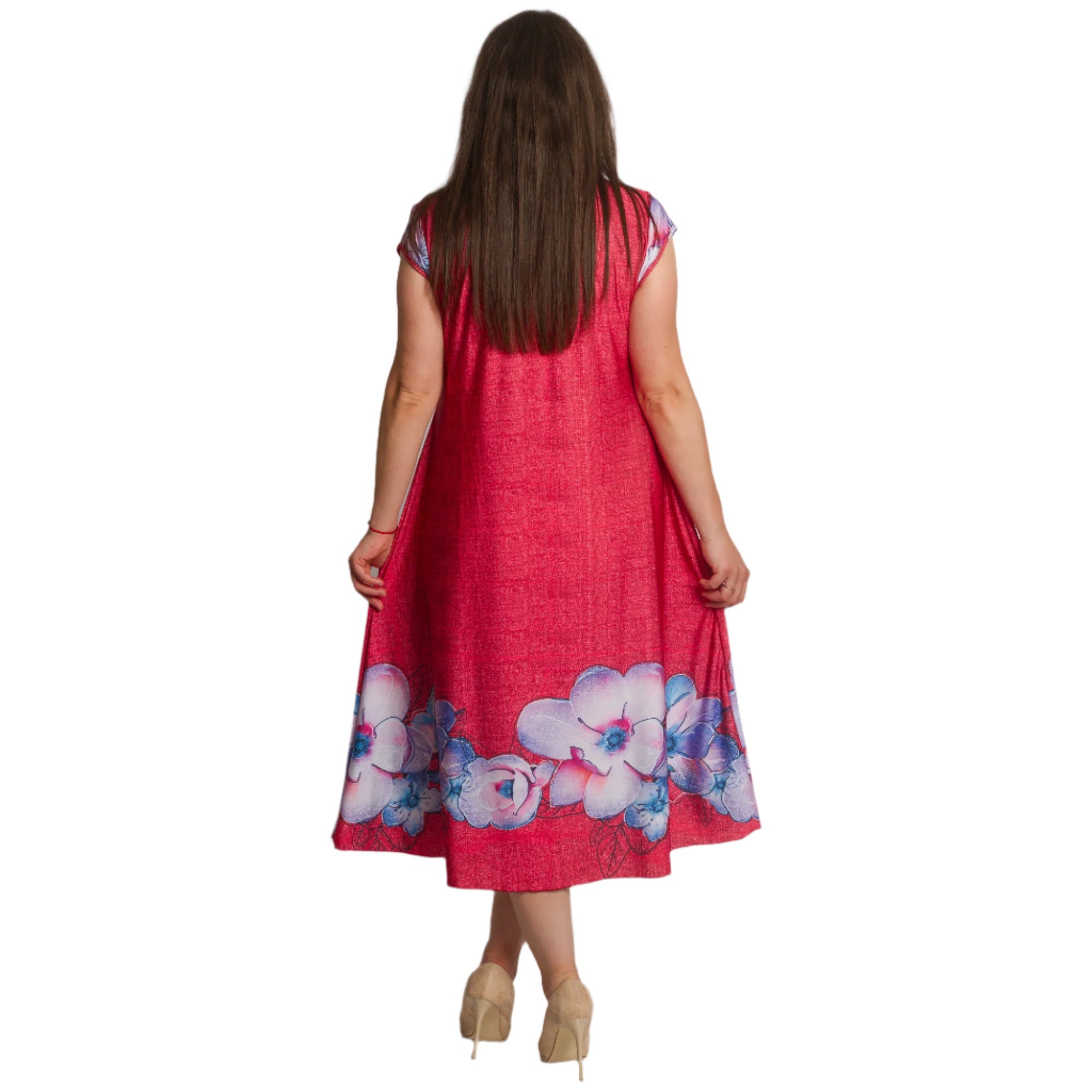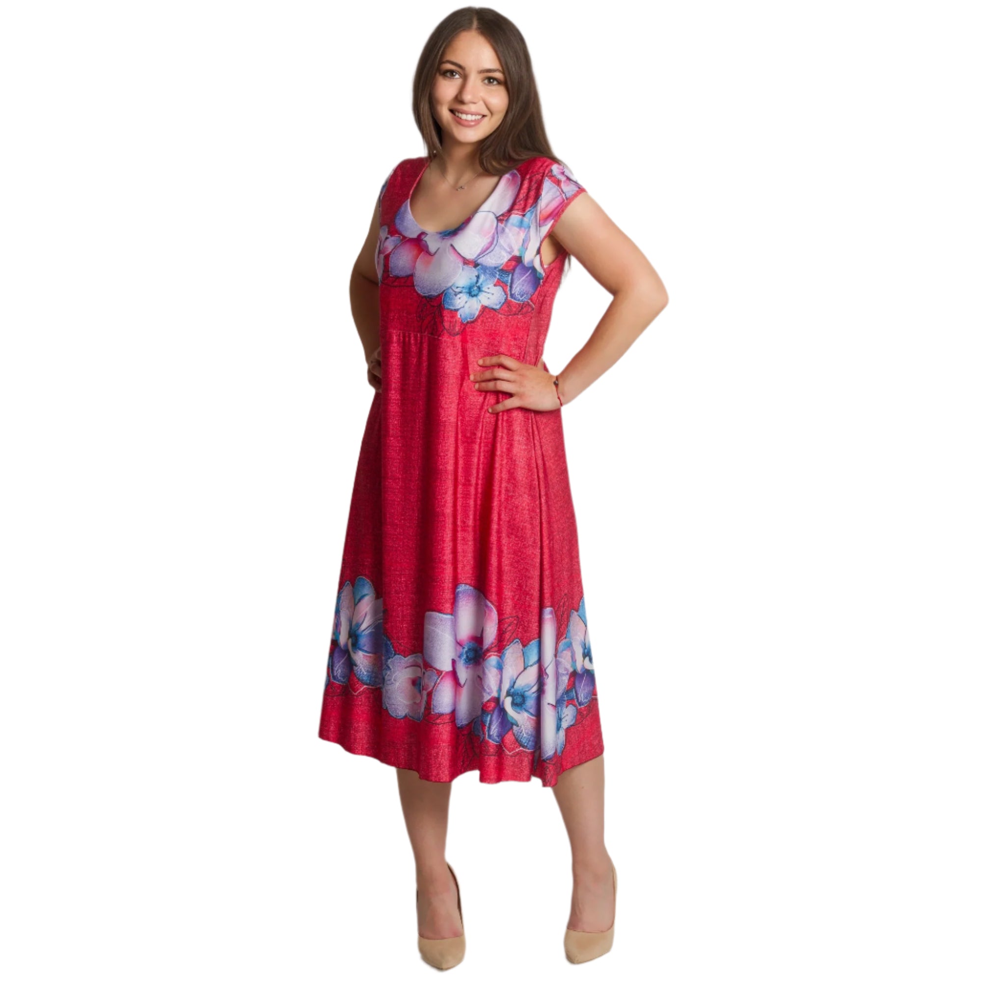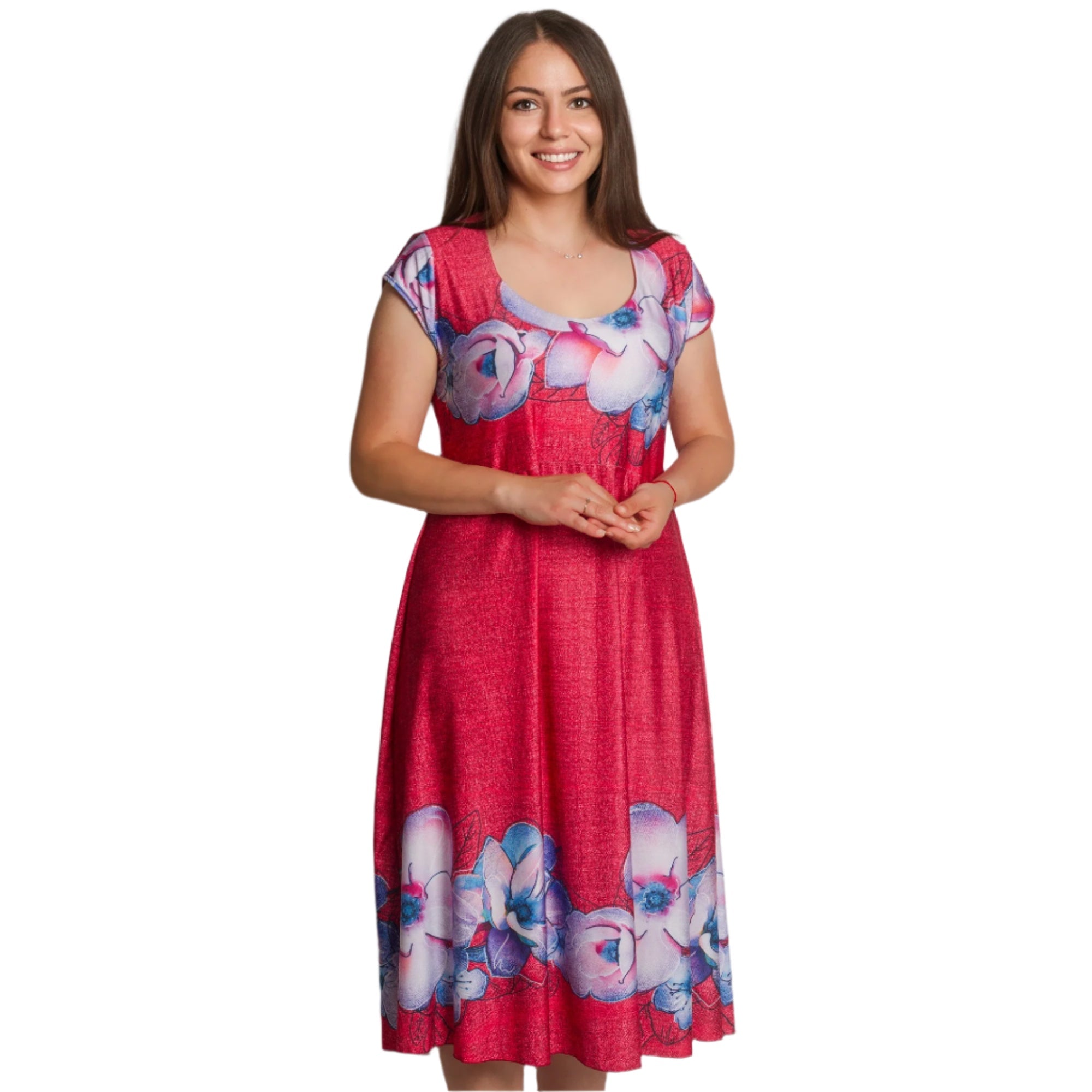 Бъдете неотразима с тази разкроена рокля в червен цвят и артистичен цветен принт. Моделът е изработен от мек памучен плат с еластан, който осигурява комфорт и свобода на движение. Дълбокото обло деколте и късите ръкави подчертават женствеността, а свободната кройка пада елегантно под коляното, идеална за официални събития през топлите дни.