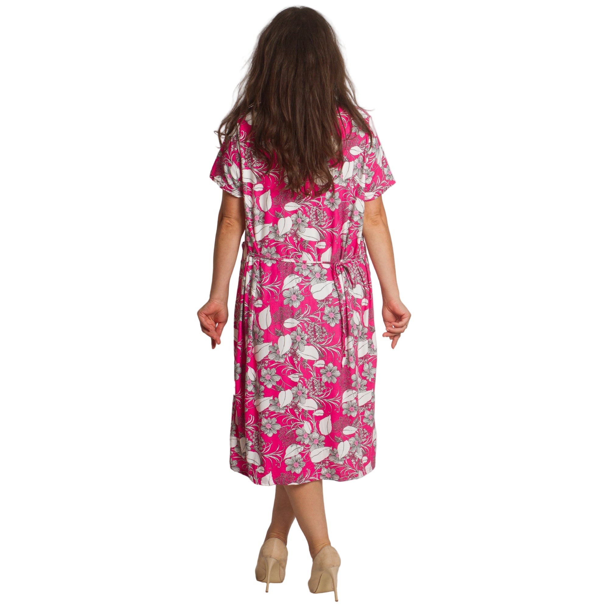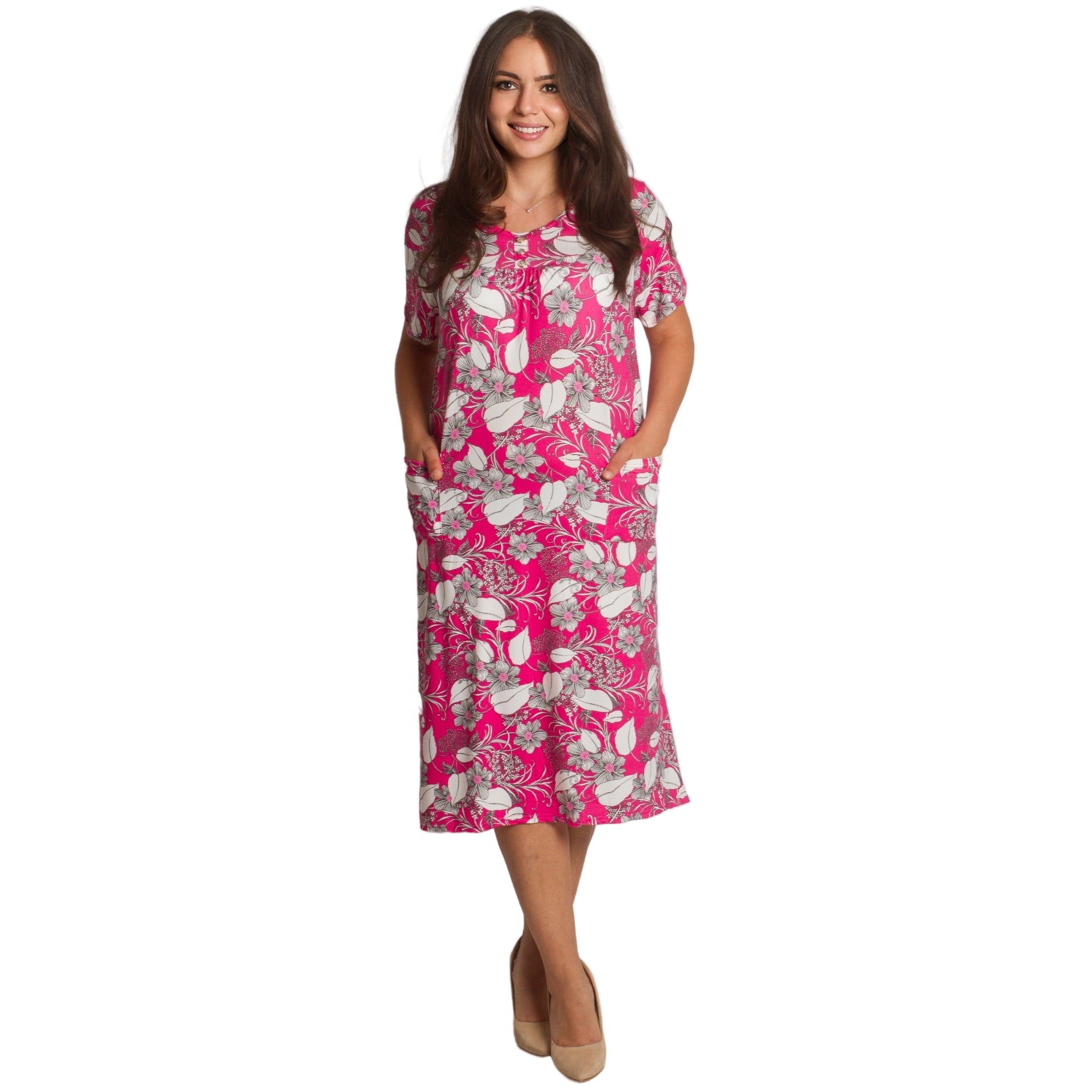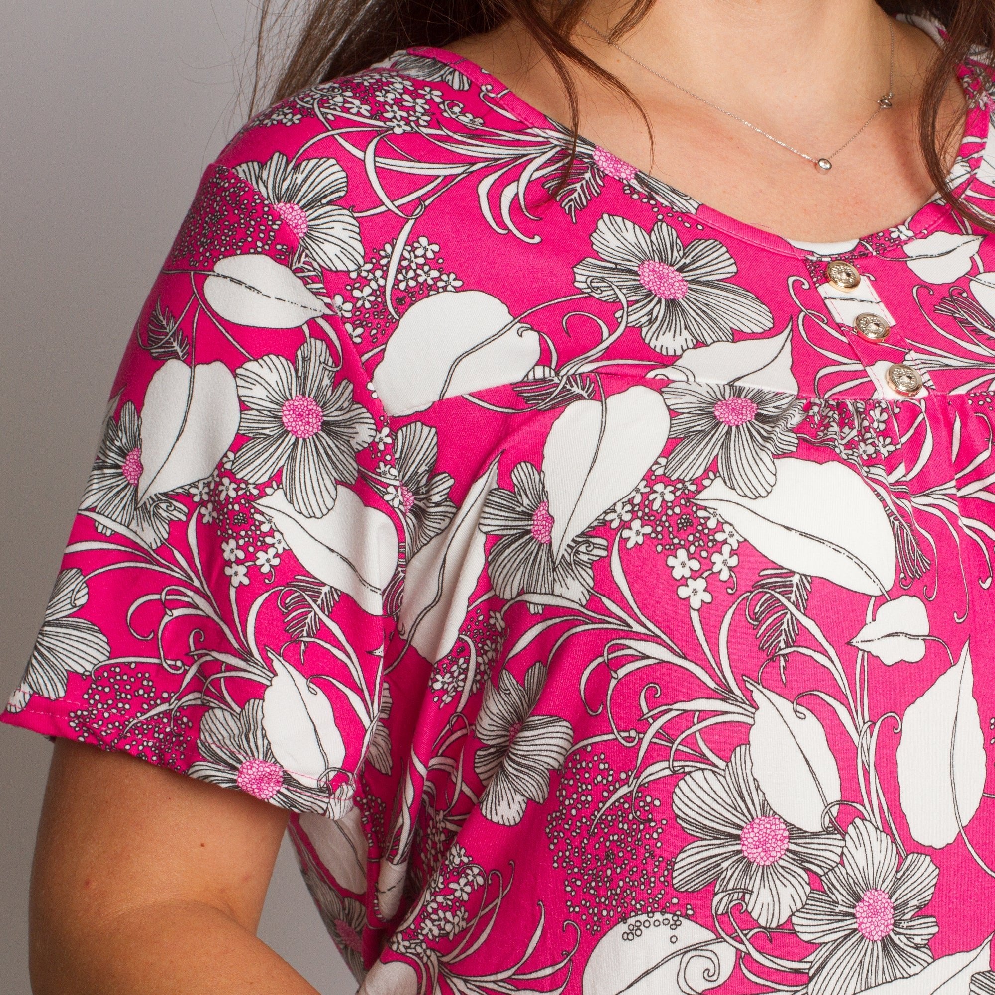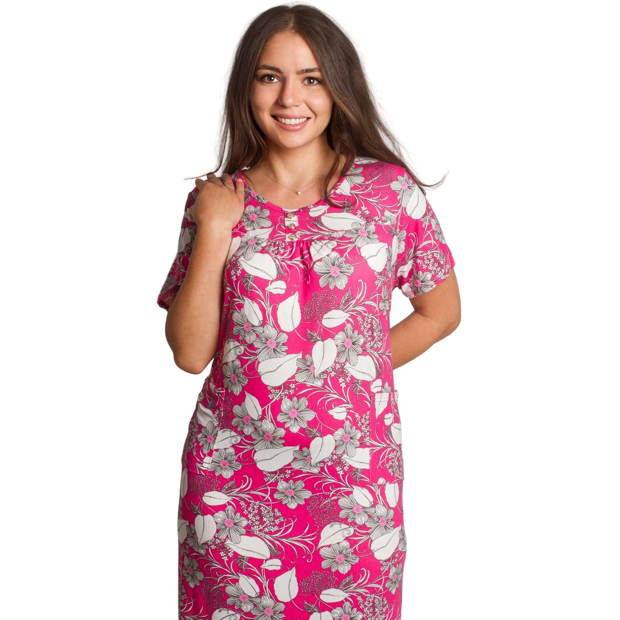 Тази стилна права рокля в розово с флорални мотиви е създадена специално за дами с пищни форми, които търсят удобство и женственост в едно. Моделът е с кръгло деколте, къс ръкав и два практични джоба отпред. Леката и еластична материя осигурява комфорт през целия ден, а цветният десен придава свеж и елегантен вид, подходящ както за ежедневието, така и за официални поводи.
