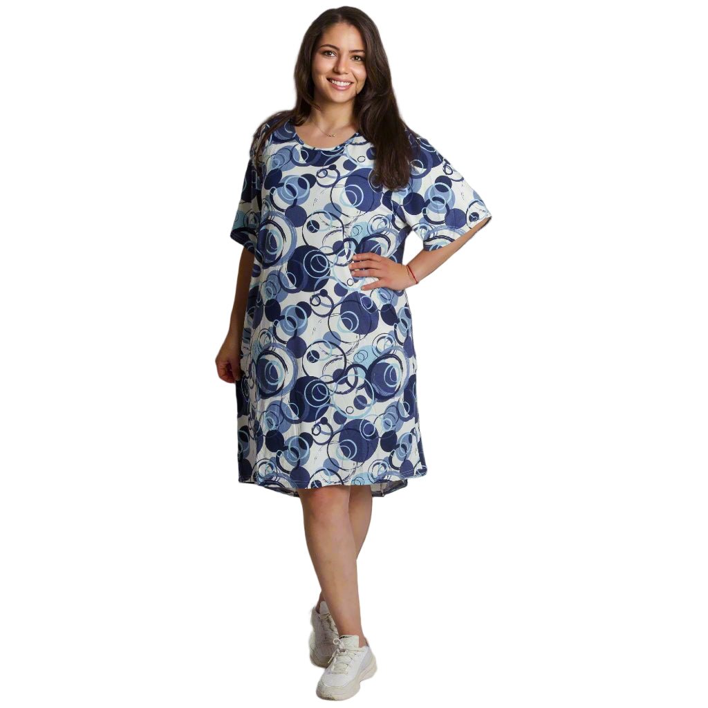 Тази удобна и ефектна рокля в тъмносиньо с абстрактен десен е перфектното допълнение към пролетно-летния гардероб. Моделът е със свободна кройка и къси ръкави, осигуряващи лекота и комфорт при носене. Двата функционални джоба добавят практичност, а кръглото деколте придава женственост. Подходяща е както за ежедневието, така и за по-неангажиращи официални събития.