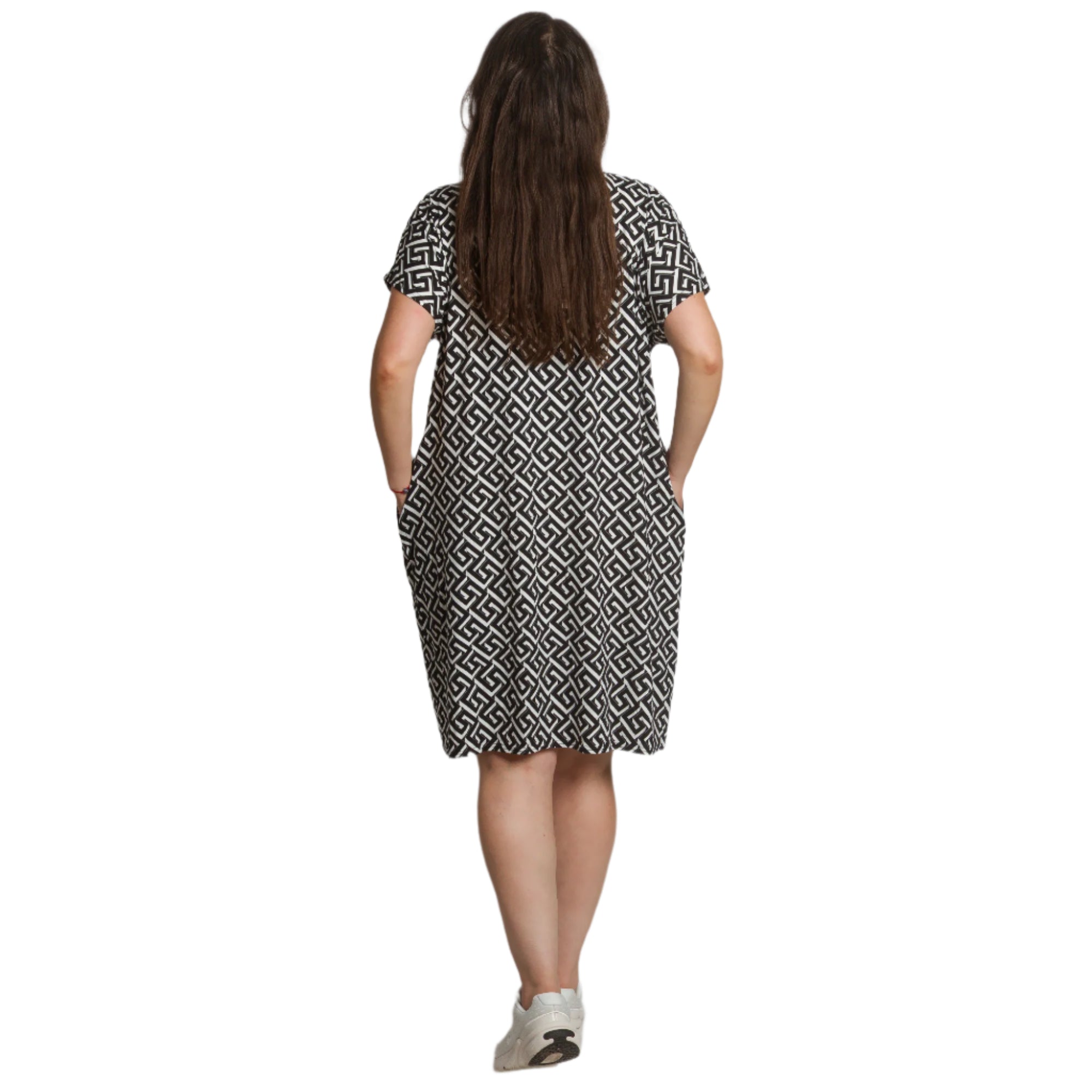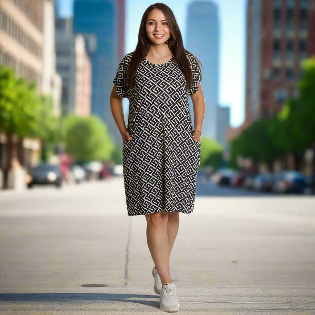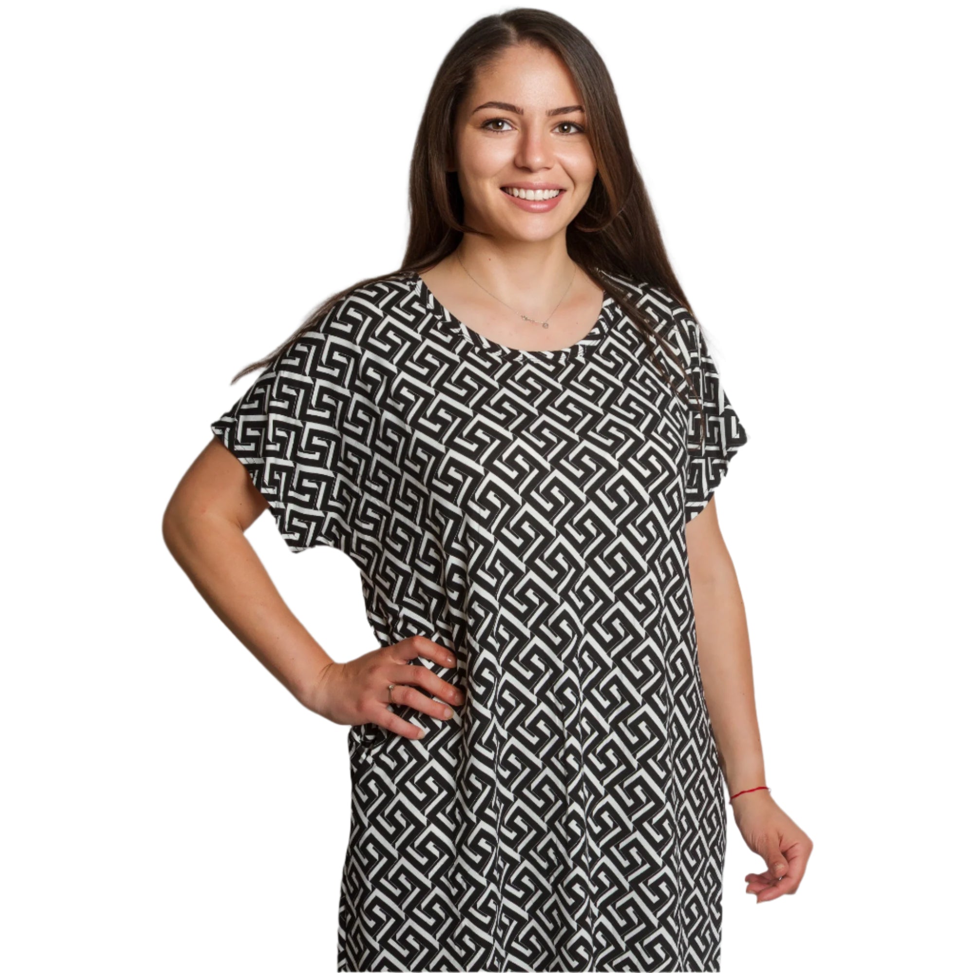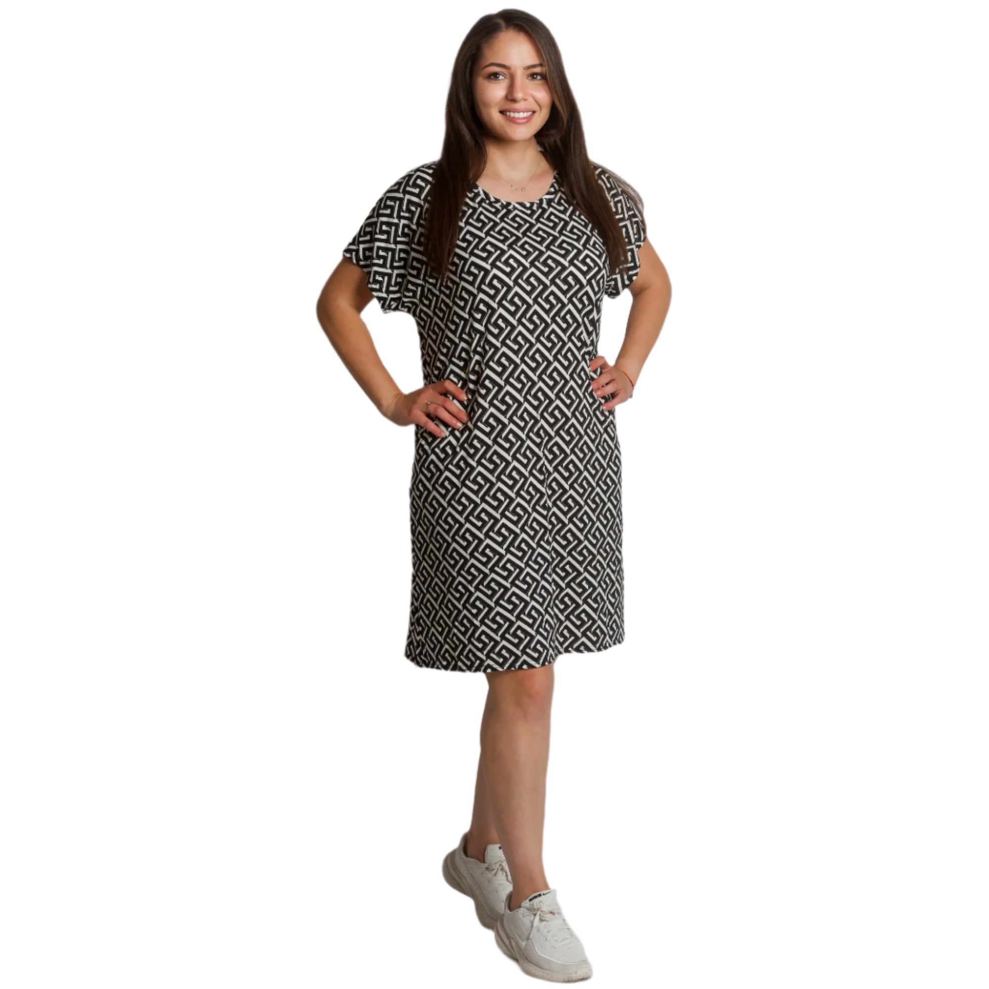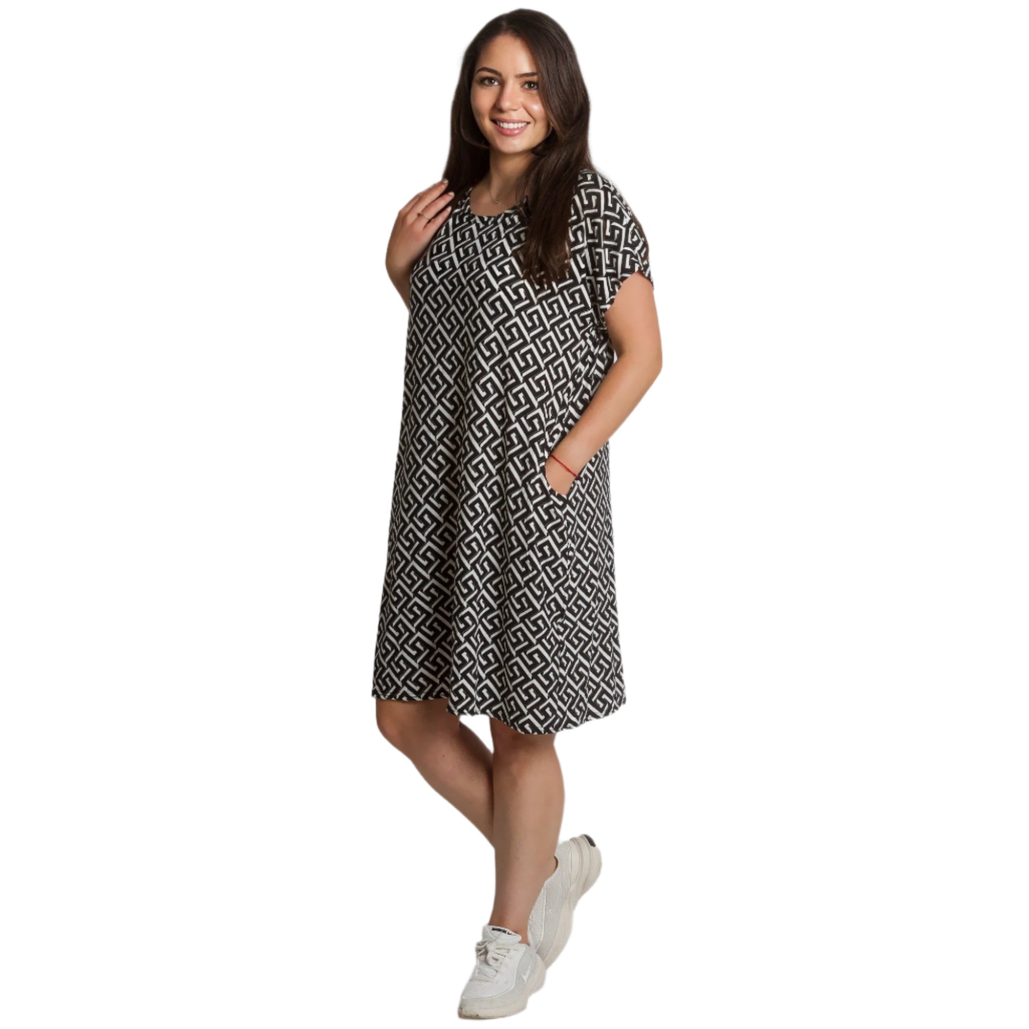 Комфорт и стил в едно – тази черна рокля с бял геометричен десен е идеалният избор за пролетно-летния сезон. Изработена от мека и еластична материя, тя осигурява свобода на движението и е подходяща както за ежедневието, така и за по-официални поводи. Разкроената кройка подчертава талията, без да стяга, а практичните джобчета добавят функционалност към модерната визия. Кръглото деколте и късите ръкави придават непринуден чар на цялостния силует.