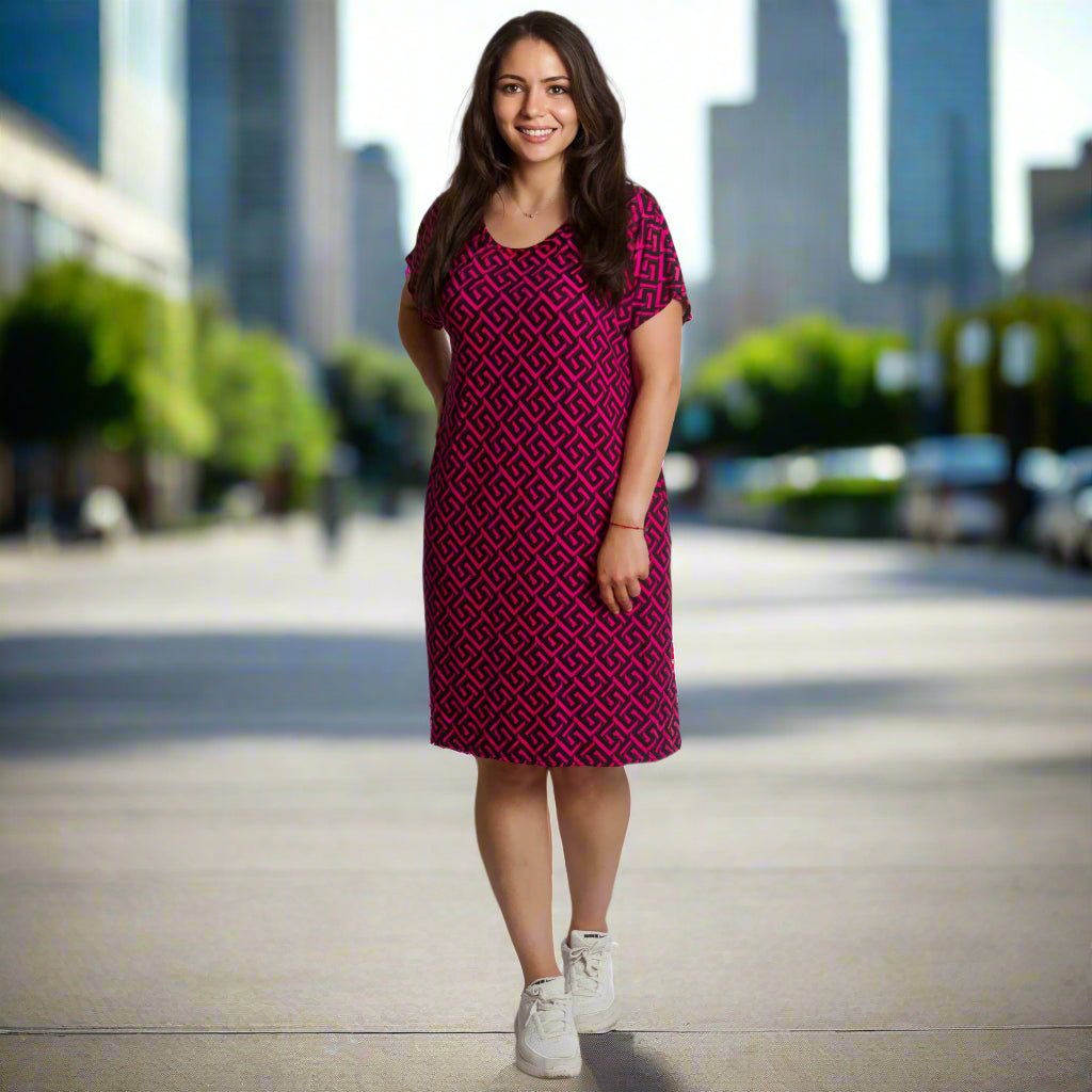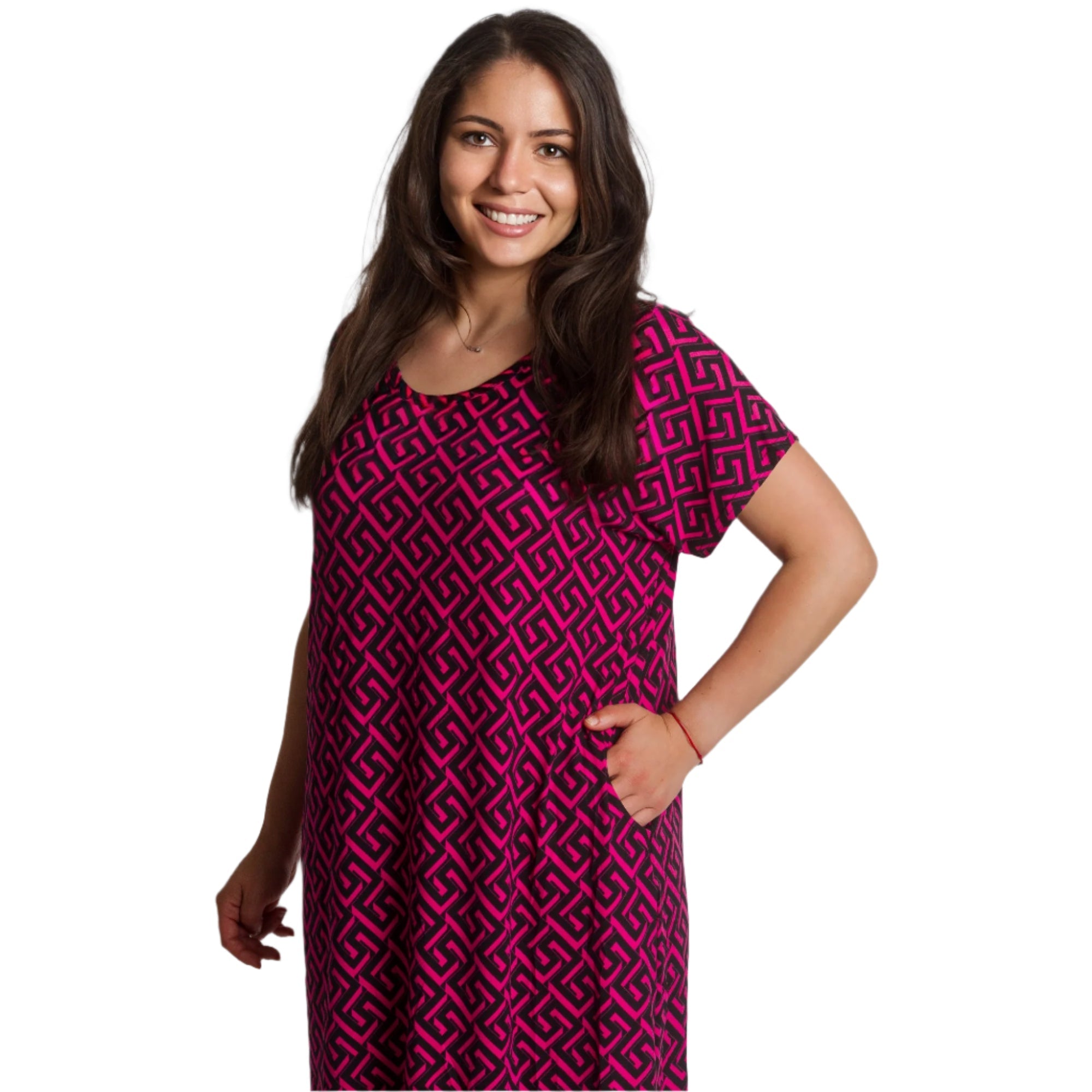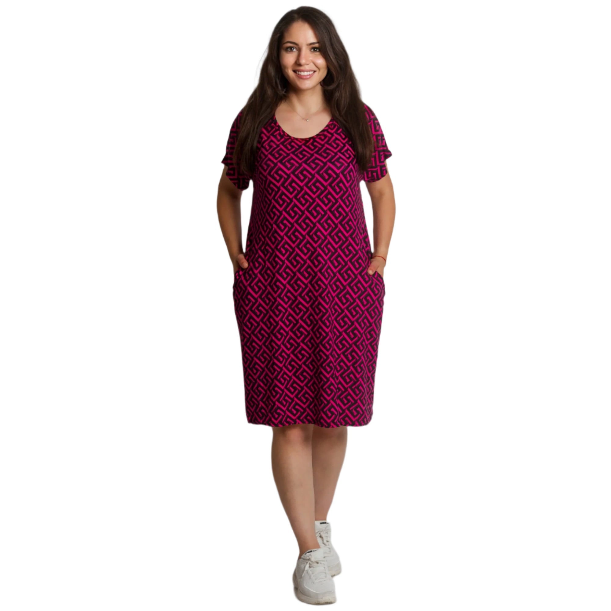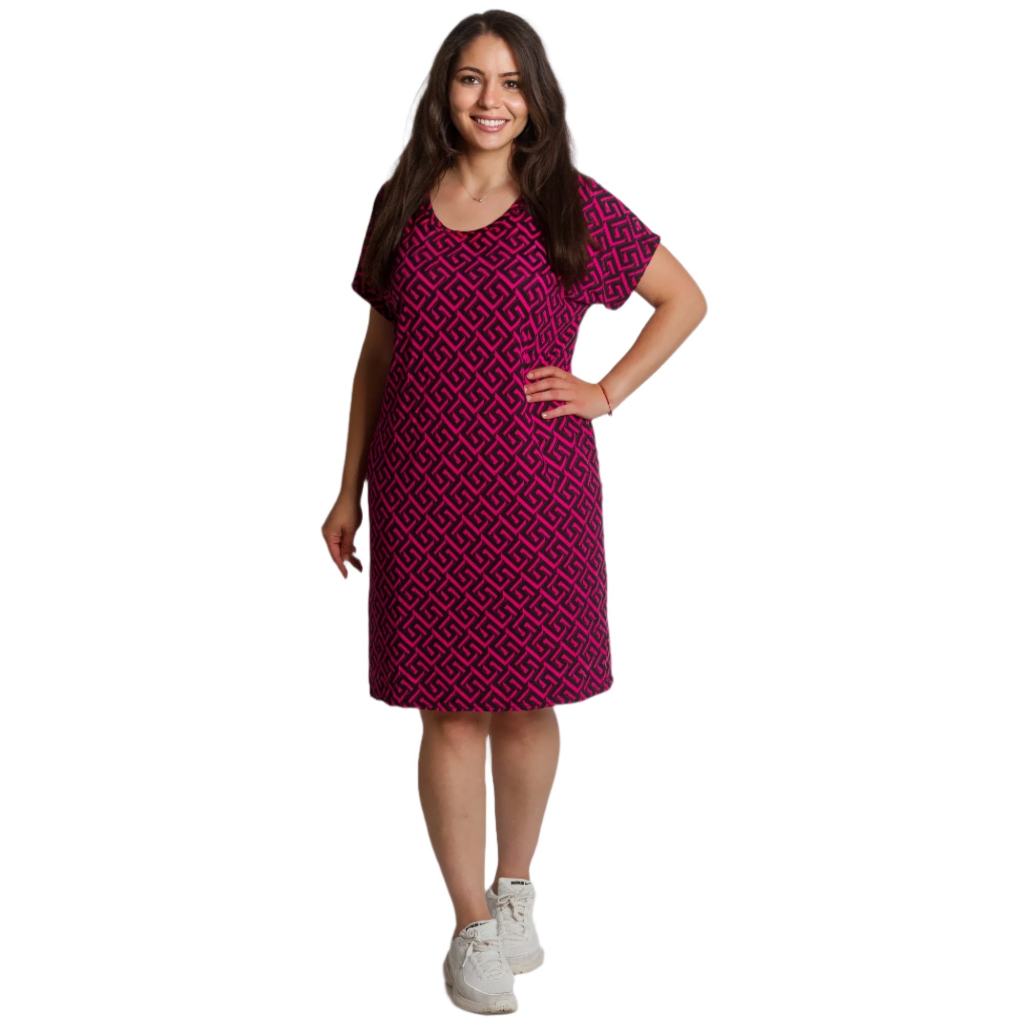 Свежа и удобна – тази тъмнорозова рокля с черен геометричен десен съчетава елегантност и практичност. Разкроената кройка подчертава фигурата, като същевременно прикрива несъвършенствата. Материята е еластична и приятна на допир, което я прави чудесен избор за пролетно-летния сезон. Джобчетата добавят функционалност, а кръглото деколте и късите ръкави придават женствено и непринудено излъчване.