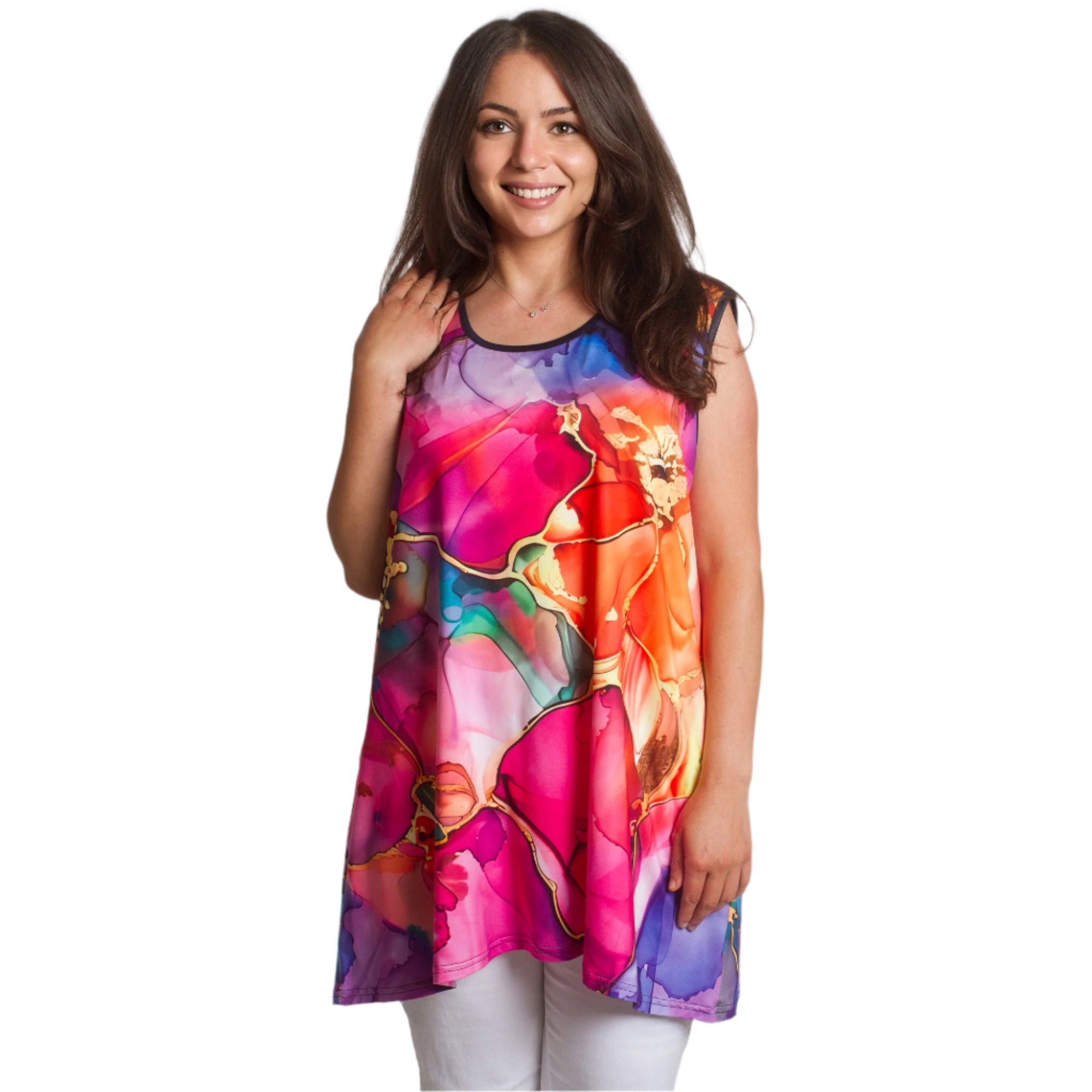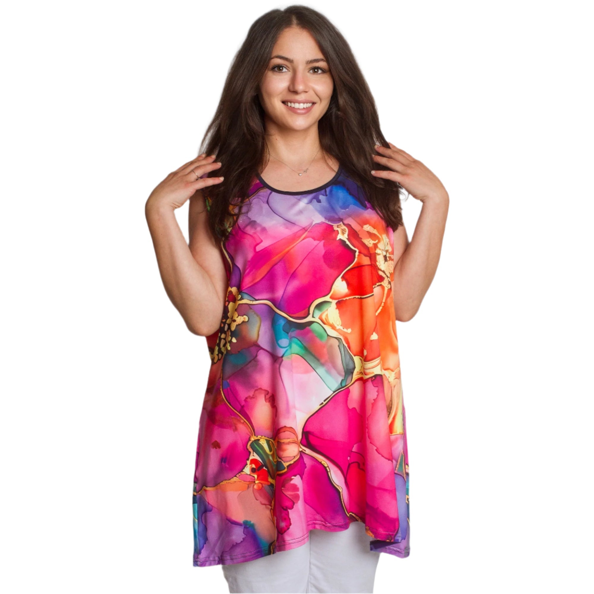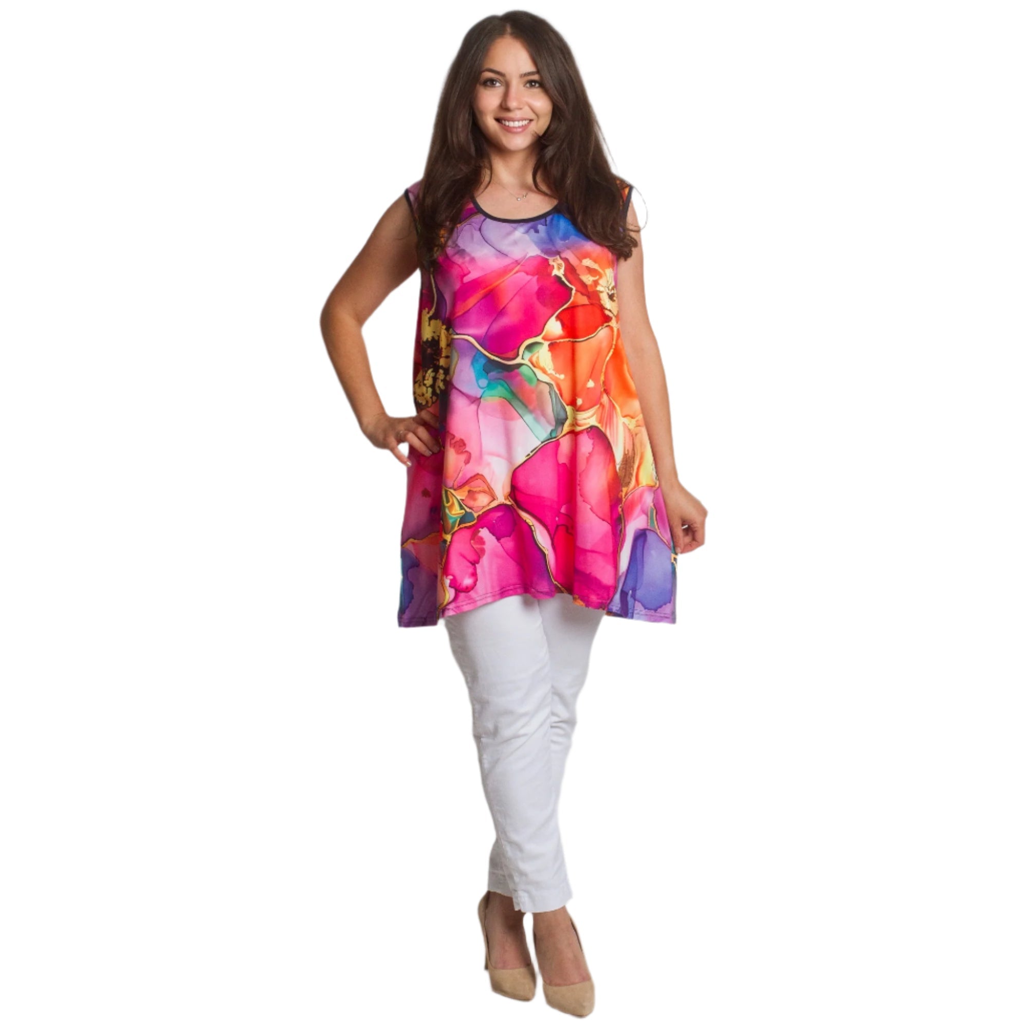 Откроете се с този впечатляващ потник в макси размери със цветен десен в топли, наситени цветове. Комбинацията от оранжево, розово, златисто и лилаво придава усещане за свежест и стил. Моделът е с класическо кръгло деколте и свободна кройка, която осигурява удобство през пролетно-летните дни. Материята е лека и еластична, подходяща за активното ежедневие на модерната жена.