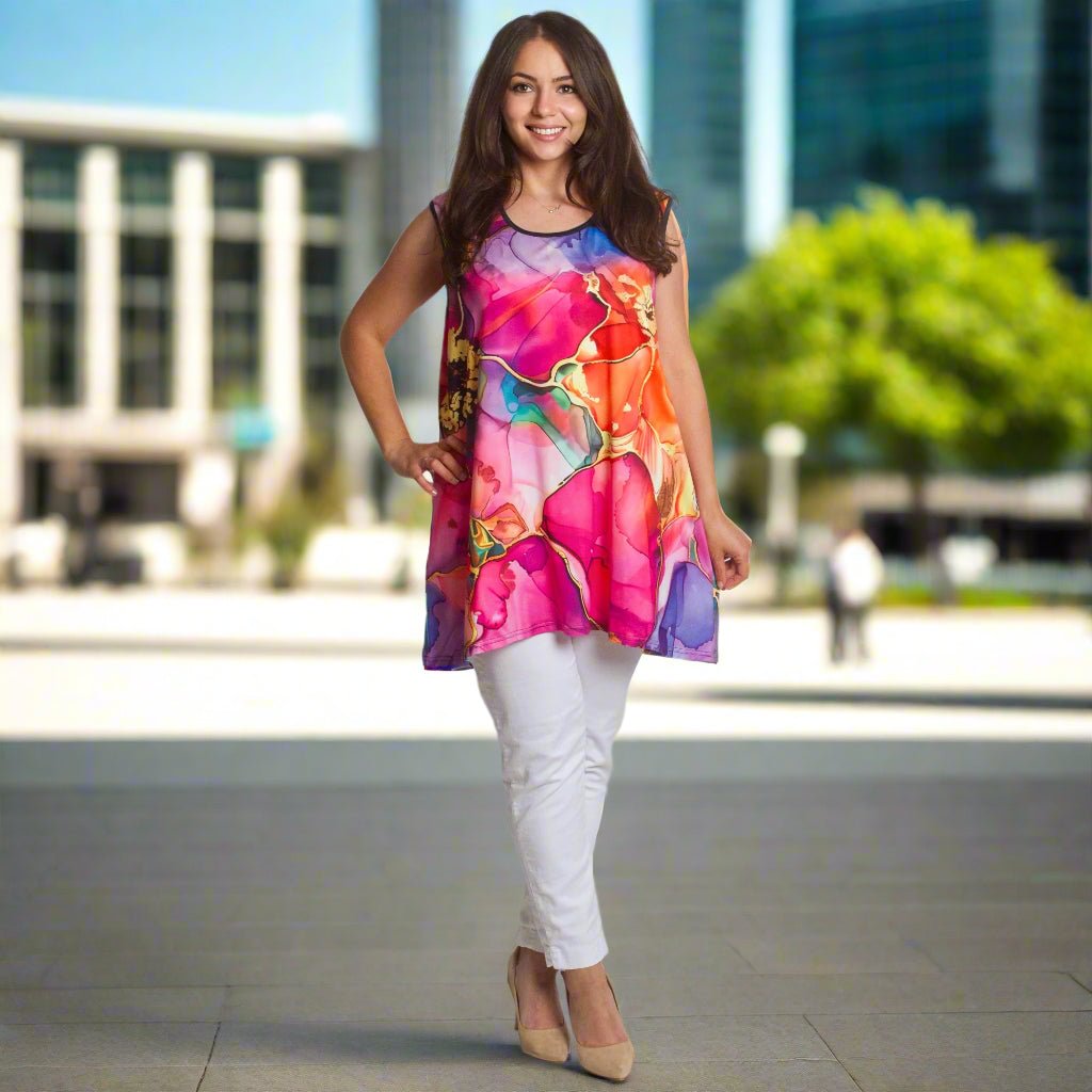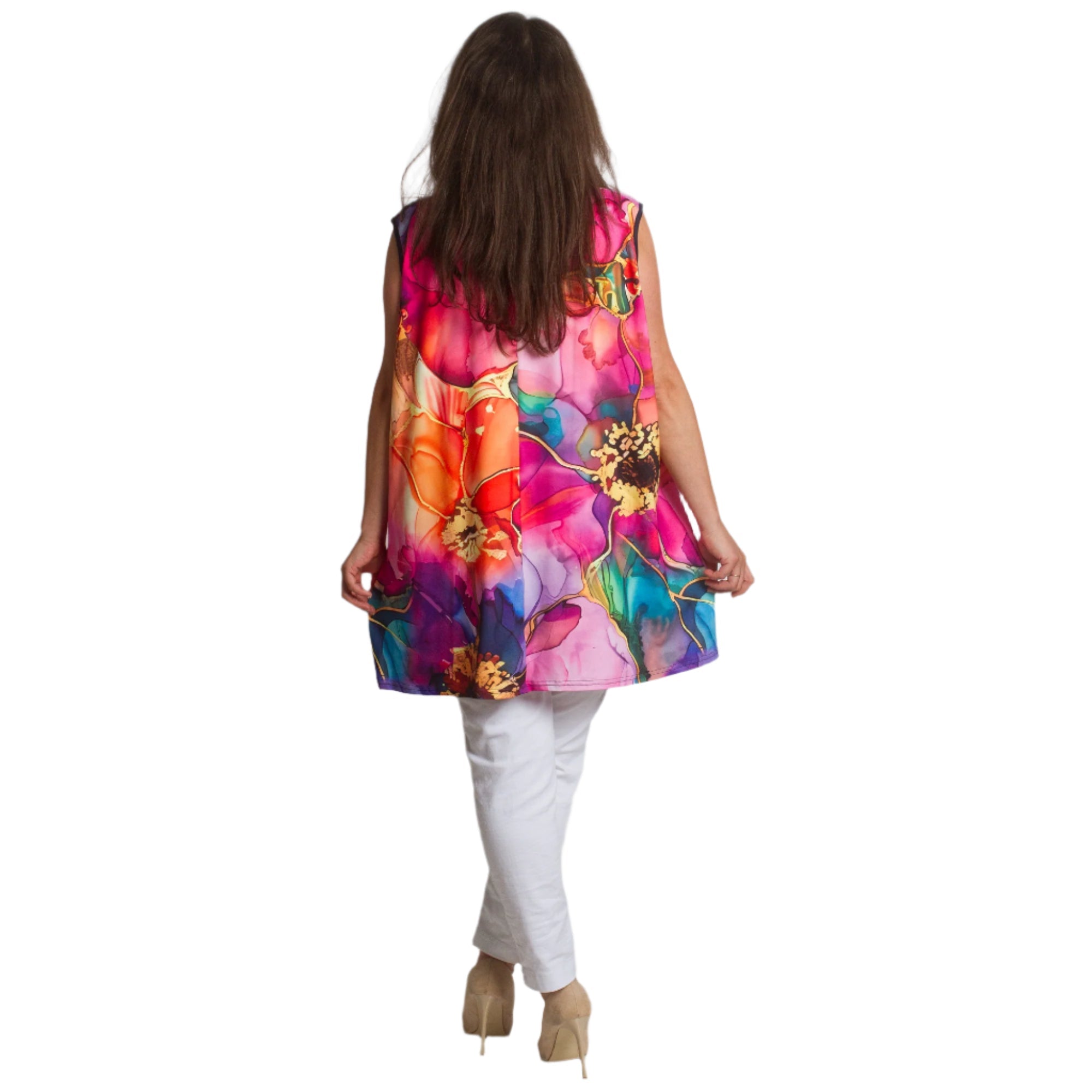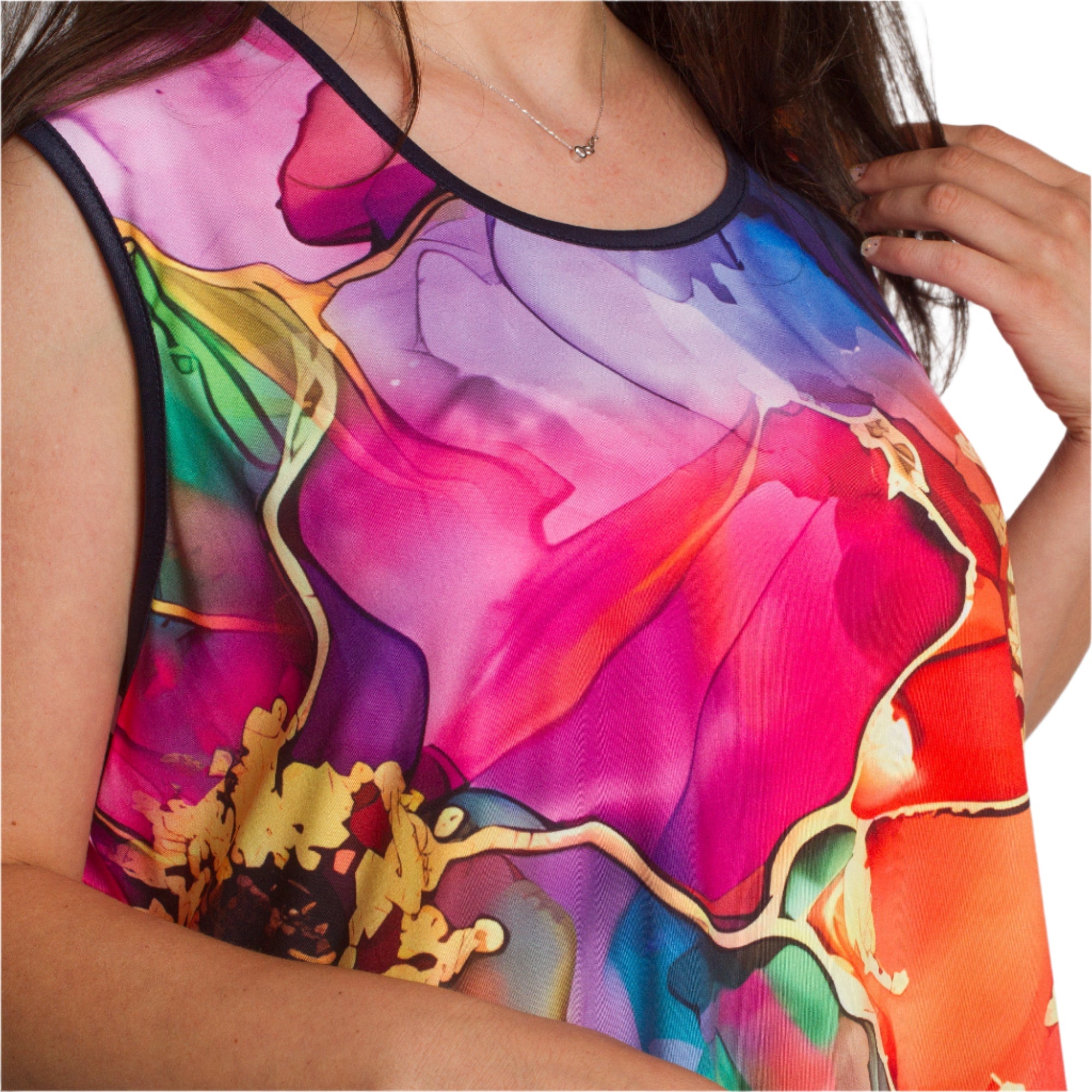 Откроете се с този впечатляващ потник в макси размери със цветен десен в топли, наситени цветове. Комбинацията от оранжево, розово, златисто и лилаво придава усещане за свежест и стил. Моделът е с класическо кръгло деколте и свободна кройка, която осигурява удобство през пролетно-летните дни. Материята е лека и еластична, подходяща за активното ежедневие на модерната жена.