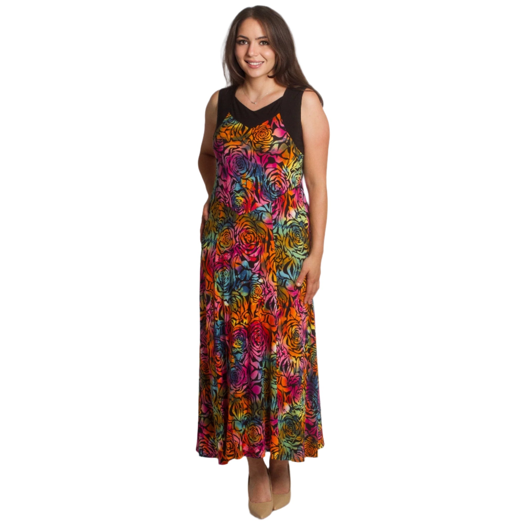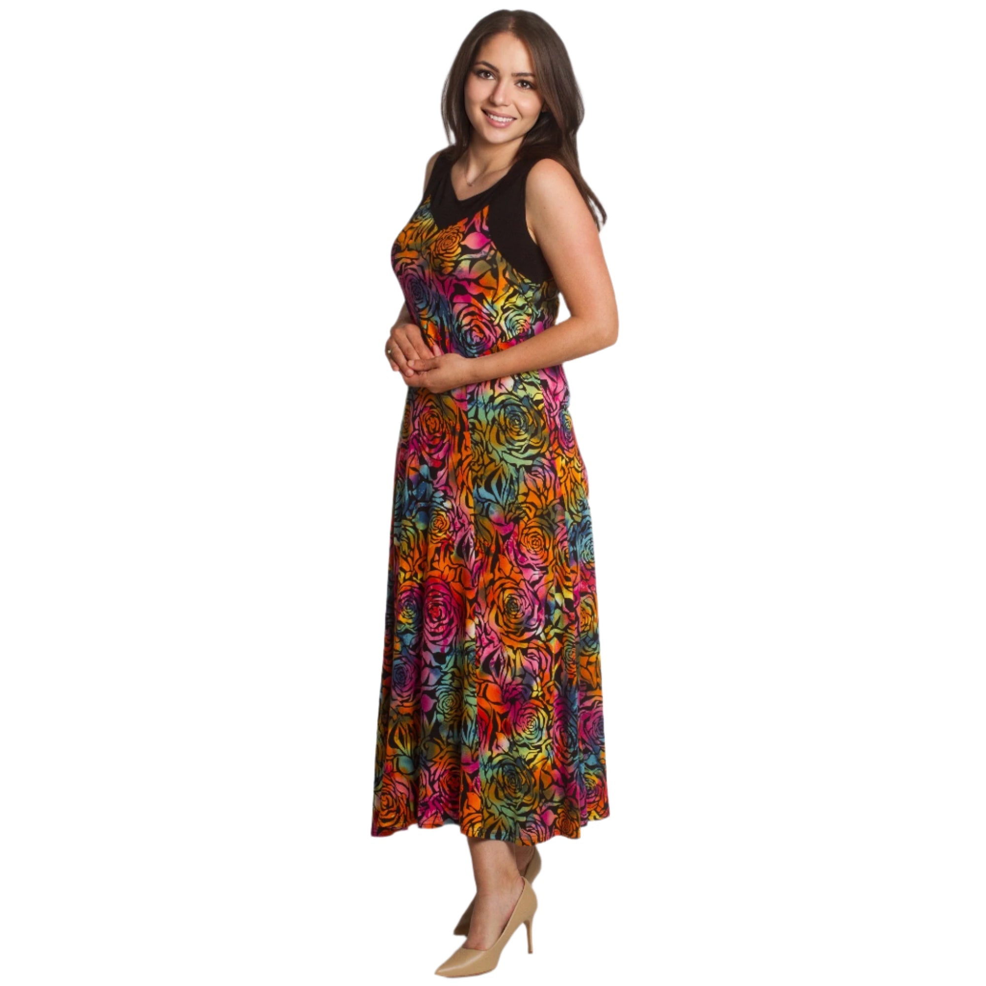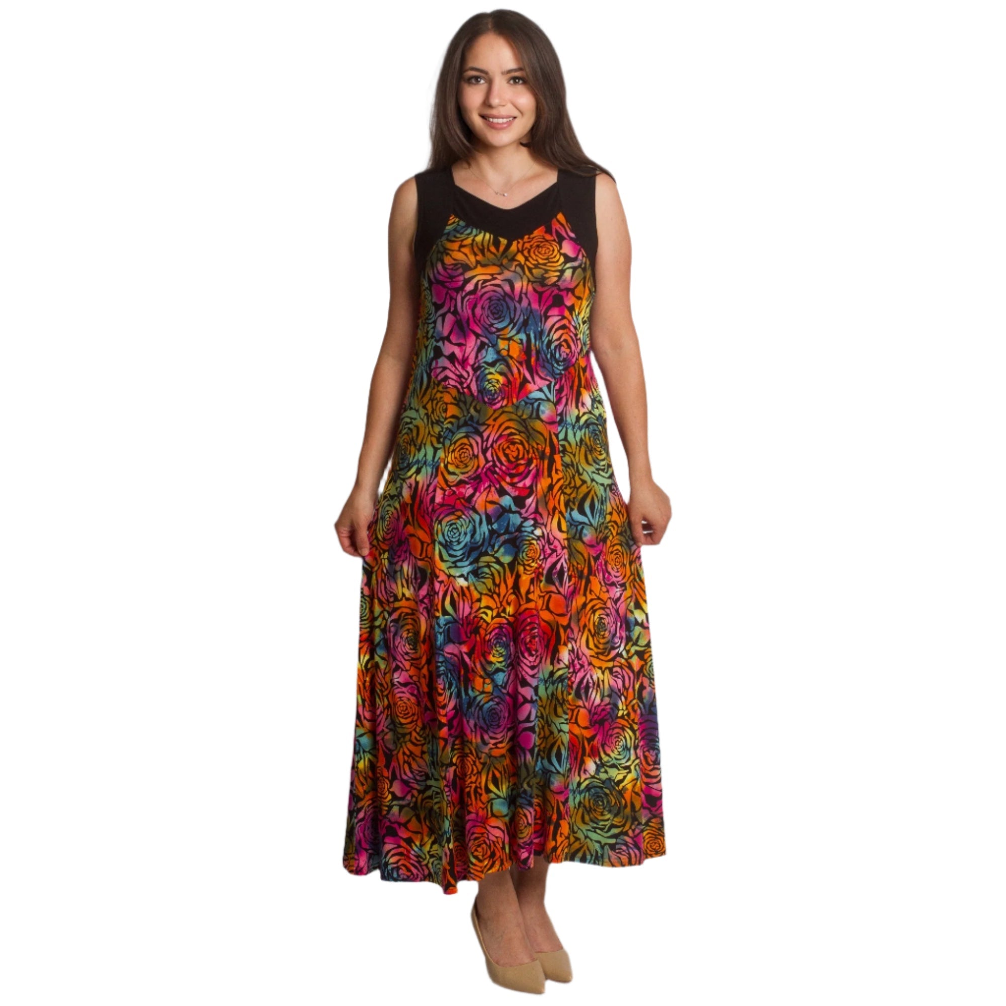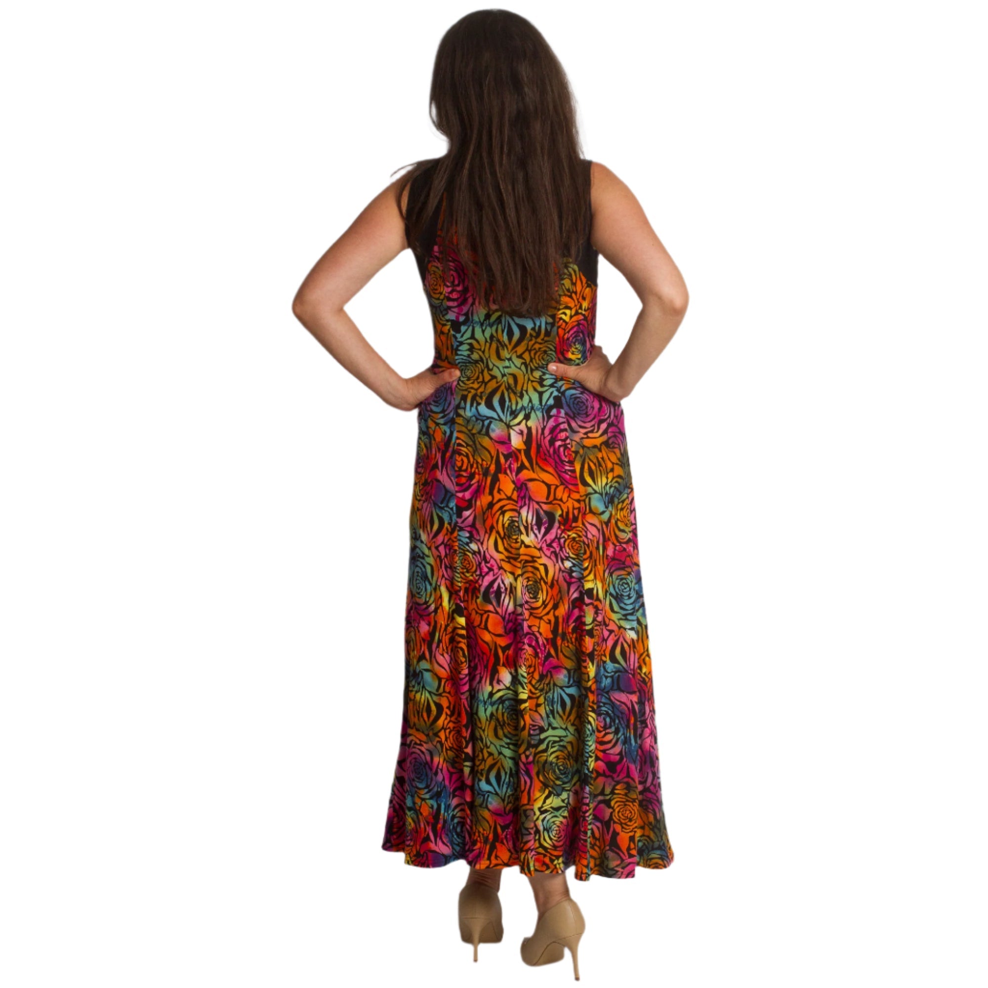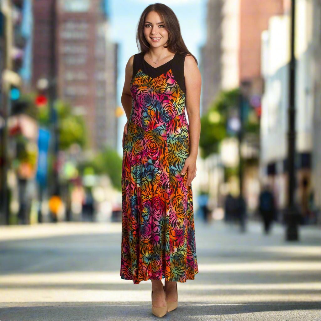 Свежа и стилна рокля с дължина до глезена и впечатляващ многоцветен принт с рози. Моделът е с еластична и дишаща материя от вискоза и еластан, която осигурява удобство през целия ден. V-образното деколте с контрастна черна горна част и дебели презрамки придава изискан акцент. Разкроената кройка подчертава женствеността и прикрива несъвършенства. Подходяща е както за ежедневие, така и за специални поводи през пролетно-летния сезон.