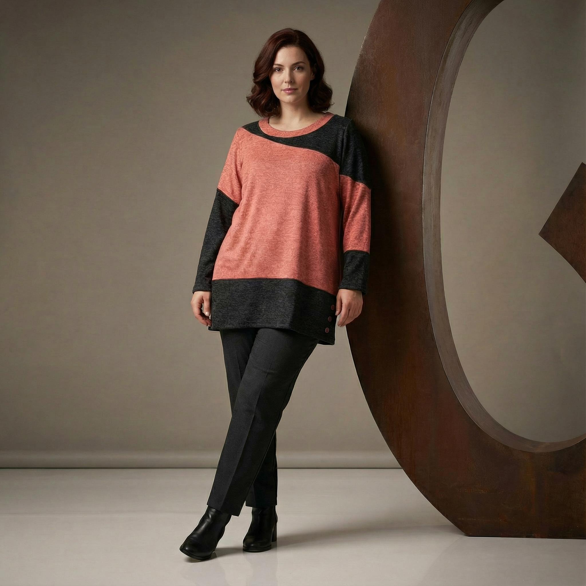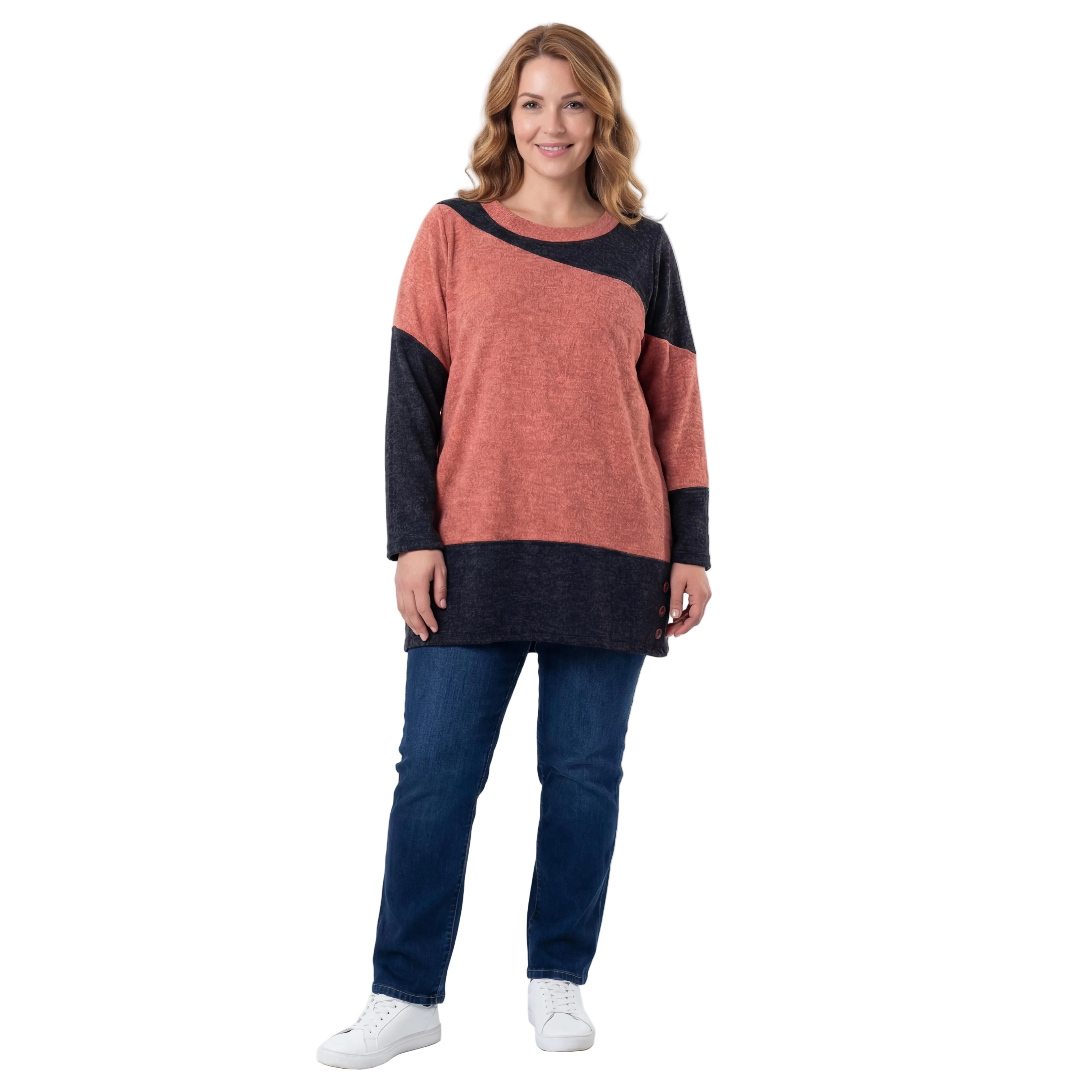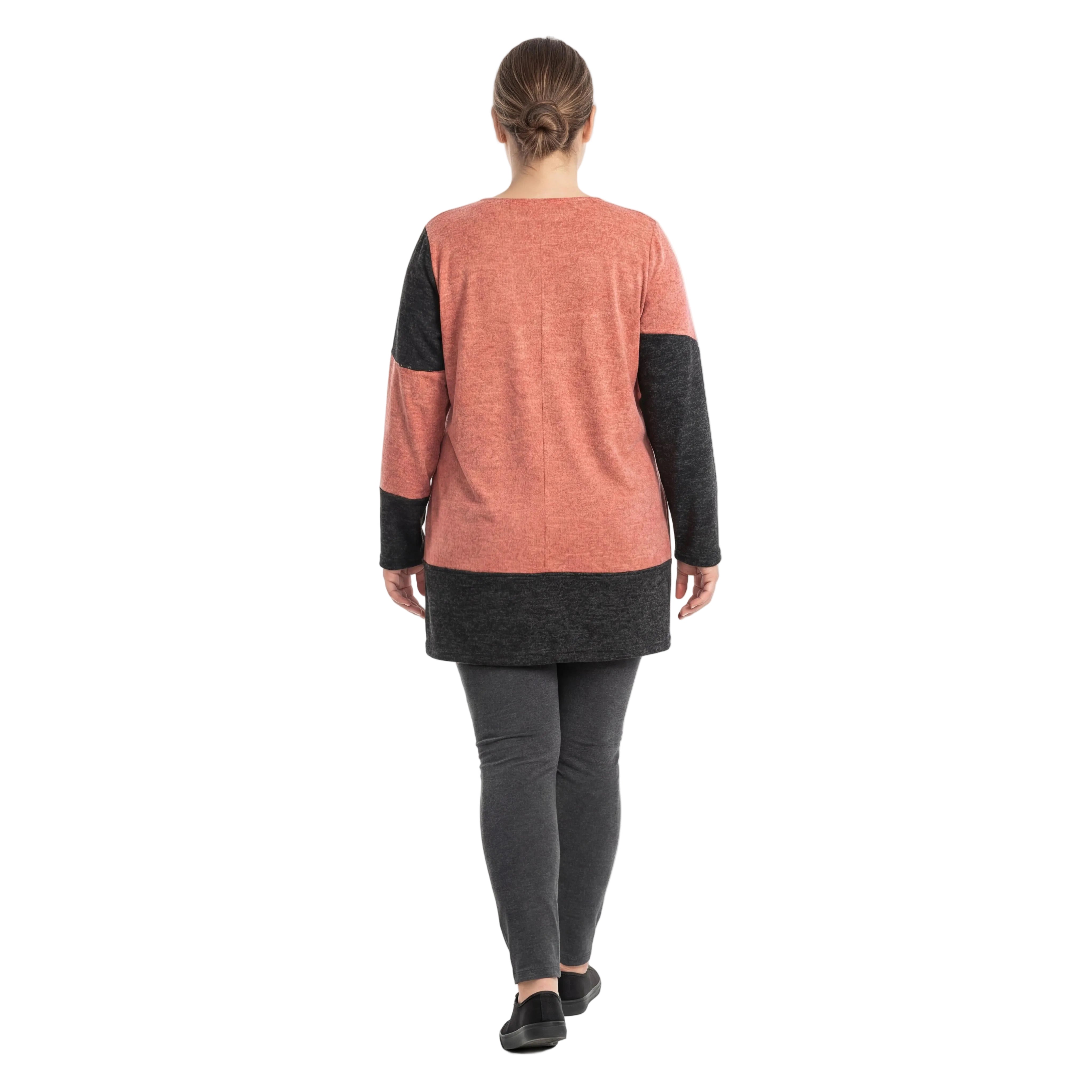 Прегърнете зимата с усмивка и цвят! Тази зимна туника не е просто дреха, а вашето тайно оръжие за уют. Комбинацията от топъл, меланжиран корал и структуриран графит създава модерен дизайн с контрастни панели, който елегантно очертава силуета. Асиметричният дизайн на ръкавите и диагоналната лента при деколтето добавят артистичен и разчупен вид, докато правата кройка пада тежко и елегантно, осигурявайки пълна свобода на движението. Изработена от плътна, но дишаща материя с високо съдържание на вискоза, тя гали кожата и носи усещане за мек пашкул. Трите декоративни копчета в долния край са финалният щрих, който превръща тази туника в перфектния избор за дните, когато искате да се чувствате едновременно красива и безкрайно удобно.