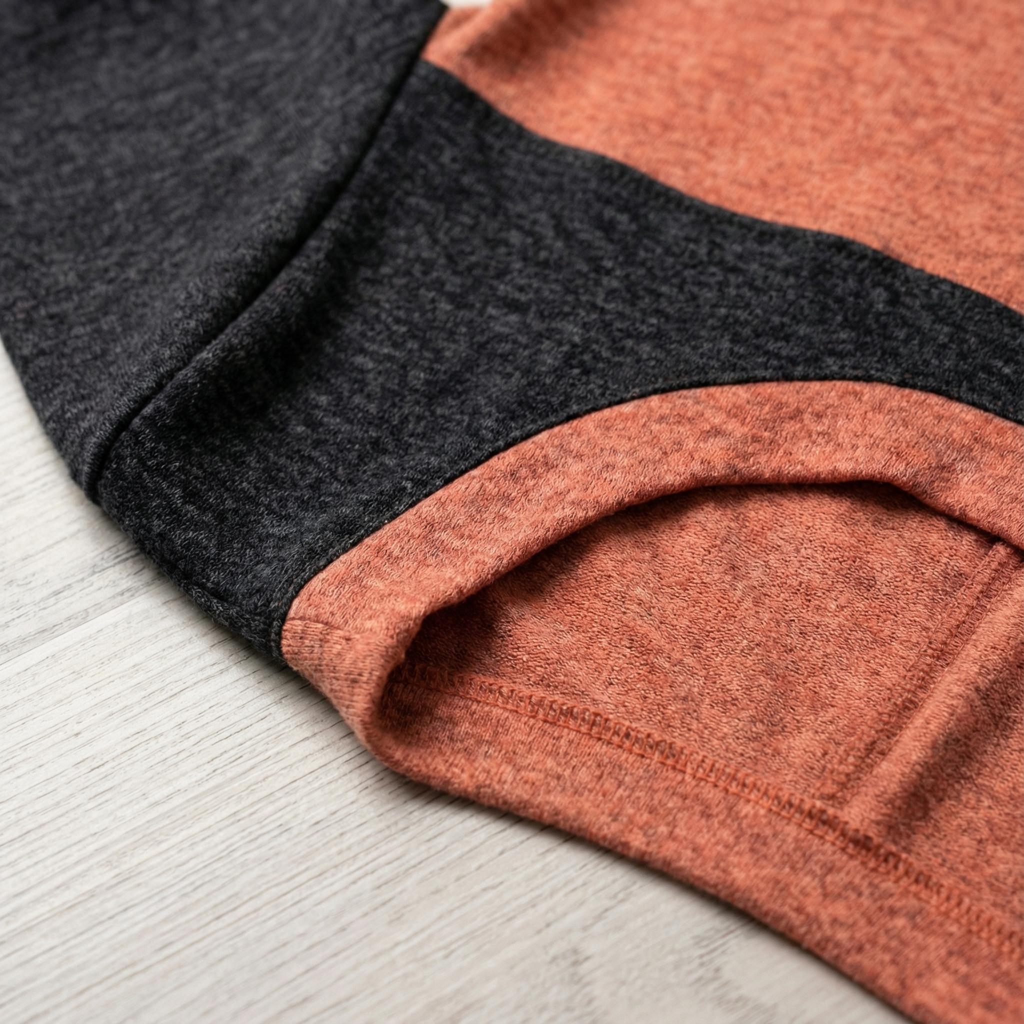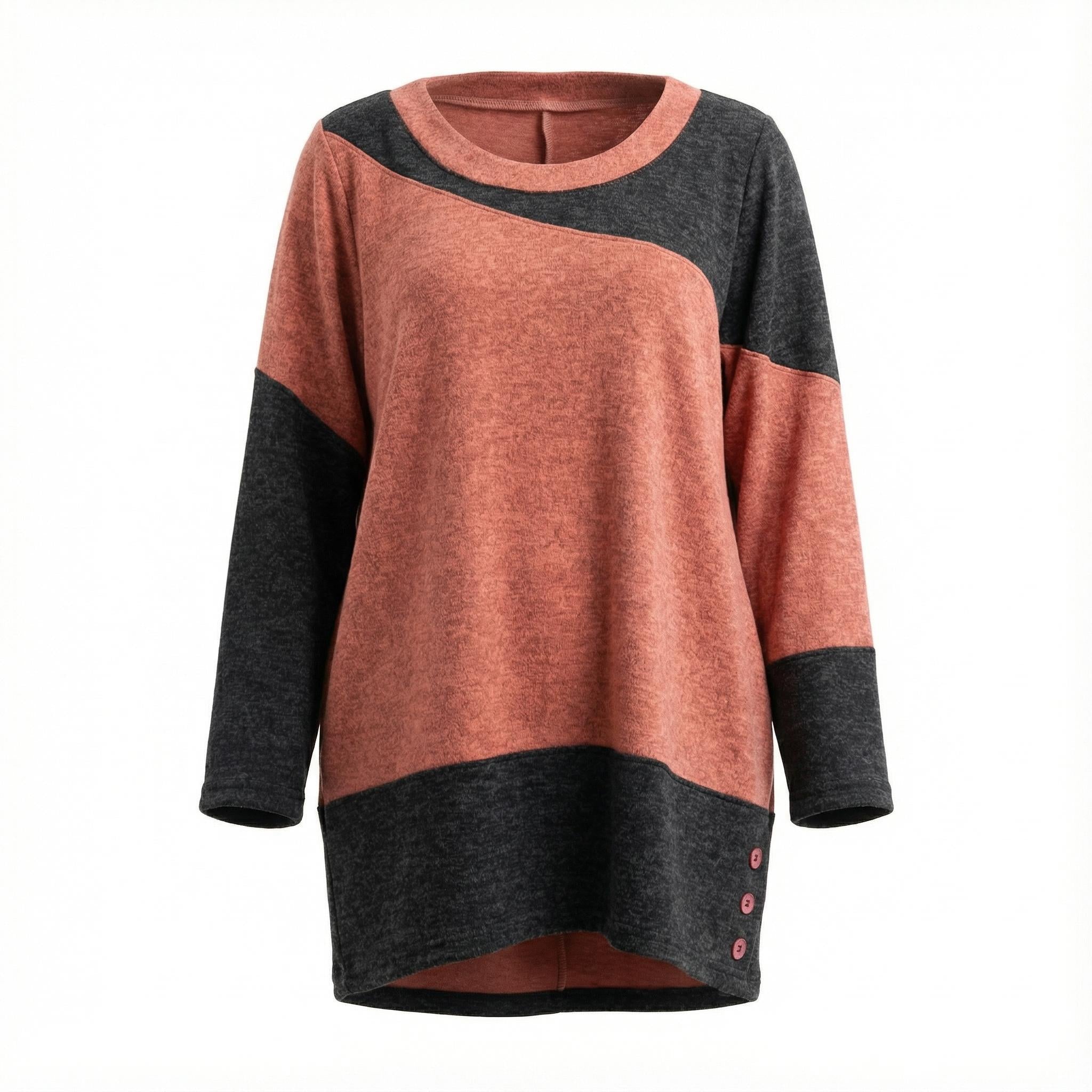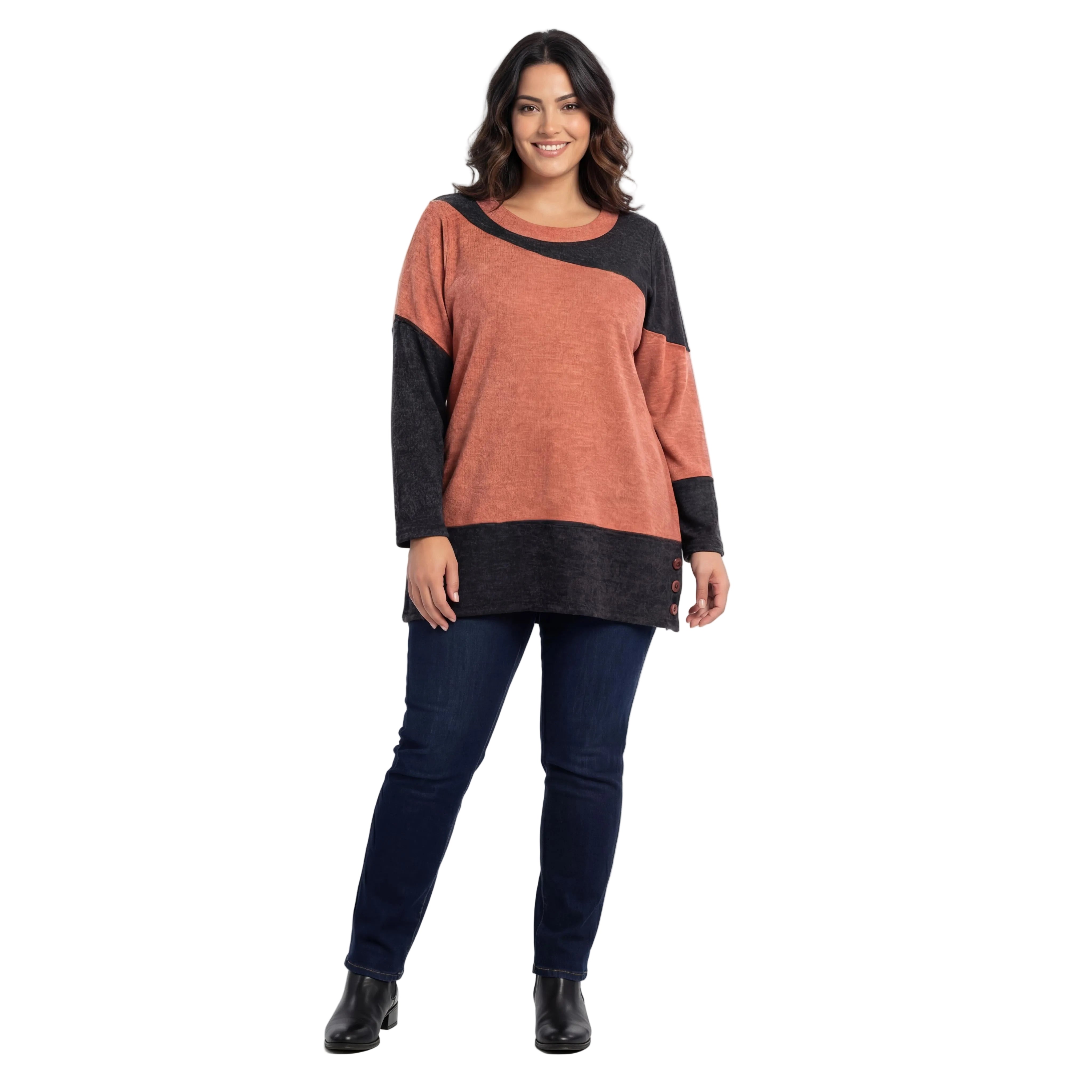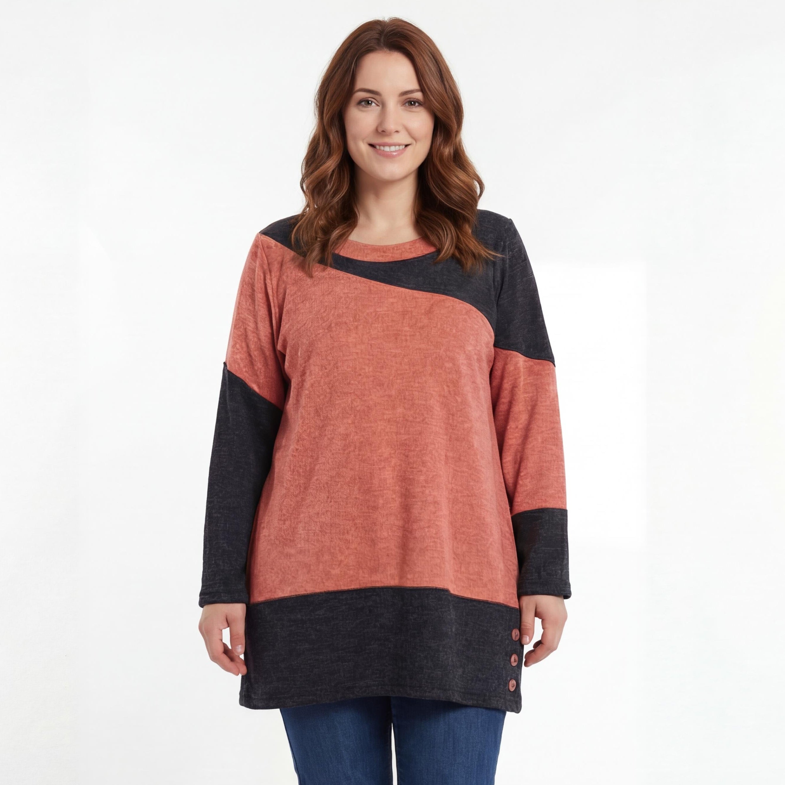 Прегърнете зимата с усмивка и цвят! Тази зимна туника не е просто дреха, а вашето тайно оръжие за уют. Комбинацията от топъл, меланжиран корал и структуриран графит създава модерен дизайн с контрастни панели, който елегантно очертава силуета. Асиметричният дизайн на ръкавите и диагоналната лента при деколтето добавят артистичен и разчупен вид, докато правата кройка пада тежко и елегантно, осигурявайки пълна свобода на движението. Изработена от плътна, но дишаща материя с високо съдържание на вискоза, тя гали кожата и носи усещане за мек пашкул. Трите декоративни копчета в долния край са финалният щрих, който превръща тази туника в перфектния избор за дните, когато искате да се чувствате едновременно красива и безкрайно удобно.