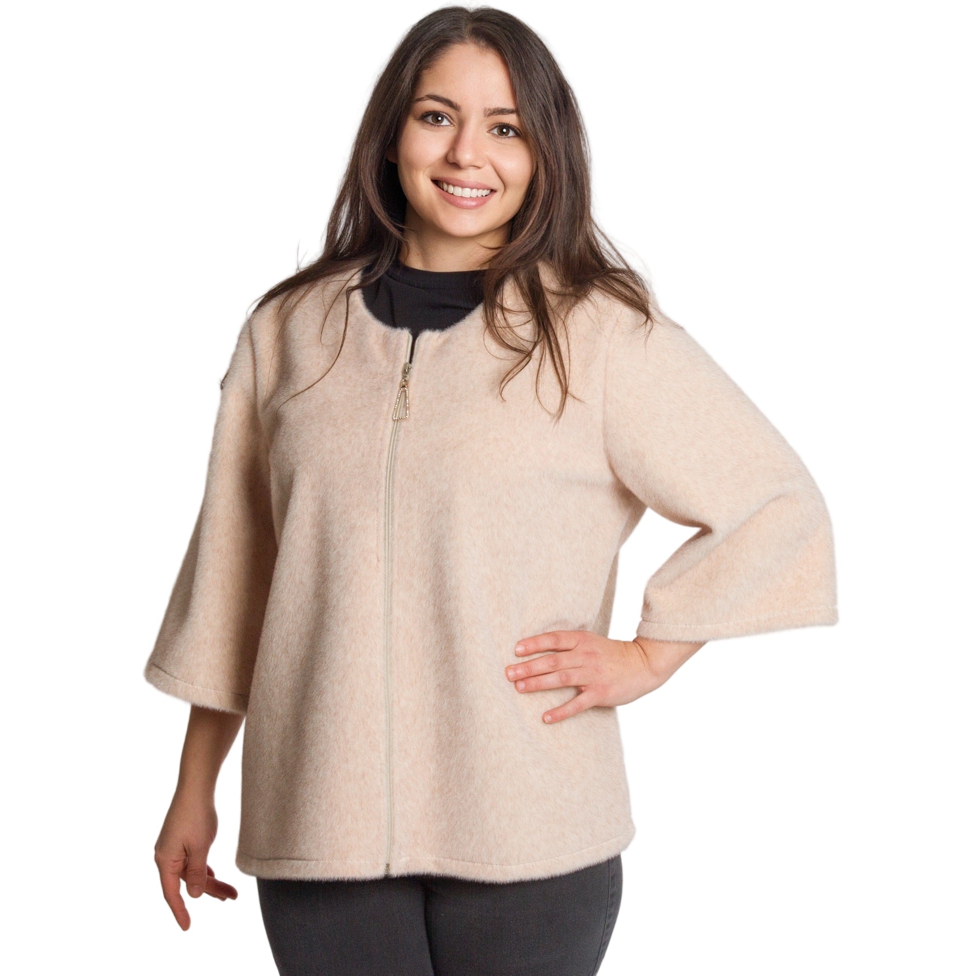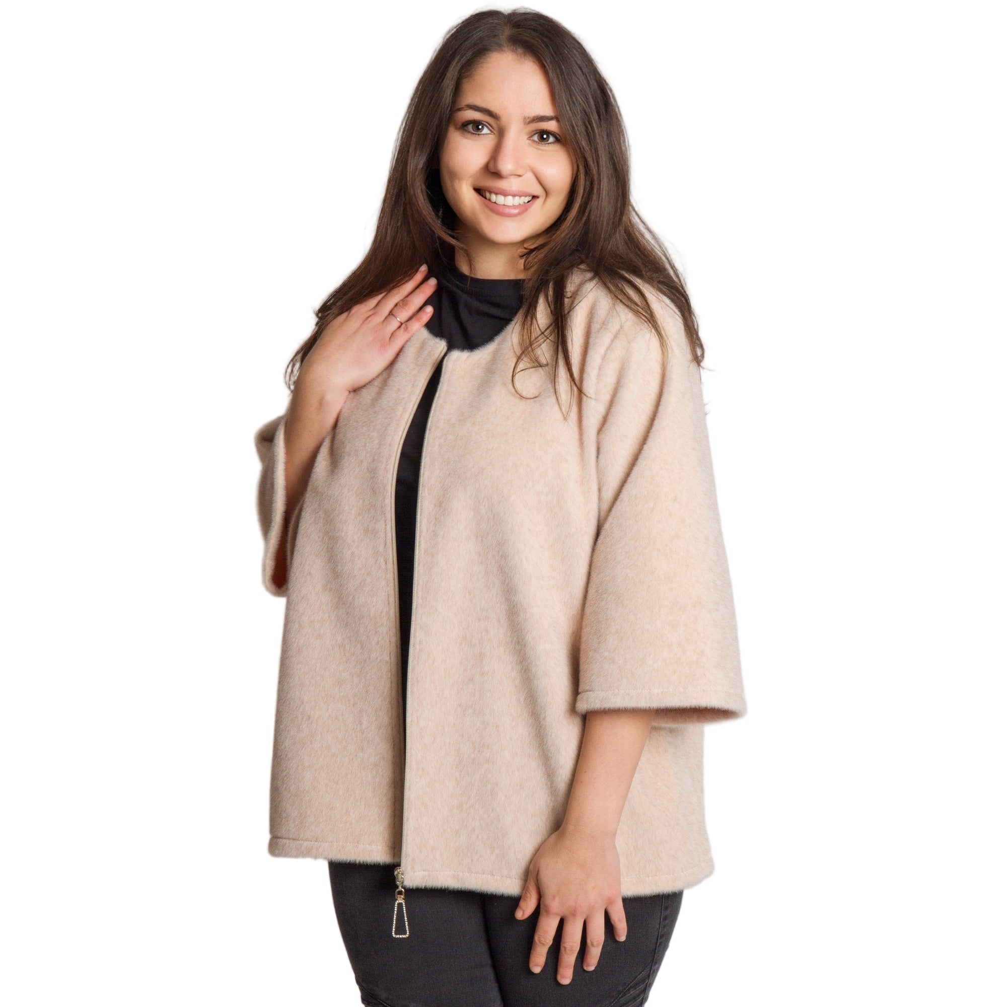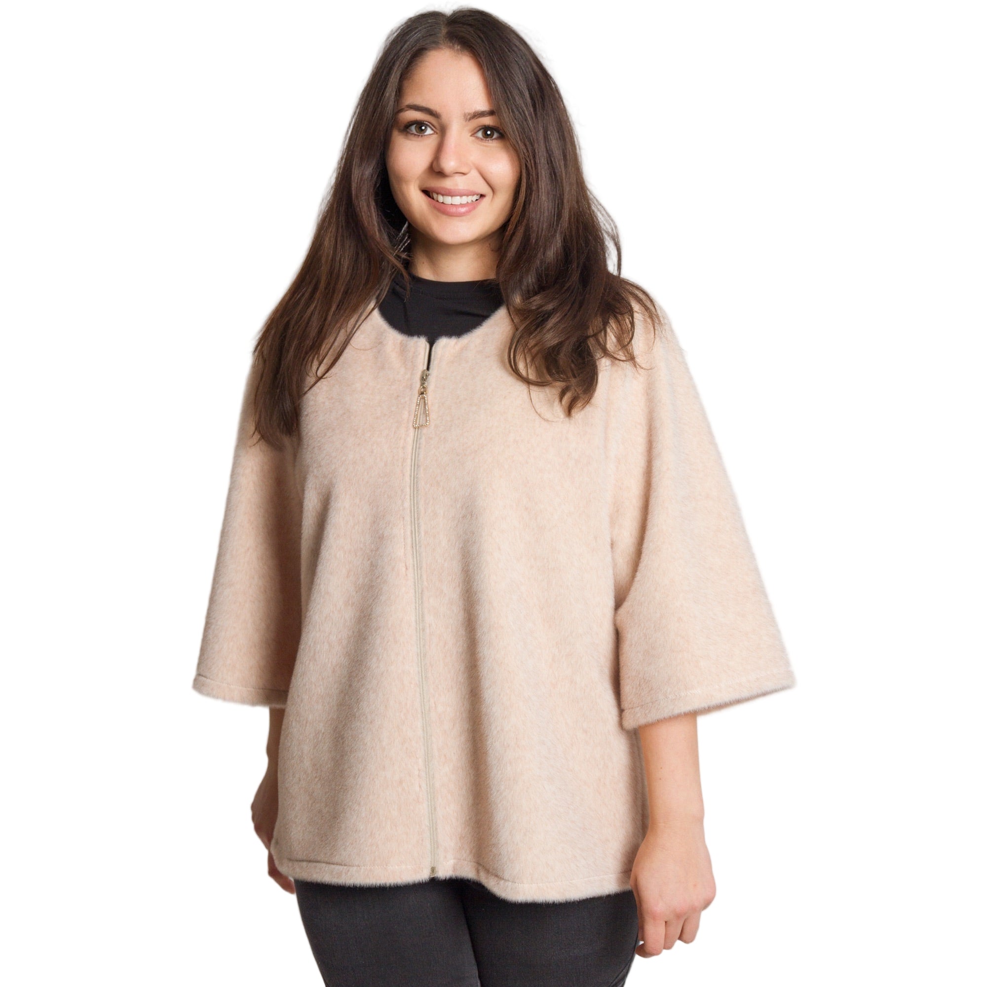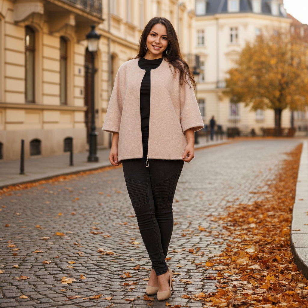 Този елегантен бежов жакет е идеален избор за пролетно есенните и зимни дни като съчетава комфорт и стил в едно. Меката полиестерна материя осигурява приятно усещане върху кожата а свободната кройка пада красиво по тялото и гарантира удобство през целия ден. Дизайнът с цип придава модерна и практична визия а 3/4 ръкавите допринасят за лекота и свобода на движение. Подходящ за ежедневни и официални поводи и за дамите които търсят комфорт и стил в големи размери.