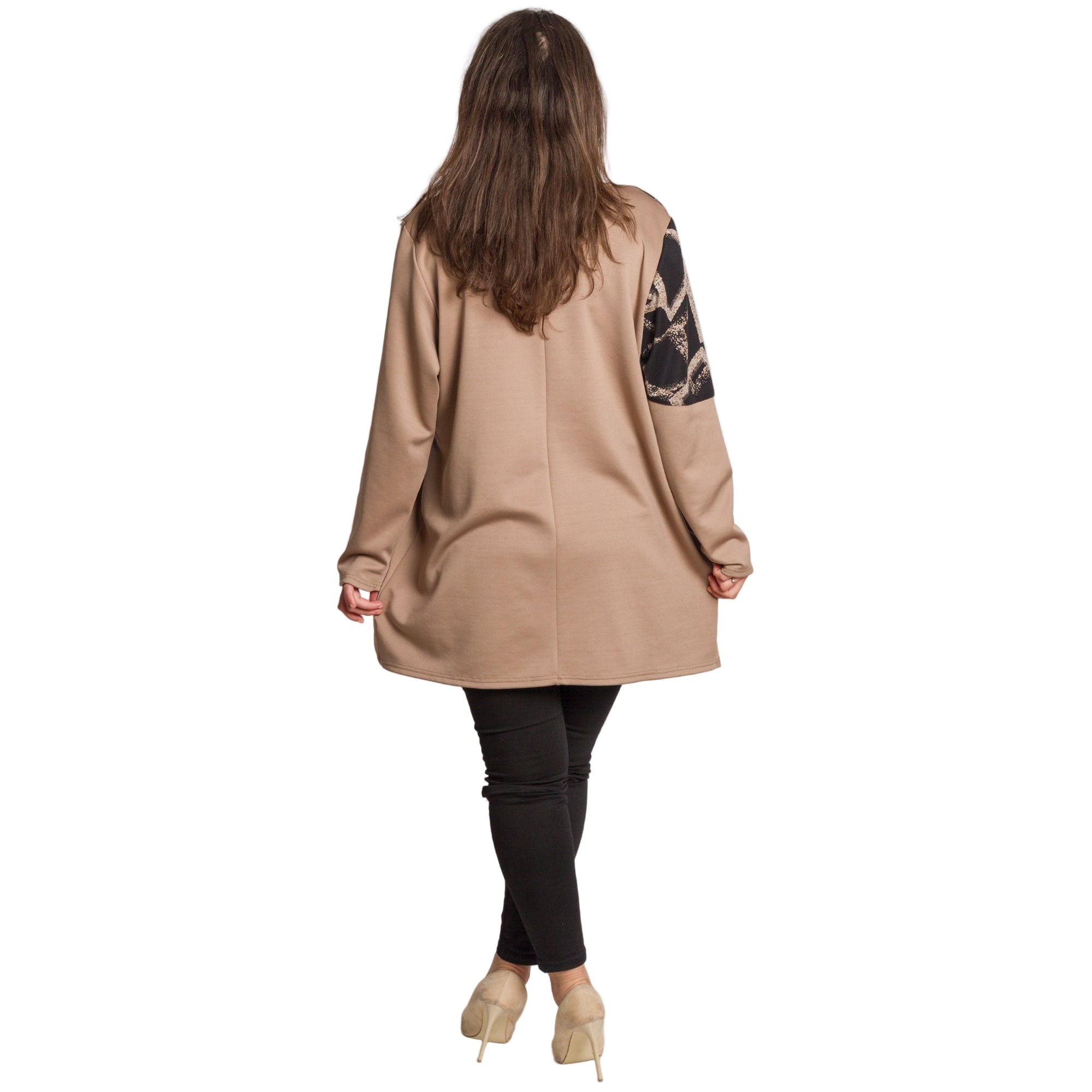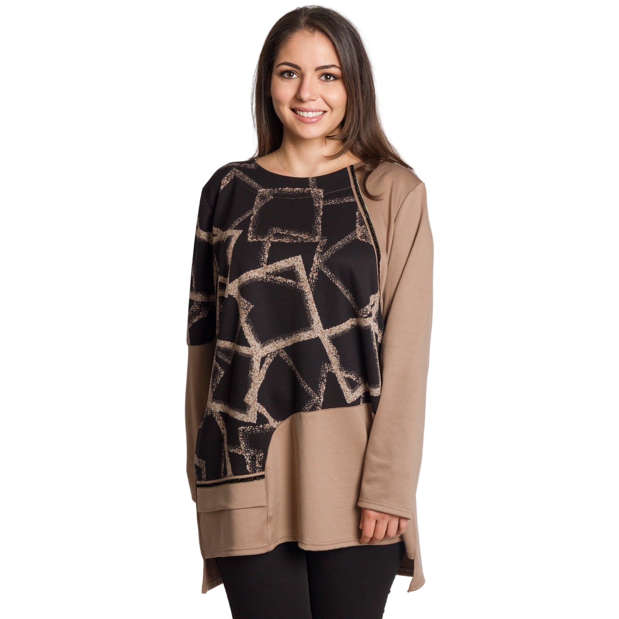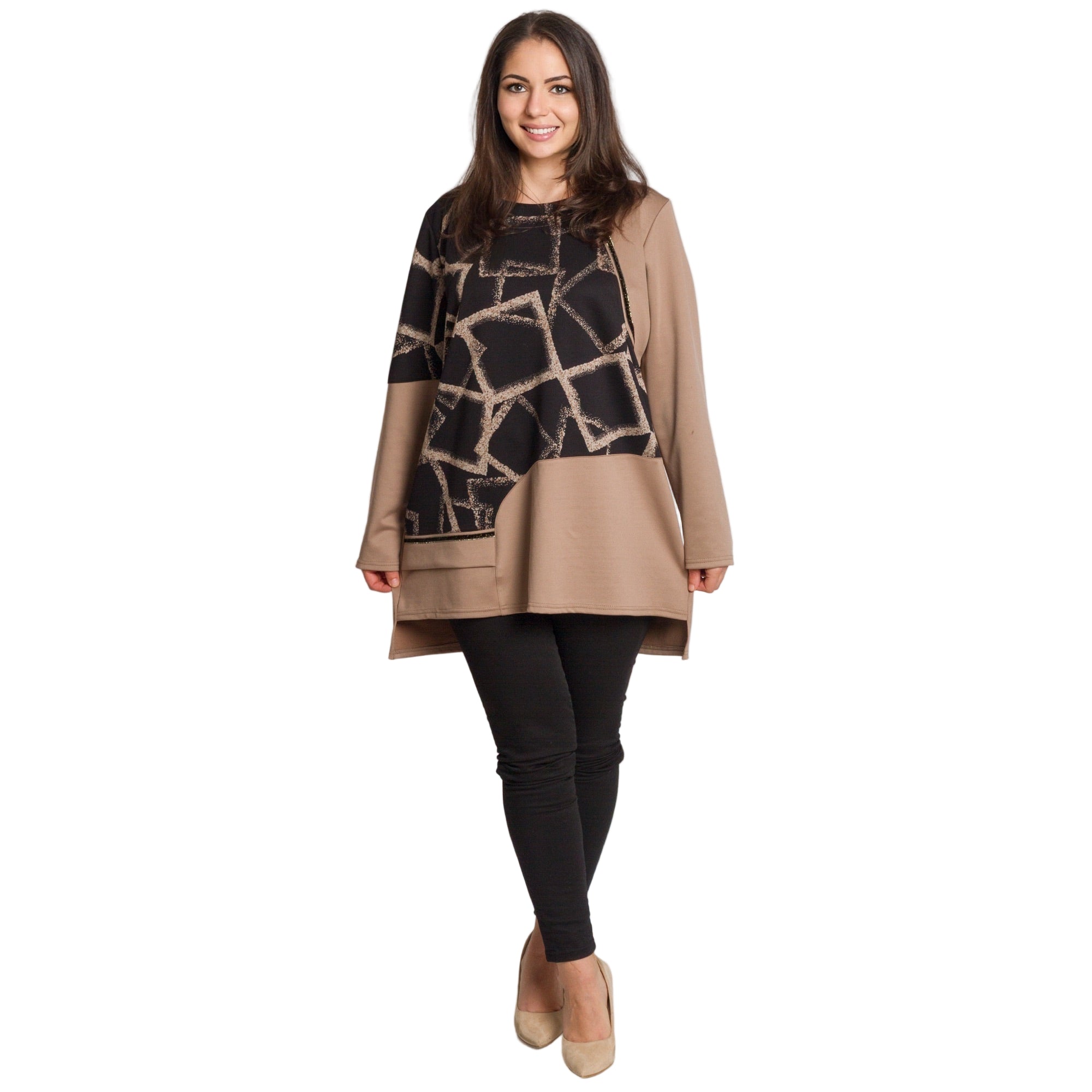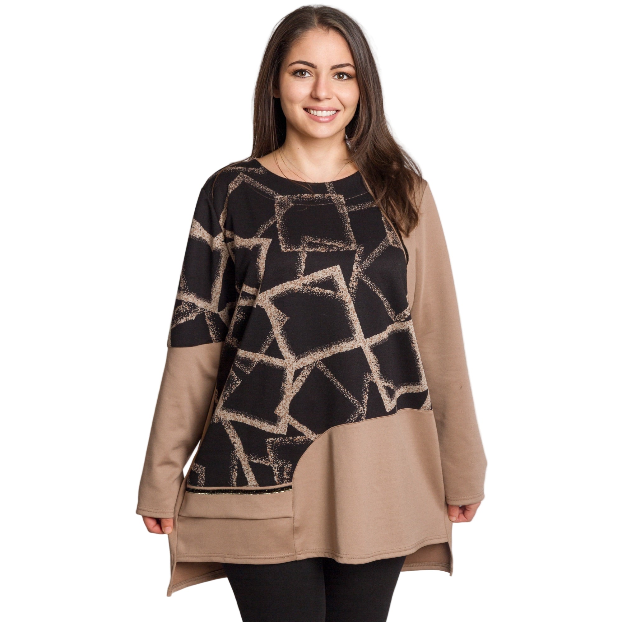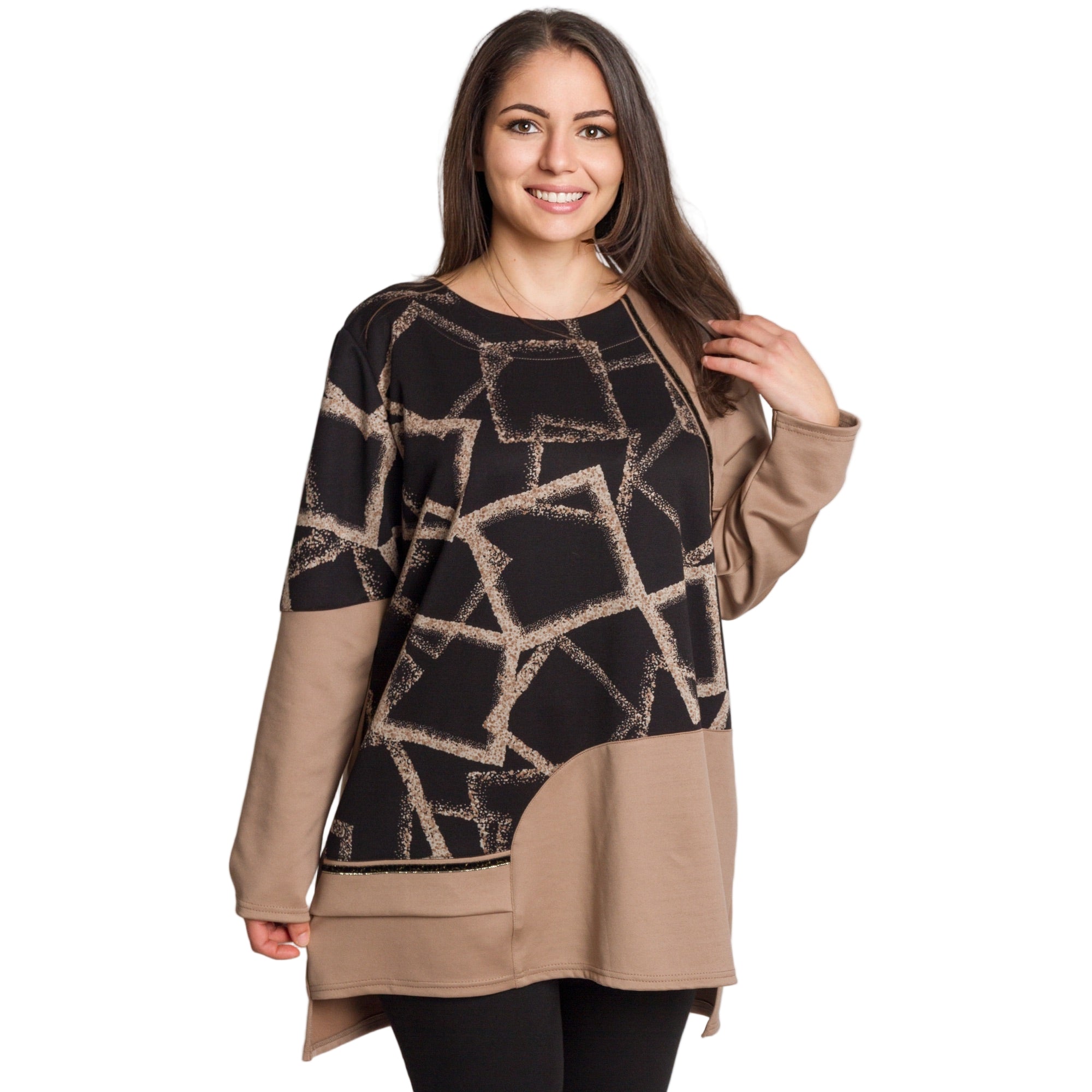 Модерна туника в големи размери, съчетаваща стил и комфорт. Изработена е от висококачествена еластична вискоза с ликра, която осигурява мекота и удобство през целия ден. Моделът впечатлява с асиметричен дизайн и контраст между черна горна част с геометричен десен и едноцветна бежова долна част и ръкави. Свободната кройка прикрива нежно извивките, а дължината, покриваща ханша, я прави идеален избор както за ежедневни, така и за официални поводи през есенно-зимния сезон.