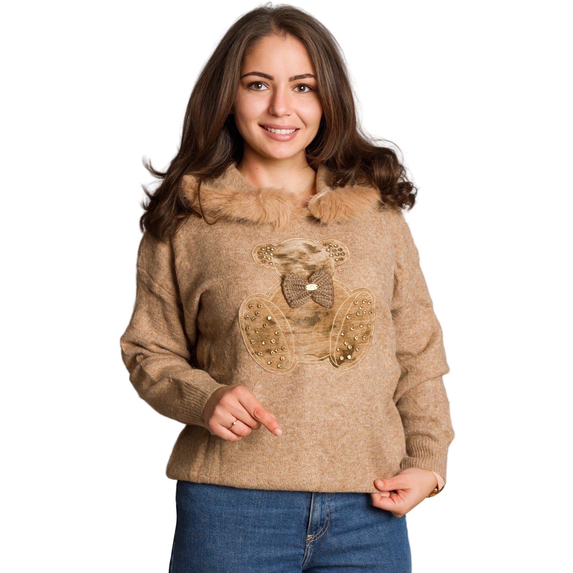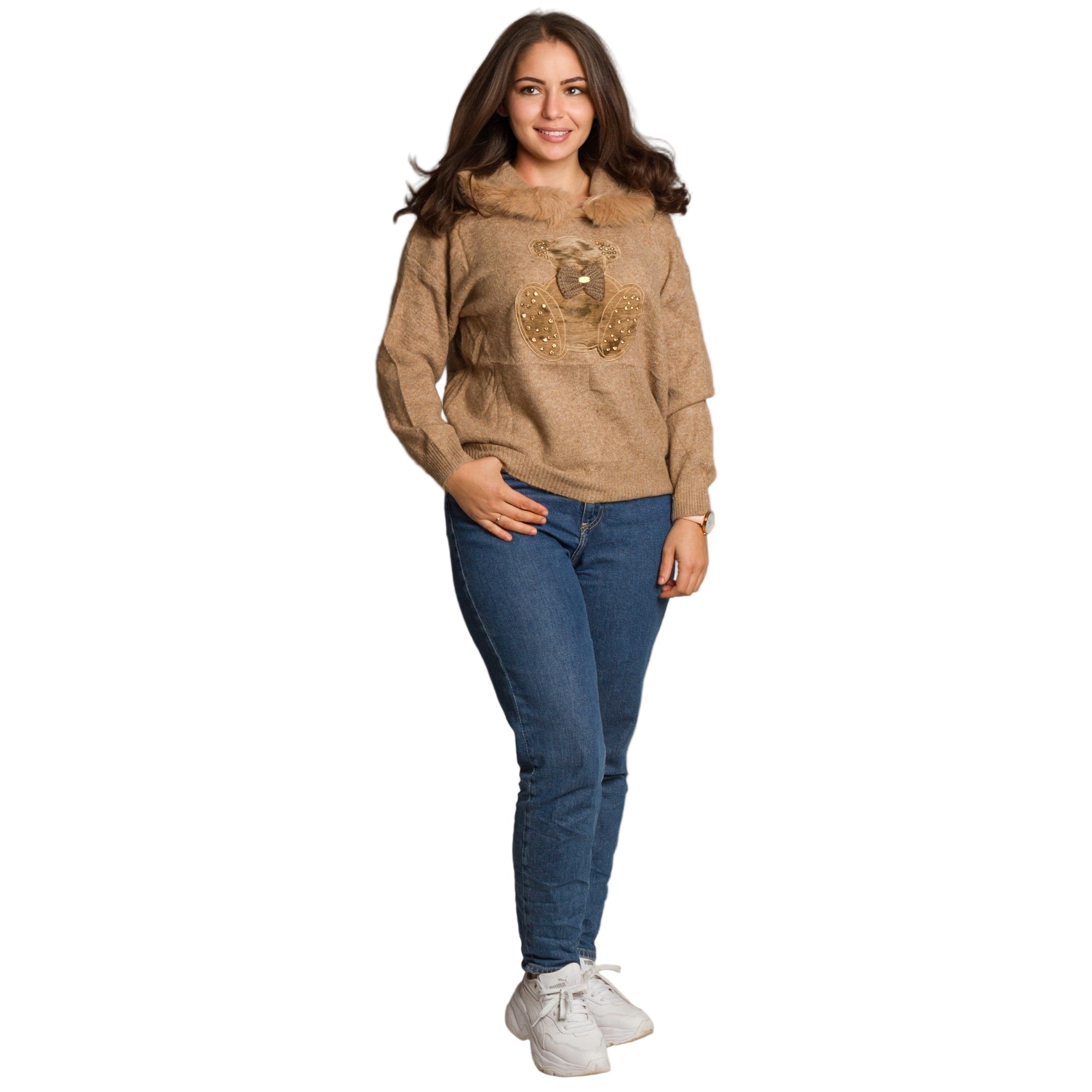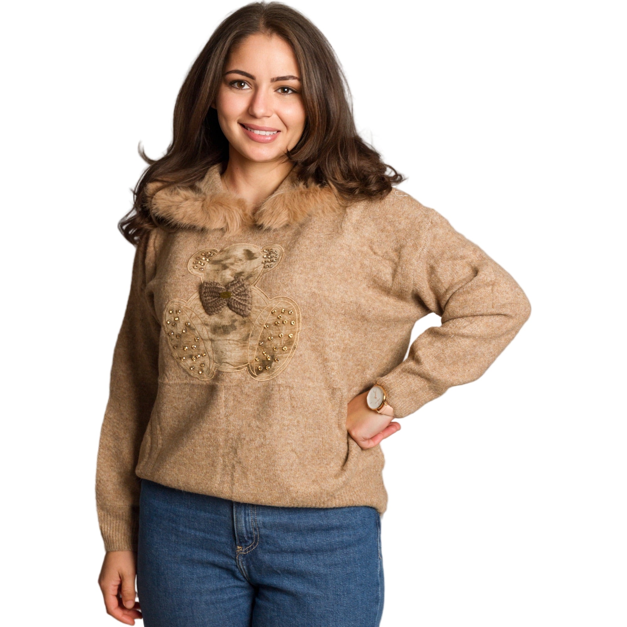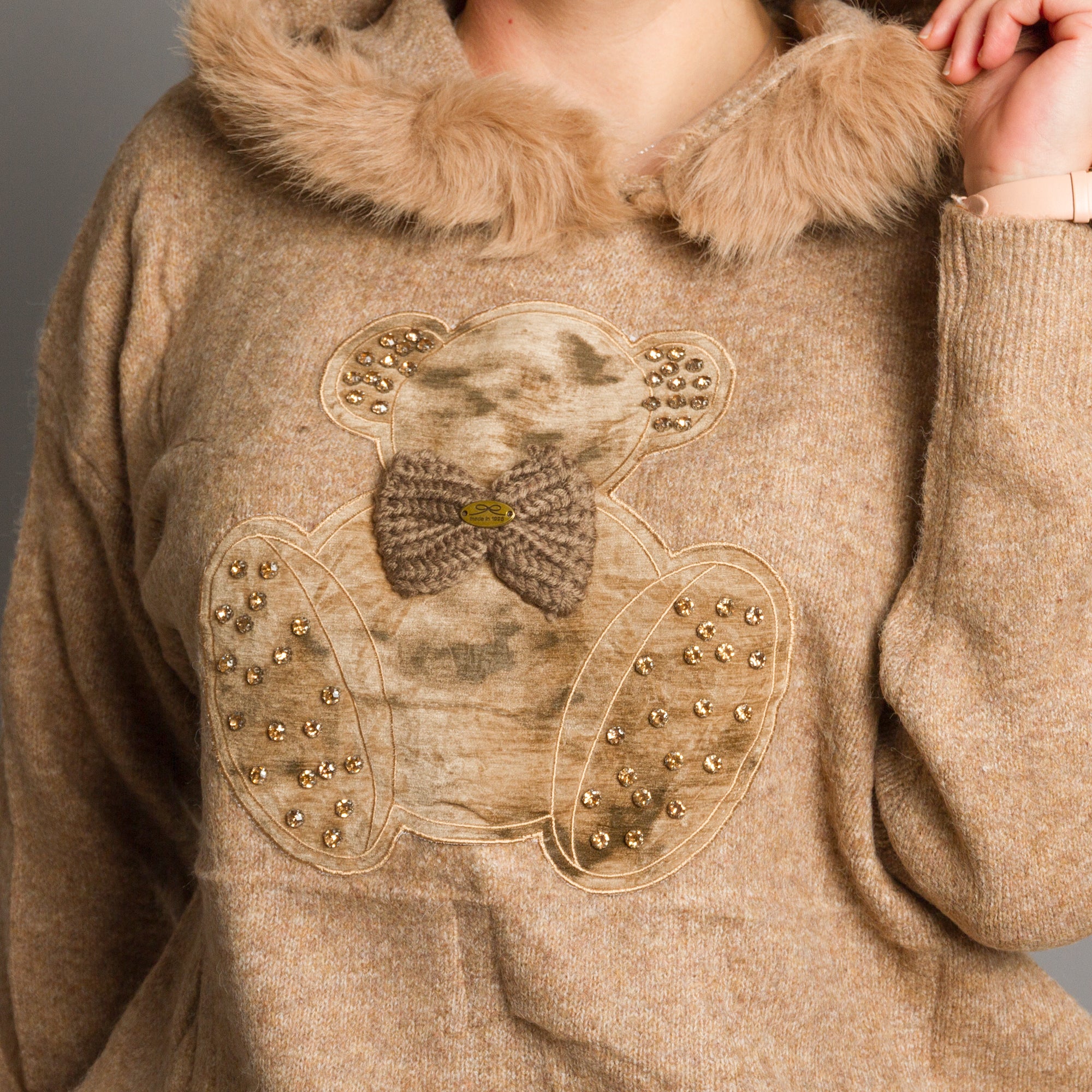 Добавете уют и чар към гардероба си с тази топла бежова блуза с апликация на мече и пухкава яка от изкуствен пух. Изработена от мека и еластична материя с вълна, полиестер и акрил, тя осигурява комфорт и топлина през студените дни. Декоративното мече отпред е украсено с малки златисти капси и плетена папийонка, придаващи игрив и модерен акцент. Перфектна за ежедневието, разходки или уютни моменти у дома.
