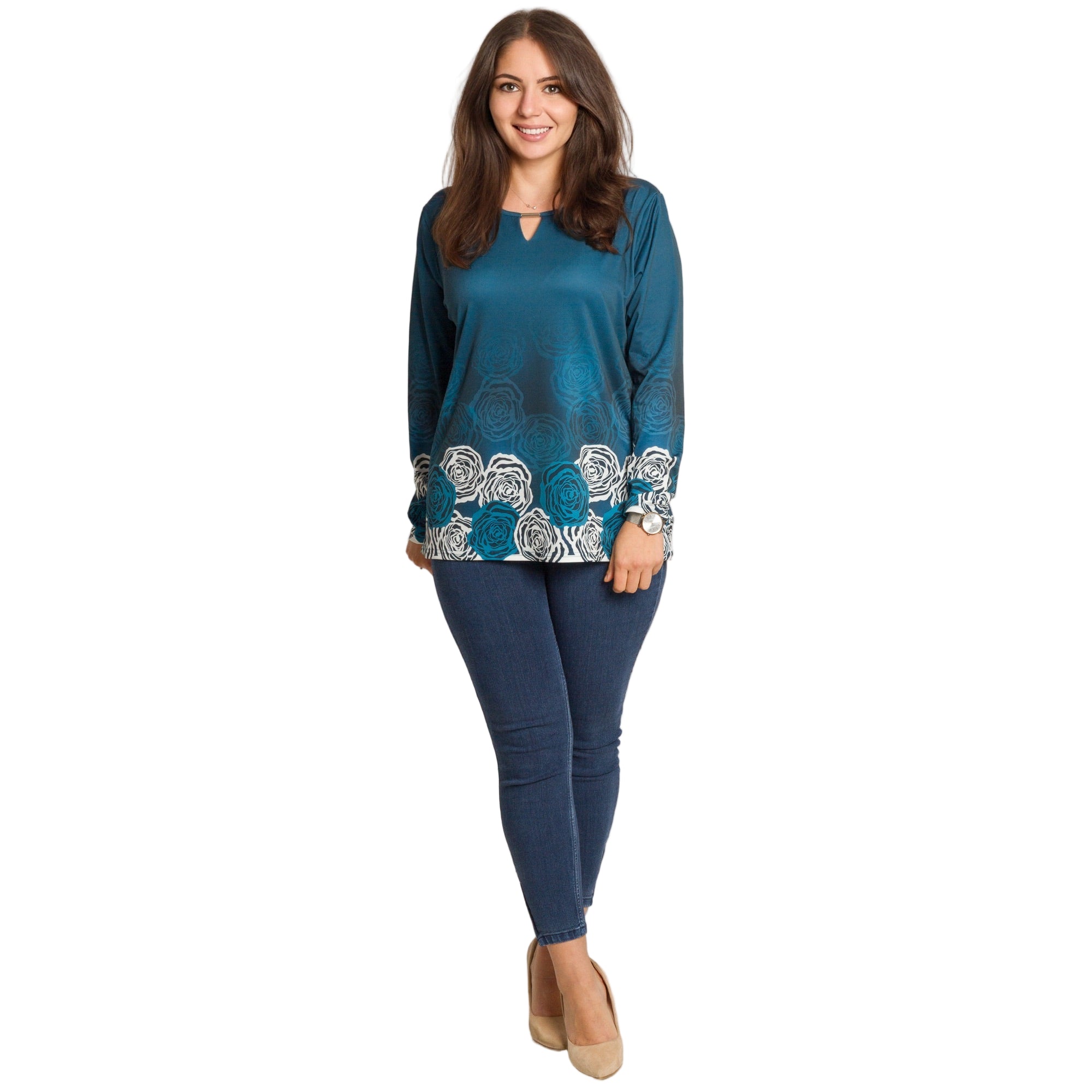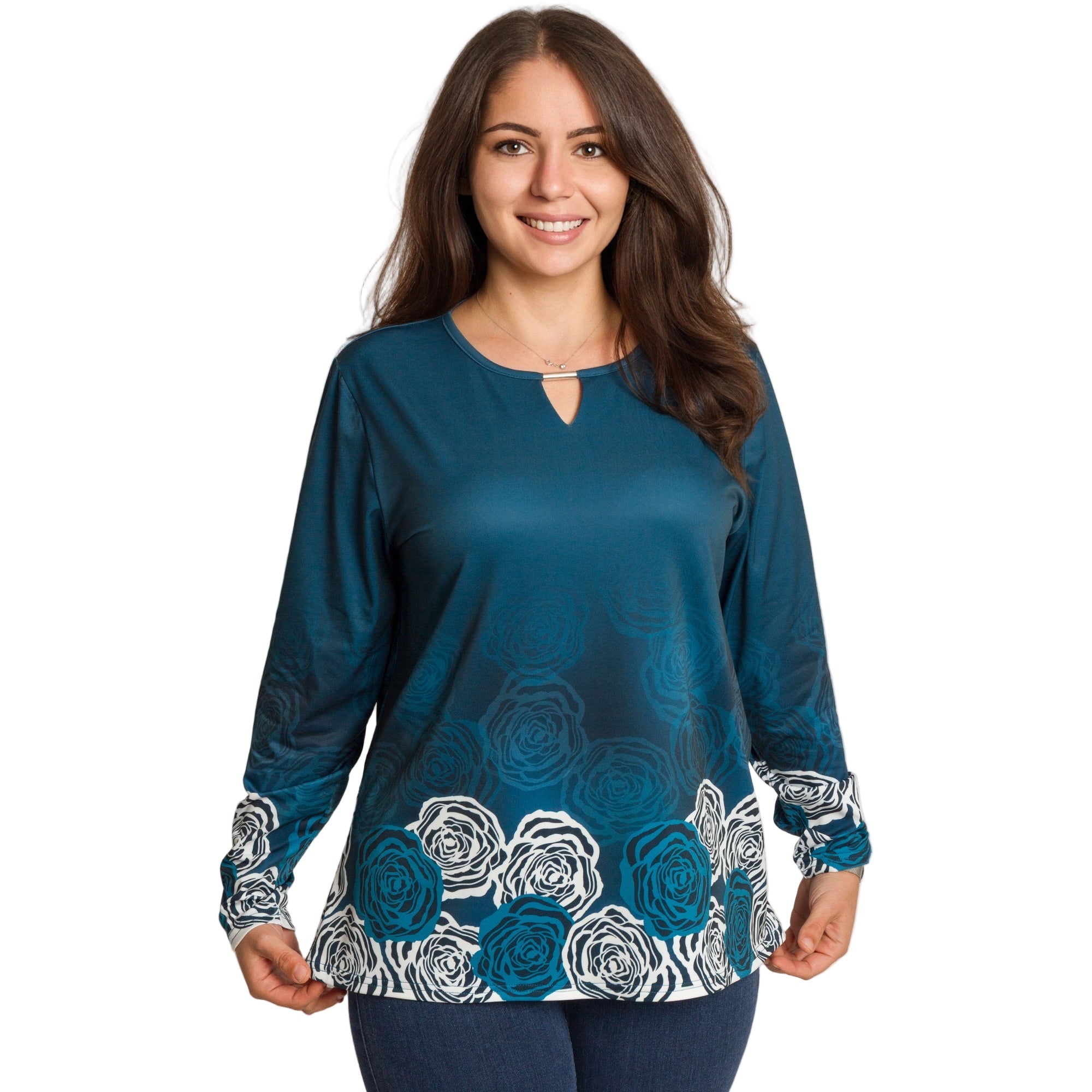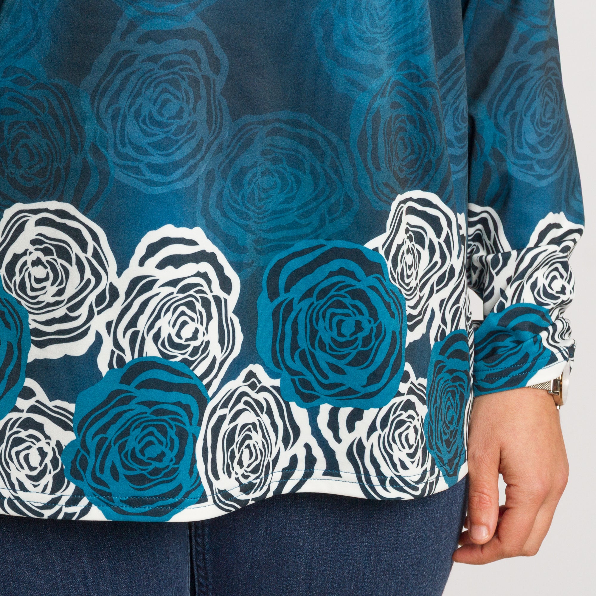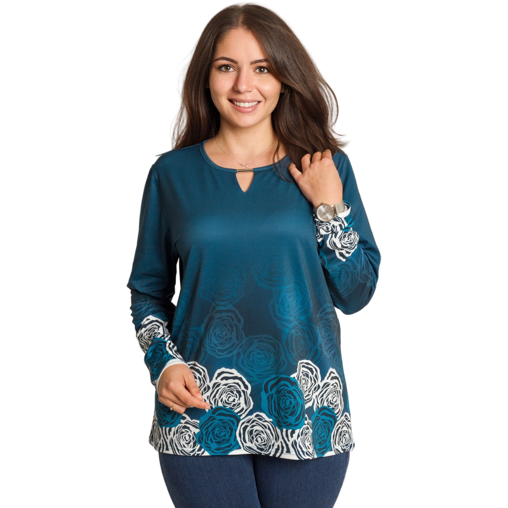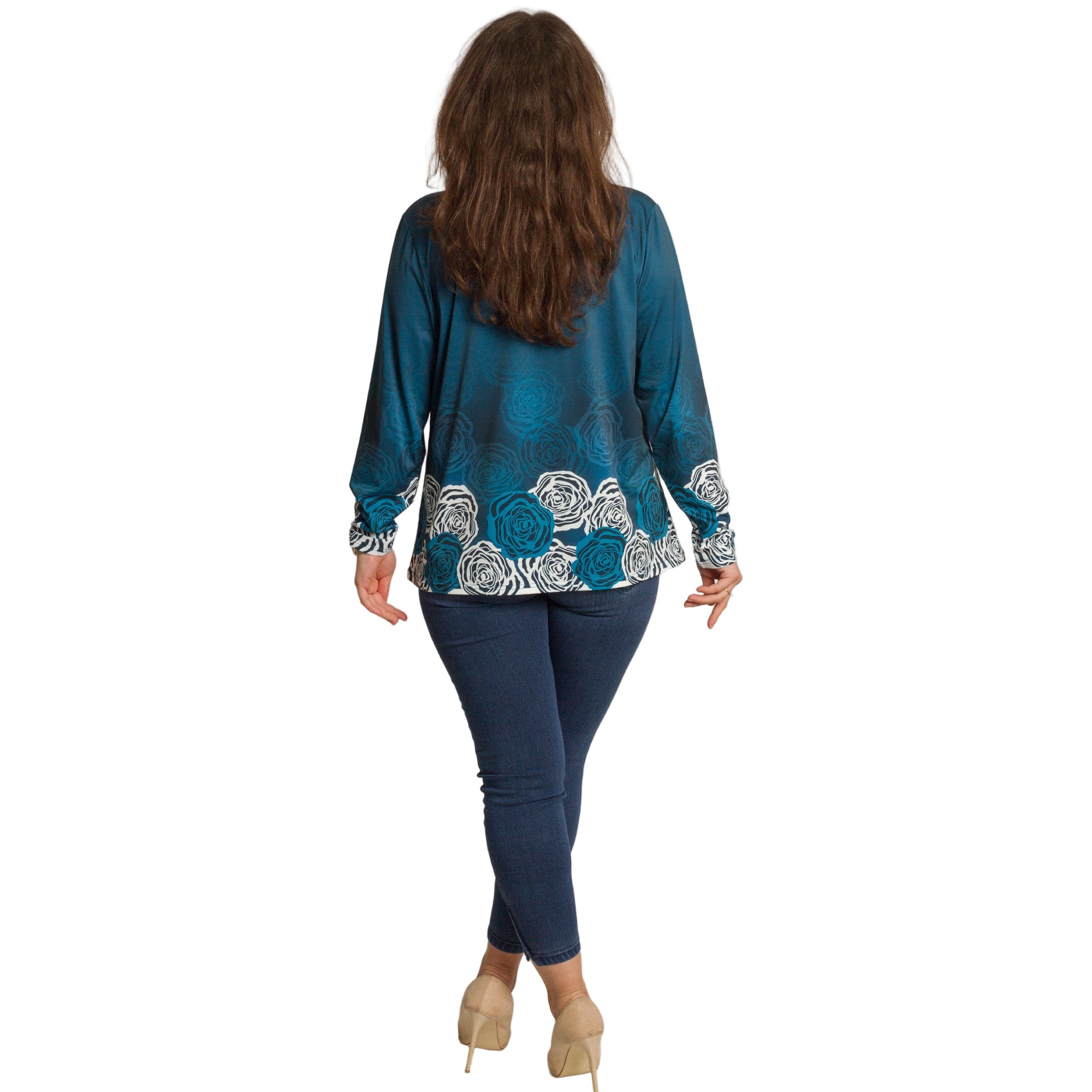 Елегантна дамска блуза в наситен синьо-зелен цвят, изработена от мека и еластична материя. Моделът впечатлява с изчистен силует, дълъг ръкав и фина декоративна метална пластина на деколтето. В долната част и по ръкавите е украсена с красив флорален принт в бяло и тюркоазено, който придава стилен контраст и модерна визия. Подходяща е както за ежедневието, така и за по-официални поводи.