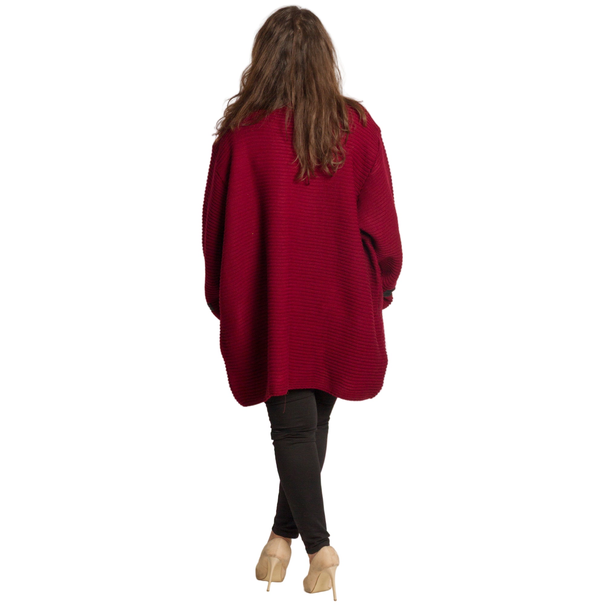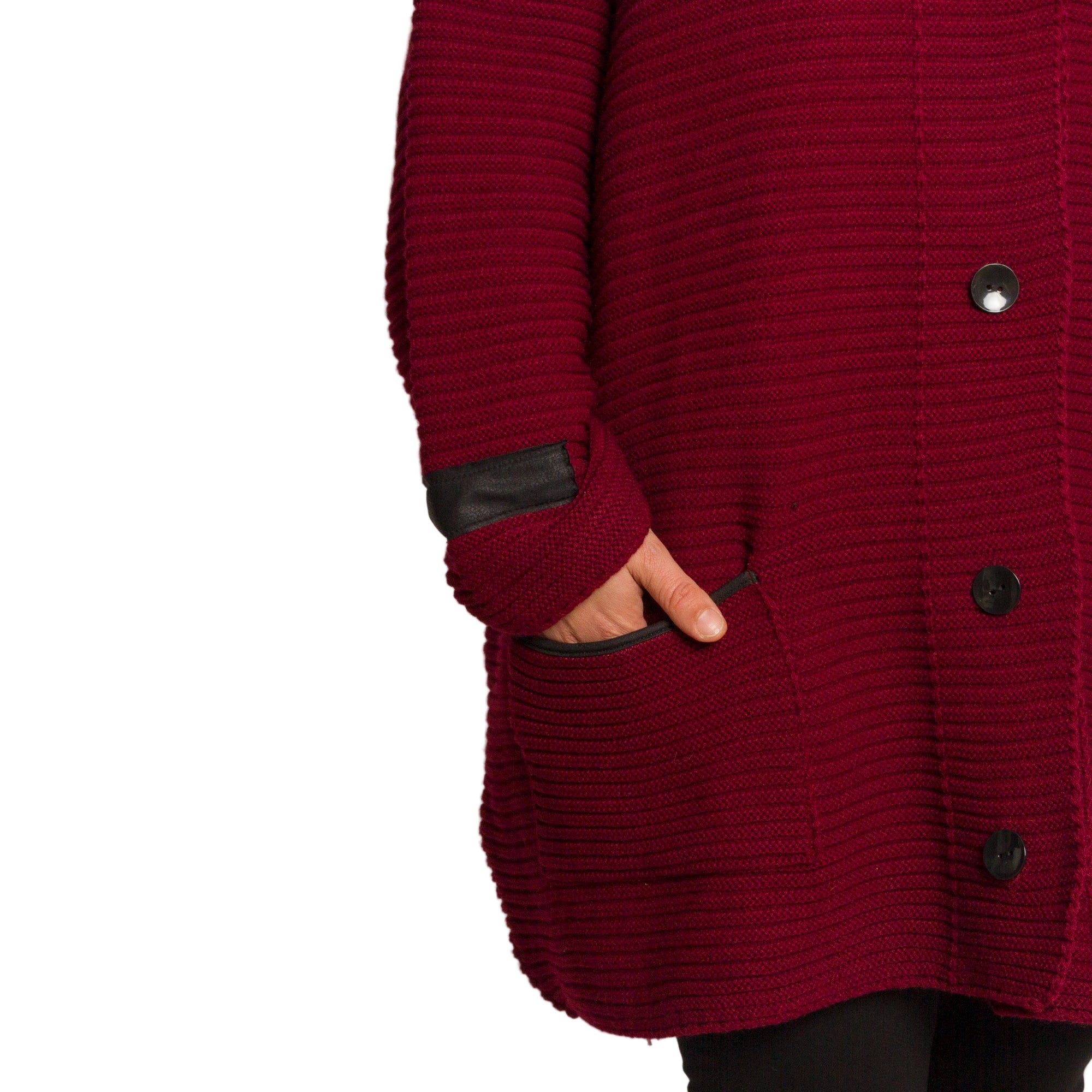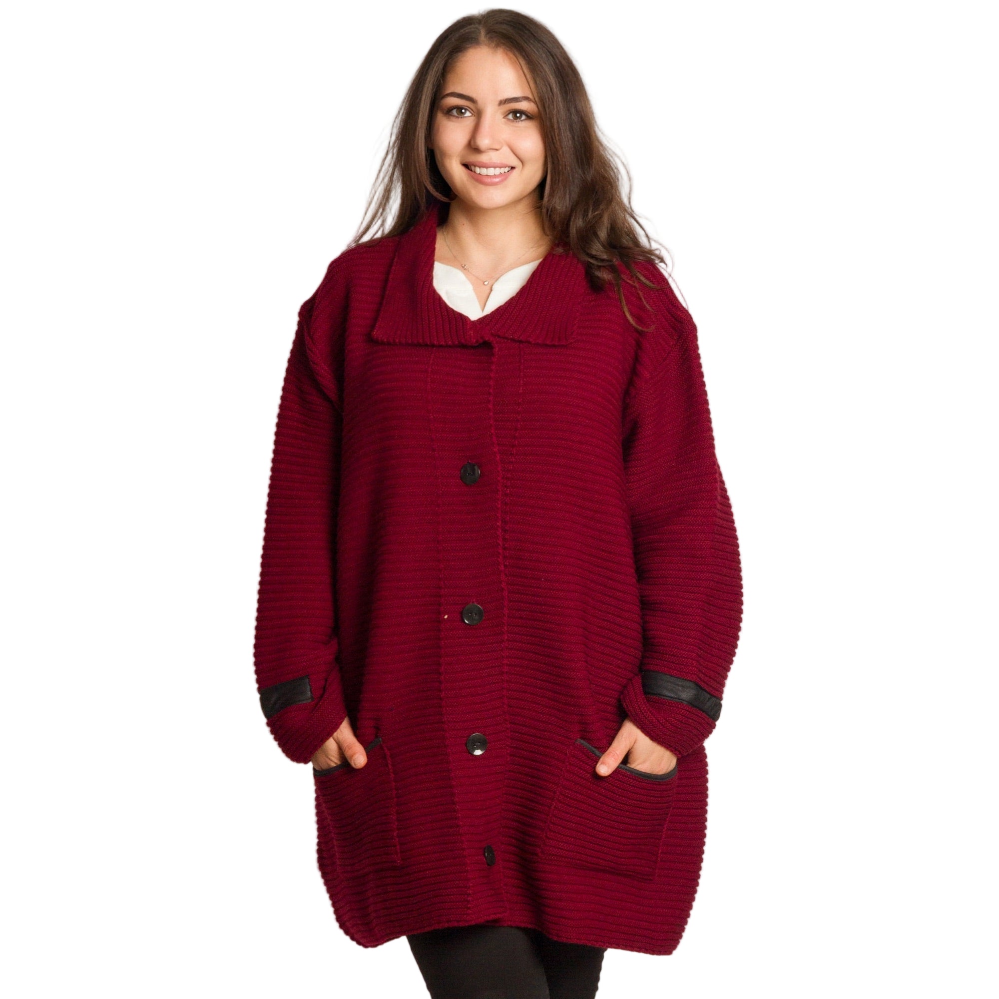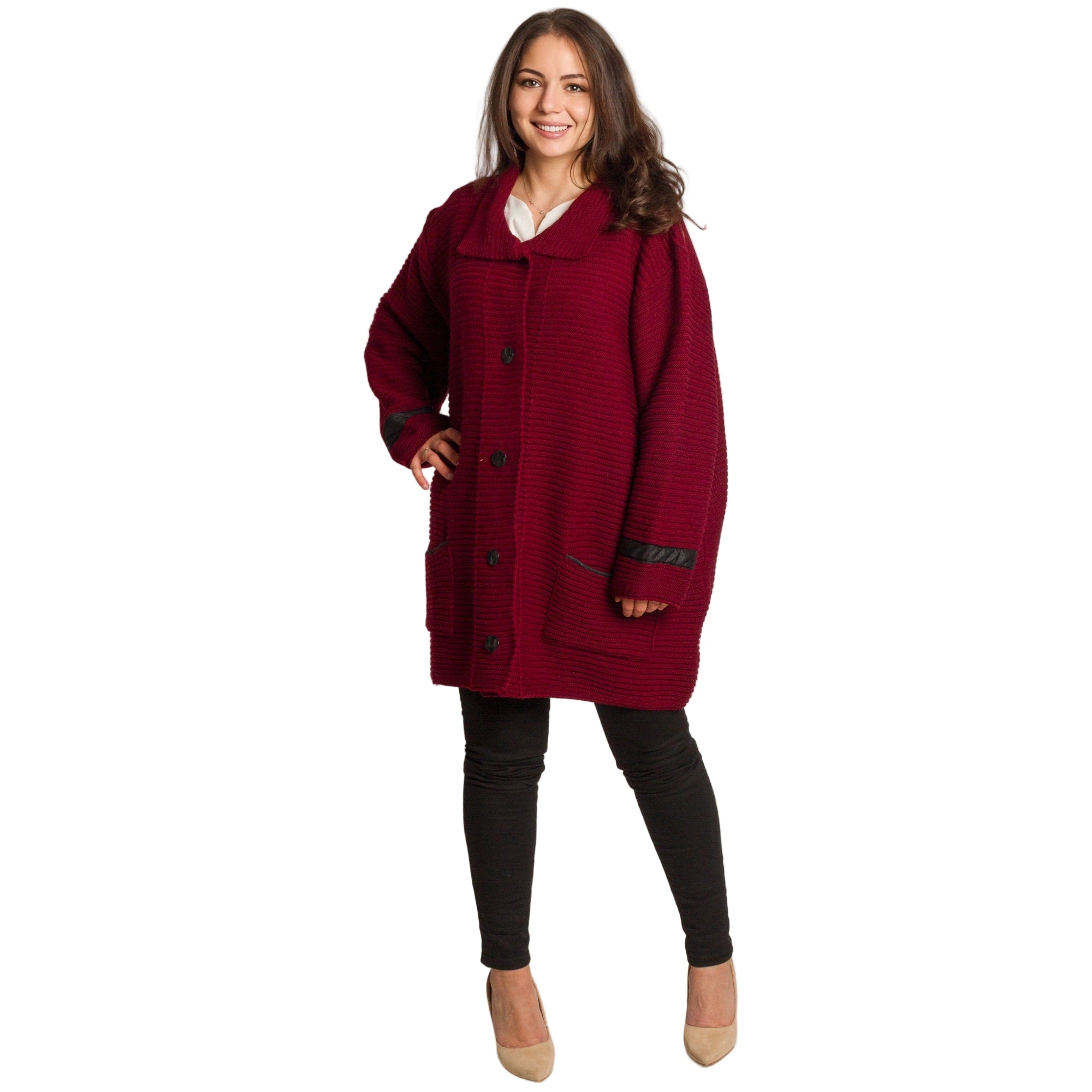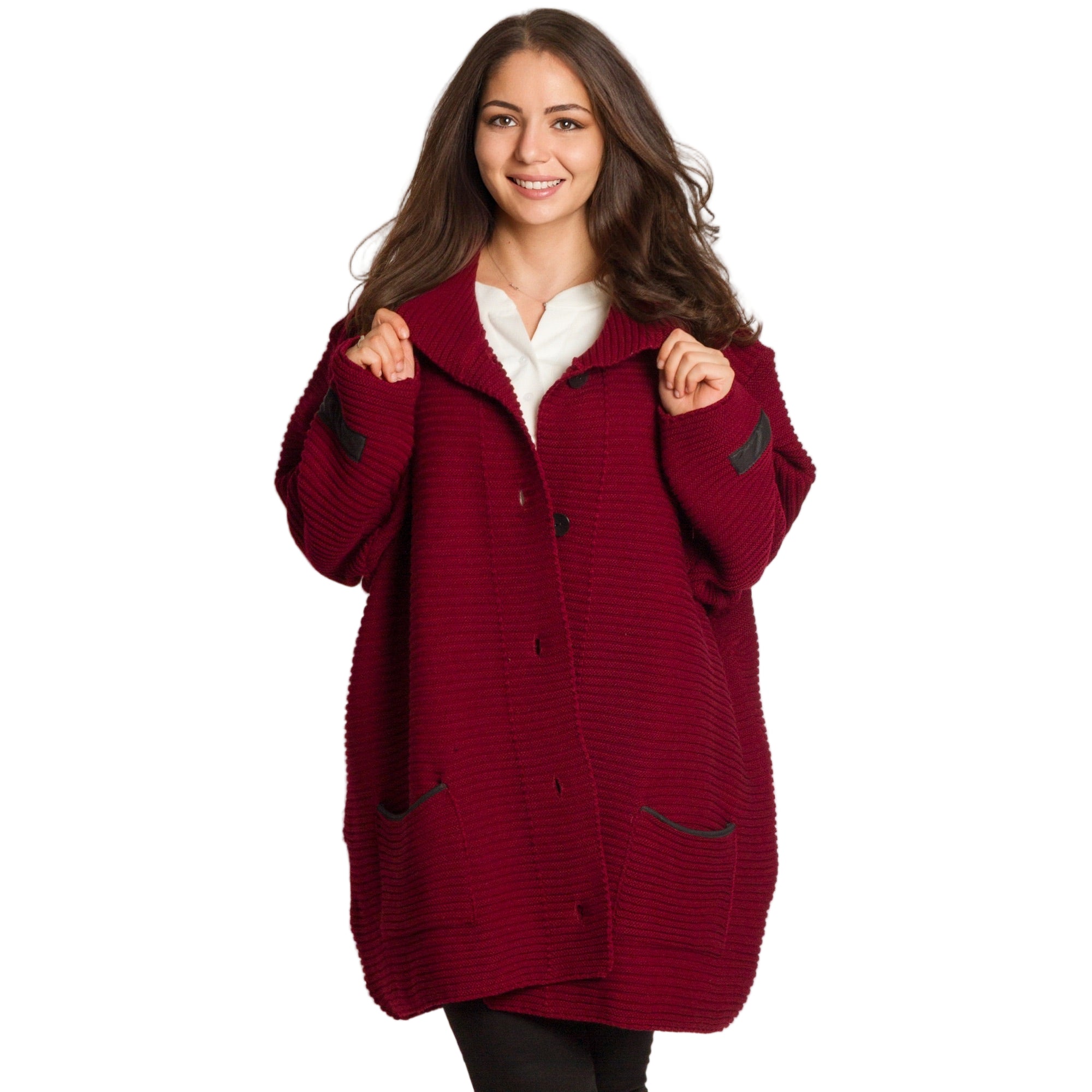 Топла и стилна жилетка в наситен бордо цвят, изработена от висококачествен акрил с плетена структура. Моделът е с права, удобна кройка и дължина под ханша, която осигурява комфорт и свобода на движение. Разполага с две функционални предни джобчета, декоративни кожени елементи и големи копчета за закопчаване. Подходяща е както за ежедневието, така и за по-елегантна визия през есенно-зимния сезон.