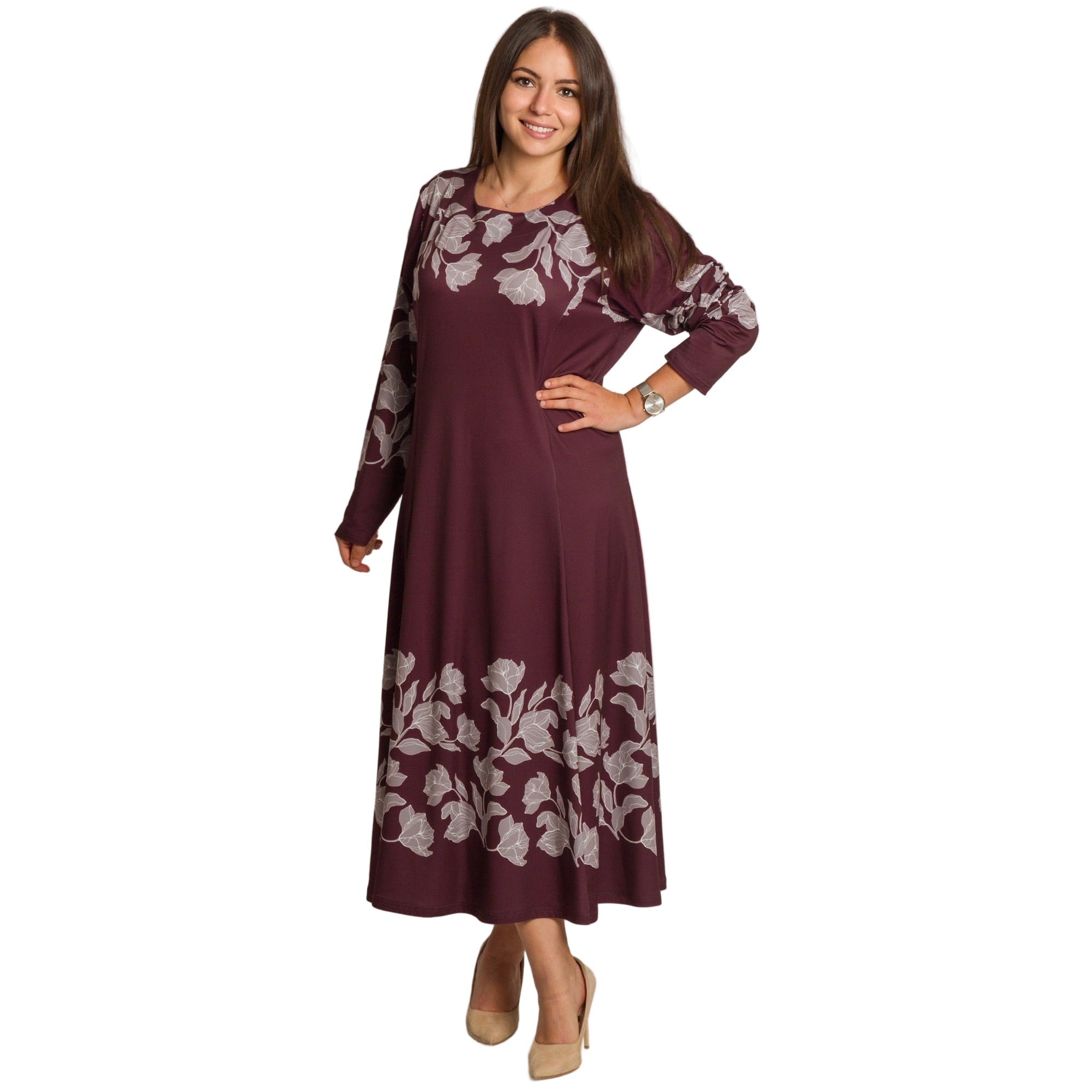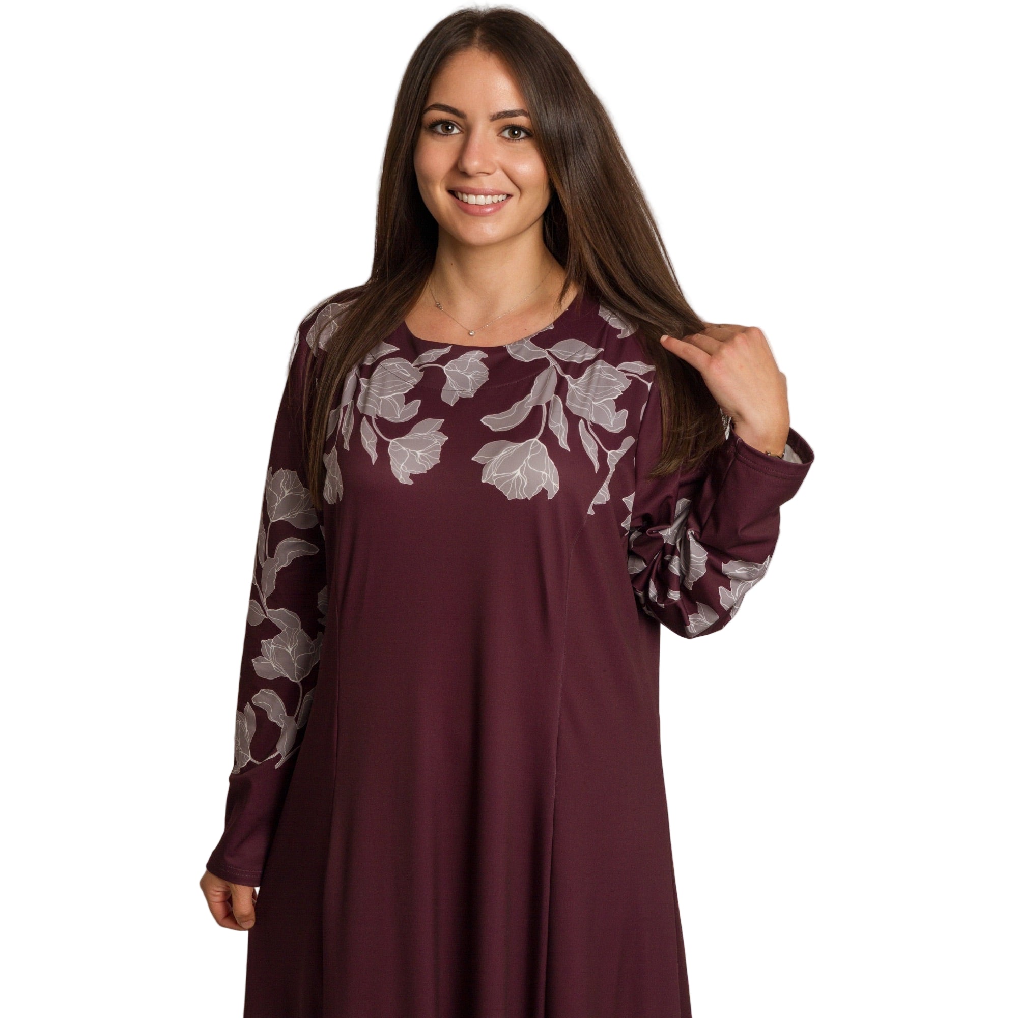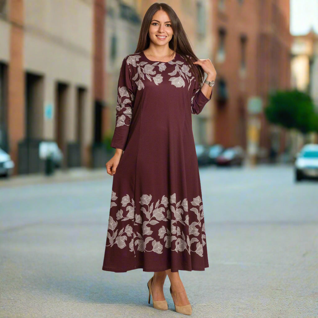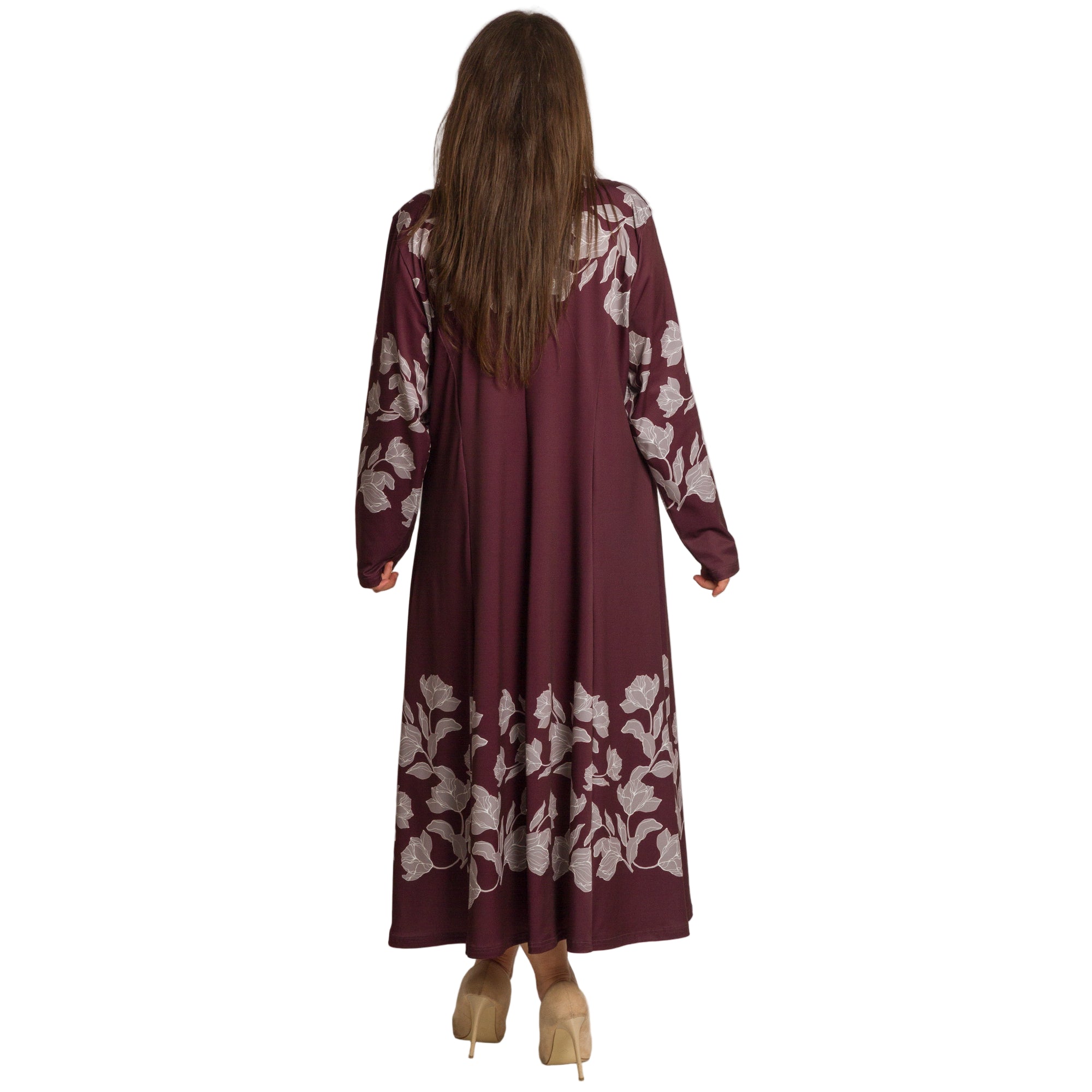 Бордо разкроена рокля с флорален бордюр в големи размери