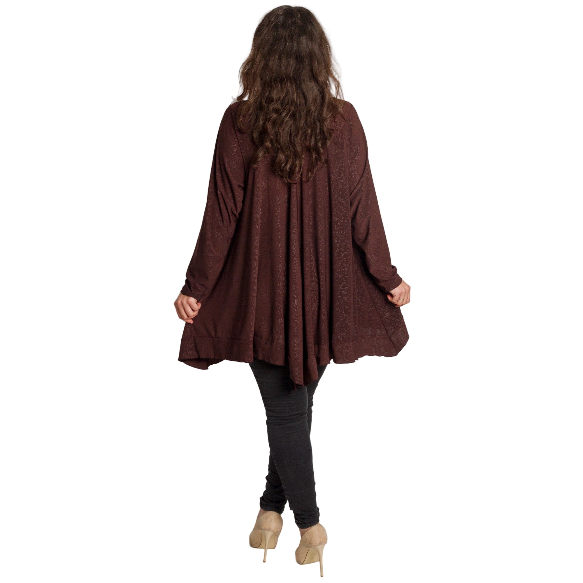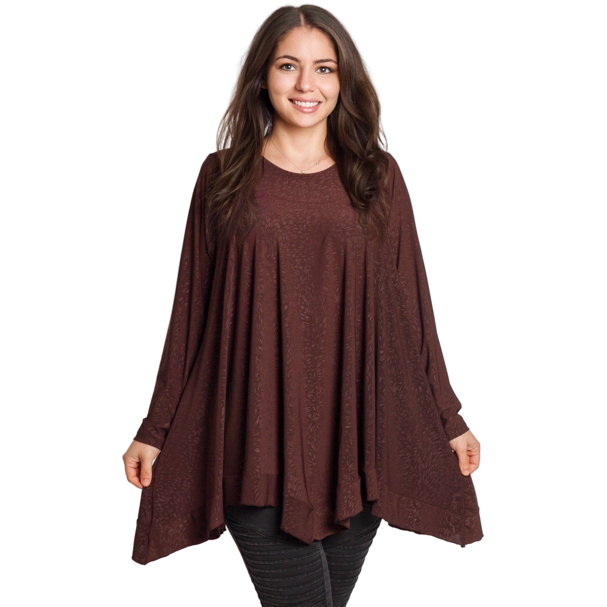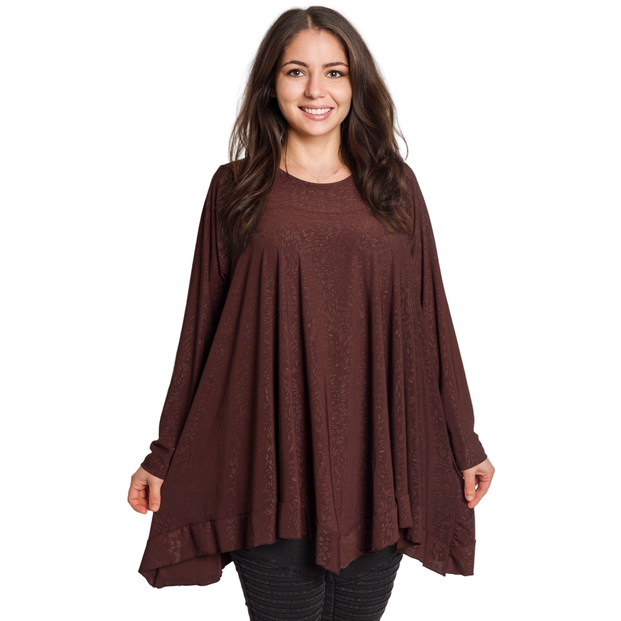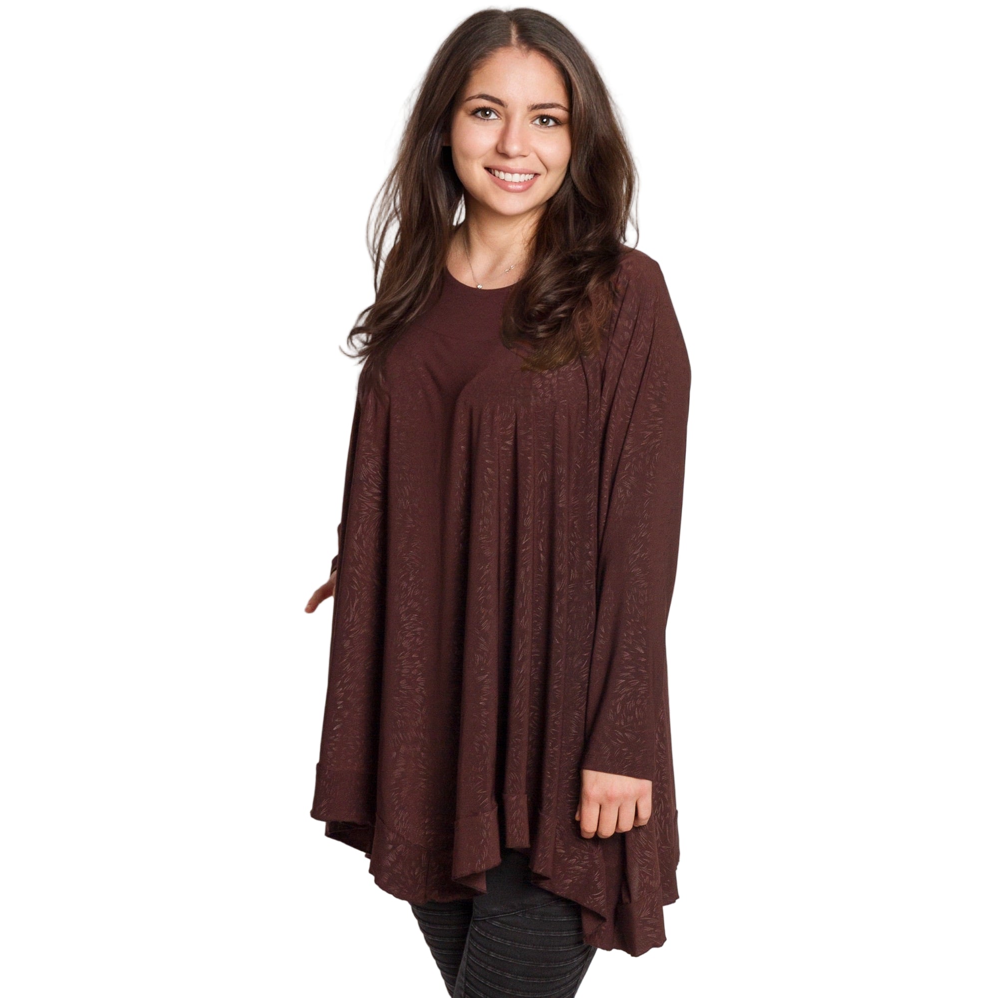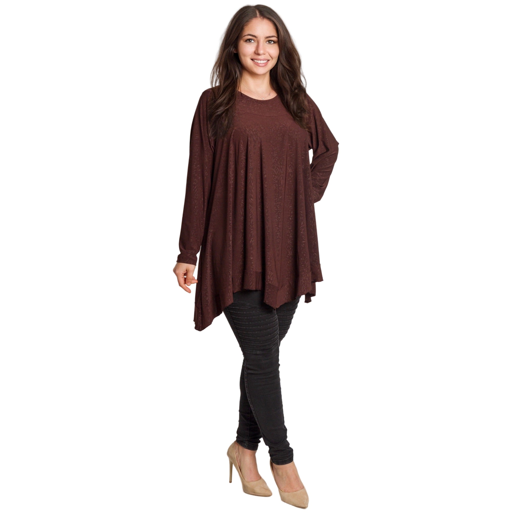 Тази туника в наситен бордо цвят е перфектният избор за жени, които искат едновременно комфорт и стил. Материята е 100% вискоза – мека, дишаща и подходяща за по-чувствителна кожа. Финият релефен десен придава изискан и луксозен вид, а разкроената кройка красиво пада по тялото и прикрива всяка несъвършенство. Моделът е идеален за официални поводи и специални моменти, като същевременно осигурява лекота и свобода на движение. Подходяща за есенно-зимния сезон.