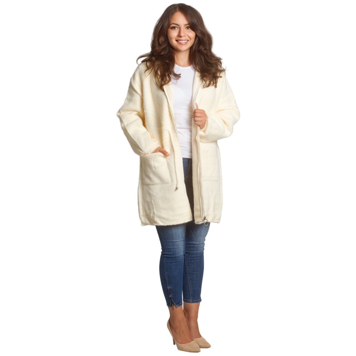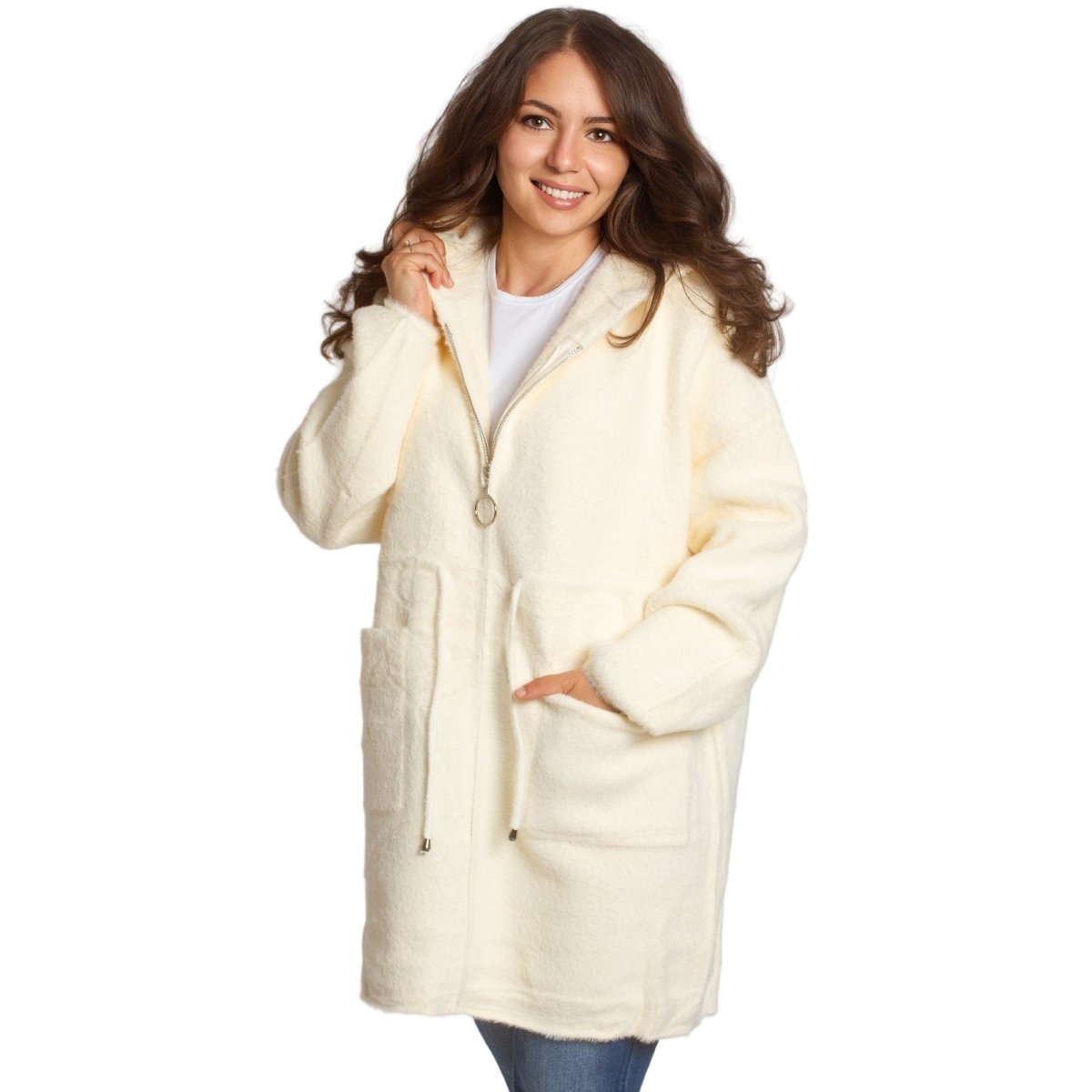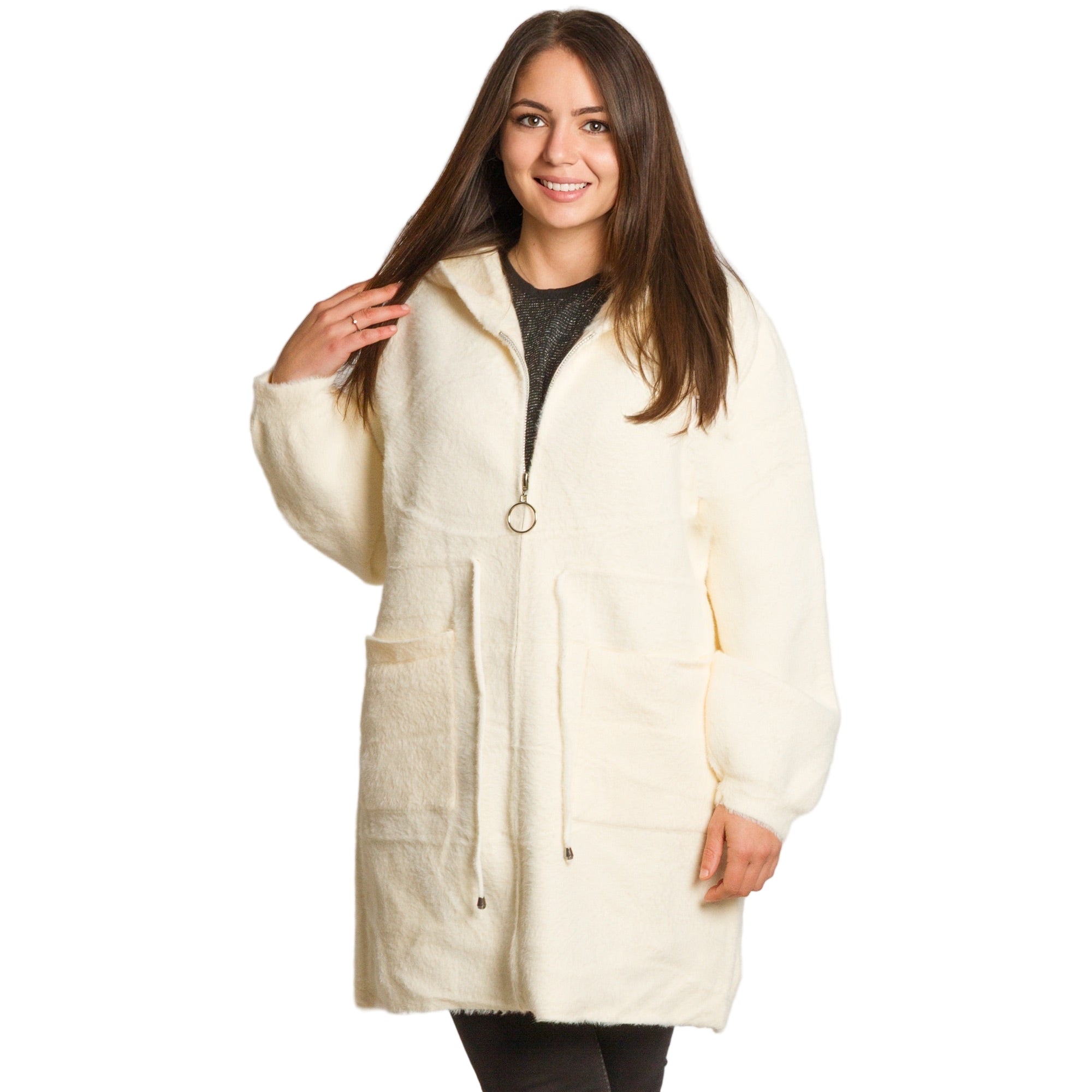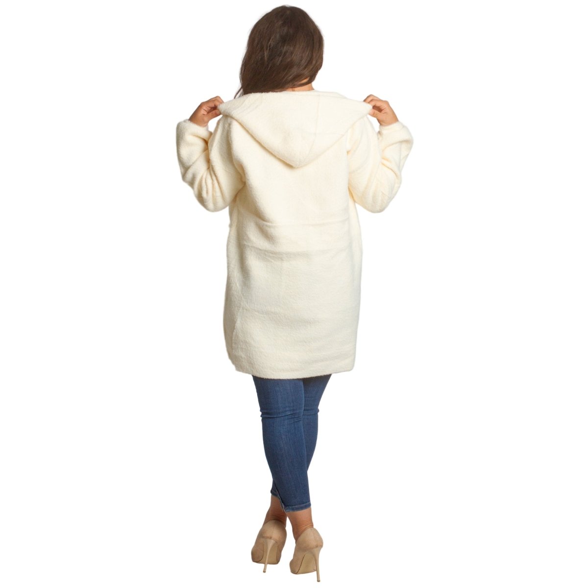 Топло и удобно дълго яке в големи размери, изработено от мека и пухкава материя, която осигурява комфорт през студените дни. Моделът е в универсален бял цвят и права кройка която позволява лекота и свобода на движенията. Якето е с практичен цип отпред, качулка и два големи предни джоба, които съчетават стил и функционалност. Може да се носи както в ежедневието, така и в по-непринудени официални поводи през есенно-зимния сезон.