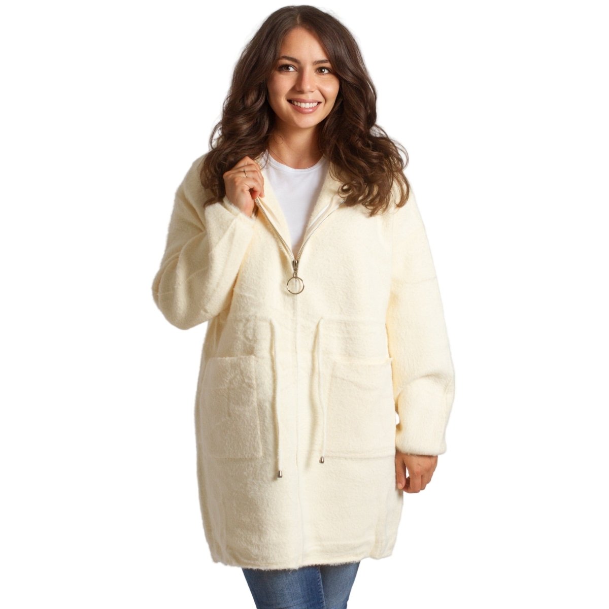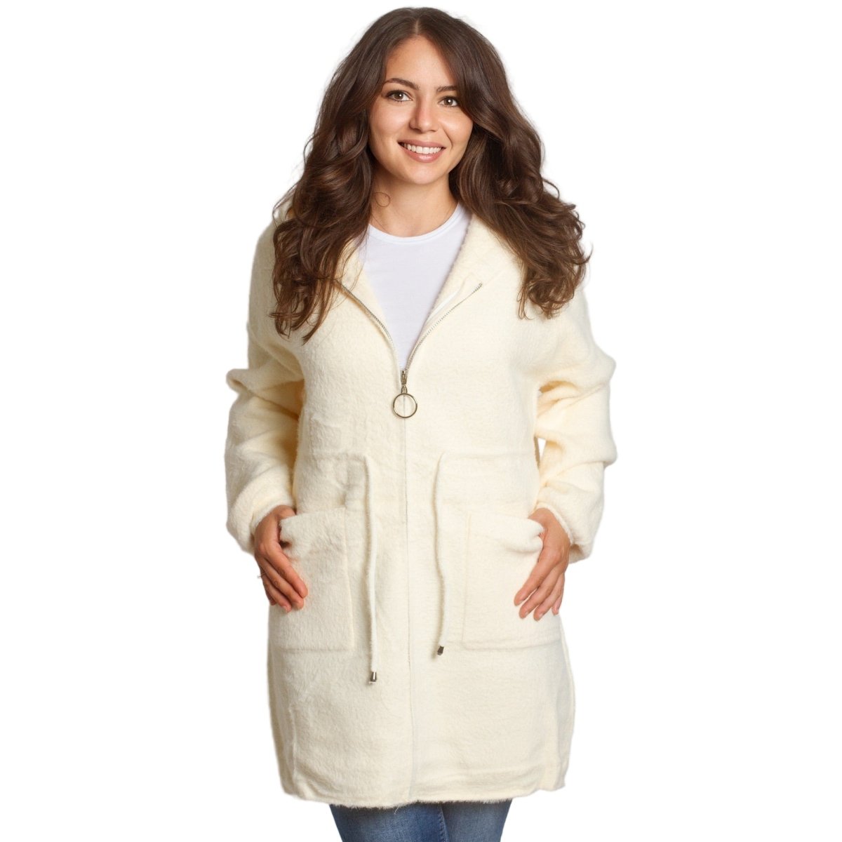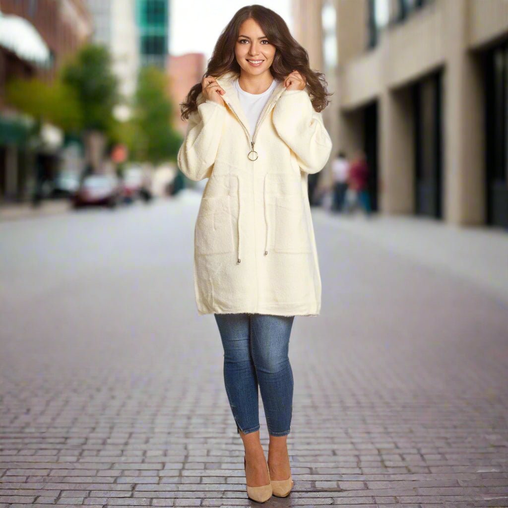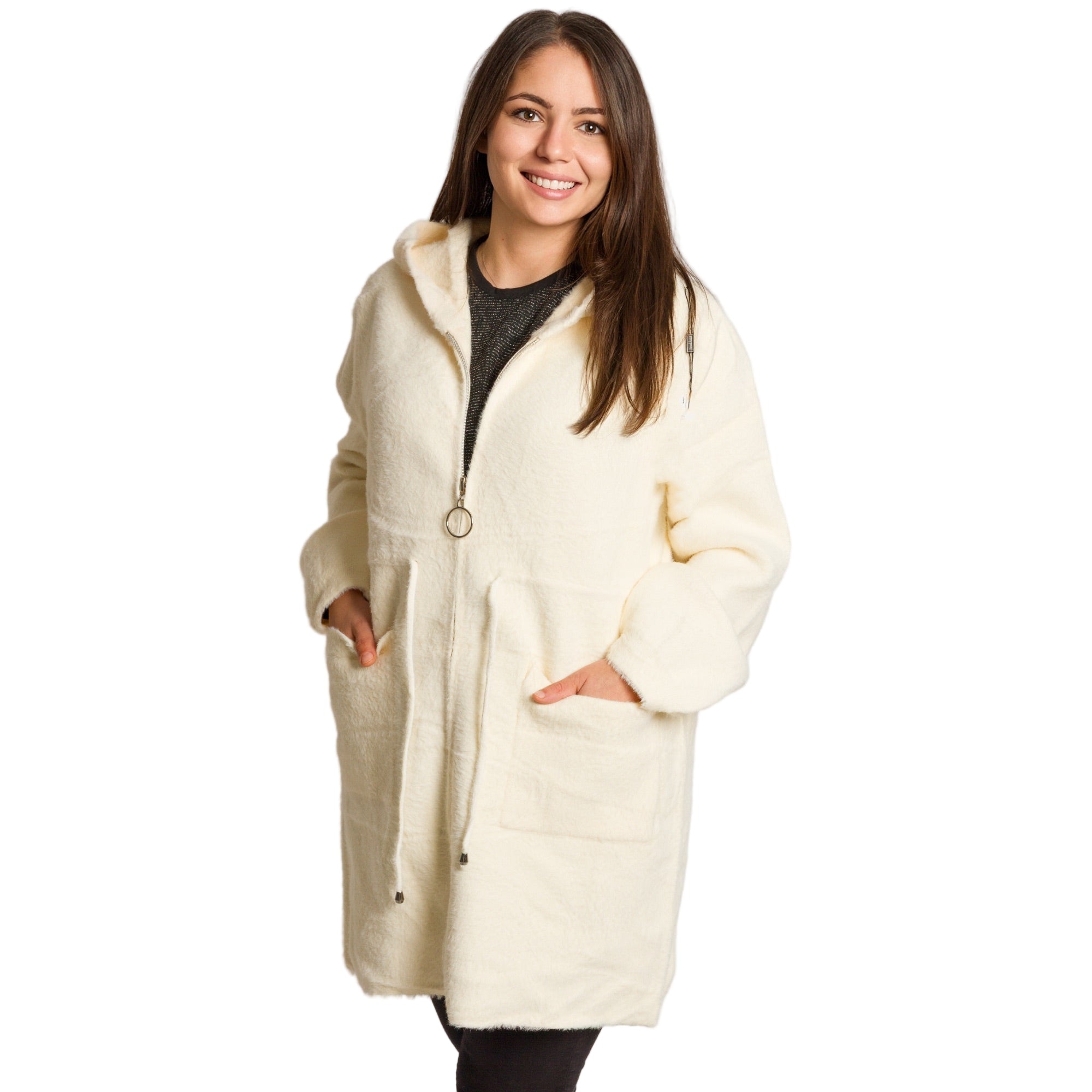 Топло и удобно дълго яке в големи размери, изработено от мека и пухкава материя, която осигурява комфорт през студените дни. Моделът е в универсален бял цвят и права кройка която позволява лекота и свобода на движенията. Якето е с практичен цип отпред, качулка и два големи предни джоба, които съчетават стил и функционалност. Може да се носи както в ежедневието, така и в по-непринудени официални поводи през есенно-зимния сезон.