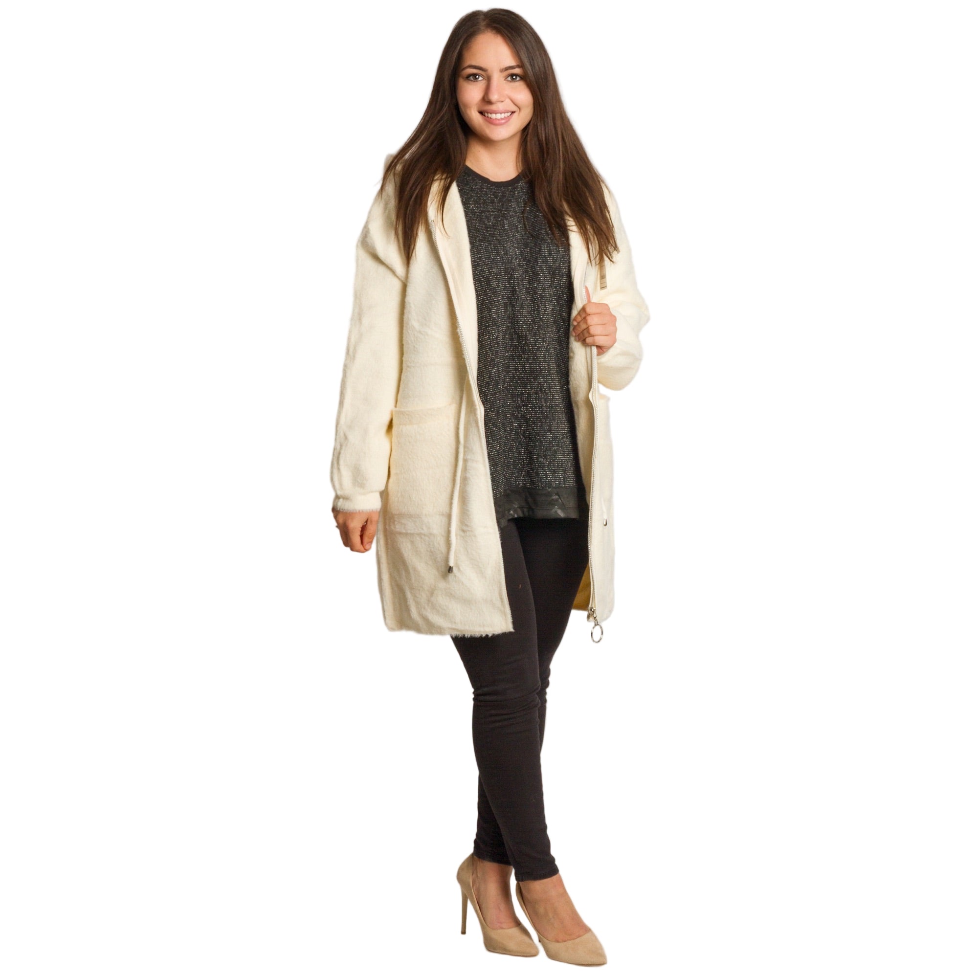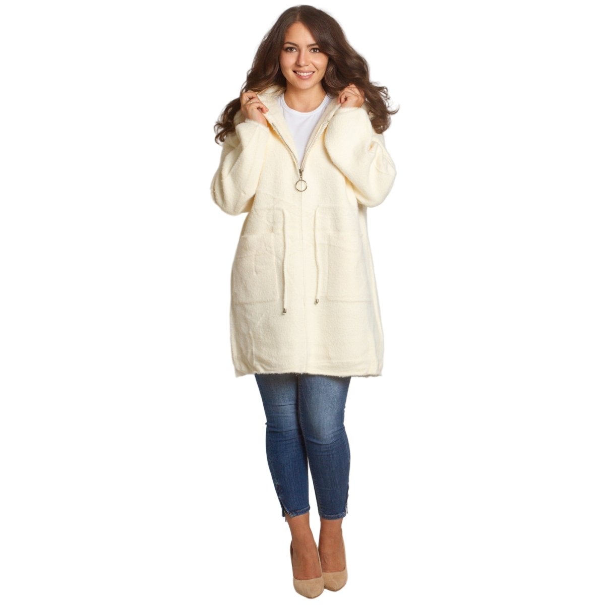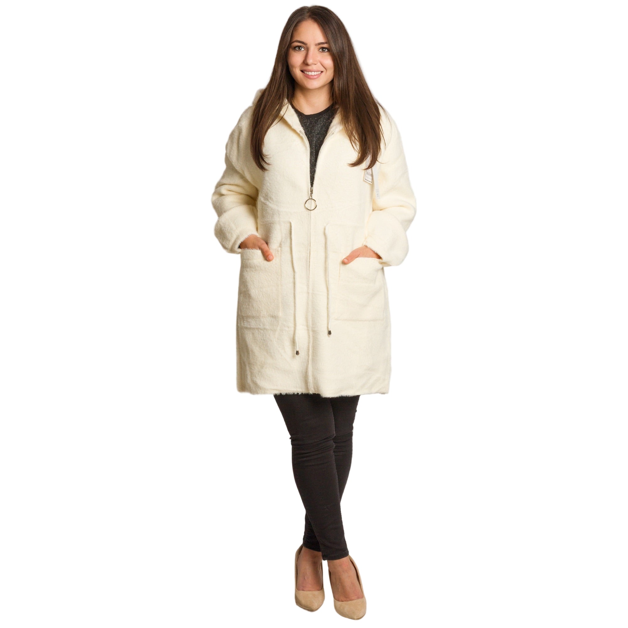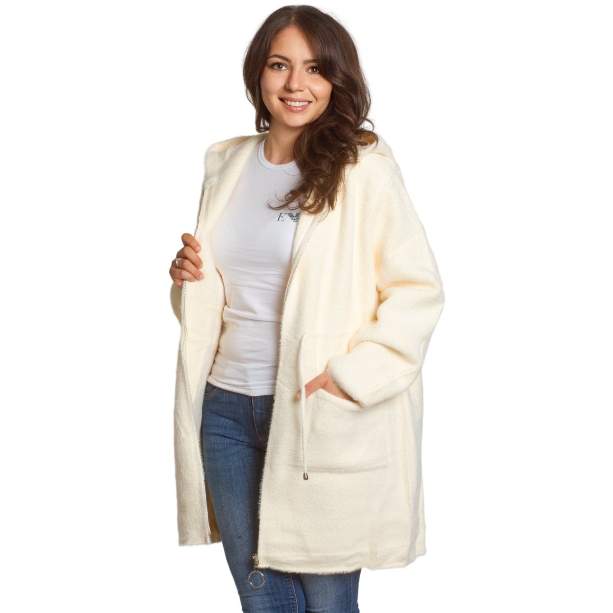 Топло и удобно дълго яке в големи размери, изработено от мека и пухкава материя, която осигурява комфорт през студените дни. Моделът е в универсален бял цвят и права кройка която позволява лекота и свобода на движенията. Якето е с практичен цип отпред, качулка и два големи предни джоба, които съчетават стил и функционалност. Може да се носи както в ежедневието, така и в по-непринудени официални поводи през есенно-зимния сезон.