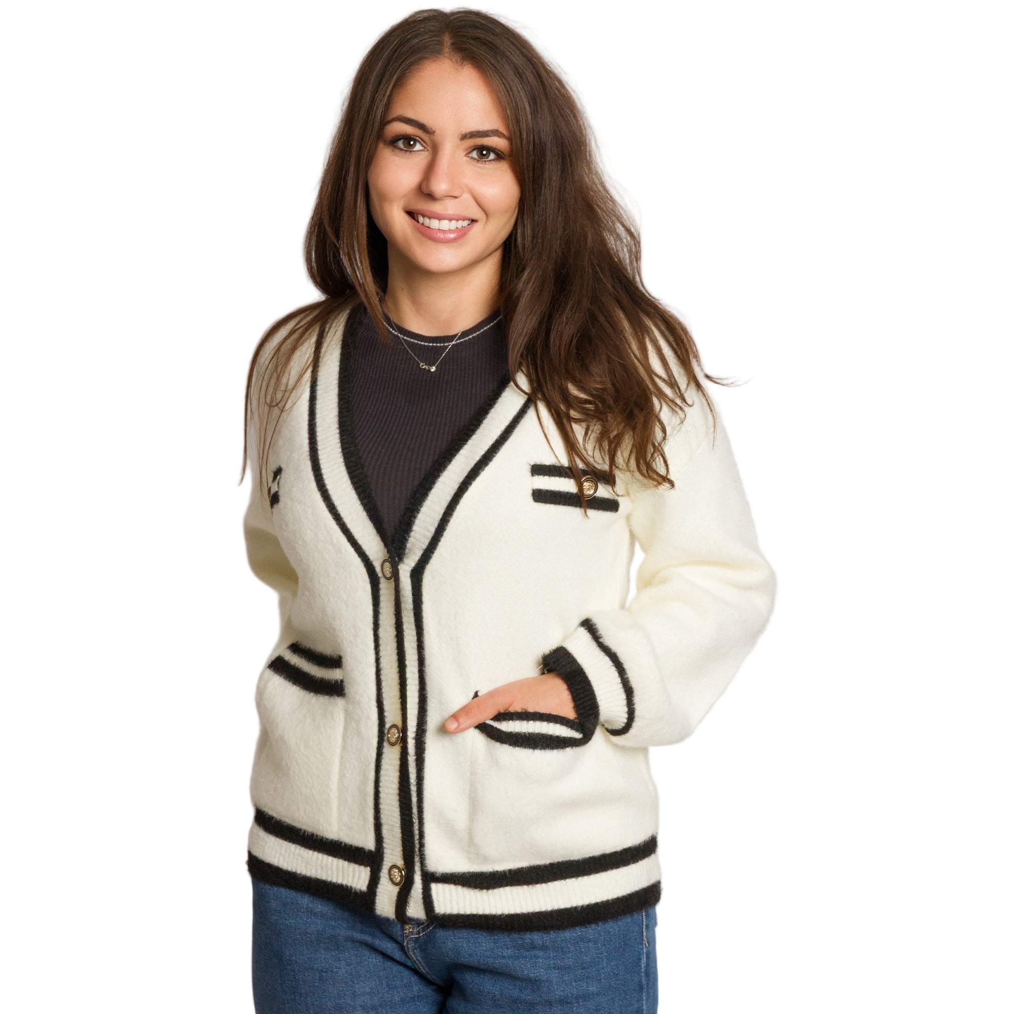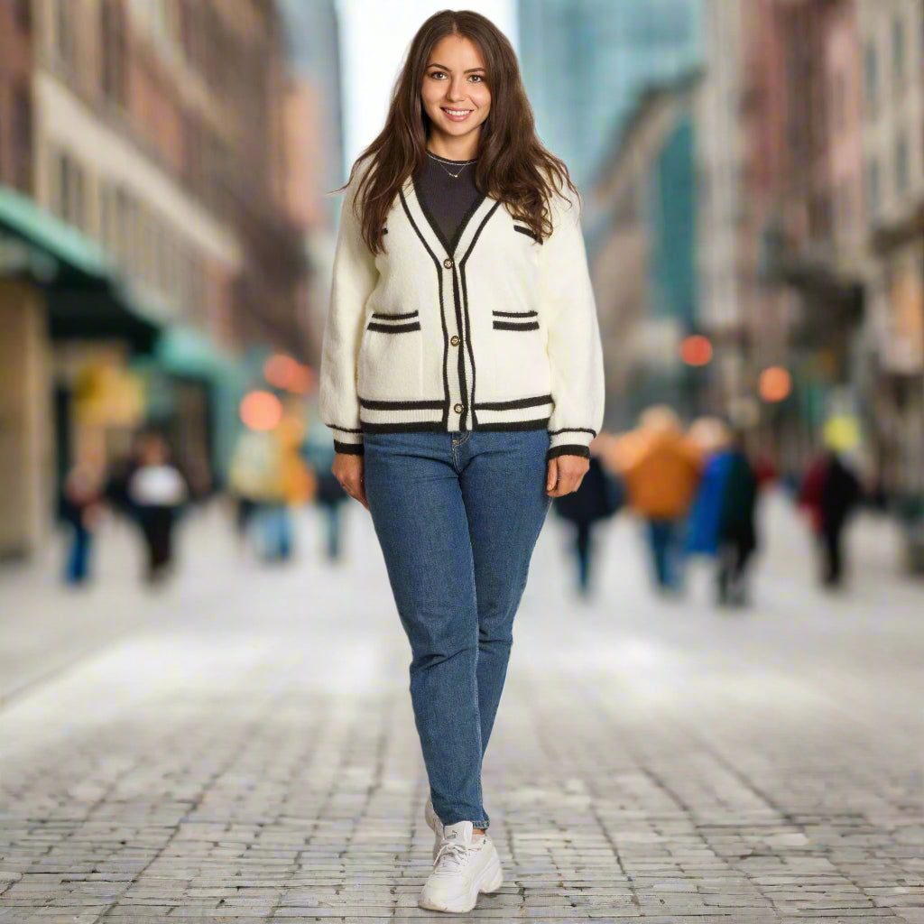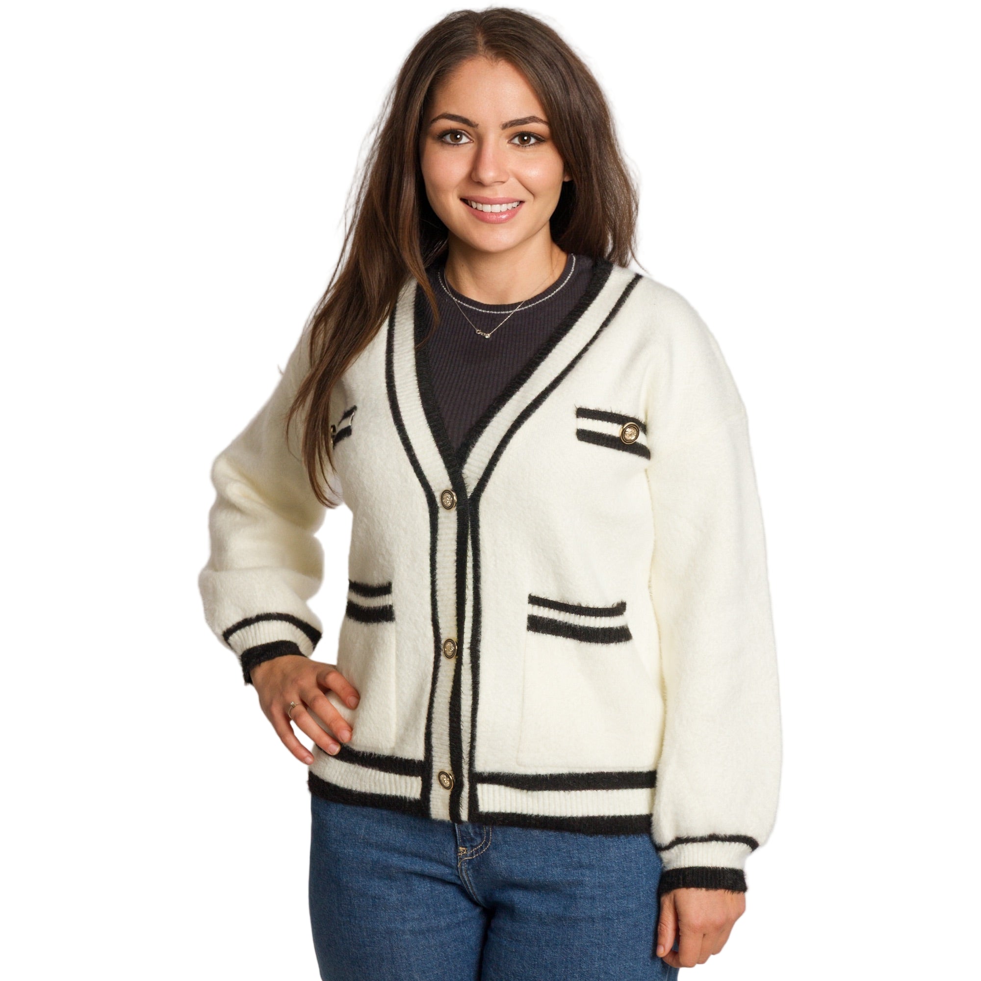 Освежете визията си с тази стилна бяла жилетка с контрастни черни кантове. Моделът е с права кройка и удобни предни джобове, които съчетават практичност и елегантност. Декоративните копчета придават изискан завършек, а меката материя с високо съдържание на вискоза гарантира комфорт през целия ден. Перфектен избор както за ежедневието, така и за по-официални поводи през есенно-зимния сезон.