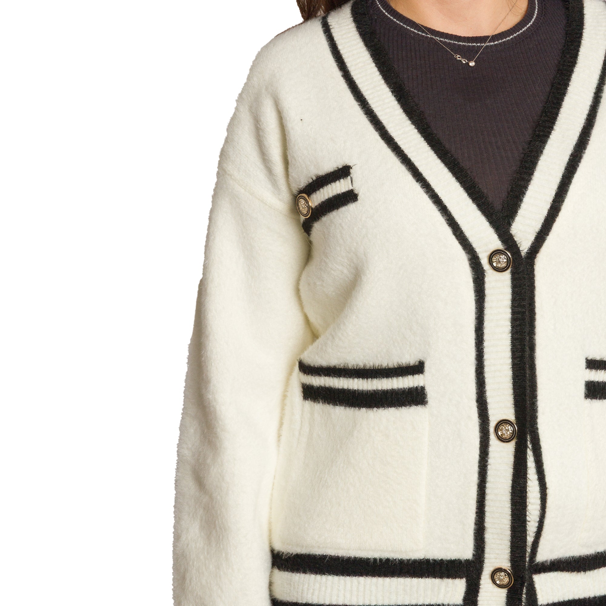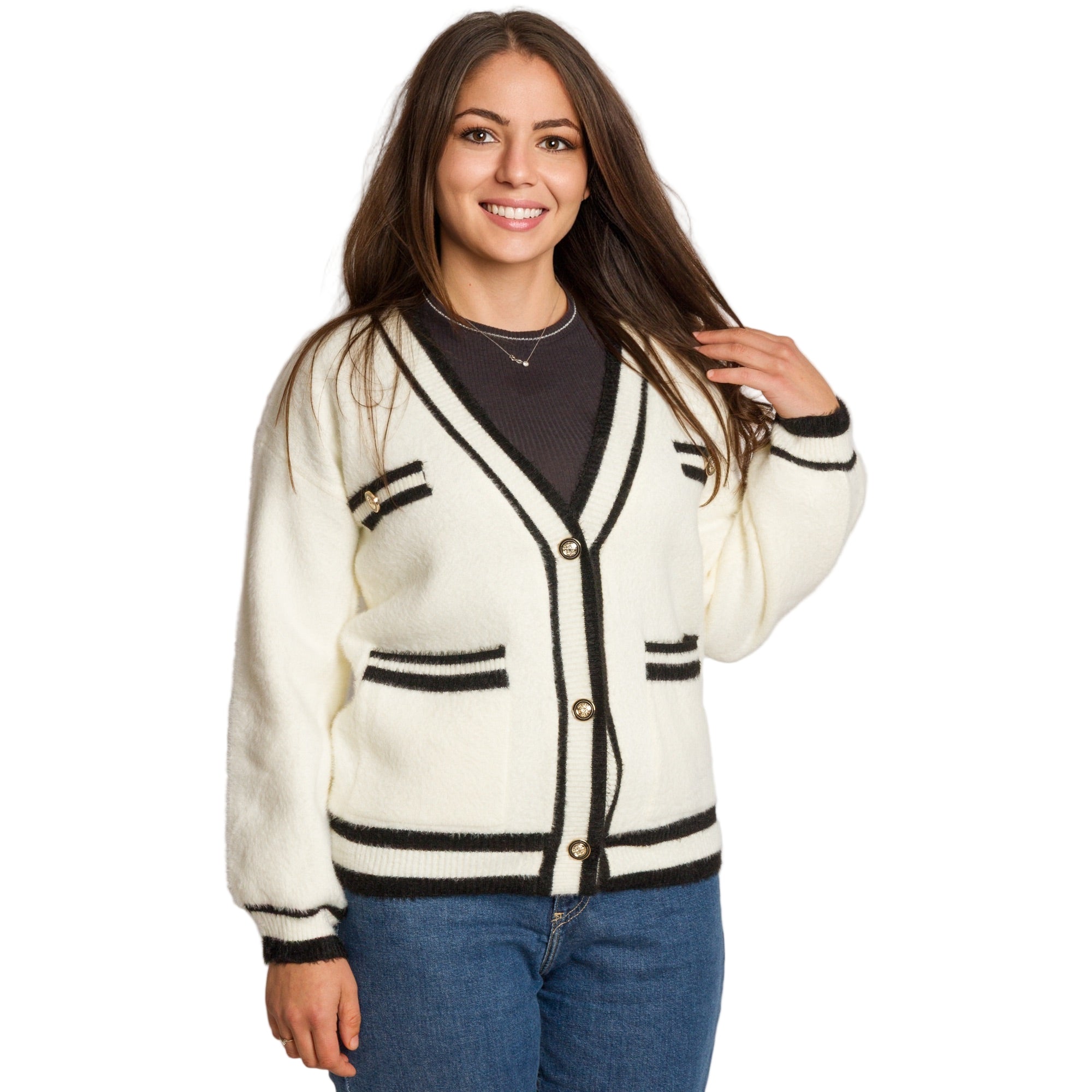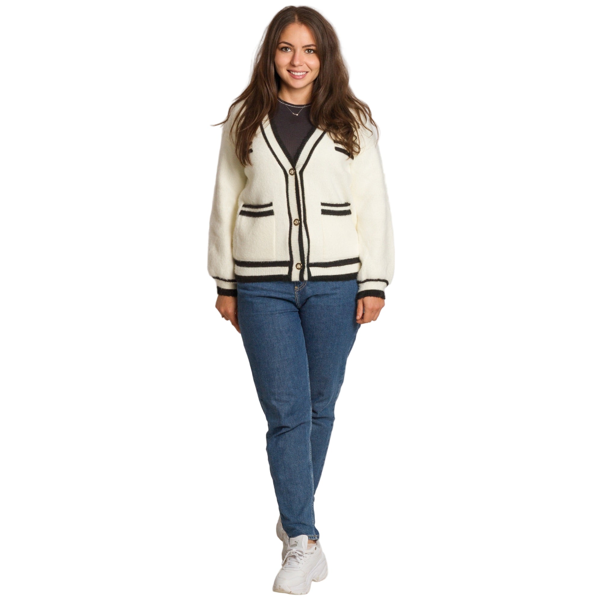 Освежете визията си с тази стилна бяла жилетка с контрастни черни кантове. Моделът е с права кройка и удобни предни джобове, които съчетават практичност и елегантност. Декоративните копчета придават изискан завършек, а меката материя с високо съдържание на вискоза гарантира комфорт през целия ден. Перфектен избор както за ежедневието, така и за по-официални поводи през есенно-зимния сезон.