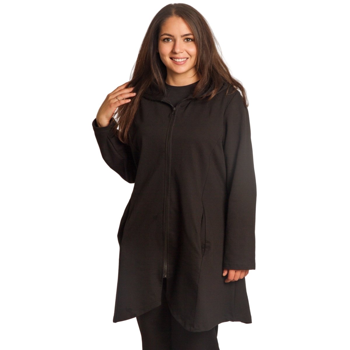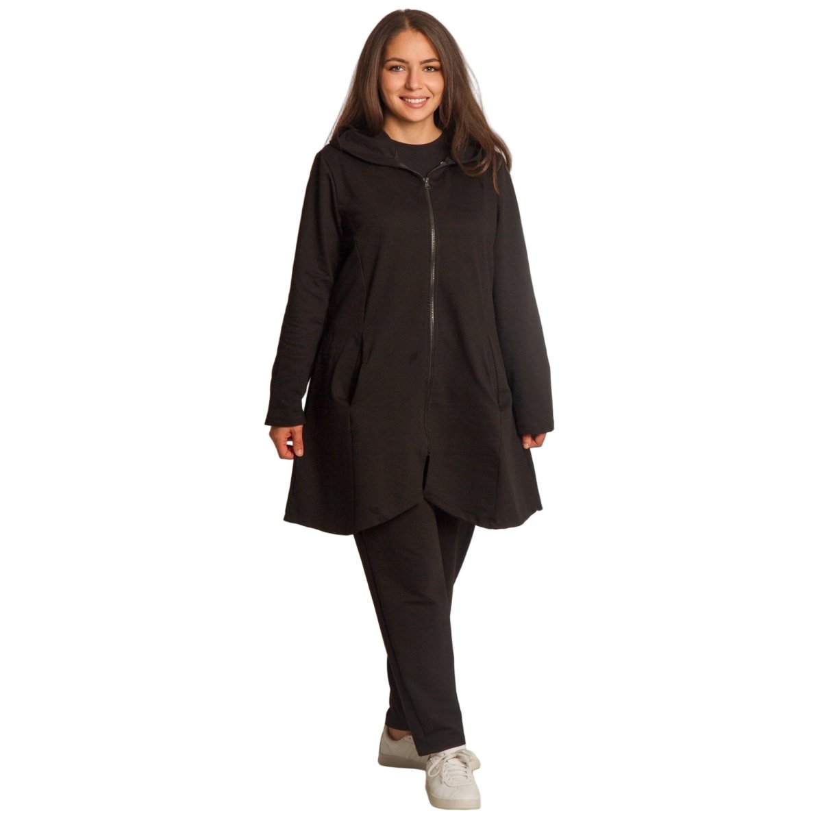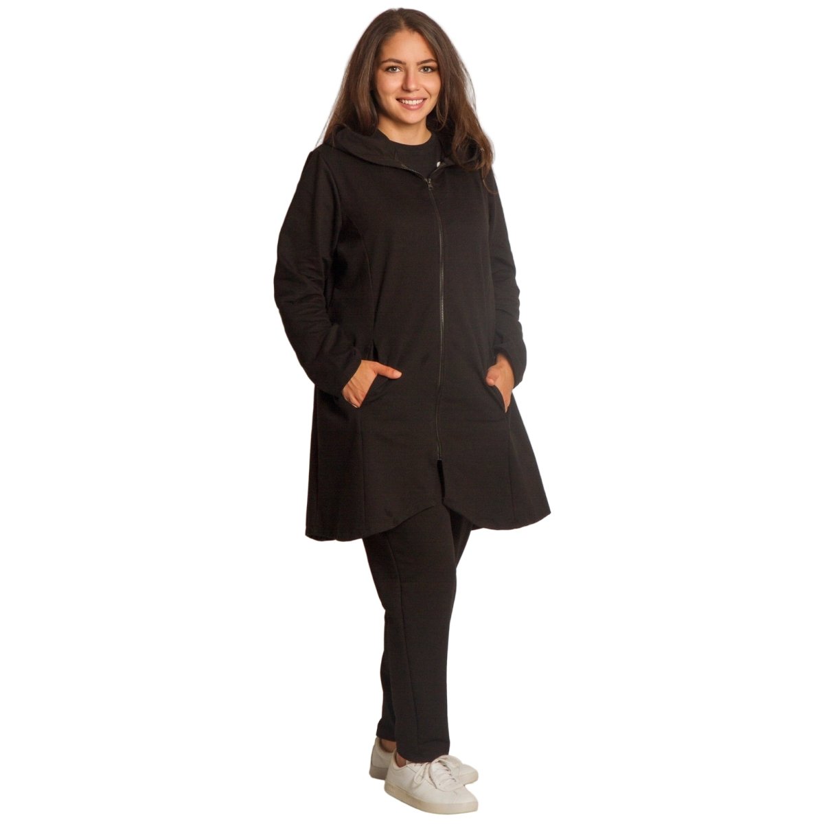 Стилен и удобен суитшърт в големи размери, изработен от мек и еластичен памук с добавен еластан за комфорт през целия ден. Моделът е с практична качулка, дълъг цип отпред и разкроена кройка, която осигурява свобода на движението и прикрива нежеланите зони. Класическият черен цвят го прави универсален избор както за ежедневието, така и за по-официални поводи. Подходящ за есенно-зимния сезон.
