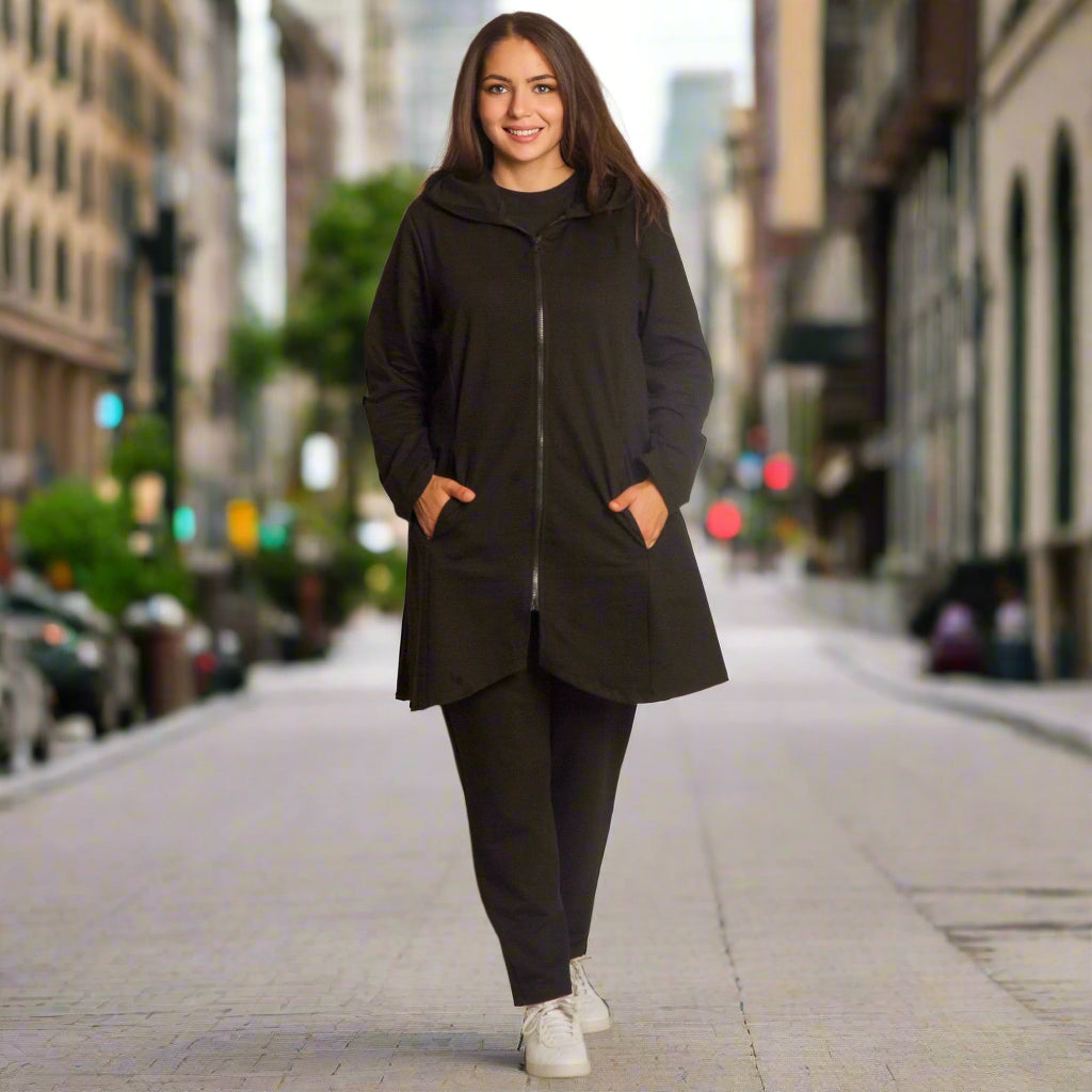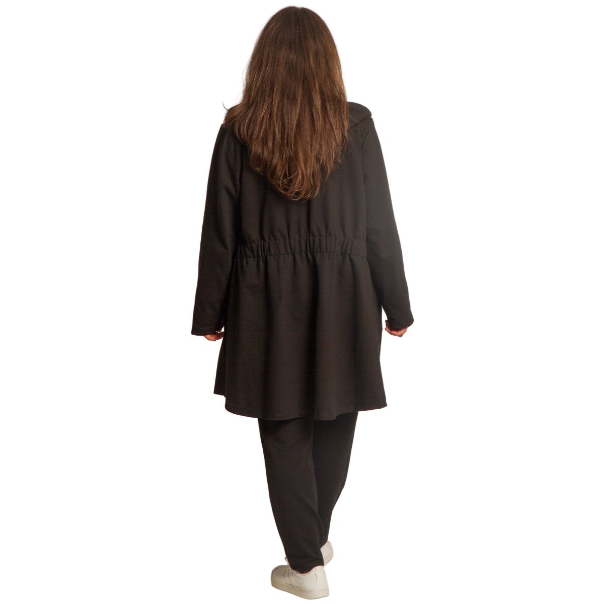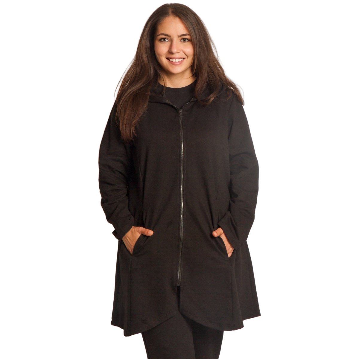 Стилен и удобен суитшърт в големи размери, изработен от мек и еластичен памук с добавен еластан за комфорт през целия ден. Моделът е с практична качулка, дълъг цип отпред и разкроена кройка, която осигурява свобода на движението и прикрива нежеланите зони. Класическият черен цвят го прави универсален избор както за ежедневието, така и за по-официални поводи. Подходящ за есенно-зимния сезон.