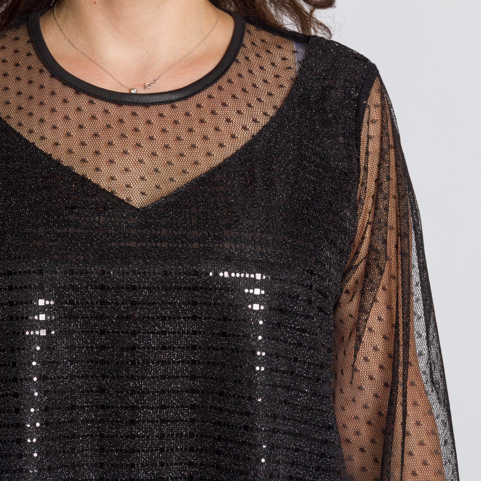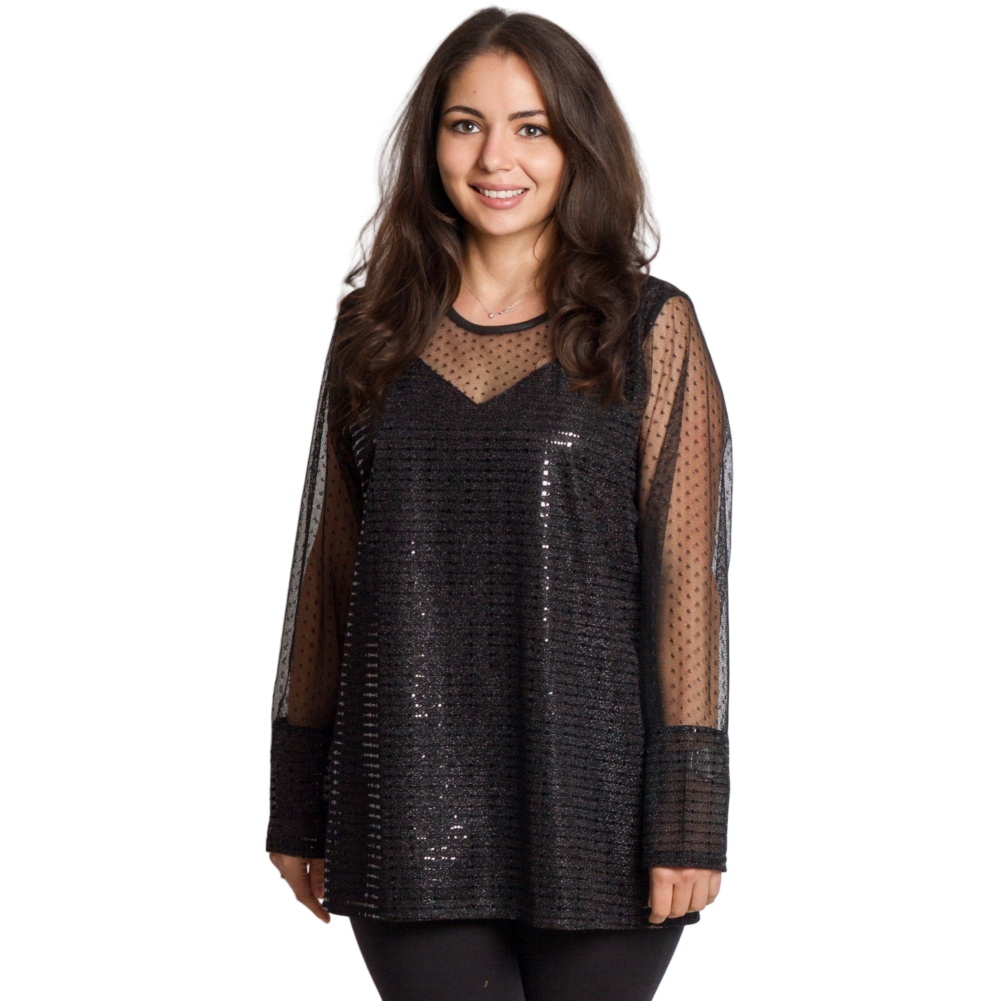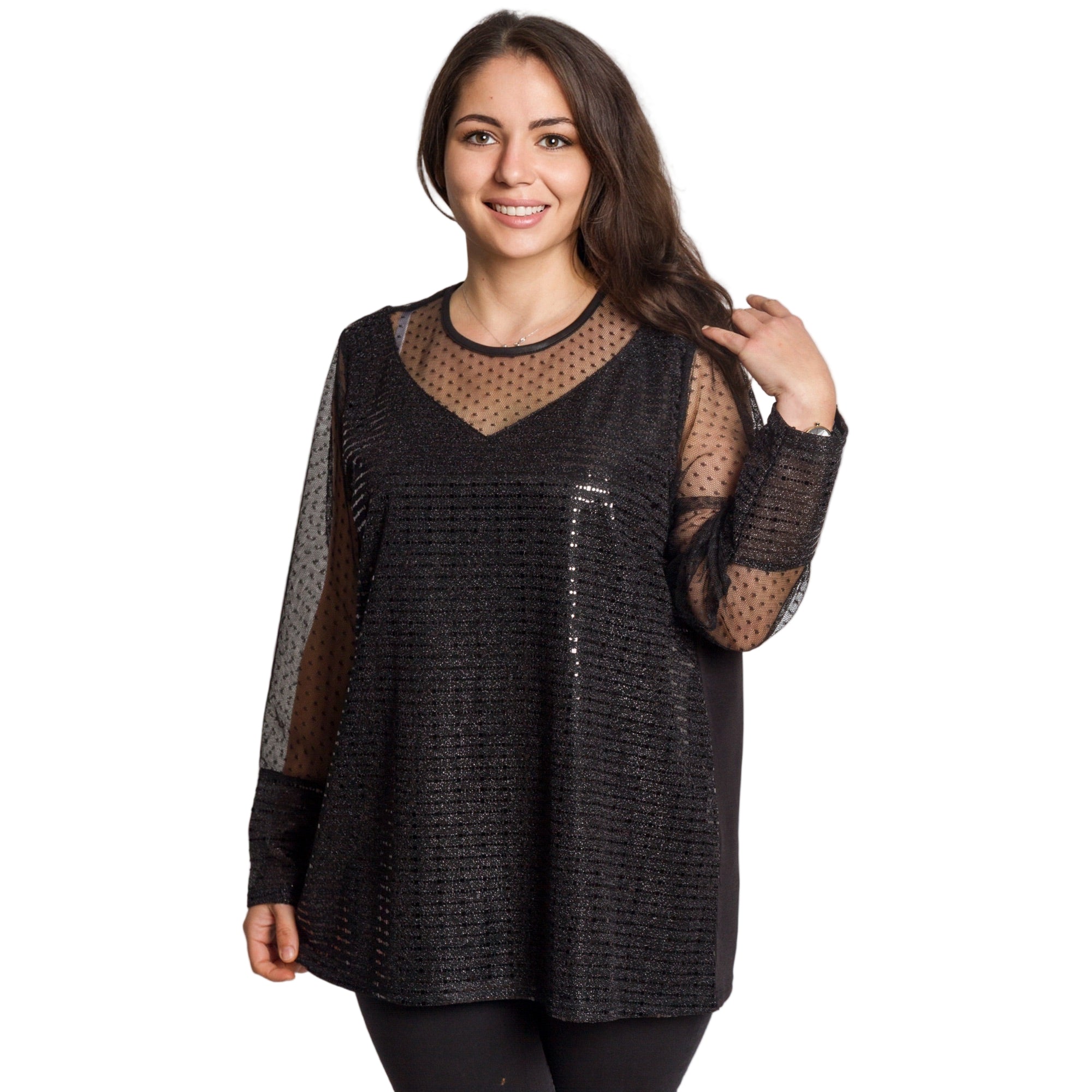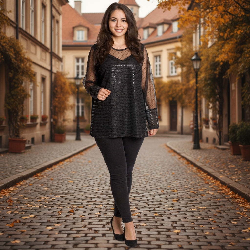 Елегантна черна туника с фин блестящ ефект, създадена за специални вечери и официални поводи. Горната материя е прозрачна и лека, с нежни ламе нишки, които придават дискретен блясък при движение. Моделът е с обло деколте и права кройка, която пада свободно по тялото и осигурява комфорт, без да очертава. Материята е мека и еластична – идеална за жени, които искат да се чувстват едновременно стилни и удобни. Перфектна за празници, коктейли и вечерни излизания през есенно-зимния сезон.