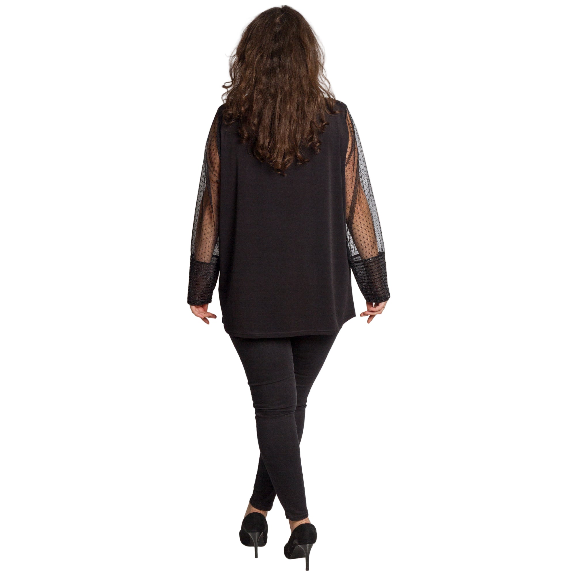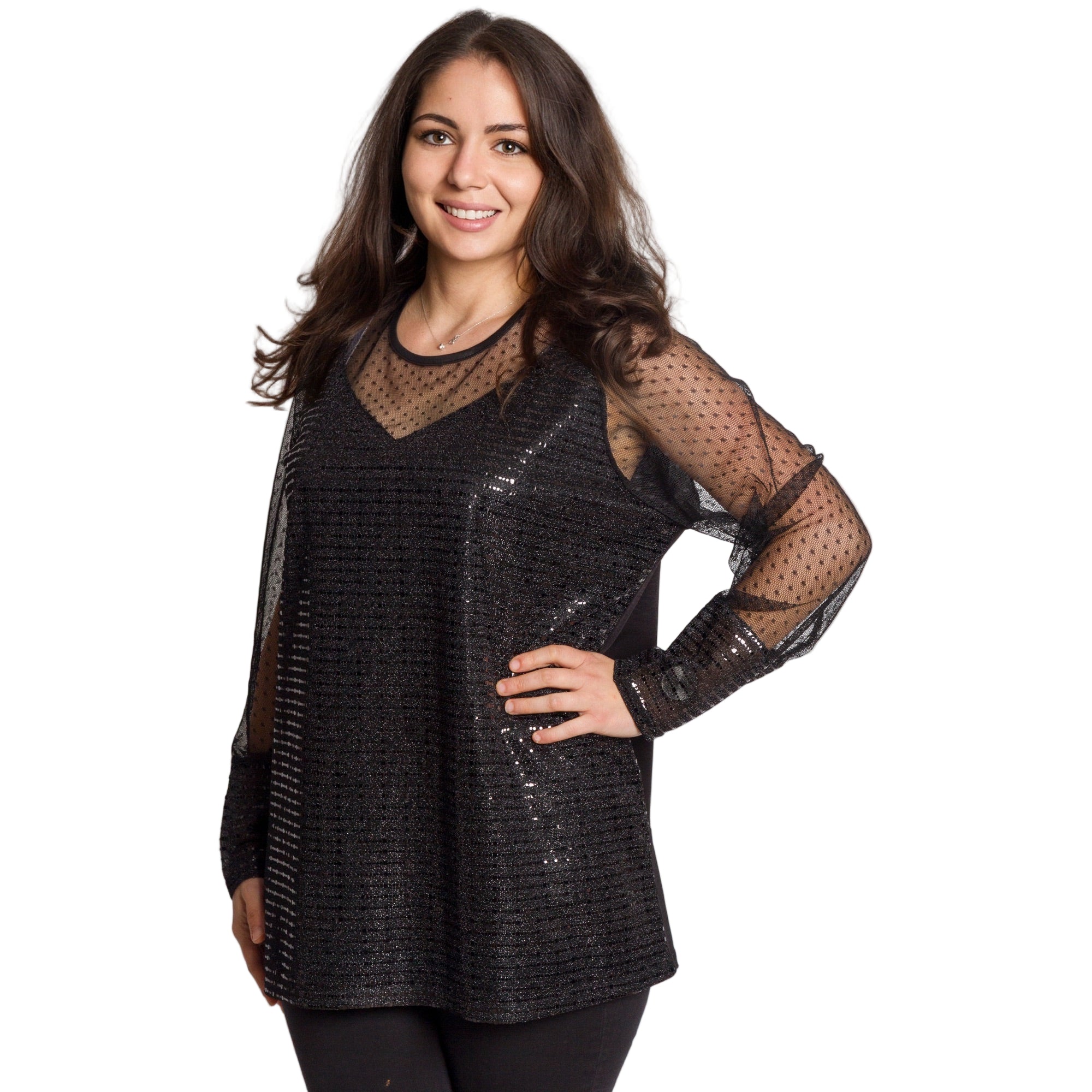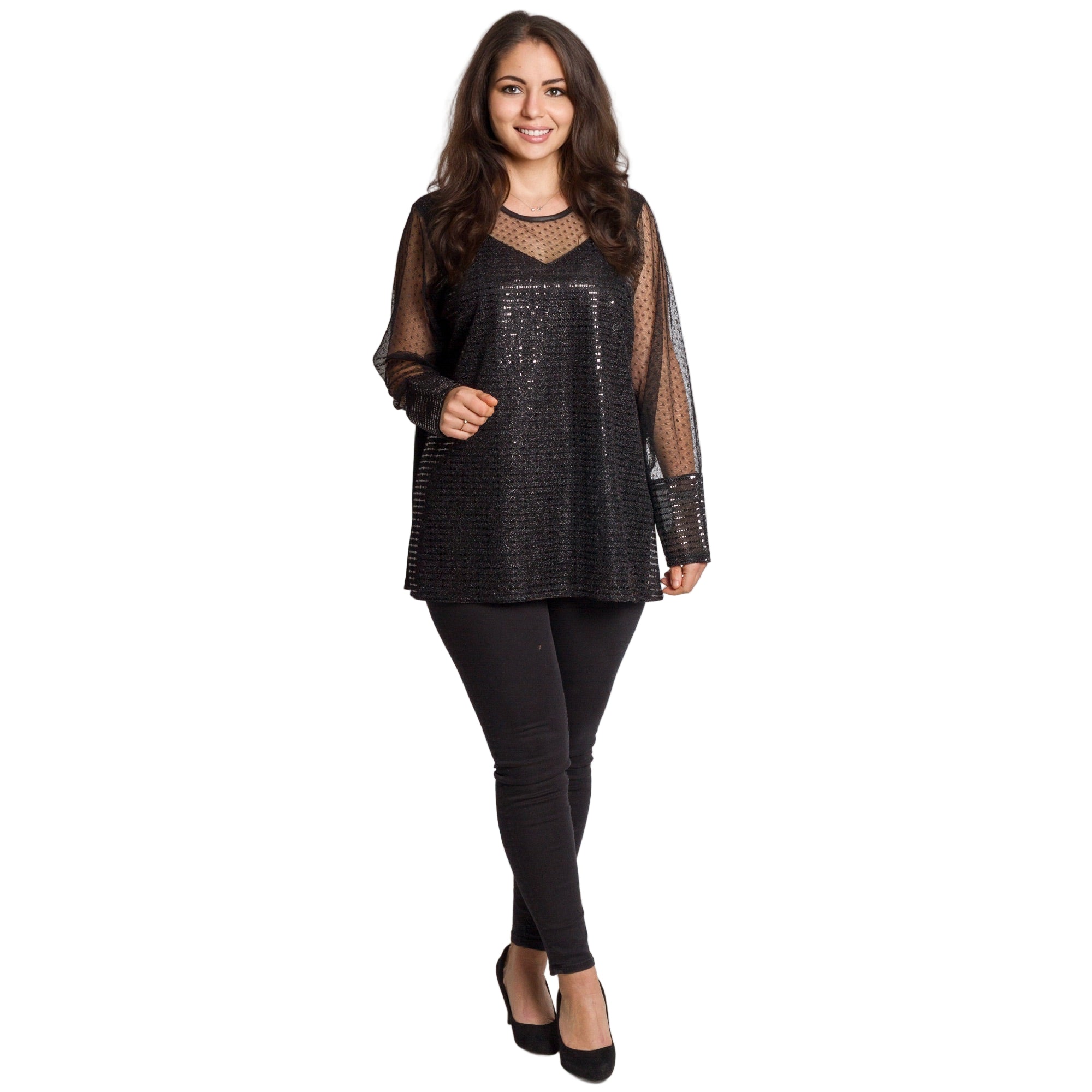 Елегантна черна туника с фин блестящ ефект, създадена за специални вечери и официални поводи. Горната материя е прозрачна и лека, с нежни ламе нишки, които придават дискретен блясък при движение. Моделът е с обло деколте и права кройка, която пада свободно по тялото и осигурява комфорт, без да очертава. Материята е мека и еластична – идеална за жени, които искат да се чувстват едновременно стилни и удобни. Перфектна за празници, коктейли и вечерни излизания през есенно-зимния сезон.