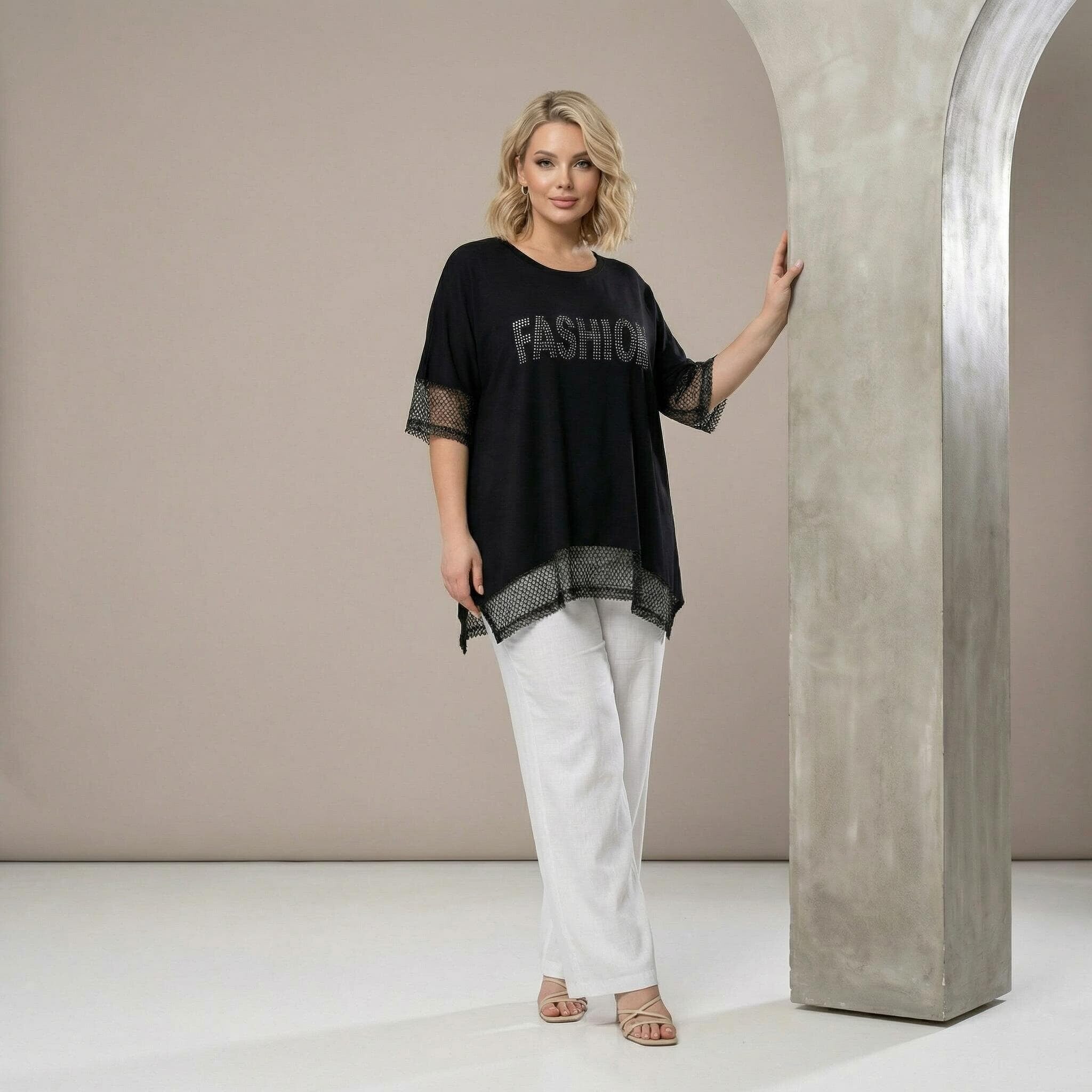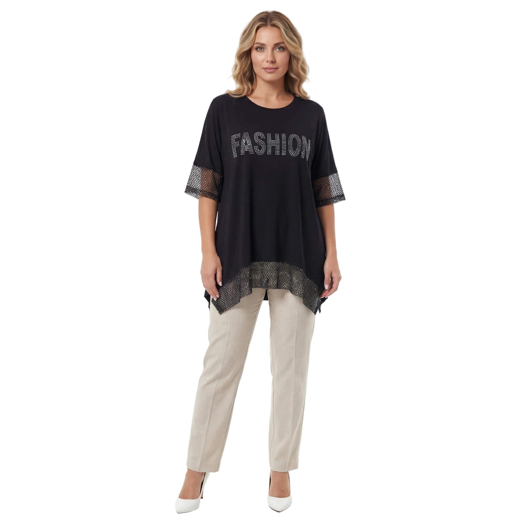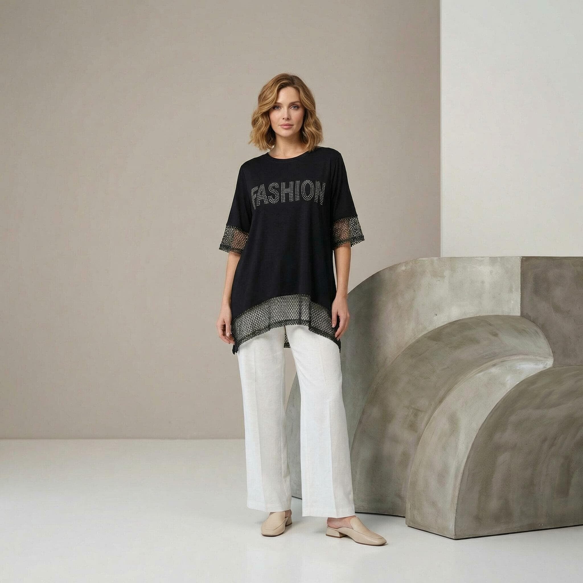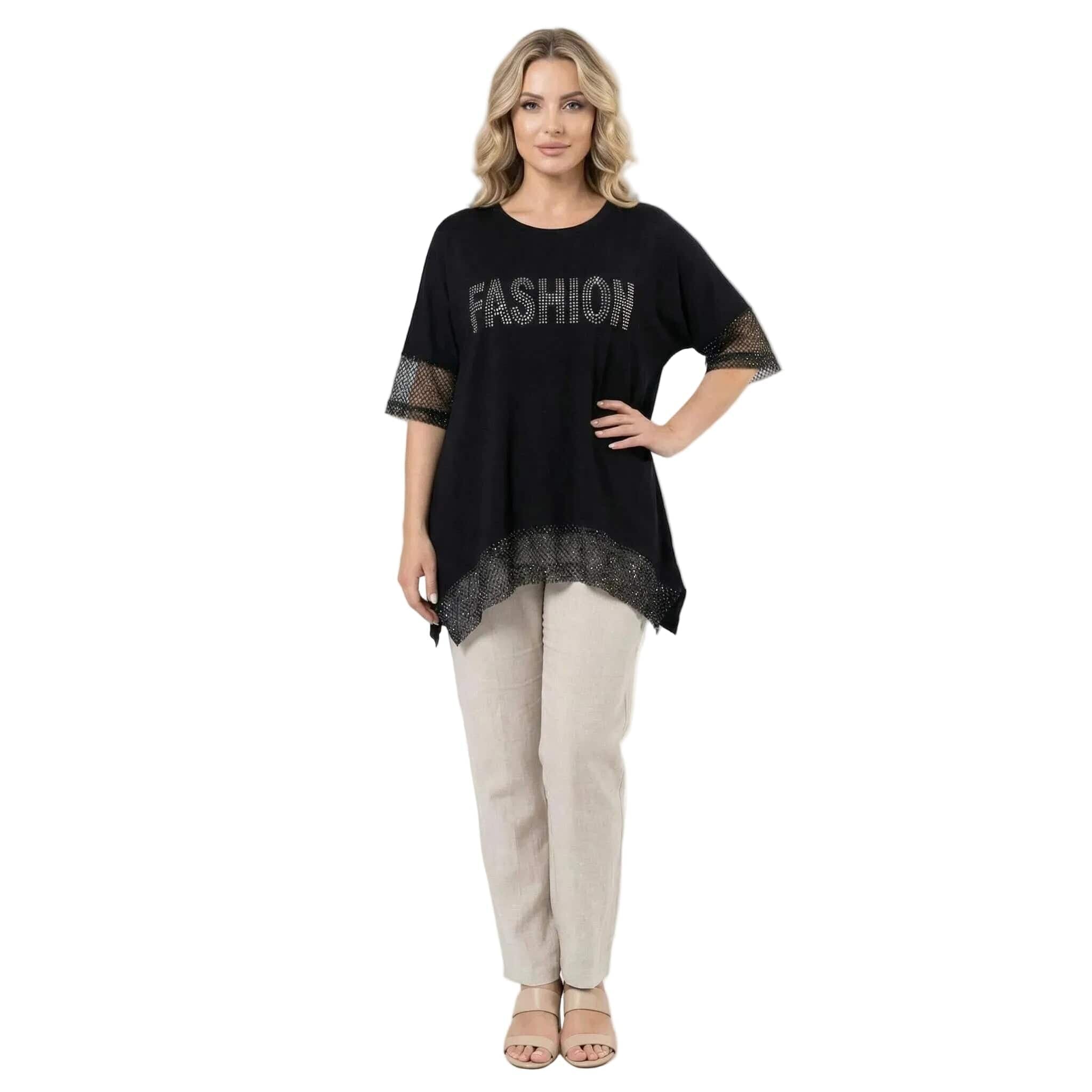 Елегантна черна асиметрична туника, създадена да подчертае вашата увереност и изискан вкус. Изработена от мека, гладка и тежко падаща вискоза, тази дреха гали кожата и осигурява безупречно усещане през пролетно-летния сезон. Моделът се отличава с разкроен А-силует и ефектен асиметричен подгъв, който придава елегантност на всяко движение. Късите ръкави и предната част са нежно акцентирани с блестяща мрежа с едра плетка, докато гърбът остава стилно изчистен. Завършващият детайл е впечатляващият надпис от сиви камъчета, придаващ празничен и официален вид. Свободната кройка и класическото обло деколте гарантират комфорт и красив силует за дами с пищни форми. Комбинира се перфектно с елегантен панталон или любимия ви клин за завършена модерна визия.
