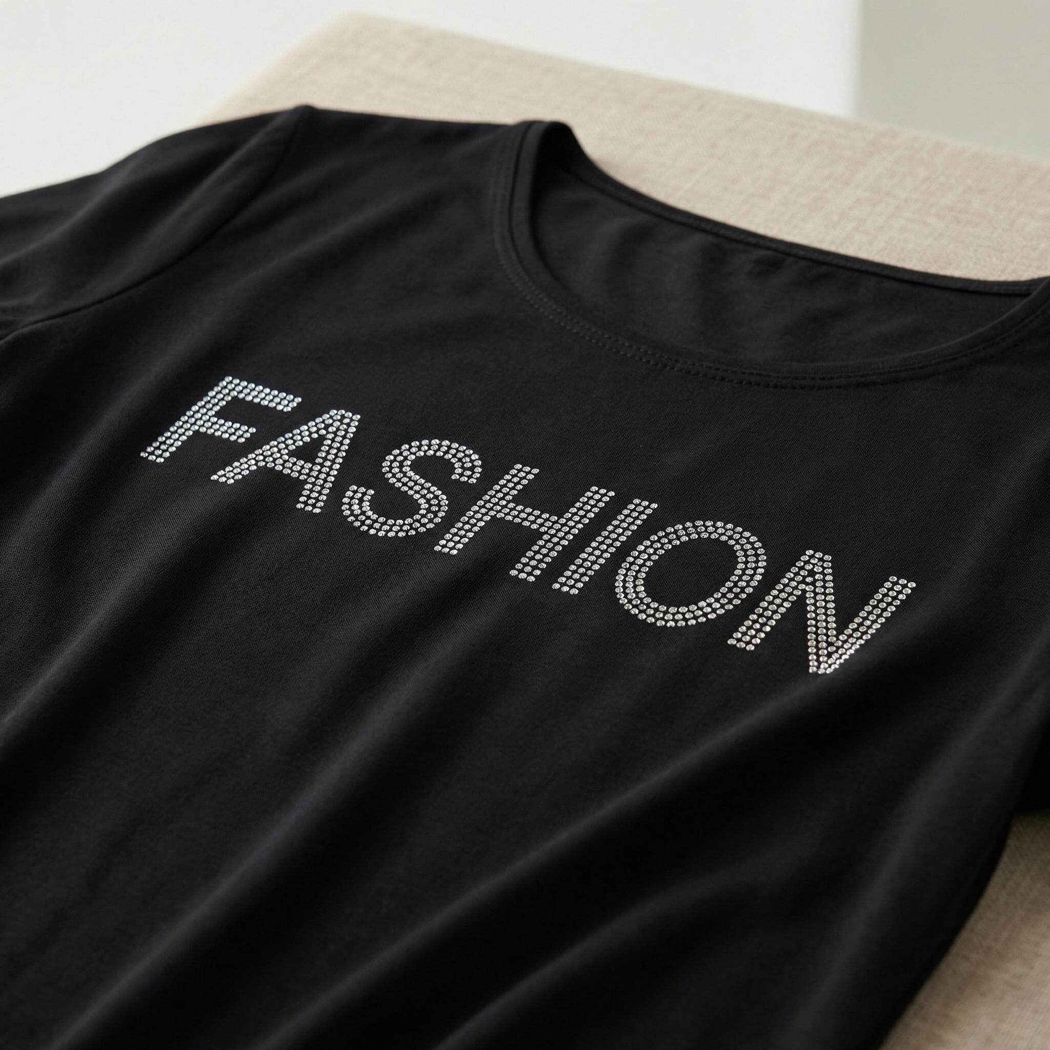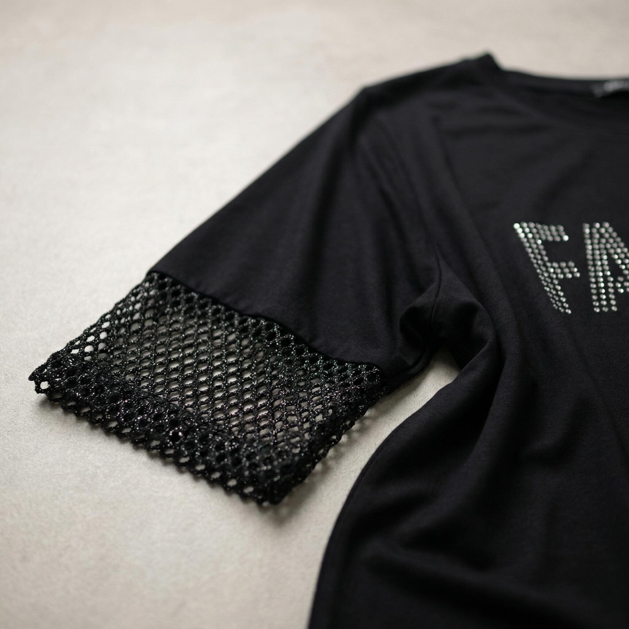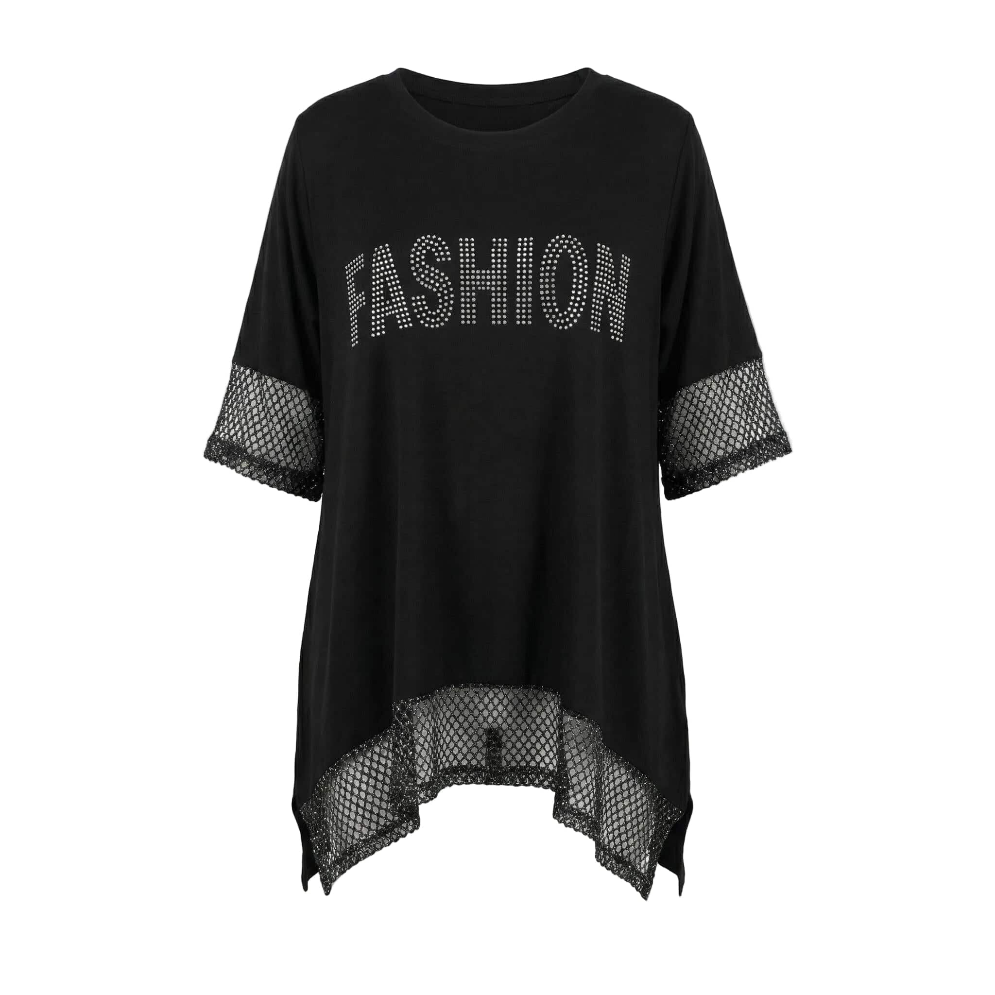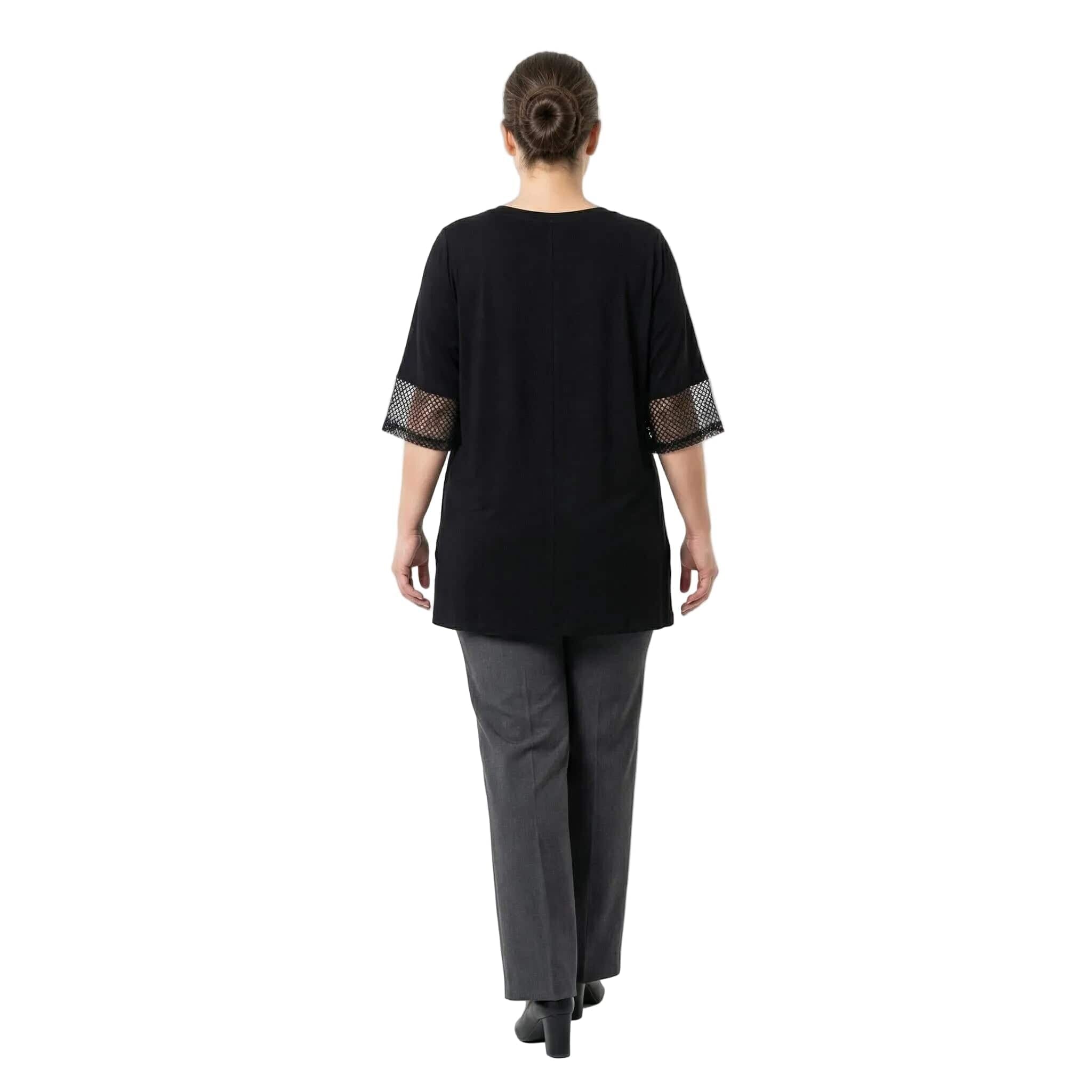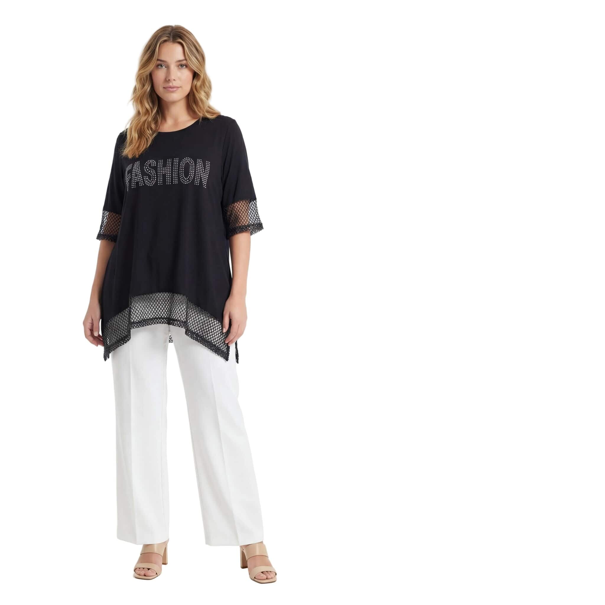 Елегантна черна асиметрична туника, създадена да подчертае вашата увереност и изискан вкус. Изработена от мека, гладка и тежко падаща вискоза, тази дреха гали кожата и осигурява безупречно усещане през пролетно-летния сезон. Моделът се отличава с разкроен А-силует и ефектен асиметричен подгъв, който придава елегантност на всяко движение. Късите ръкави и предната част са нежно акцентирани с блестяща мрежа с едра плетка, докато гърбът остава стилно изчистен. Завършващият детайл е впечатляващият надпис от сиви камъчета, придаващ празничен и официален вид. Свободната кройка и класическото обло деколте гарантират комфорт и красив силует за дами с пищни форми. Комбинира се перфектно с елегантен панталон или любимия ви клин за завършена модерна визия.