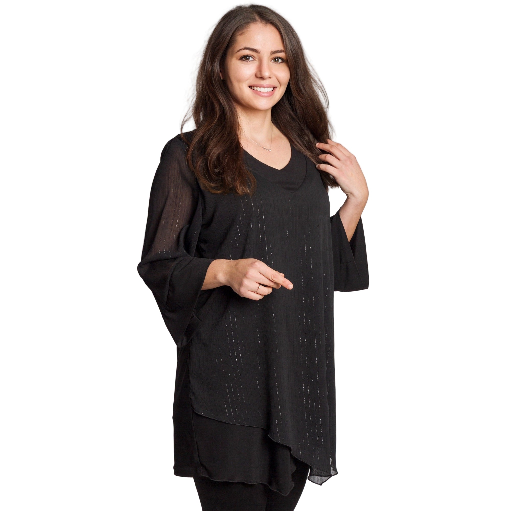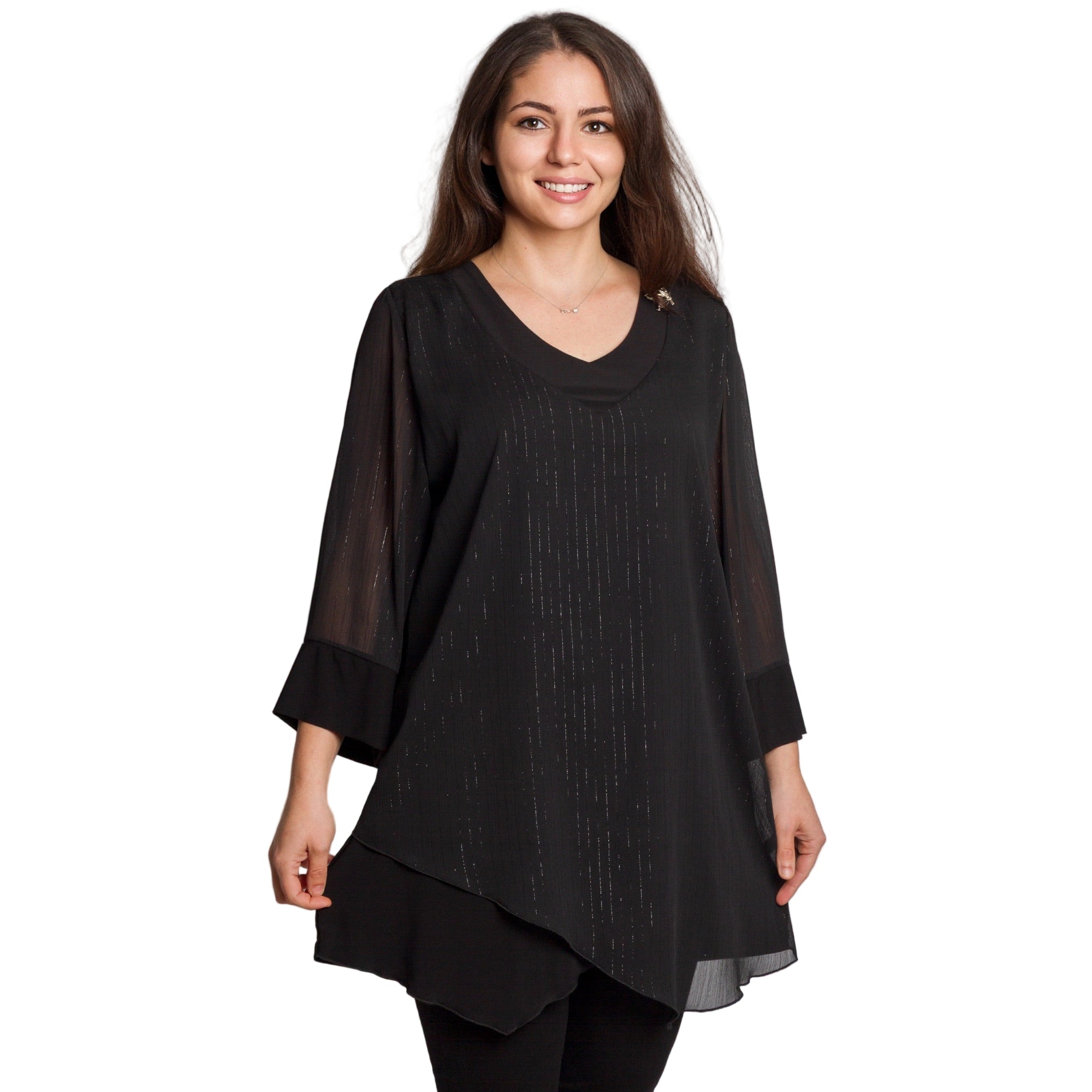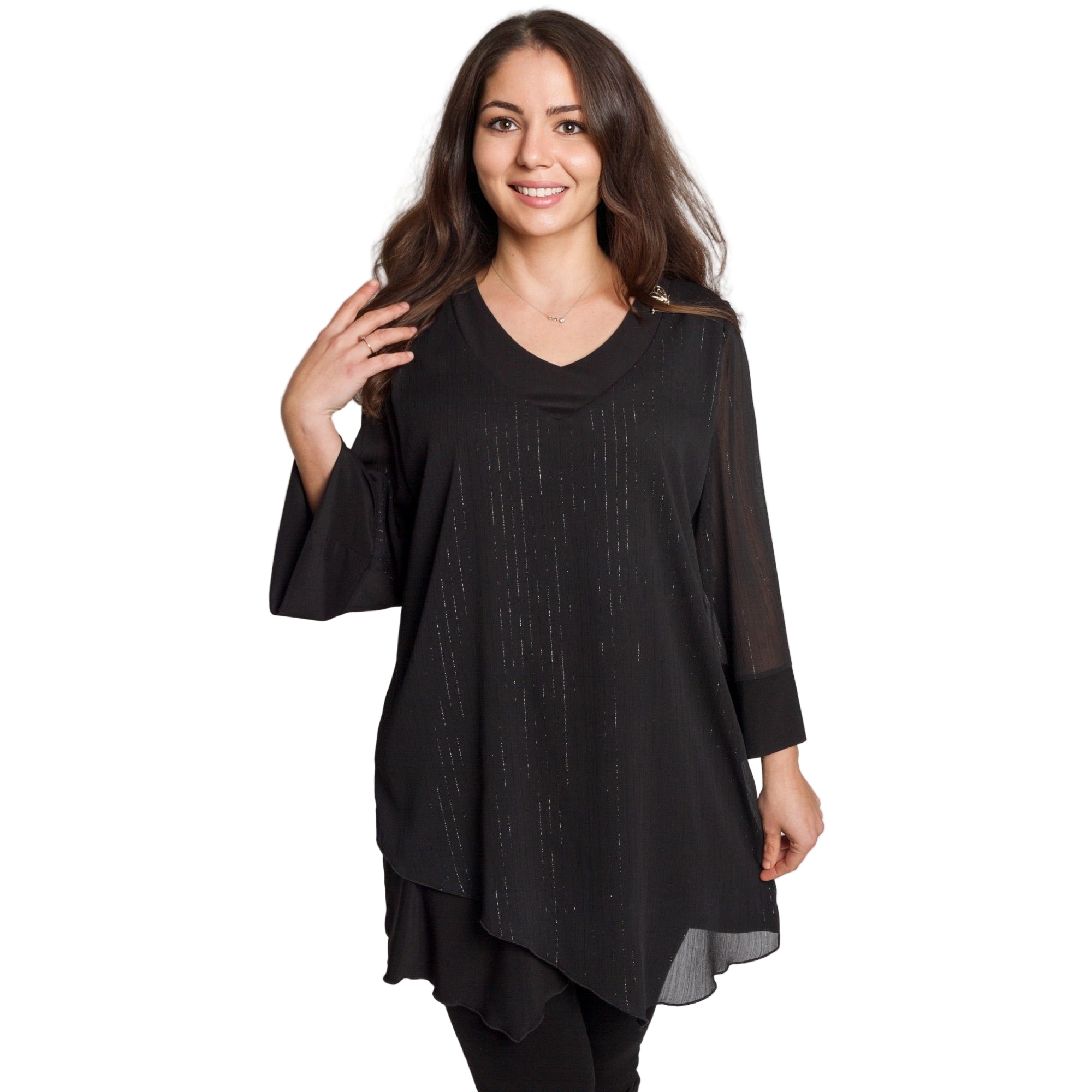 Елегантна черна туника с асиметричен подгъв, подходяща за специални поводи през есенно-зимния сезон. Моделът впечатлява с фина прозрачна материя по ръкавите и дискретен брокатен ефект, който придава празнично и изискано излъчване. Горната част има леко V-образно деколте с красиво падане и декоративна брошка при рамото. Свободната кройка пада красиво по тялото и осигурява комфорт, като едновременно прикрива корем и ханш. Материята е нежна, пада леко и осигурява стил без компромис с удобството.