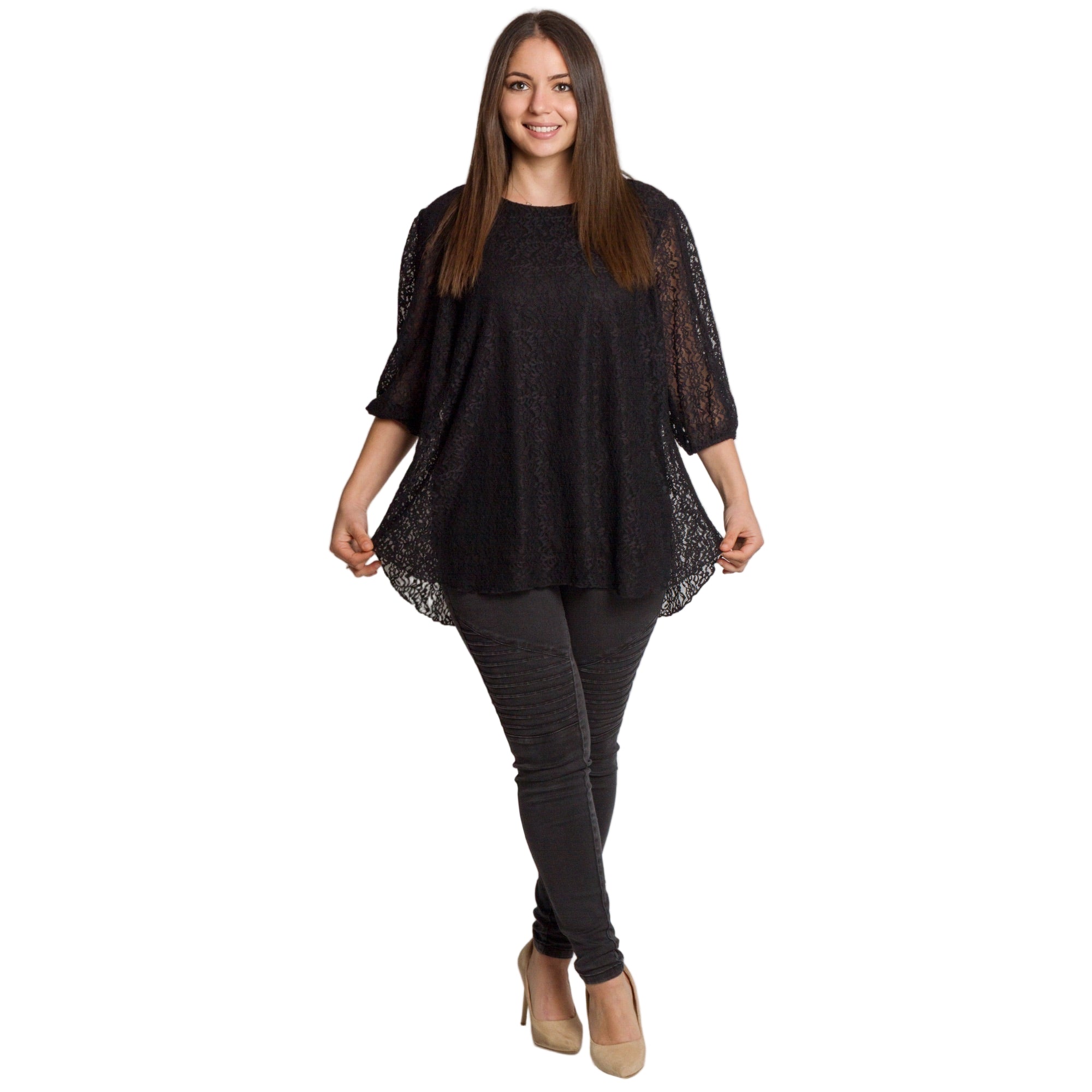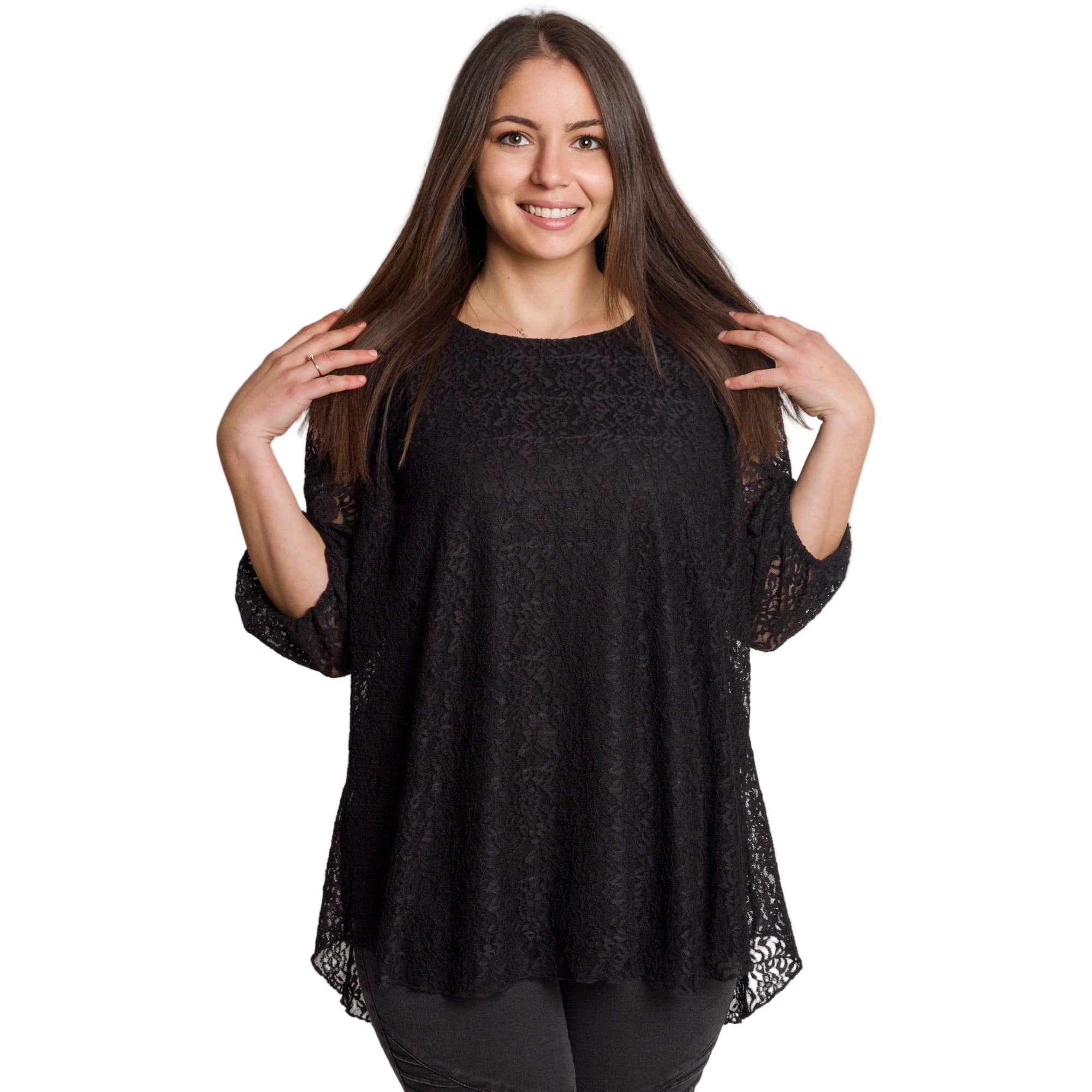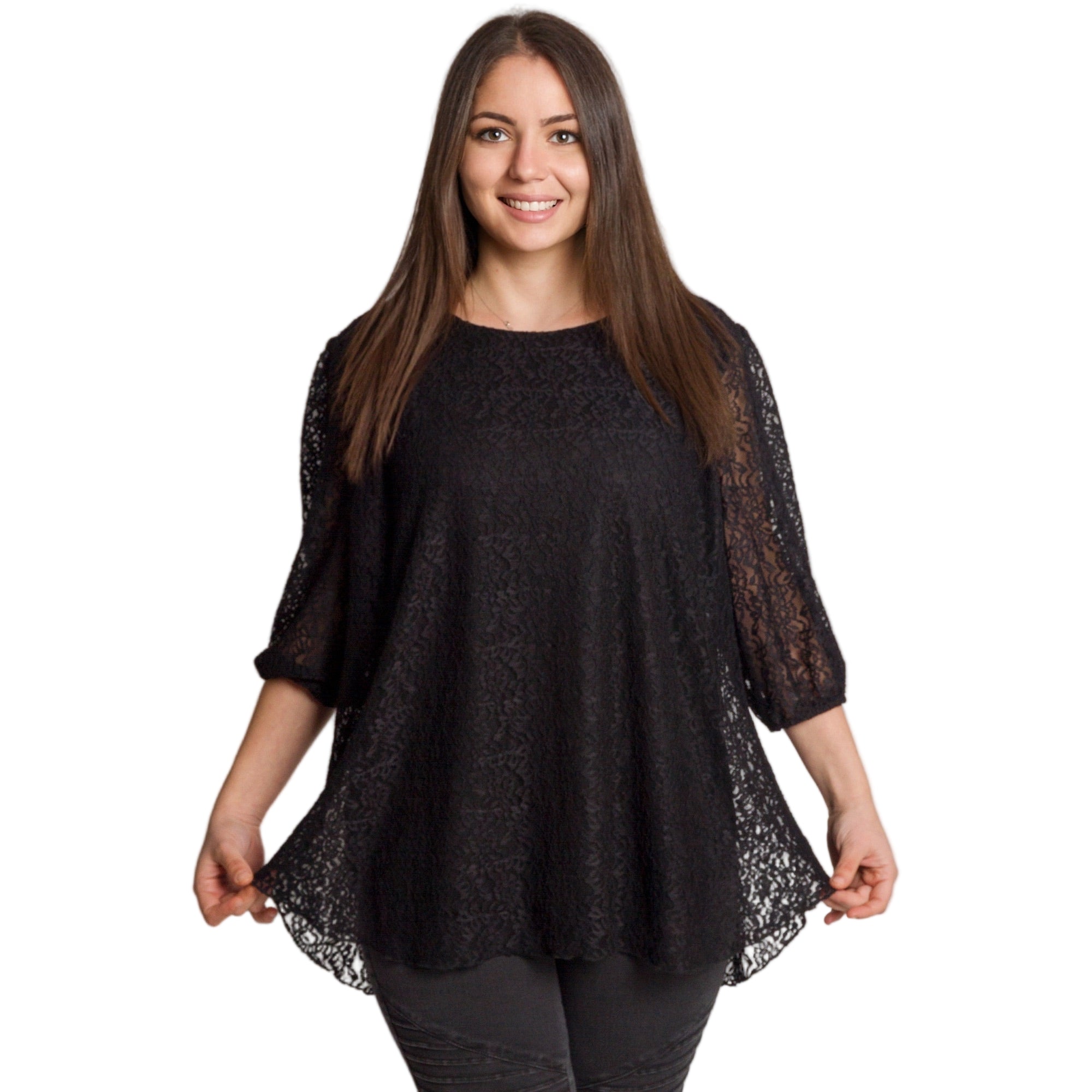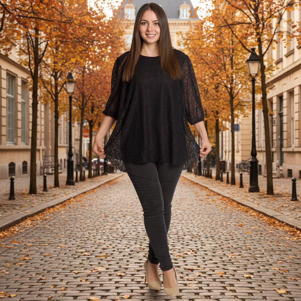 Тази изискана черна туника от дантела е перфектният избор за официални поводи, празнични вечери и специални моменти. Моделът е изработен от висококачествена дантелена материя, която придава луксозно и нежно излъчване, без да прави компромис с удобството. Разкроената линия пада леко и свободно по тялото, осигурявайки комфорт и красиво подчертаване на фигурата в плюс сайз размери. Дантелата е стилно оформена с фини флорални мотиви, а облото деколте придава класическа и женствена визия. Подходяща за комбинация с елегантен панталон или пола, тази туника е универсално и стилно решение за есенно-зимните месеци.