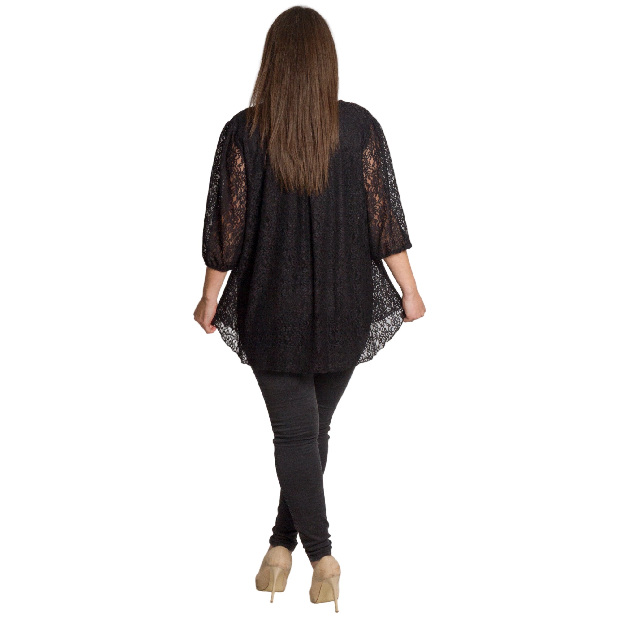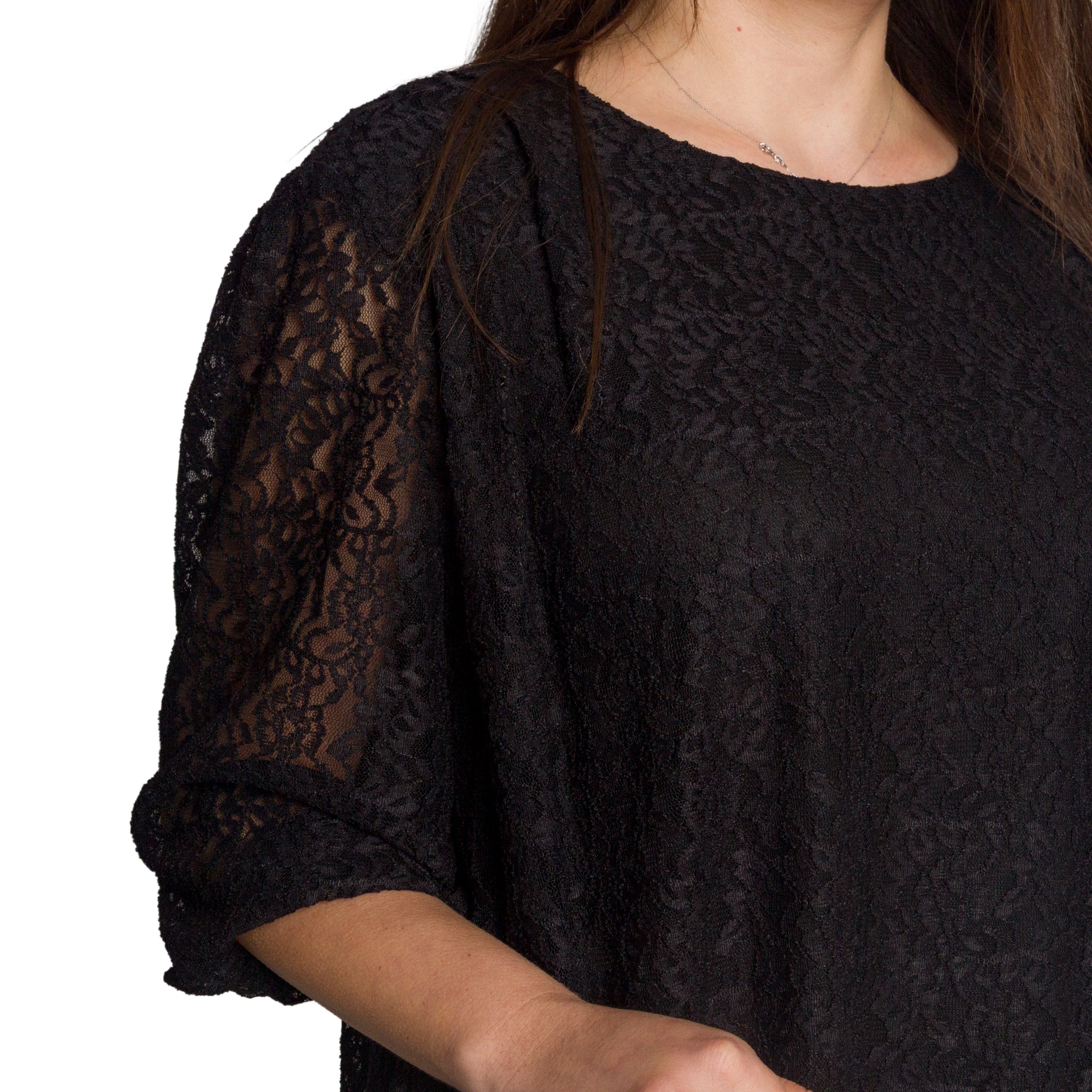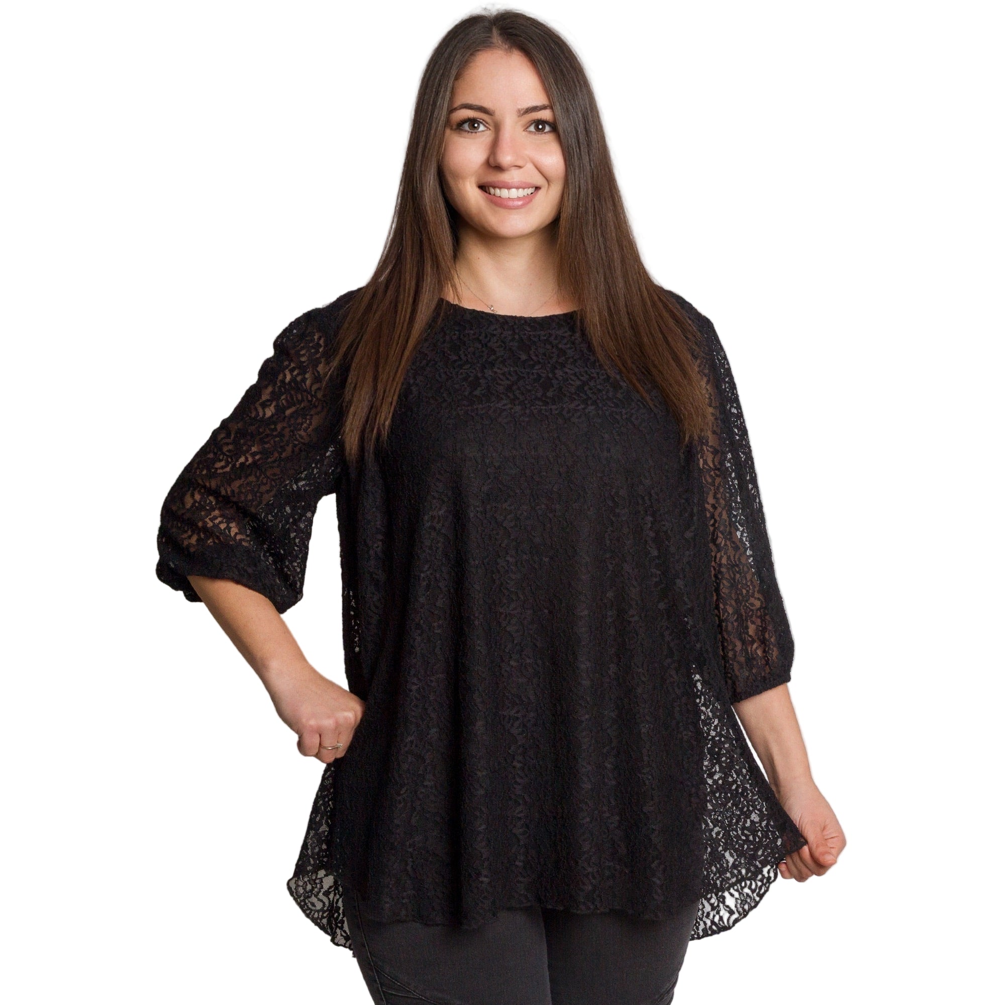 Тази изискана черна туника от дантела е перфектният избор за официални поводи, празнични вечери и специални моменти. Моделът е изработен от висококачествена дантелена материя, която придава луксозно и нежно излъчване, без да прави компромис с удобството. Разкроената линия пада леко и свободно по тялото, осигурявайки комфорт и красиво подчертаване на фигурата в плюс сайз размери. Дантелата е стилно оформена с фини флорални мотиви, а облото деколте придава класическа и женствена визия. Подходяща за комбинация с елегантен панталон или пола, тази туника е универсално и стилно решение за есенно-зимните месеци.