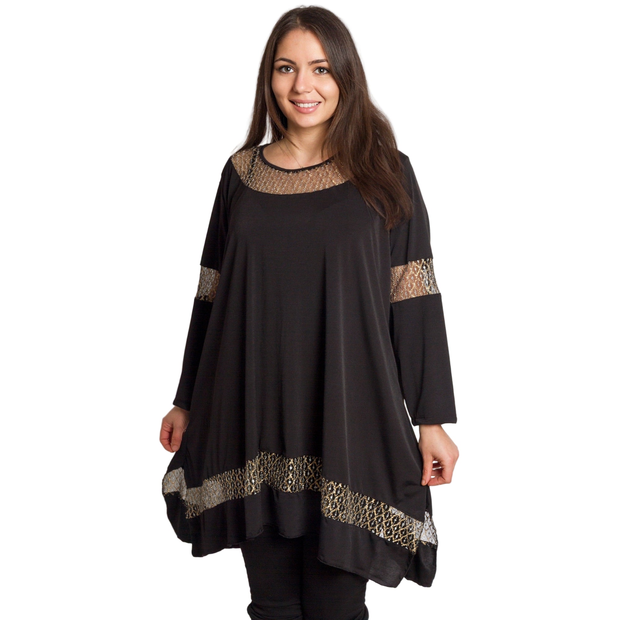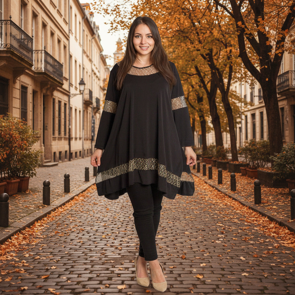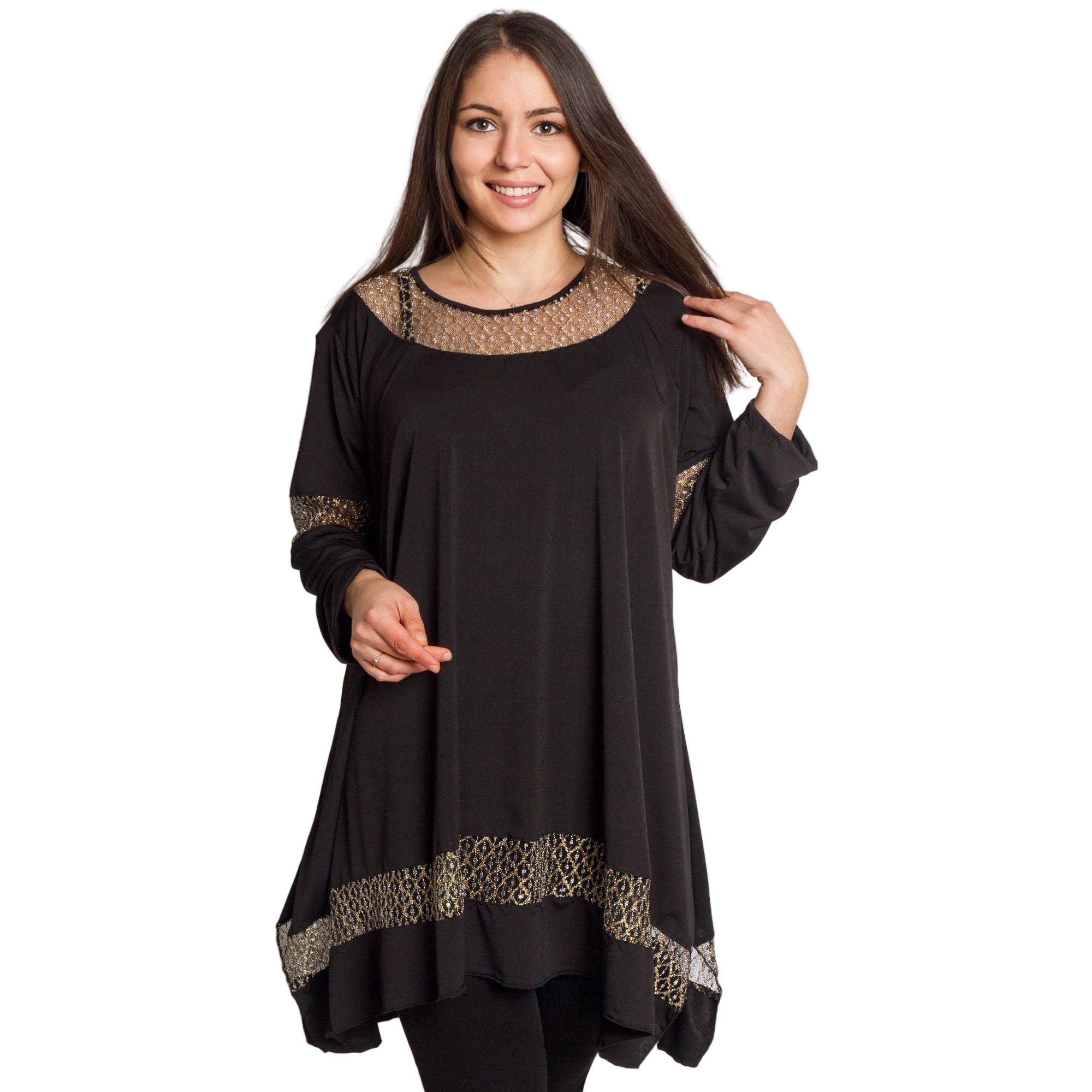 Елегантна черна туника, създадена специално за официални поводи и празнични събития. Материята е мека, лека и комфортна, благодарение на комбинирането на памук и полиестер. Разкроената кройка пада свободно и прикрива силуета, като осигурява удобство през целия ден. Горната част на деколтето, ръкавите и долният кант са украсени с красива златиста мрежеста апликация, която придава луксозен и впечатляващ вид. Моделът е идеален за есенно-зимния сезон и се съчетава отлично с елегантни панталони или клин.