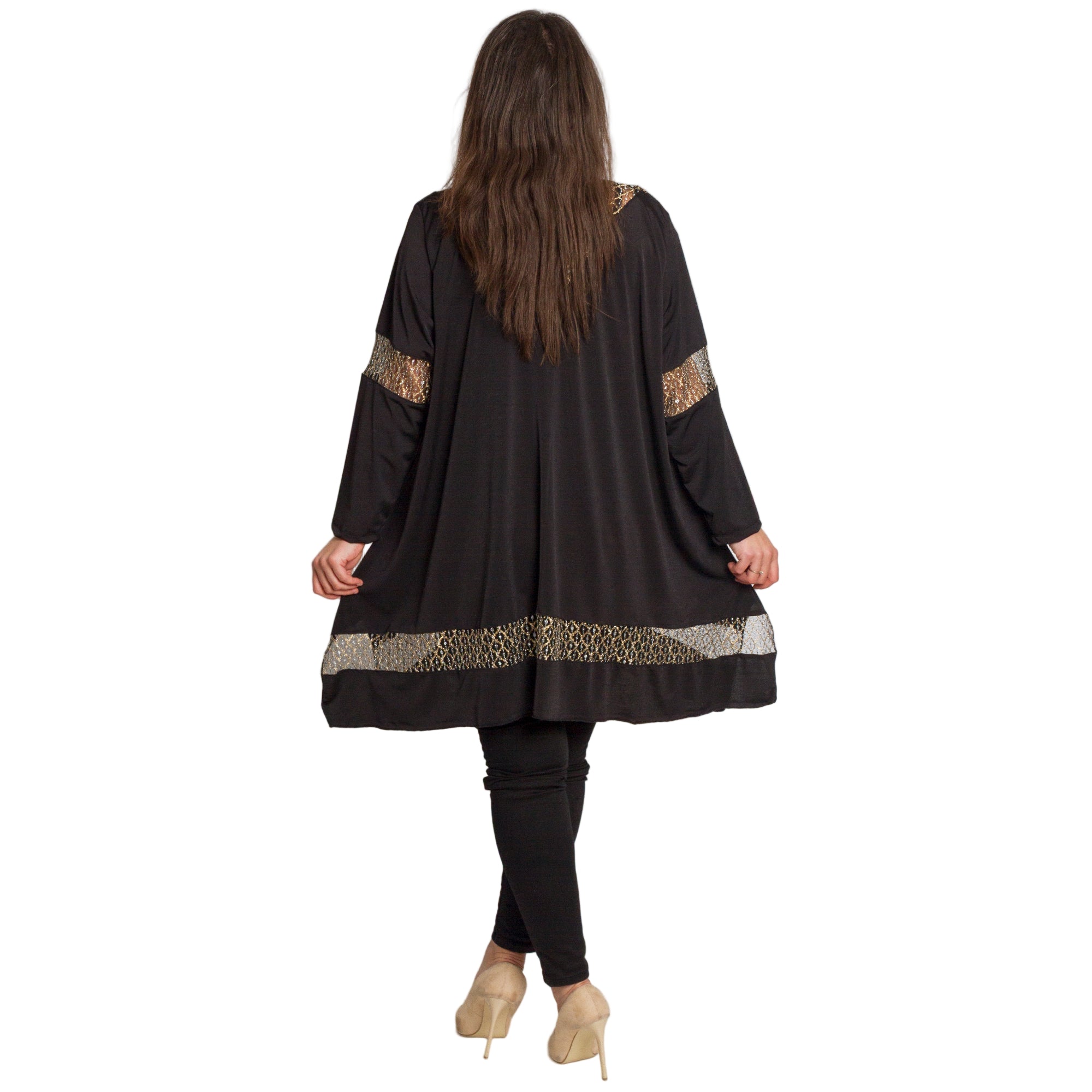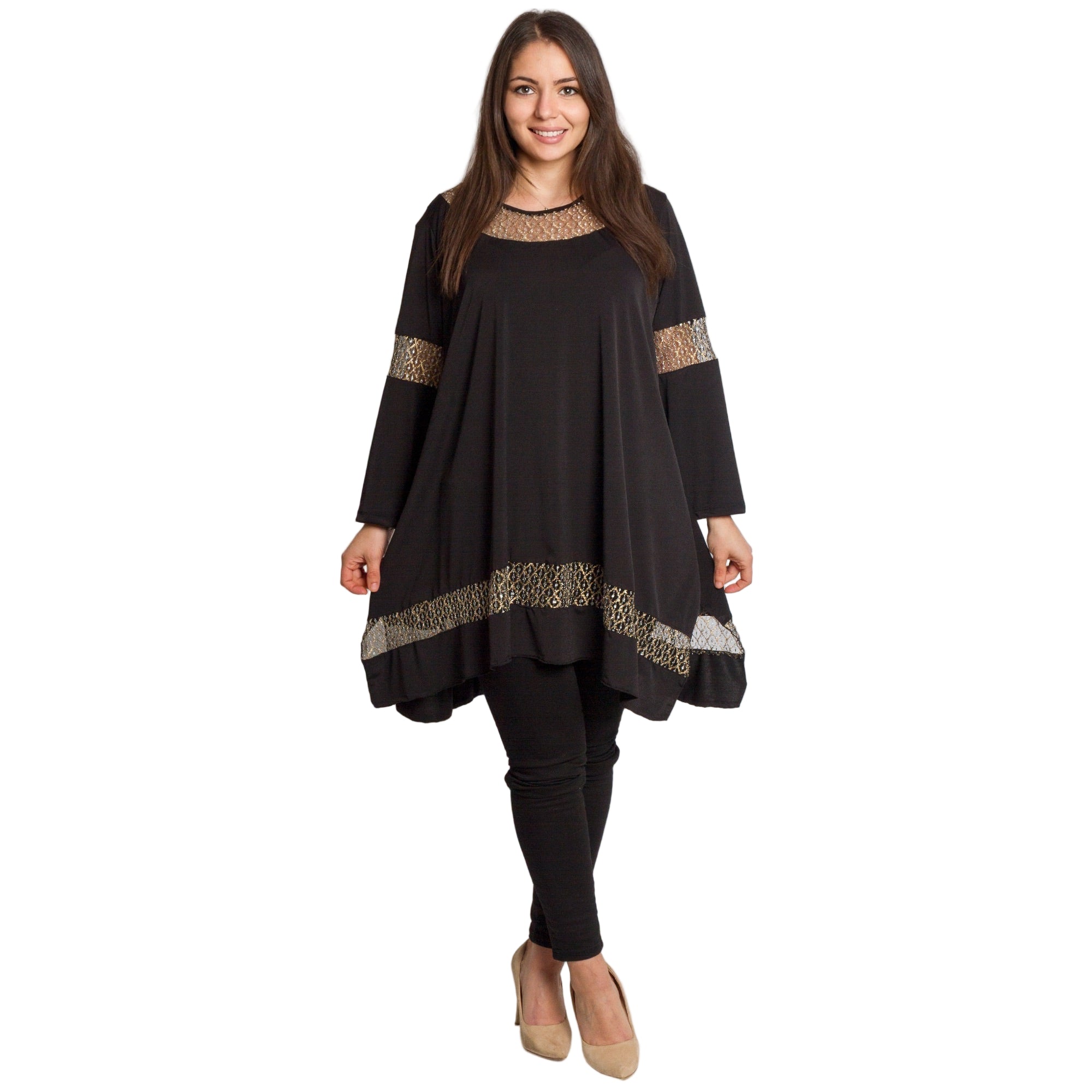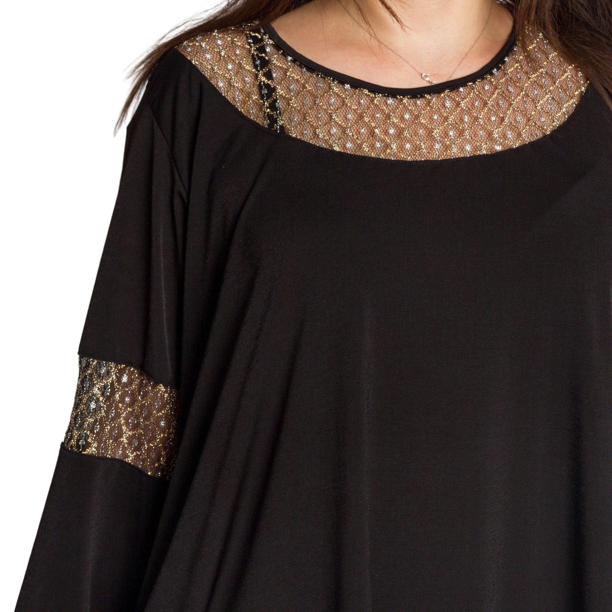 Елегантна черна туника, създадена специално за официални поводи и празнични събития. Материята е мека, лека и комфортна, благодарение на комбинирането на памук и полиестер. Разкроената кройка пада свободно и прикрива силуета, като осигурява удобство през целия ден. Горната част на деколтето, ръкавите и долният кант са украсени с красива златиста мрежеста апликация, която придава луксозен и впечатляващ вид. Моделът е идеален за есенно-зимния сезон и се съчетава отлично с елегантни панталони или клин.