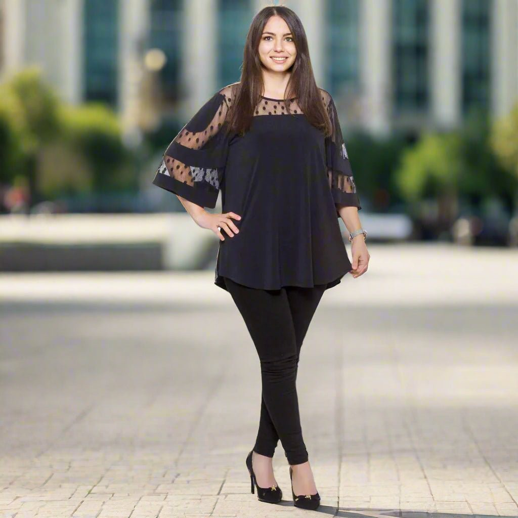 Елегантна черна туника в големи размери, изработена от висококачествен полиестер. Моделът е с разкроена кройка, която осигурява свобода и комфорт, а прозрачният тюл с ефектни точки придава стилен и изискан акцент. Кръглото деколте и 3/4 ръкавите подчертават женствеността и я правят подходяща за официални поводи. Леката еластичност на материята гарантира удобство при носене.