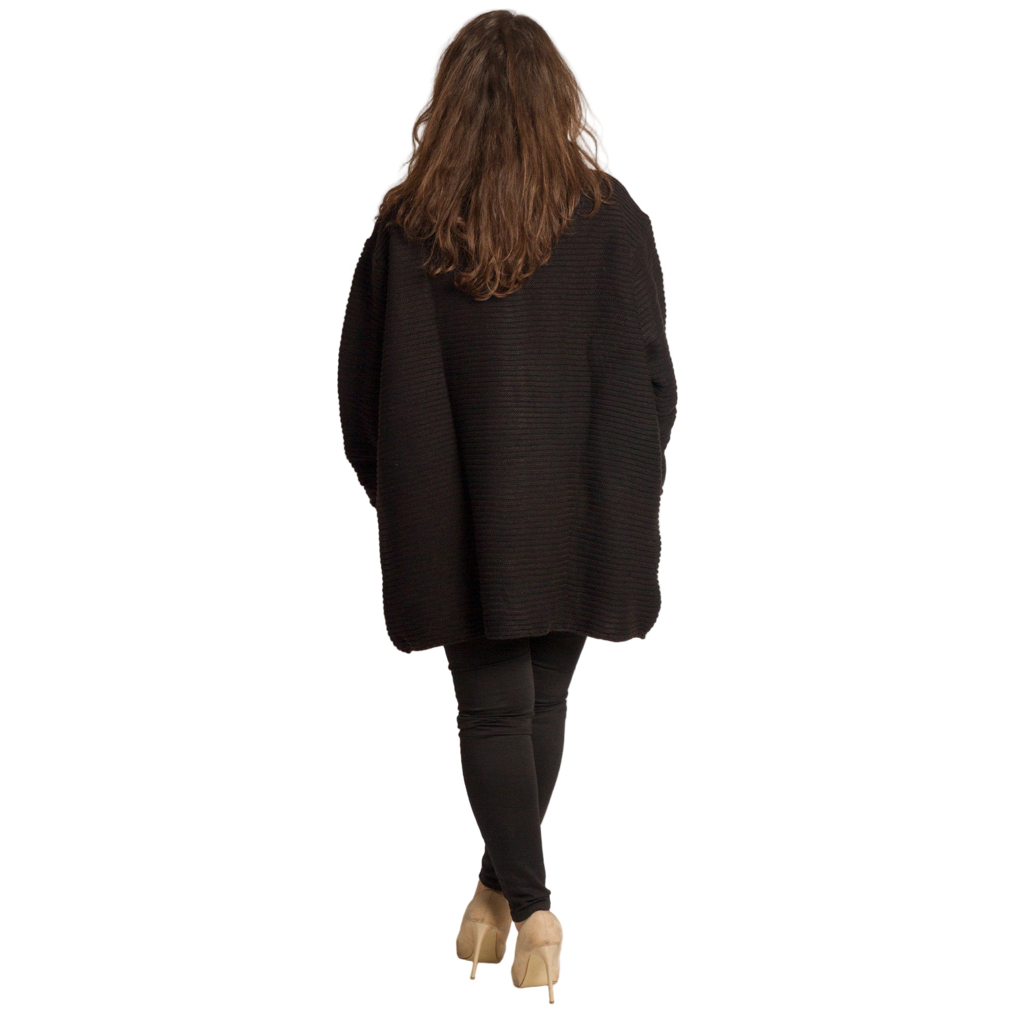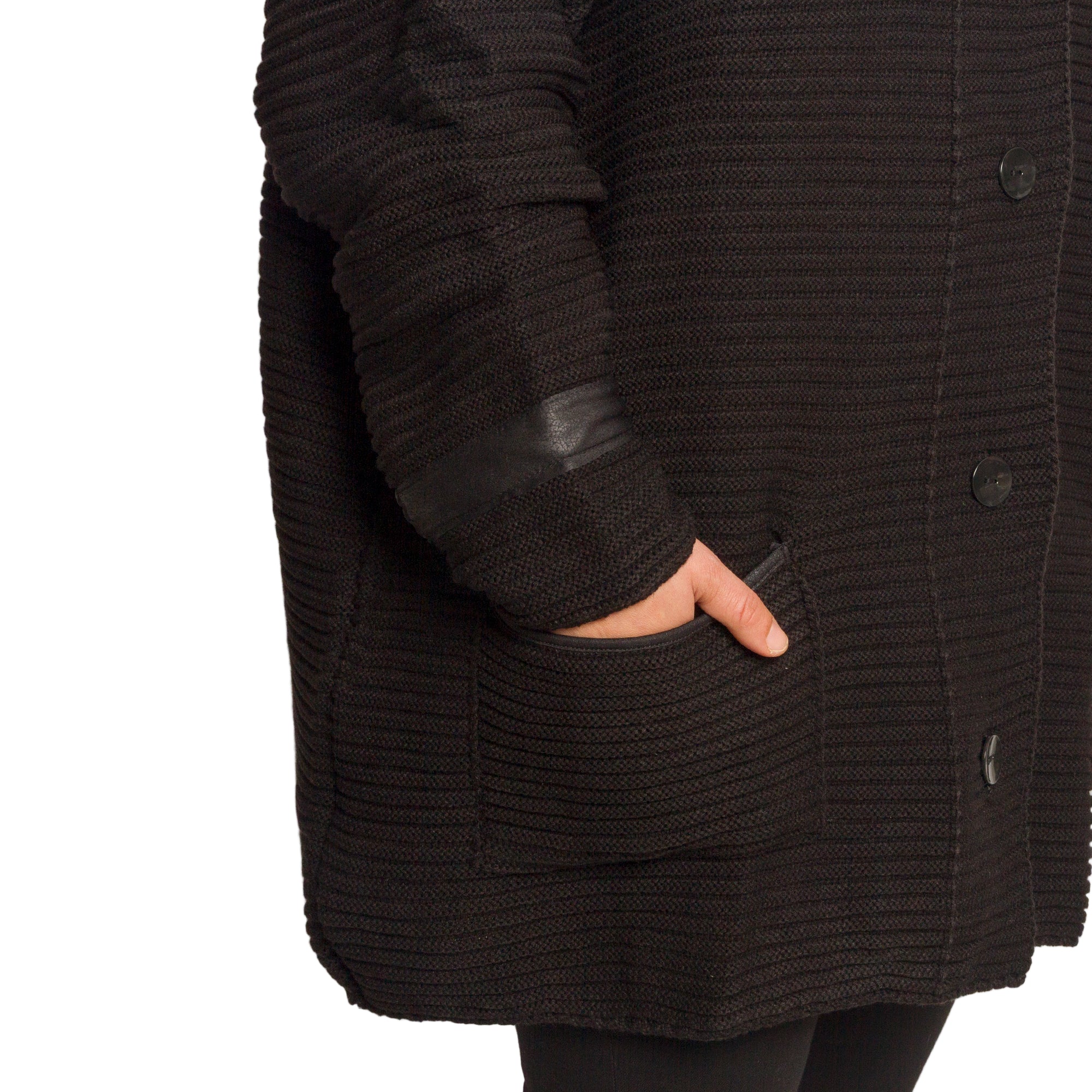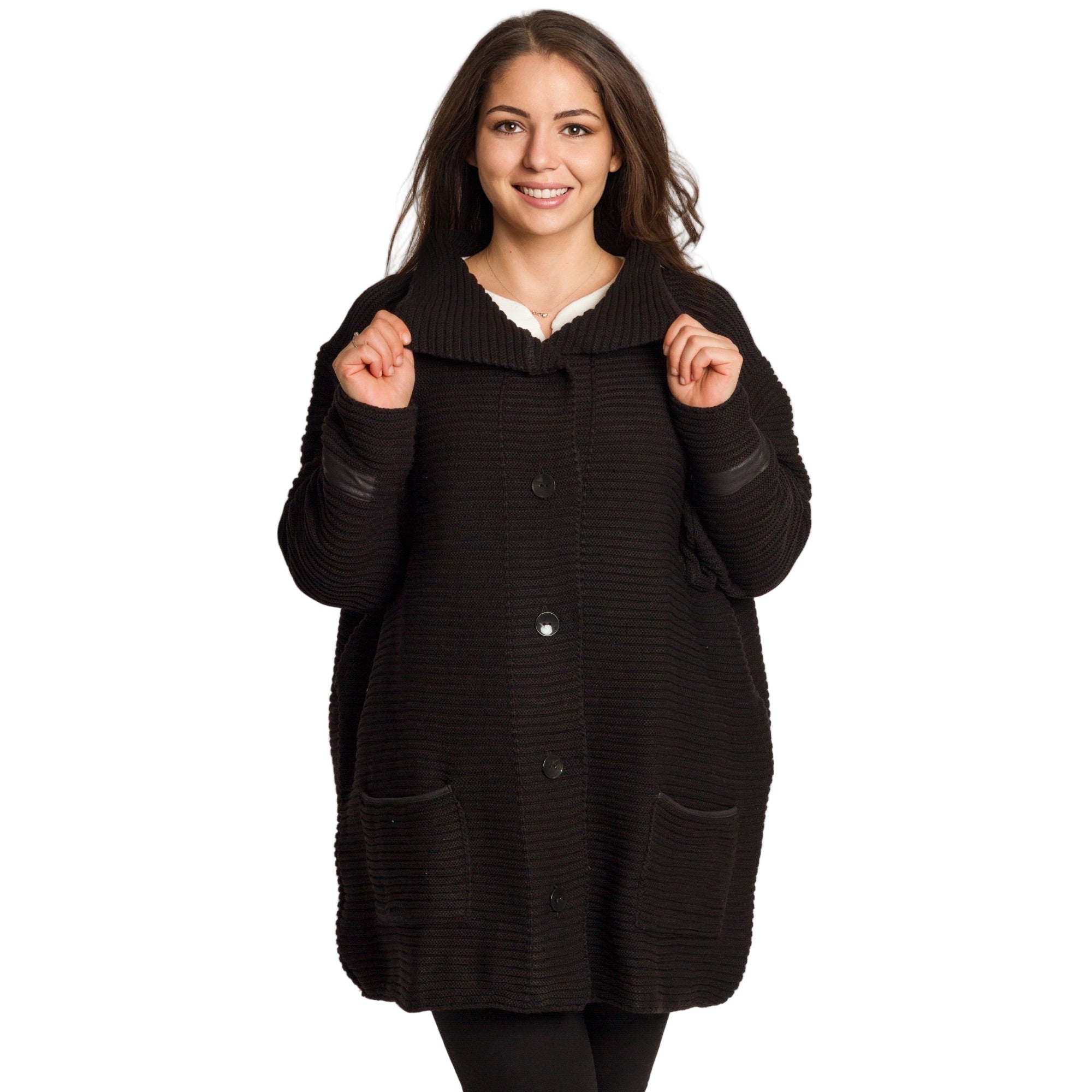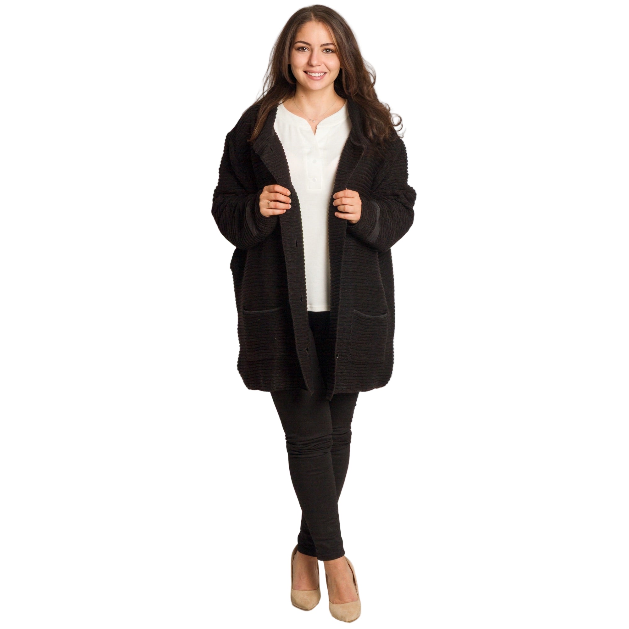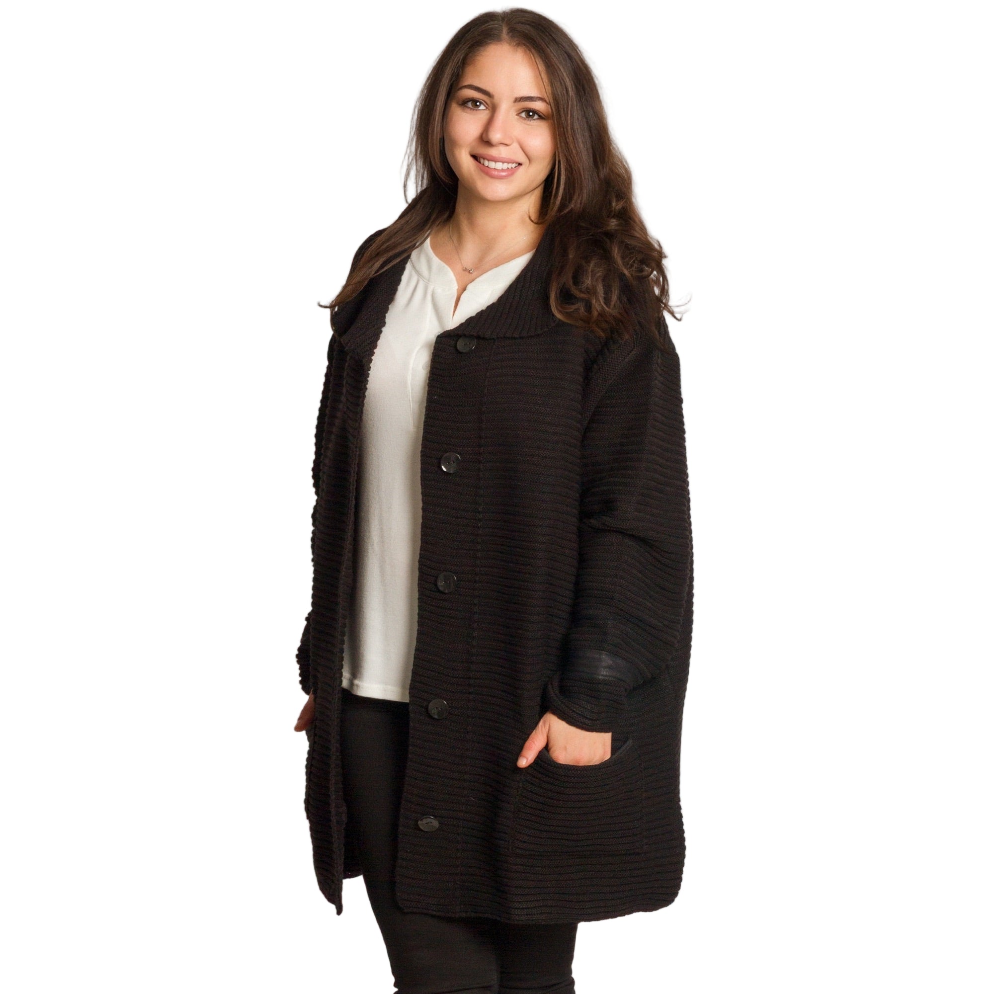 Класическа черна плетена жилетка, идеална за есенно-зимния сезон. Изработена е от мек и топъл акрил, който осигурява комфорт и защита от студа. Моделът е с права, свободна кройка и големи декоративни копчета. Двата предни джоба и кожените детайли по ръкавите придават стилен и завършен вид. Подходяща е както за ежедневни, така и за по-елегантни поводи.