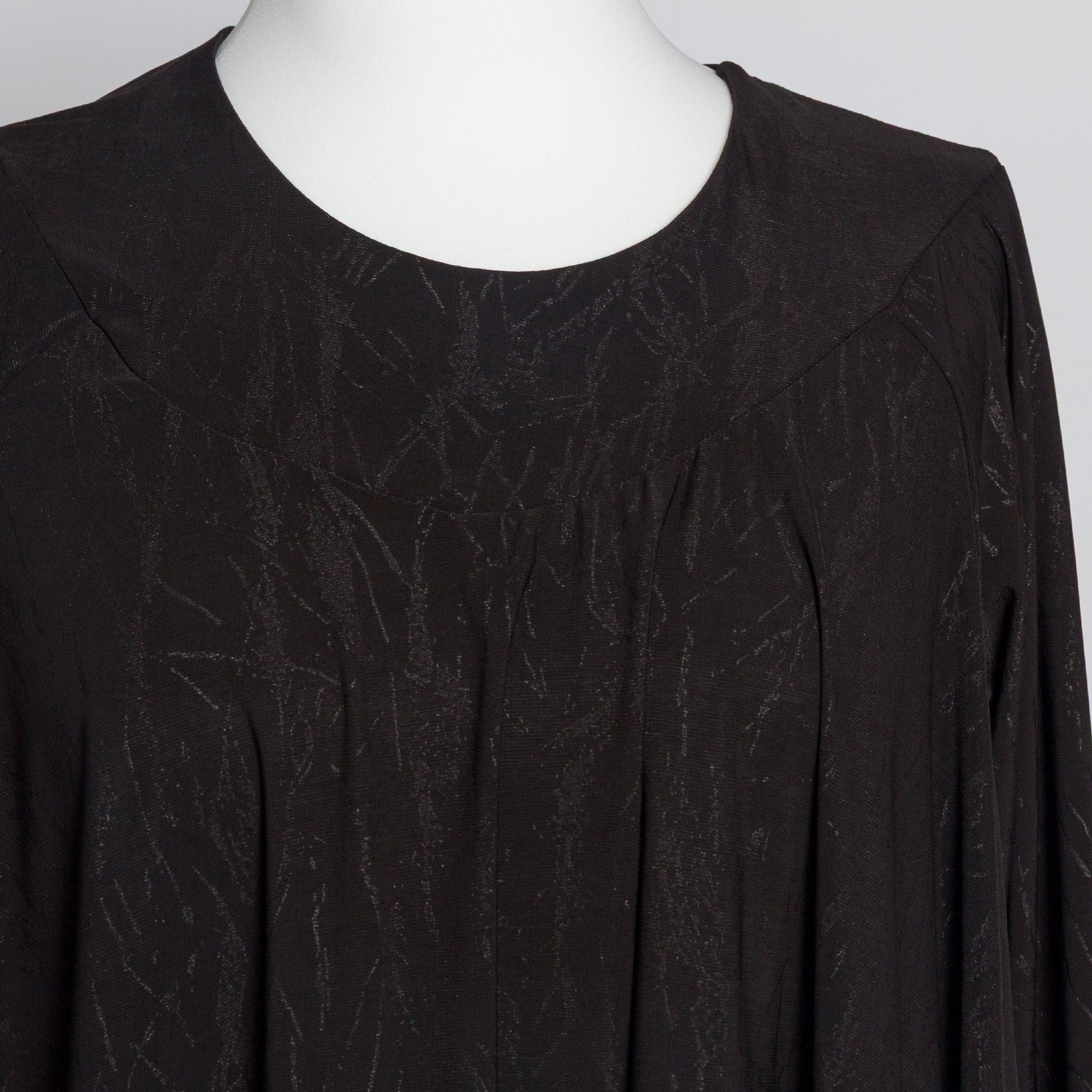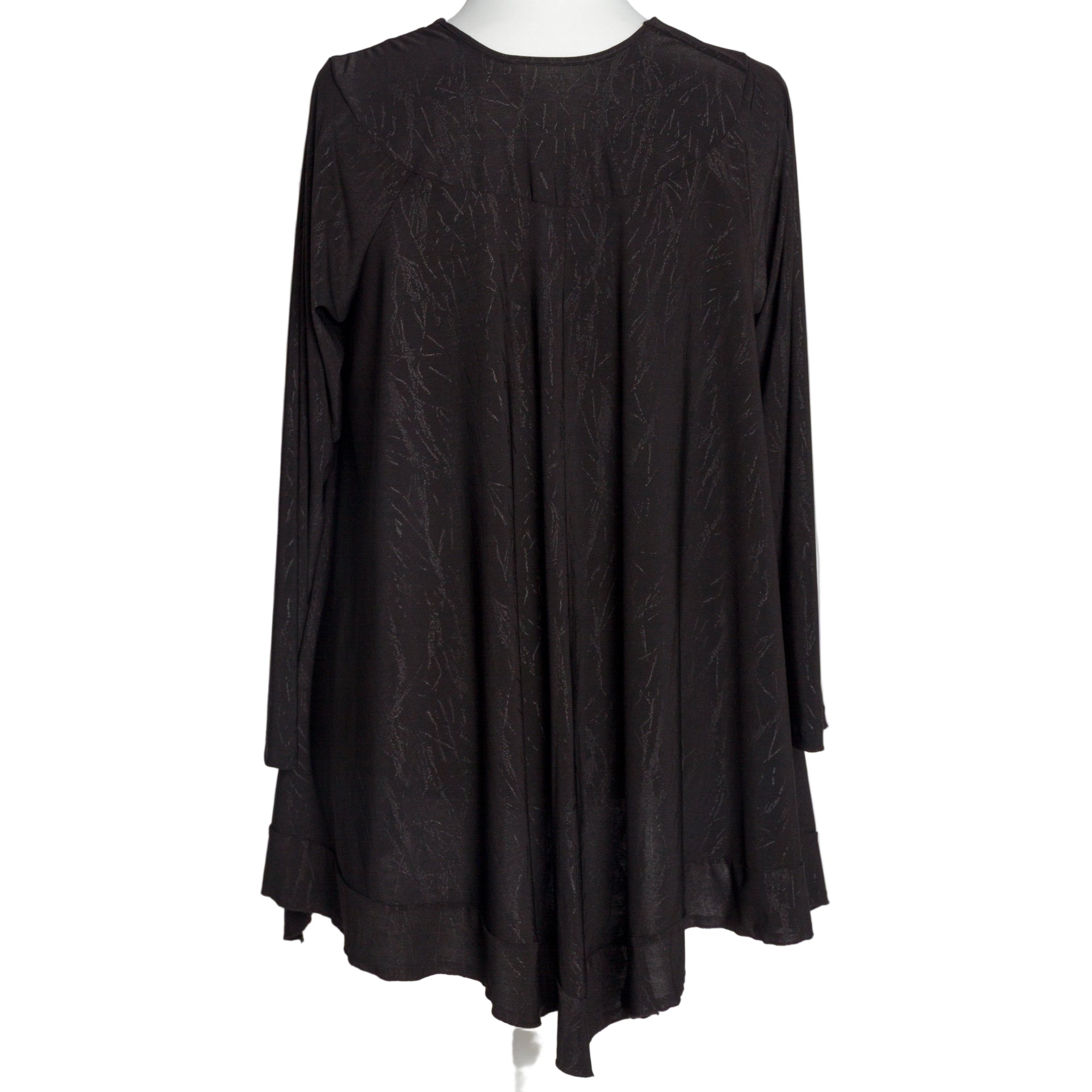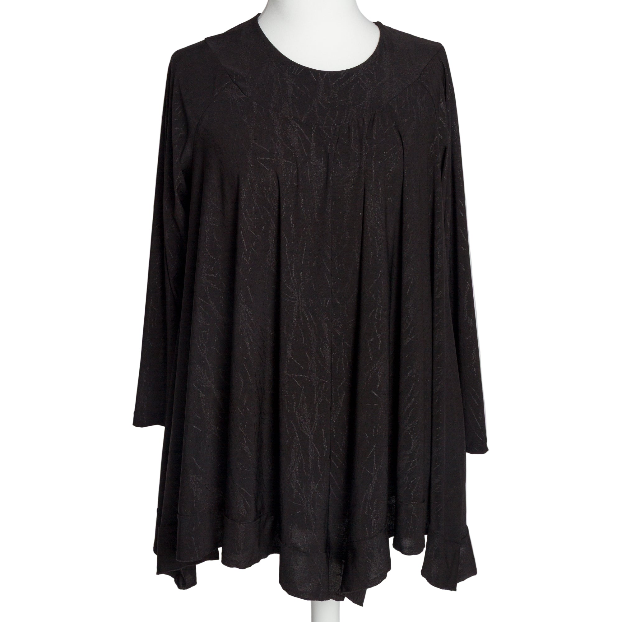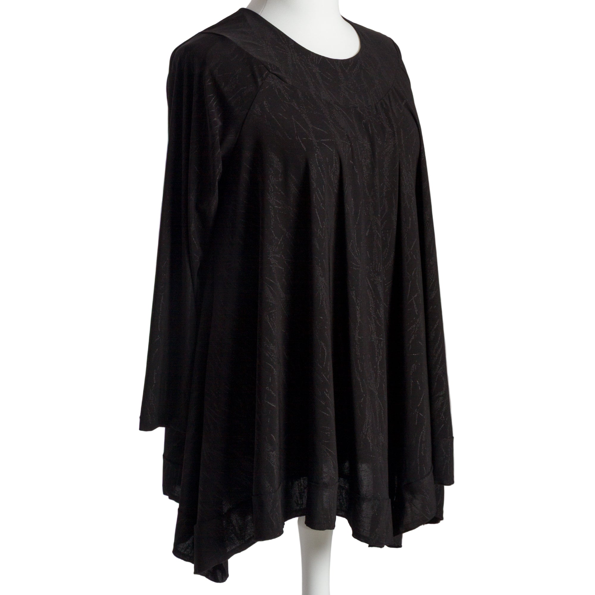Елегантна разкроена туника в черен цвят, изработена от 100% вискоза с фина релефна текстура. Материята е мека и еластична, осигуряваща удобство и свобода на движение. Разкроената кройка прикрива деликатно тялото, а облият кант на деколтето добавя изискан завършек. Подходяща е за официални поводи, вечерни излизания и есенно-зимния сезон.