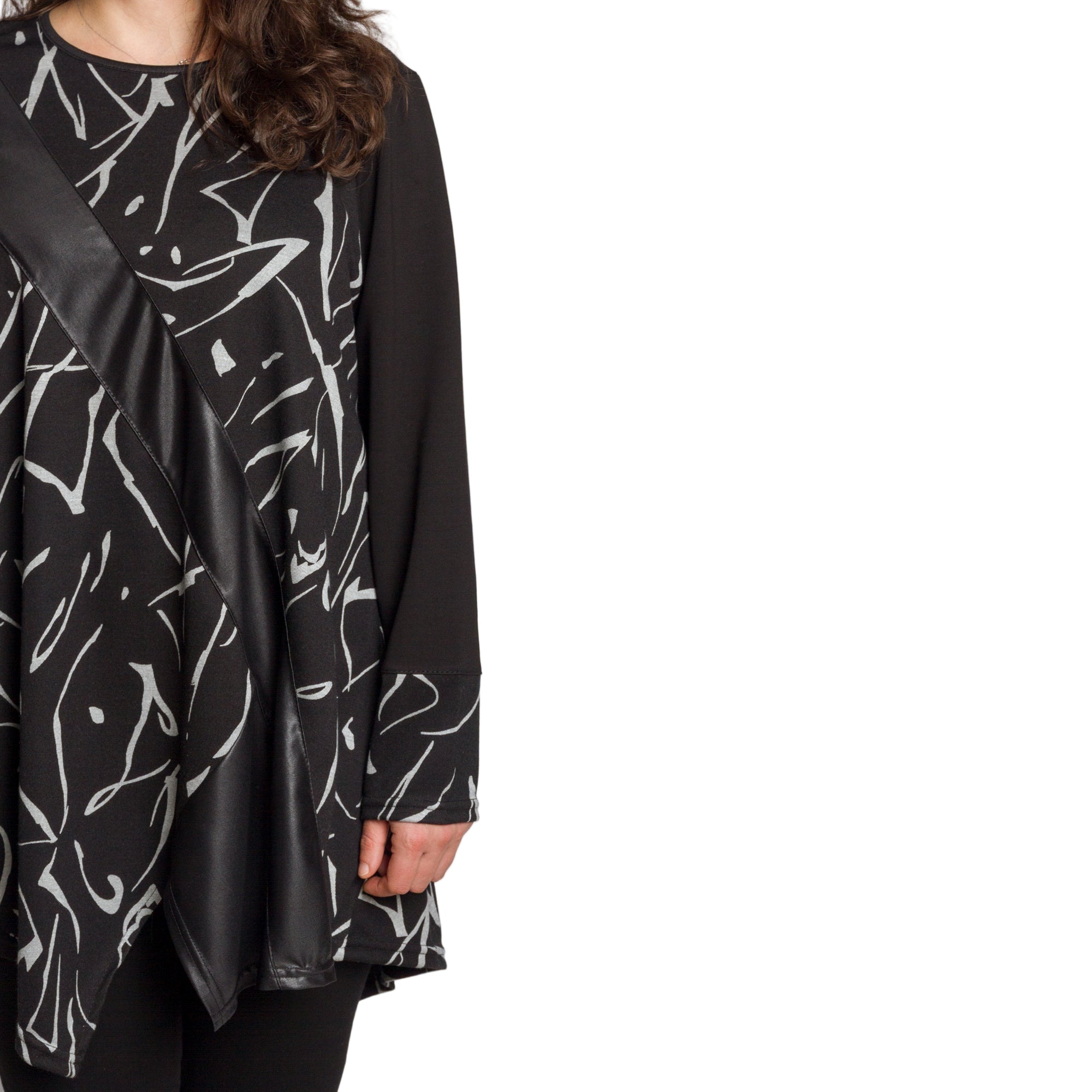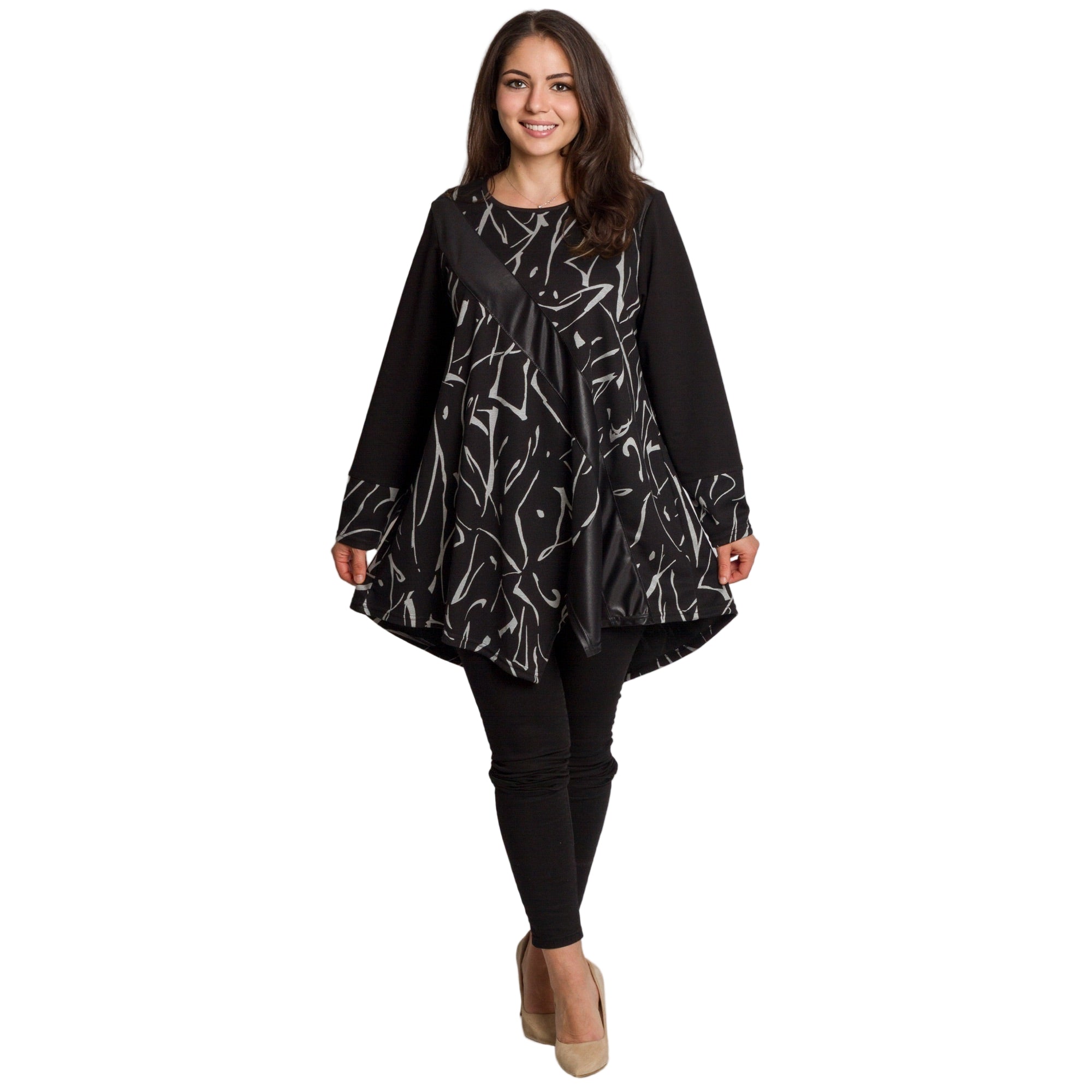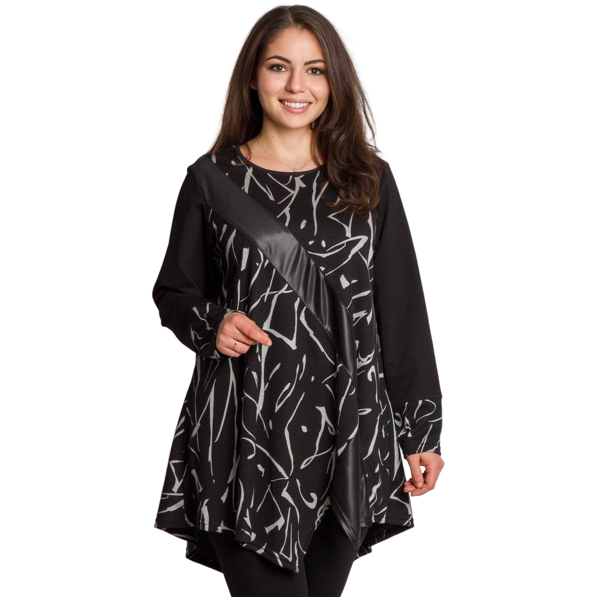Елегантна туника в черен цвят с ефектен абстрактен десен и декоративна диагонална лента от еко кожа. Моделът е изработен от висококачествена еластична материя с преобладаващ полиамид, която осигурява комфорт и свобода на движението. Свободната кройка прикрива дискретно зоните около ханша и талията, а кръглото деколте придава изчистена и модерна визия. Подходяща както за ежедневието, така и за по-официални поводи през есенно-зимния сезон.