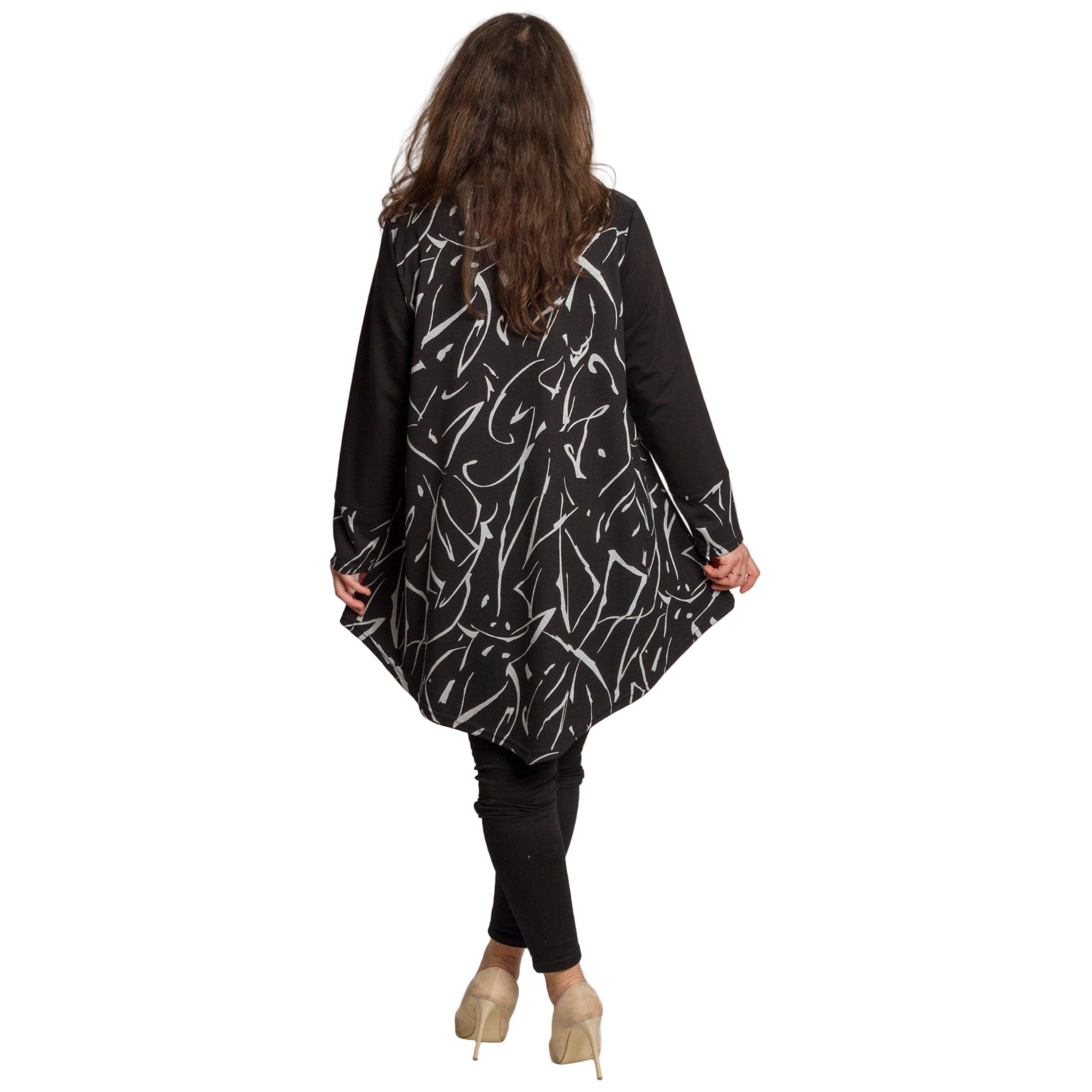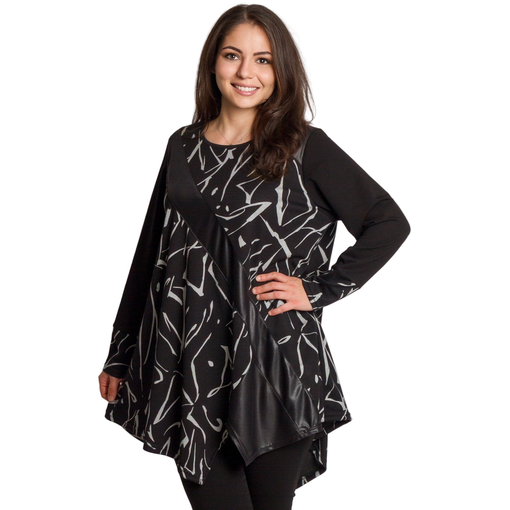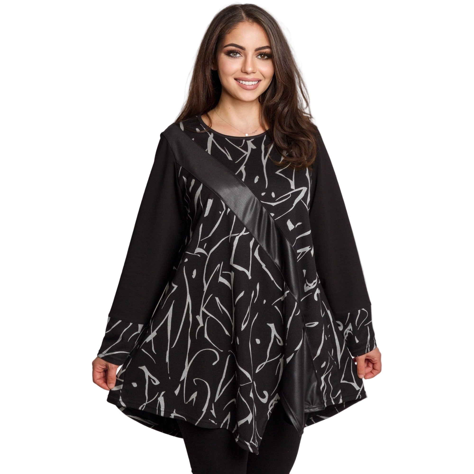 Елегантна туника в черен цвят с ефектен абстрактен десен и декоративна диагонална лента от еко кожа. Моделът е изработен от висококачествена еластична материя с преобладаващ полиамид, която осигурява комфорт и свобода на движението. Свободната кройка прикрива дискретно зоните около ханша и талията, а кръглото деколте придава изчистена и модерна визия. Подходяща както за ежедневието, така и за по-официални поводи през есенно-зимния сезон.