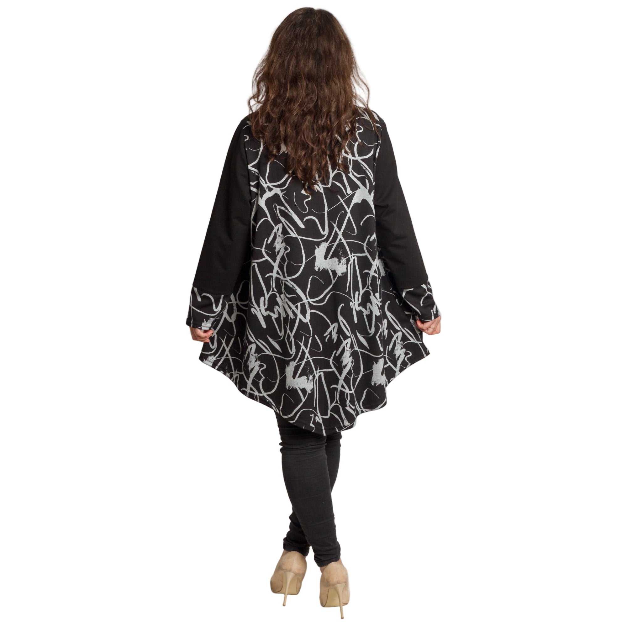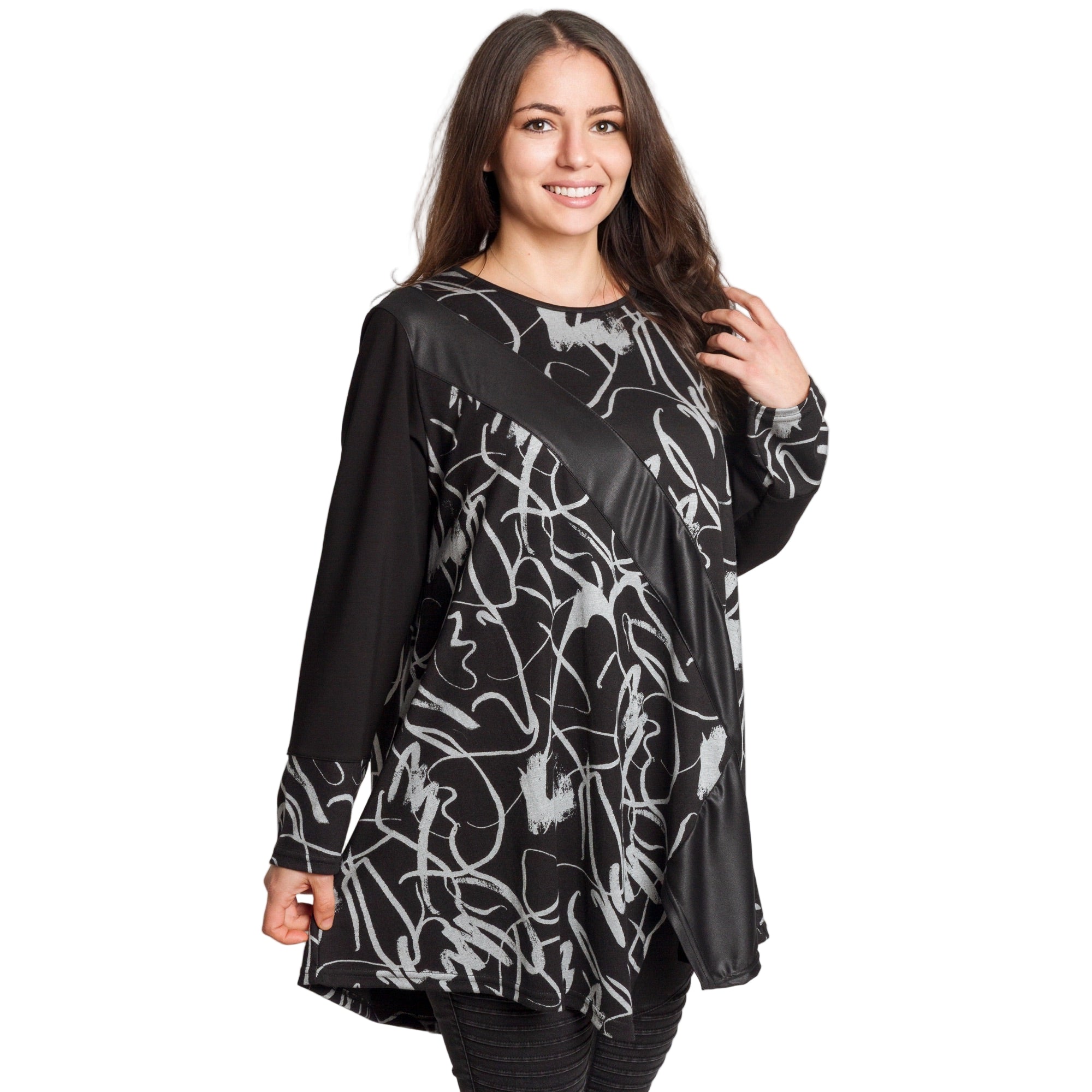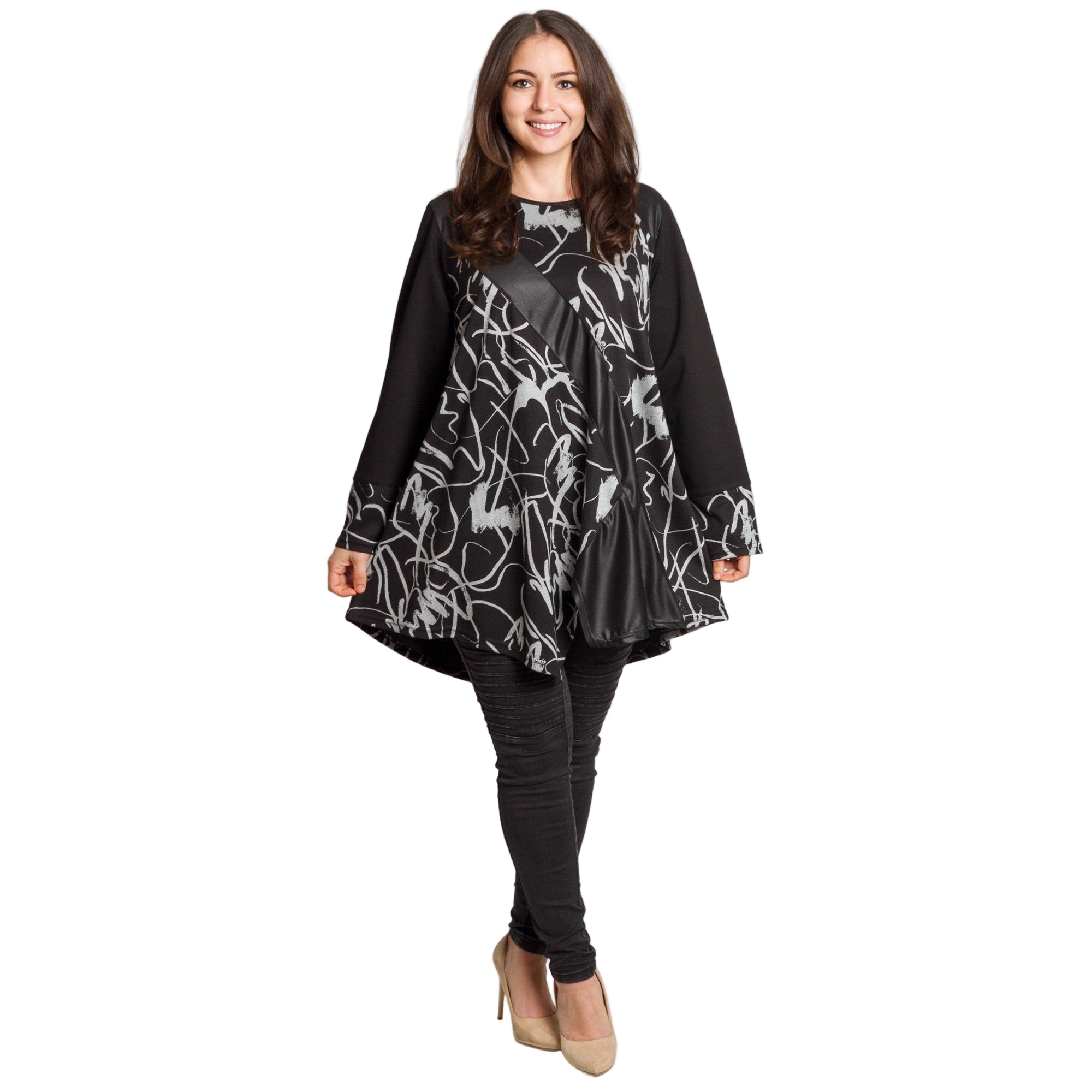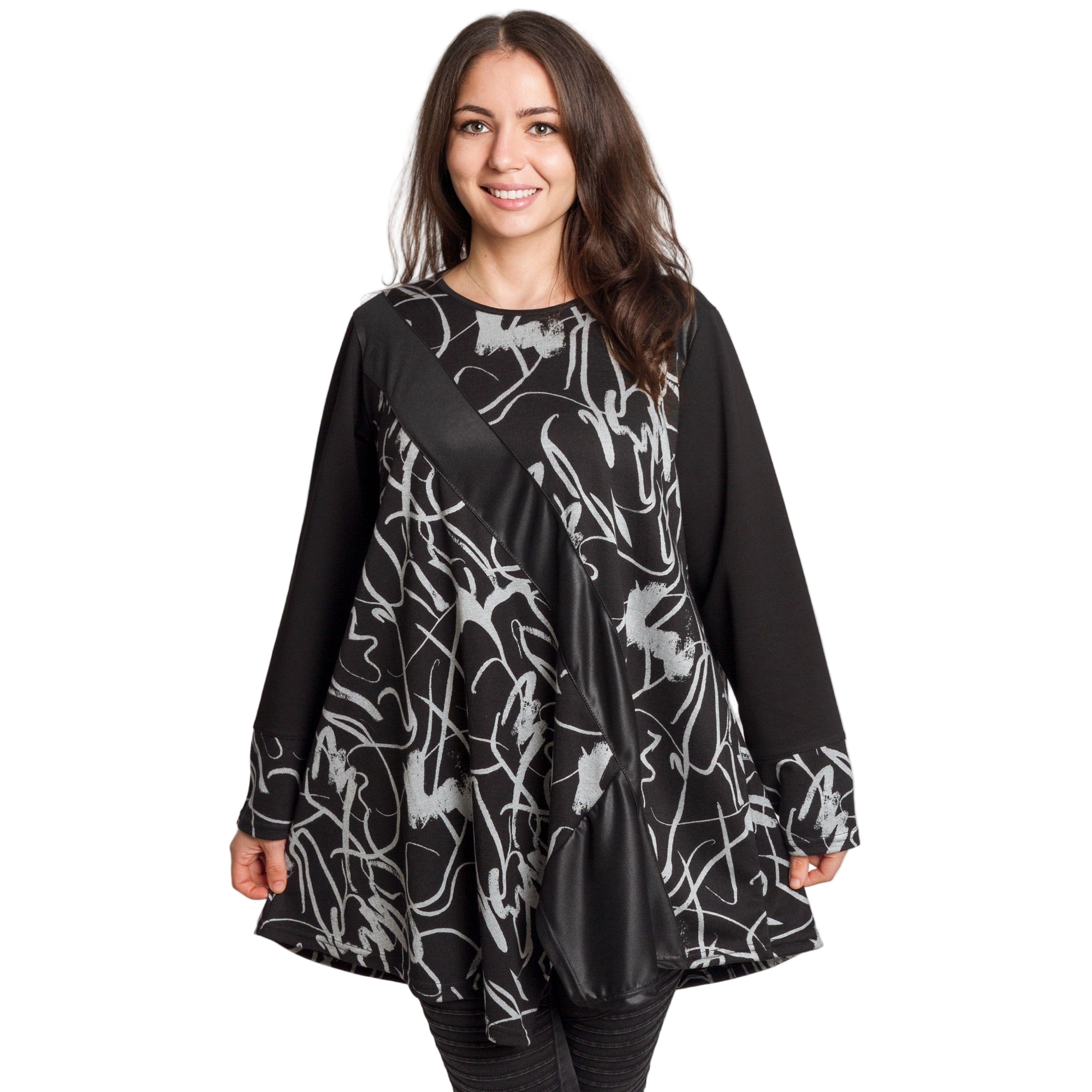 Тази модерна туника впечатлява с артистичен графичен десен в сиво и декоративна сатенена лента по диагонал, която издължава силуета и придава модерен характер. Свободната кройка осигурява комфорт и прикрива зоните, които всяка жена иска да обере. Ръкавите са изчистени, а маншетите повтарят десена за балансирана визия. Материята е мека, еластична и подходяща за есенно-зимния сезон. Моделът е отличен избор както за ежедневието, така и за по-елегантен повод.