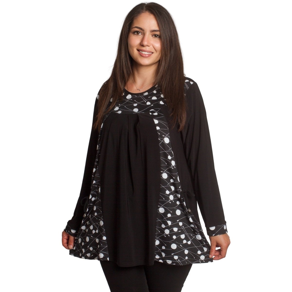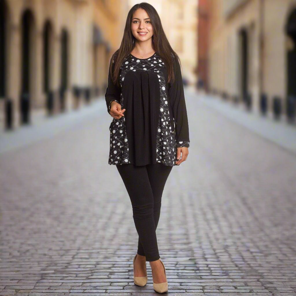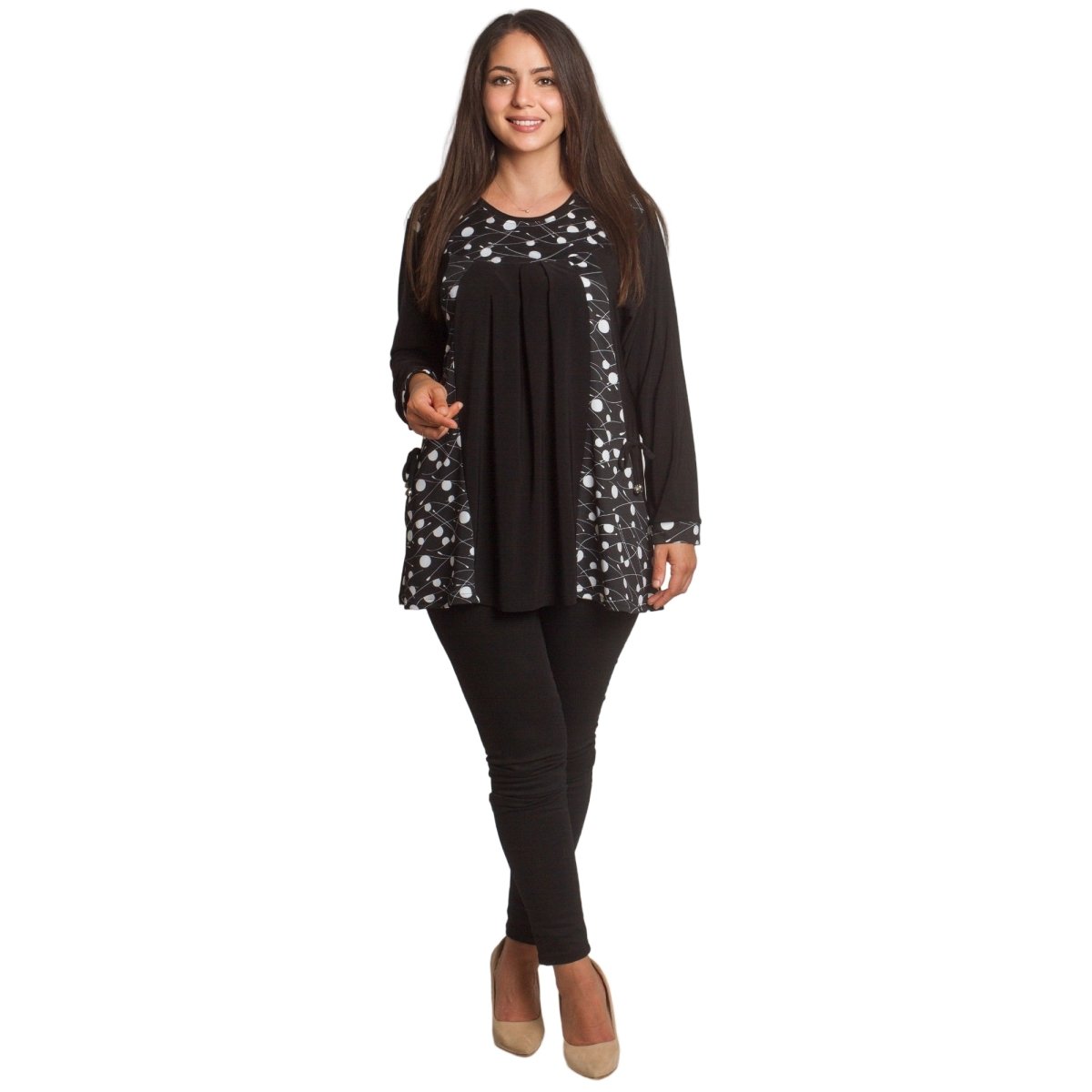 Елегантна туника в тъмносин цвят, декорирана с ефектни бели вълнообразни линии, които придават модерна и динамична визия. Изработена е от висококачествена вискоза с еластан, осигуряваща комфорт и мекота при носене. Свободната разкроена кройка и декоративните връзки в долната част подчертават женствеността и прикриват нежелани зони. Моделът е с кръгло деколте и дълги ръкави, подходящ както за ежедневието, така и за официални поводи през есенно-зимния сезон.