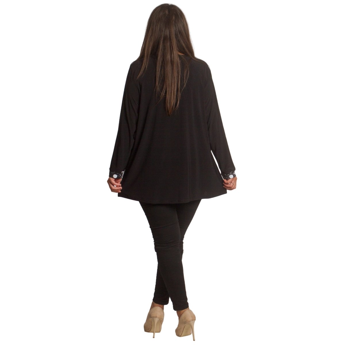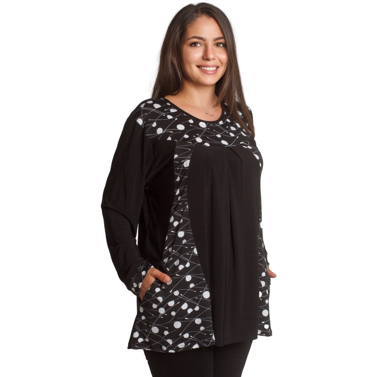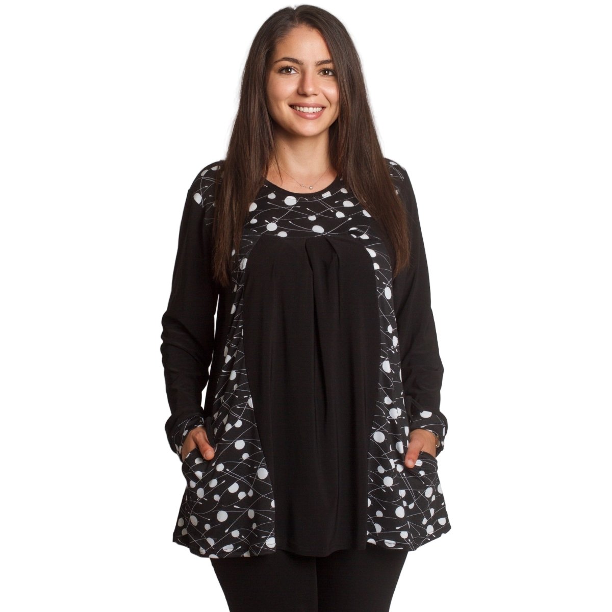 Елегантна туника в тъмносин цвят, декорирана с ефектни бели вълнообразни линии, които придават модерна и динамична визия. Изработена е от висококачествена вискоза с еластан, осигуряваща комфорт и мекота при носене. Свободната разкроена кройка и декоративните връзки в долната част подчертават женствеността и прикриват нежелани зони. Моделът е с кръгло деколте и дълги ръкави, подходящ както за ежедневието, така и за официални поводи през есенно-зимния сезон.