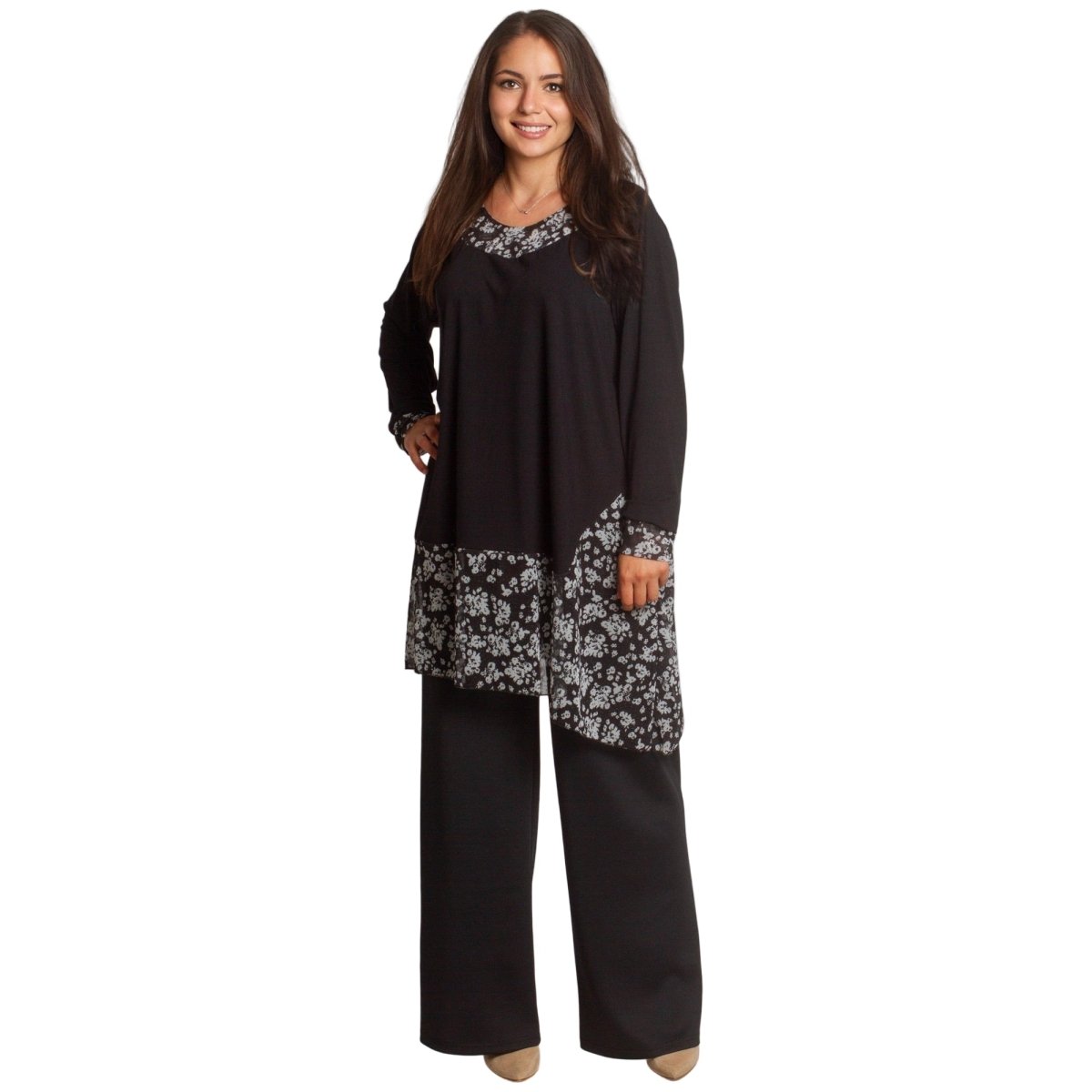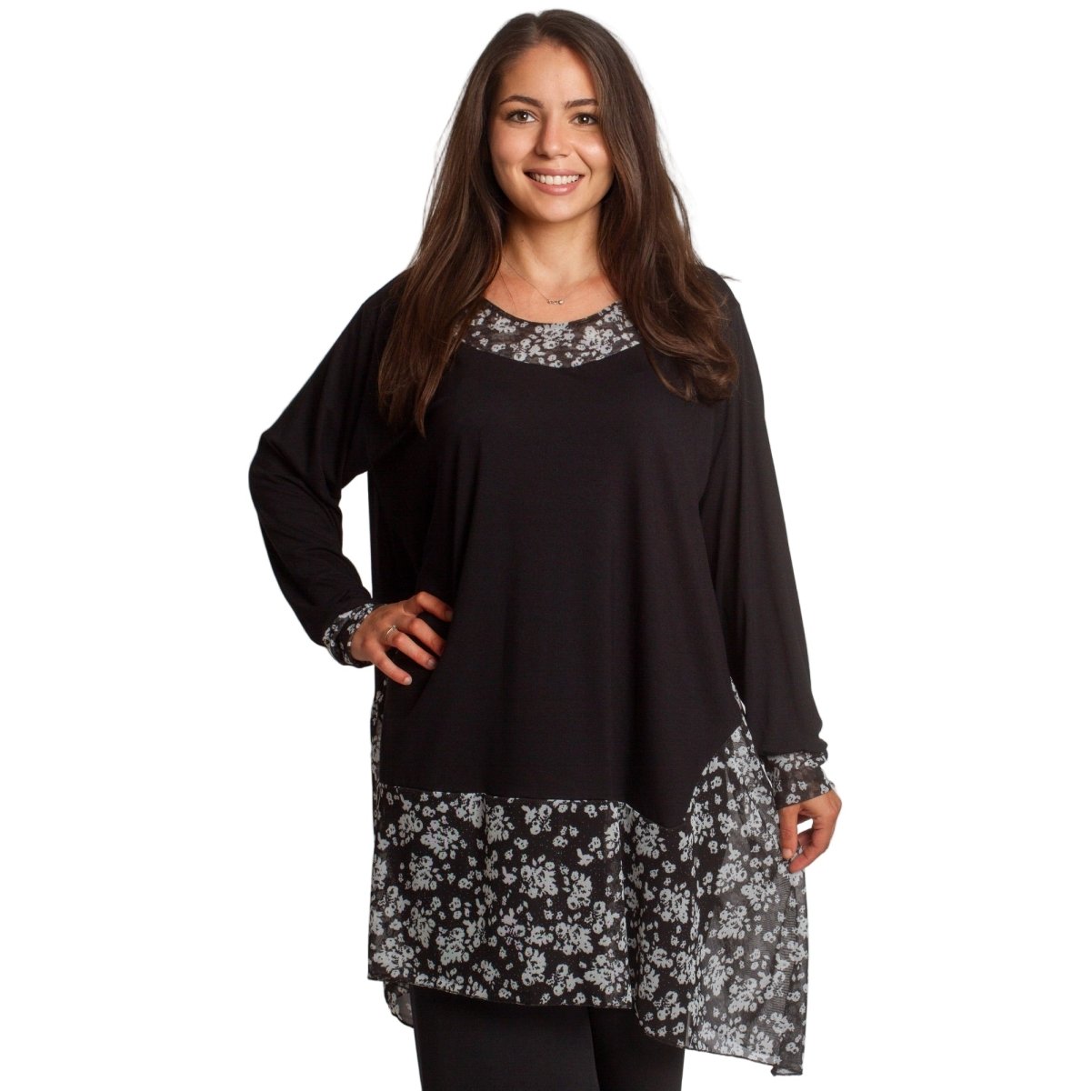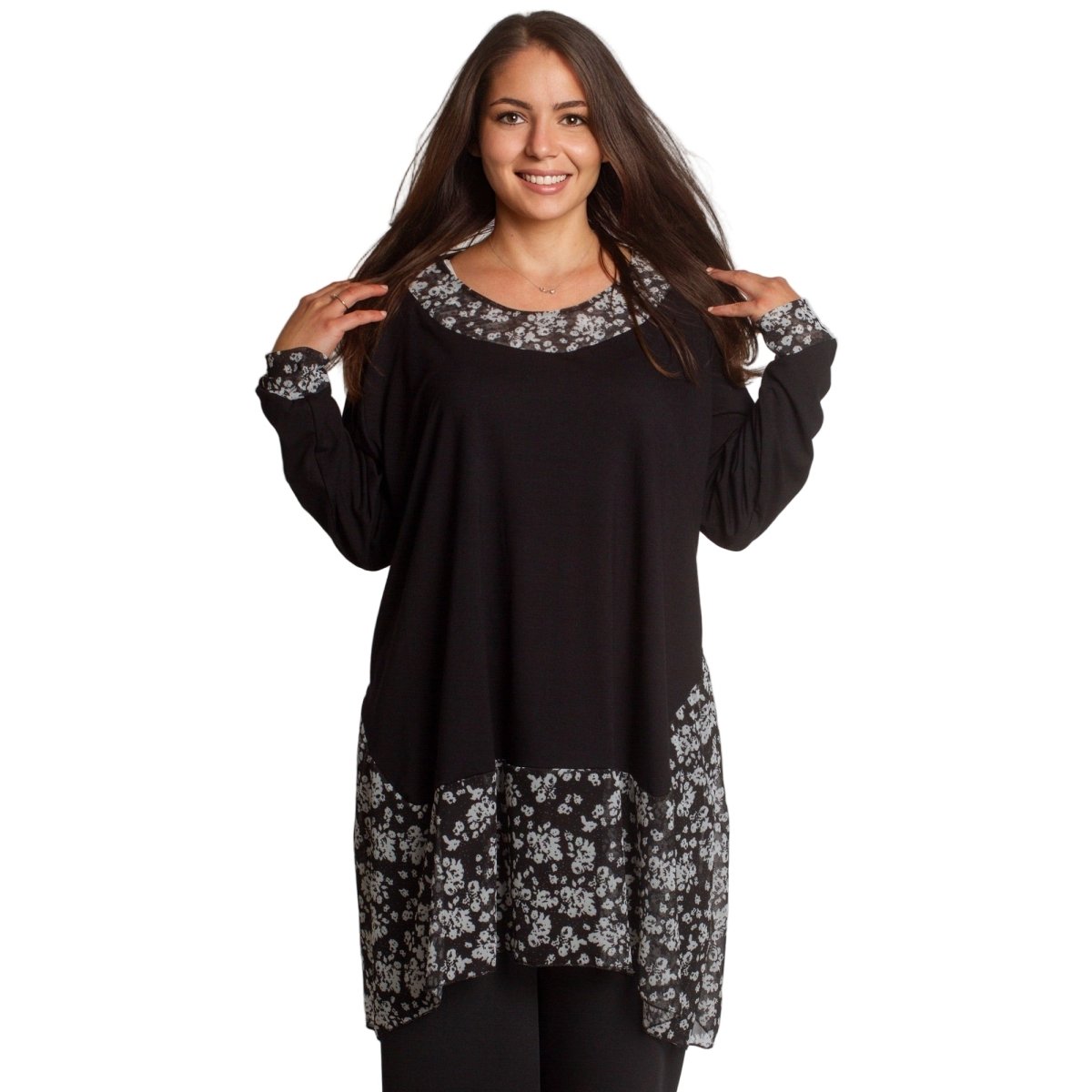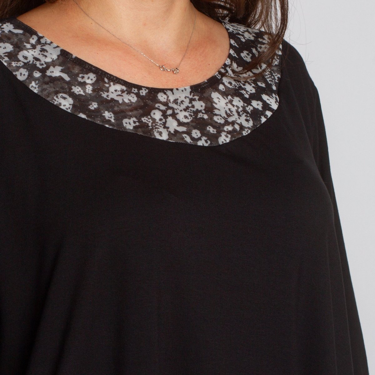 Елегантна и удобна туника в черен цвят с разкроена кройка, подходяща както за ежедневието, така и за официални поводи. Моделът е с флорални акценти от полупрозрачна материя в областта на деколтето и долната част, които придават женственост и стил. Кръглото деколте и свободната линия осигуряват комфорт и свобода на движение. Подходяща за есенно-зимния сезон.