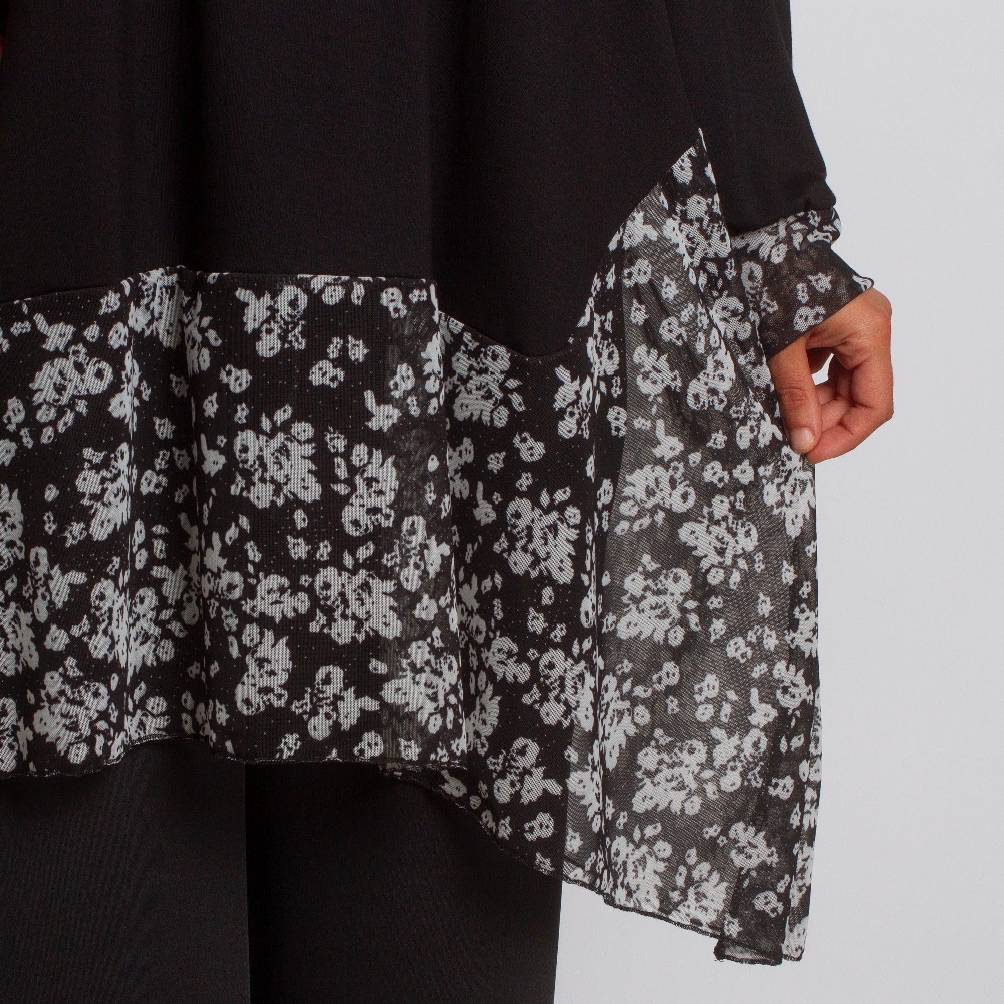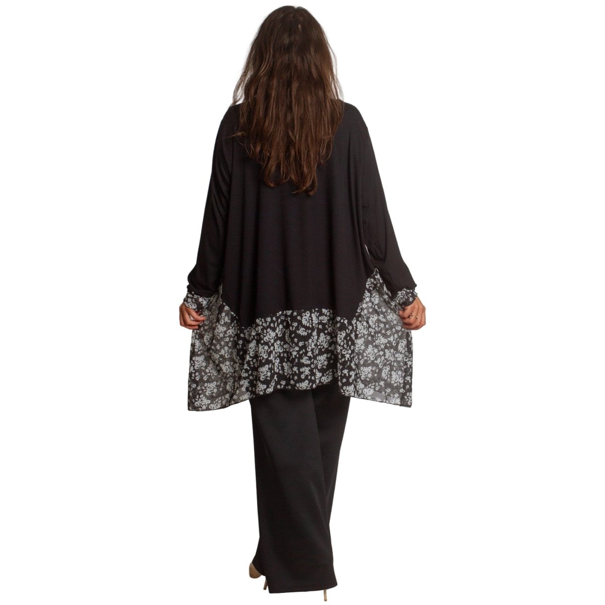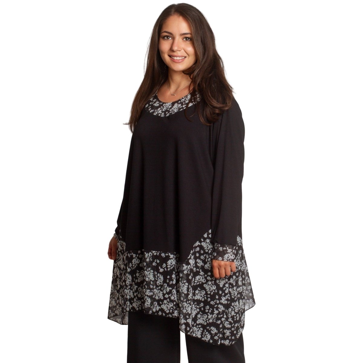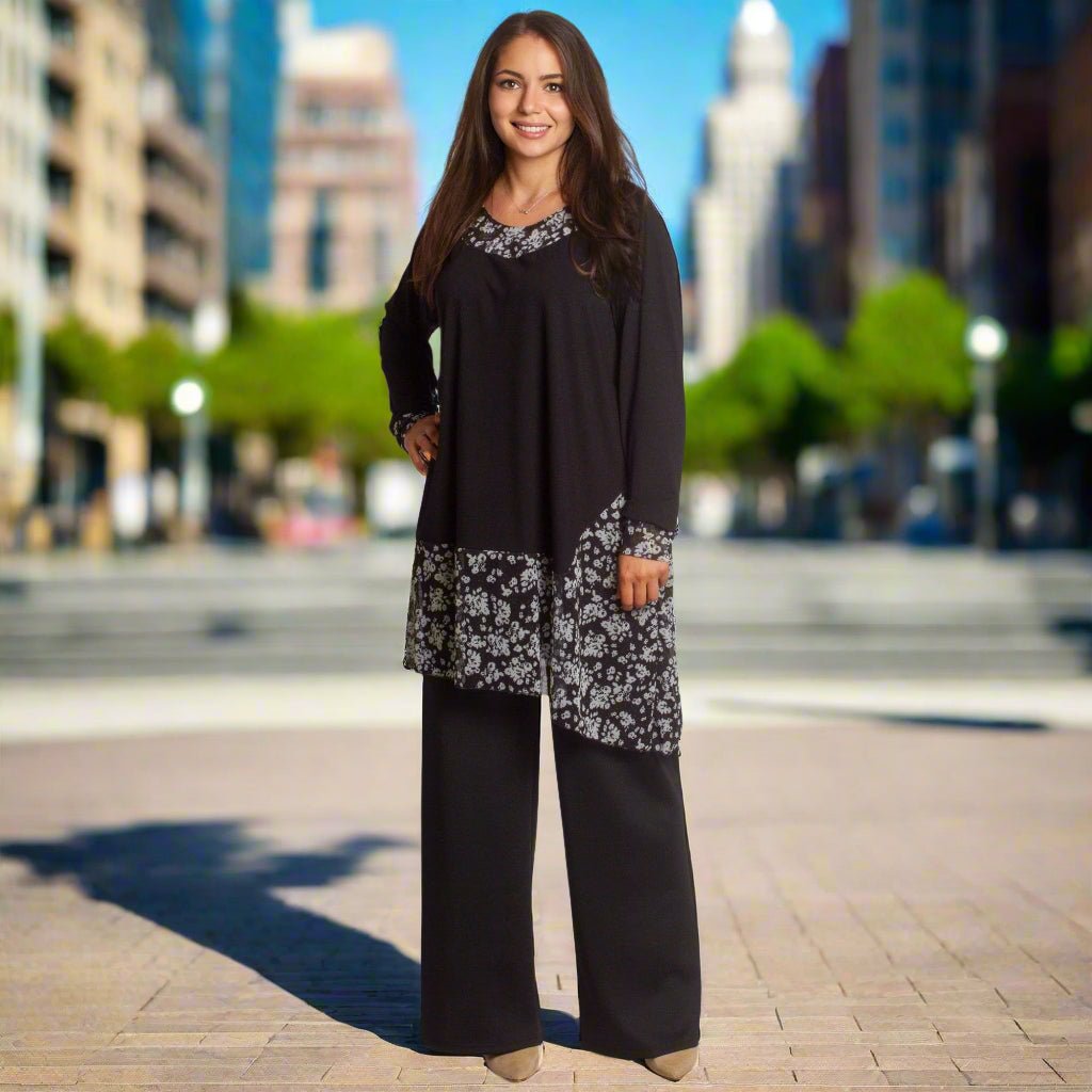 Елегантна и удобна туника в черен цвят с разкроена кройка, подходяща както за ежедневието, така и за официални поводи. Моделът е с флорални акценти от полупрозрачна материя в областта на деколтето и долната част, които придават женственост и стил. Кръглото деколте и свободната линия осигуряват комфорт и свобода на движение. Подходяща за есенно-зимния сезон.