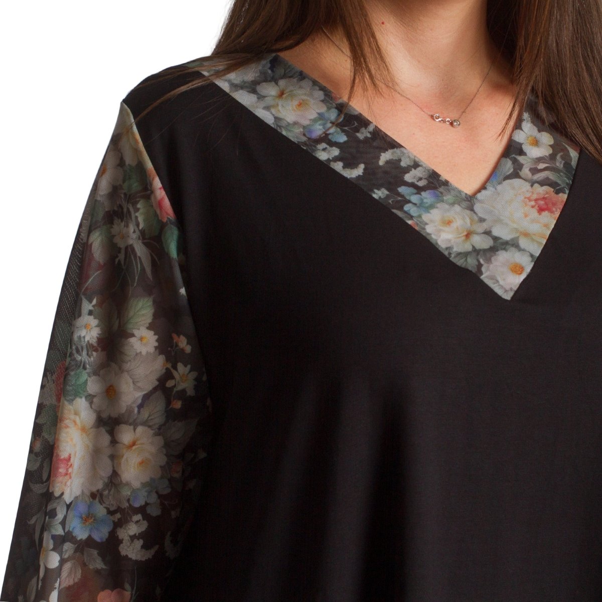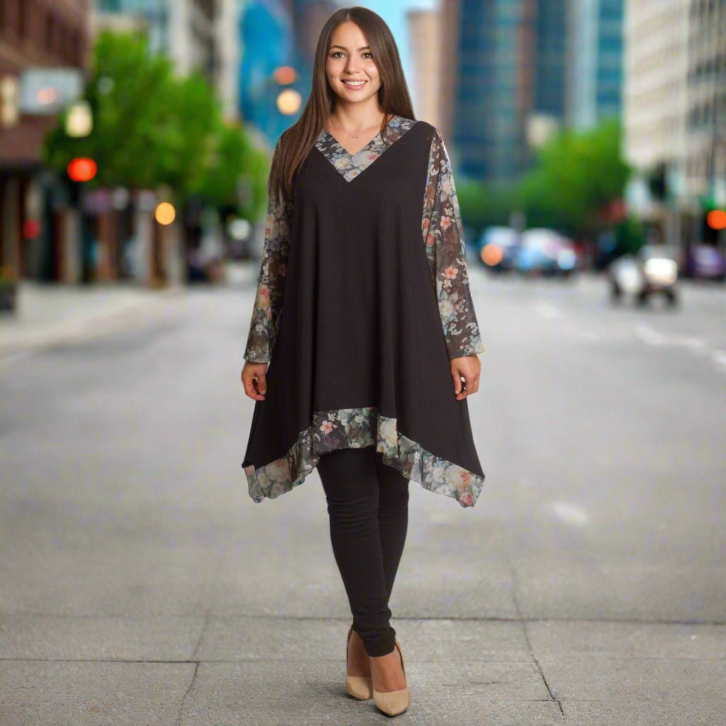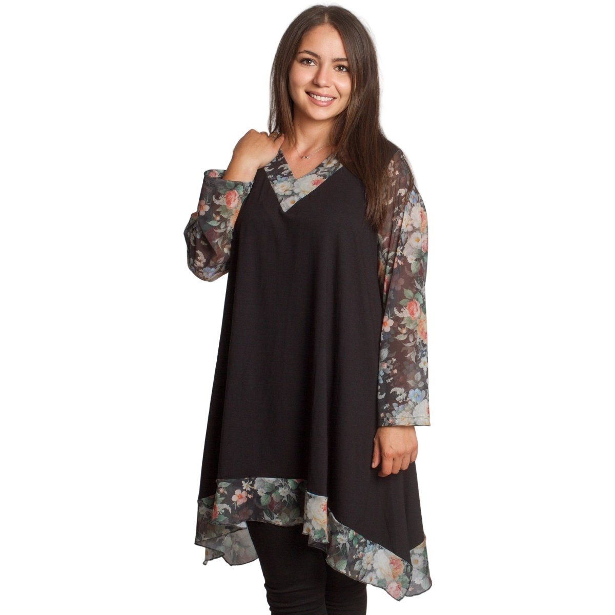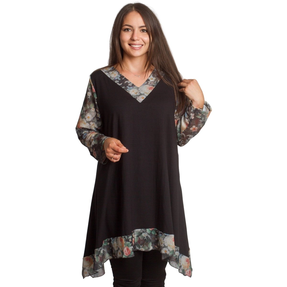 Елегантна черна туника, която съчетава комфорт и стил. Моделът е изработен от мека памучна материя с добавка на ликра, осигуряваща еластичност и удобство при носене. Свободната кройка прикрива деликатно силуета, а шифонените ръкави с флорален десен в нежни цветни нюанси придават женственост и свежест. Асиметричният подгъв със същата флорална гарнитура завършва визията по елегантен начин. Подходяща за ежедневни и официални поводи през есенно-зимния сезон.