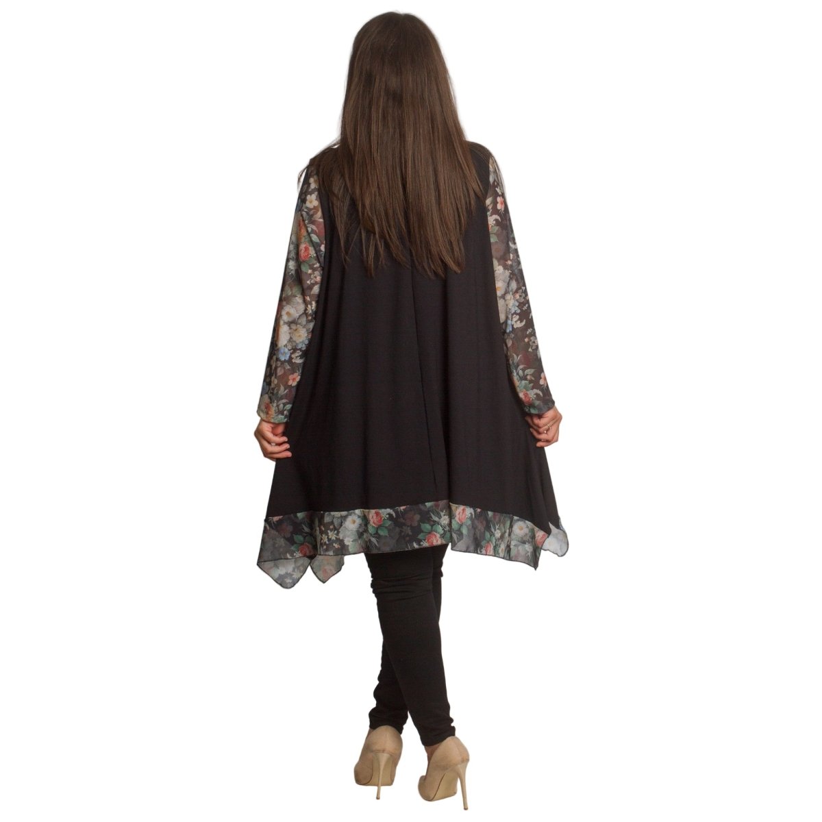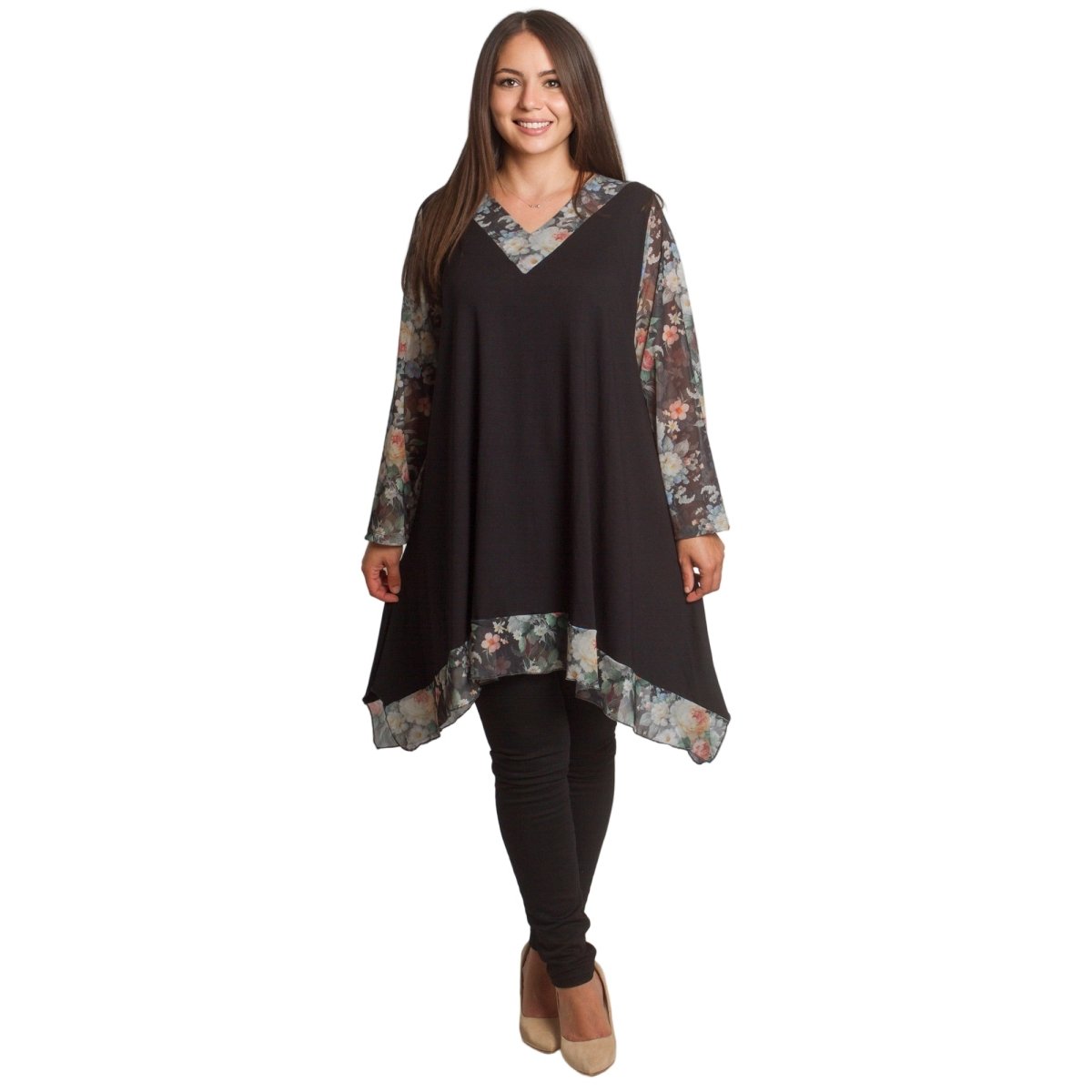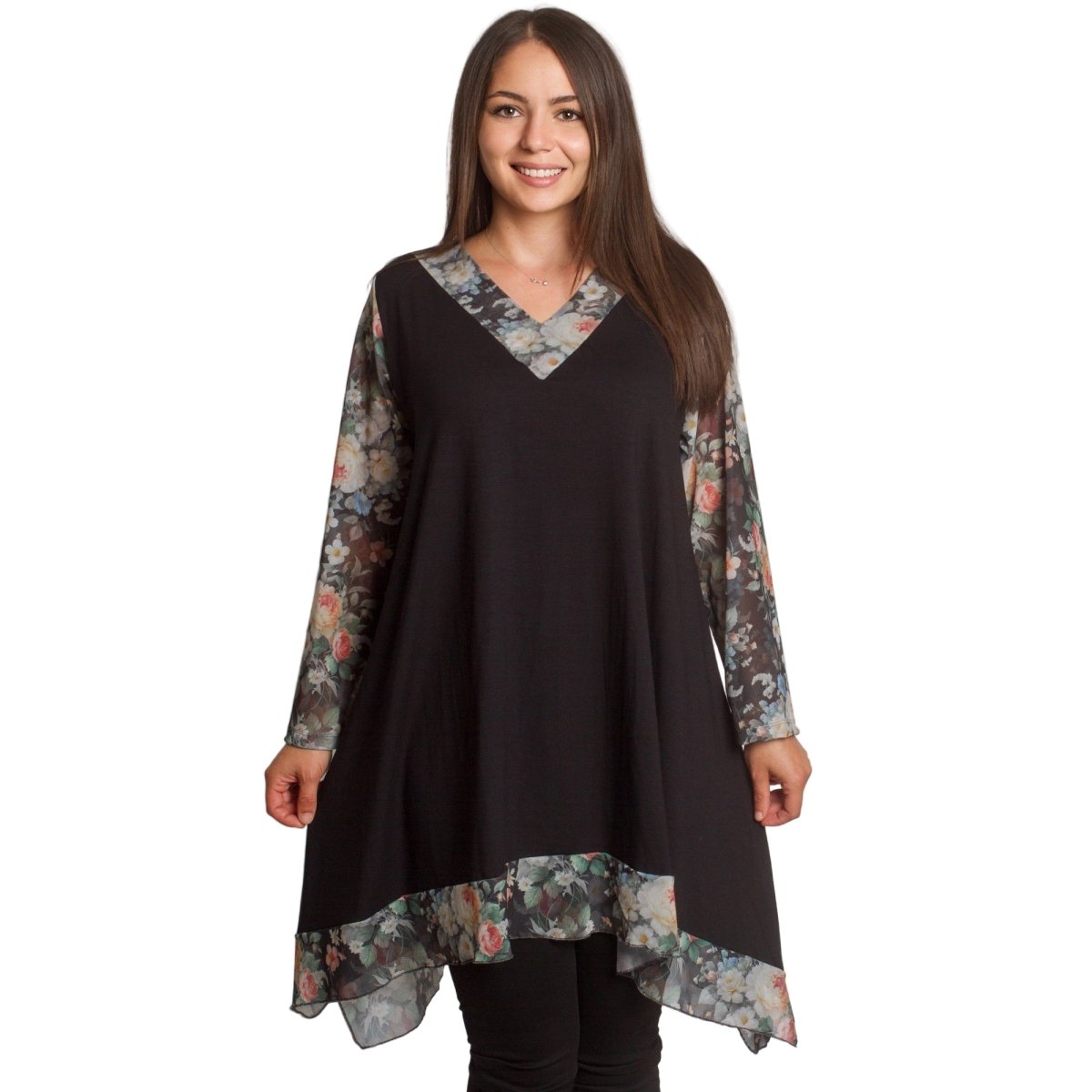 Елегантна черна туника, която съчетава комфорт и стил. Моделът е изработен от мека памучна материя с добавка на ликра, осигуряваща еластичност и удобство при носене. Свободната кройка прикрива деликатно силуета, а шифонените ръкави с флорален десен в нежни цветни нюанси придават женственост и свежест. Асиметричният подгъв със същата флорална гарнитура завършва визията по елегантен начин. Подходяща за ежедневни и официални поводи през есенно-зимния сезон.
