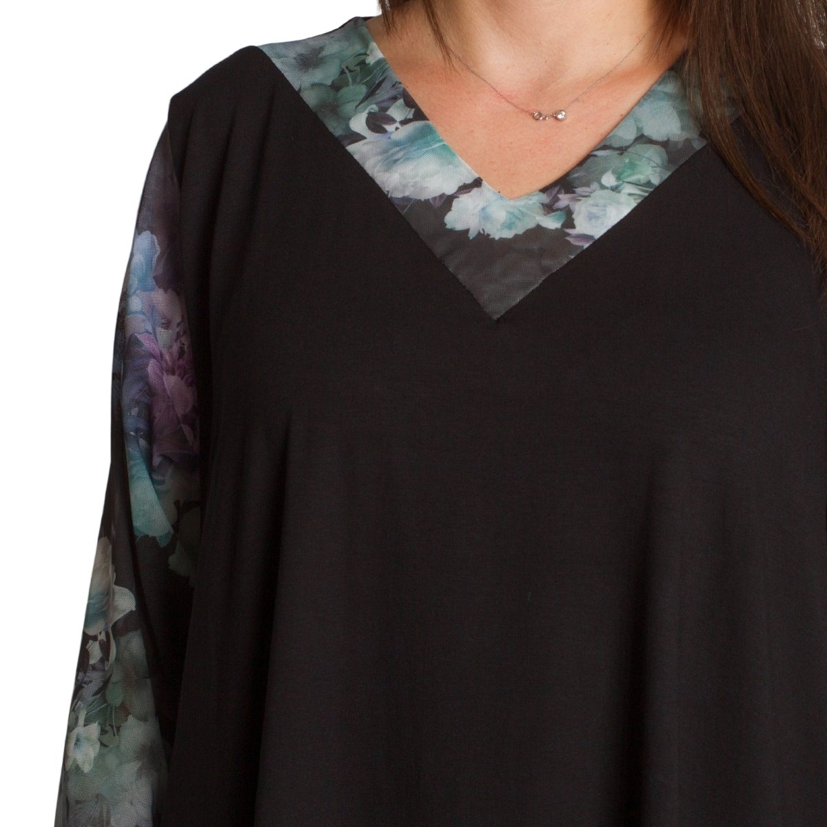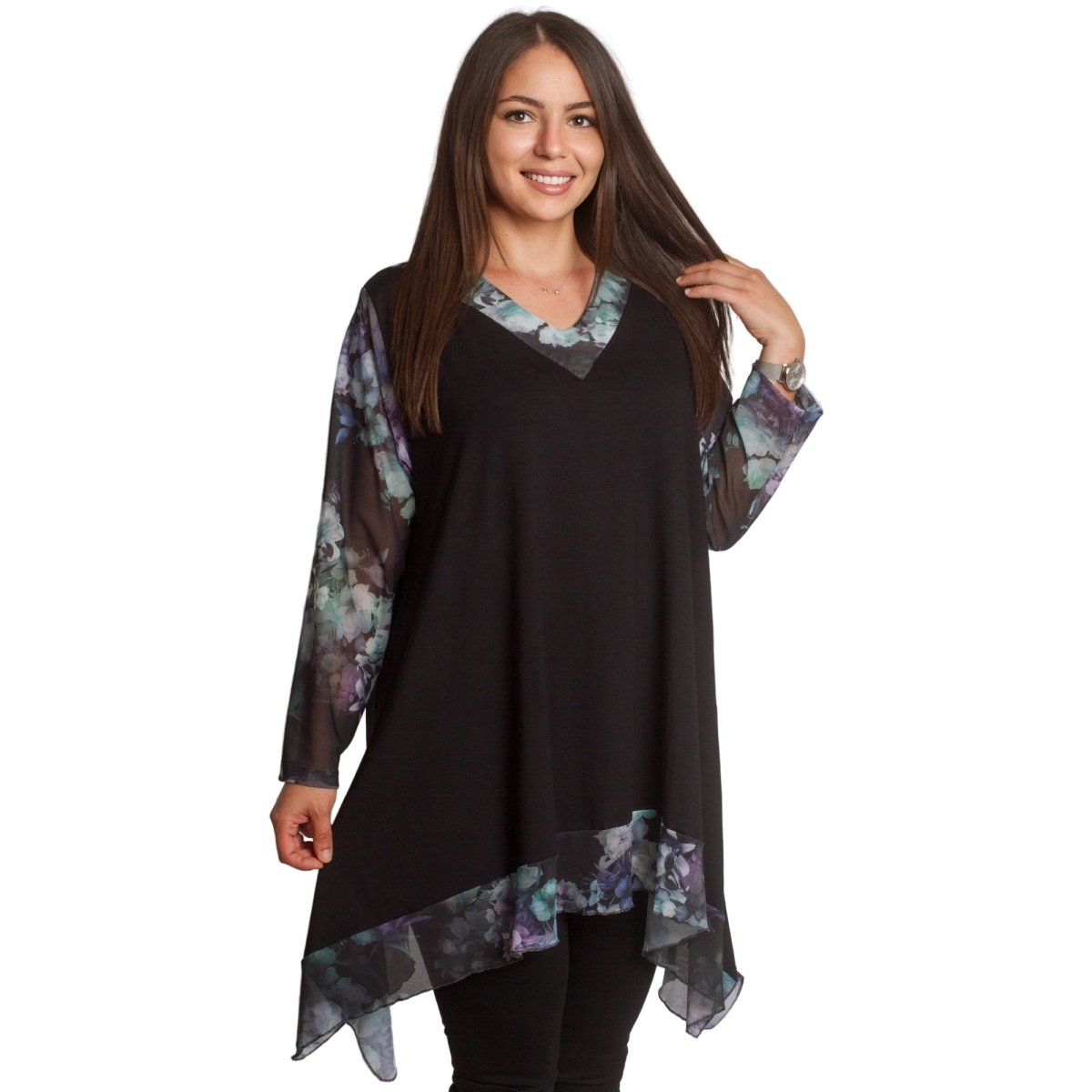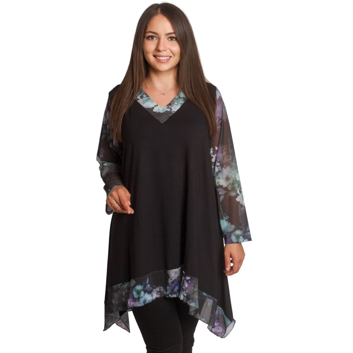 Стилна туника в черен цвят, изработена от памук с добавка на ликра за комфорт и леко еластично усещане. Разкроената кройка пада ефирно, прикривайки силуета и осигурявайки удобство при носене. Ръкавите са от шифон с флорален десен в нюанси на синьо, зелено и лилаво, придаващи елегантност и свежест. Подгъвът е асиметричен с шифонена гарнитура, която подчертава модерната визия на модела. Подходяща е както за ежедневието, така и за по-официални поводи през есенно-зимния сезон.