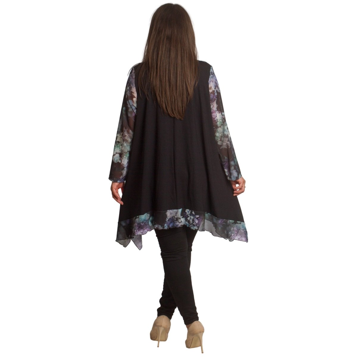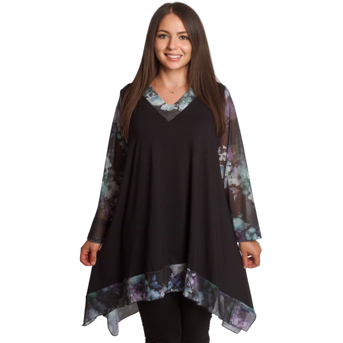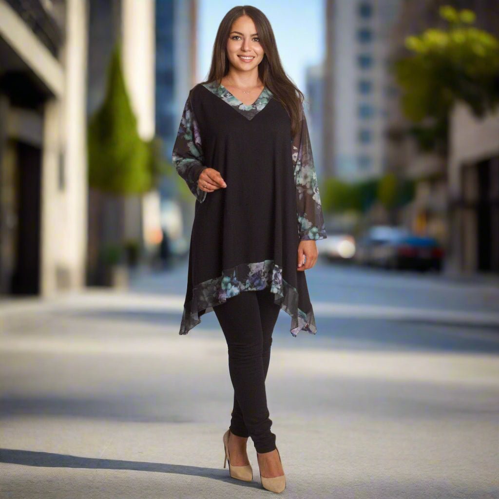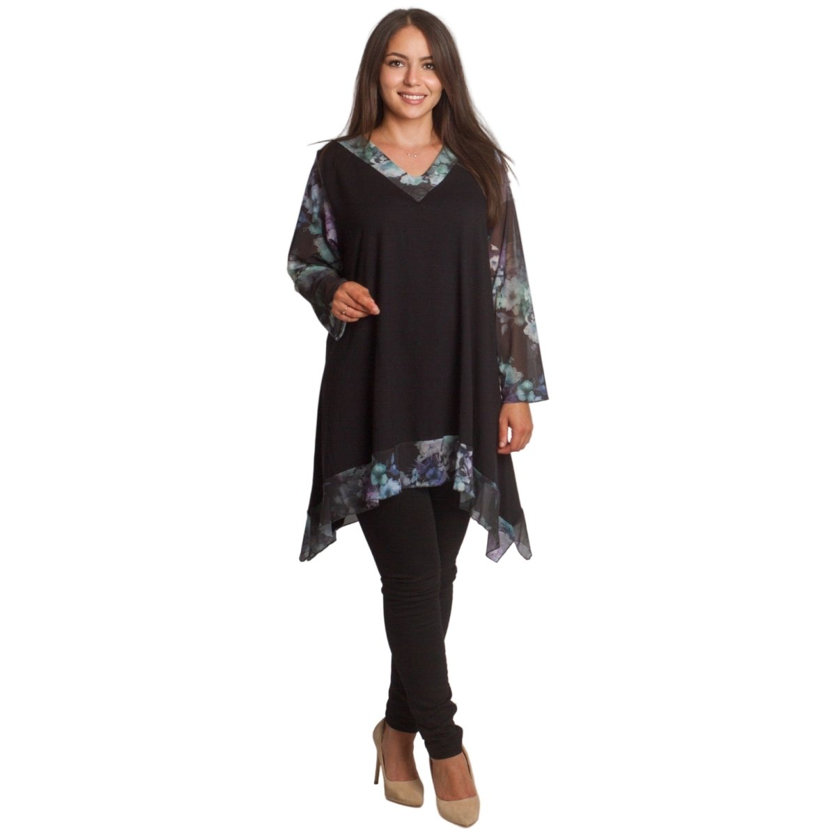 Стилна туника в черен цвят, изработена от памук с добавка на ликра за комфорт и леко еластично усещане. Разкроената кройка пада ефирно, прикривайки силуета и осигурявайки удобство при носене. Ръкавите са от шифон с флорален десен в нюанси на синьо, зелено и лилаво, придаващи елегантност и свежест. Подгъвът е асиметричен с шифонена гарнитура, която подчертава модерната визия на модела. Подходяща е както за ежедневието, така и за по-официални поводи през есенно-зимния сезон.